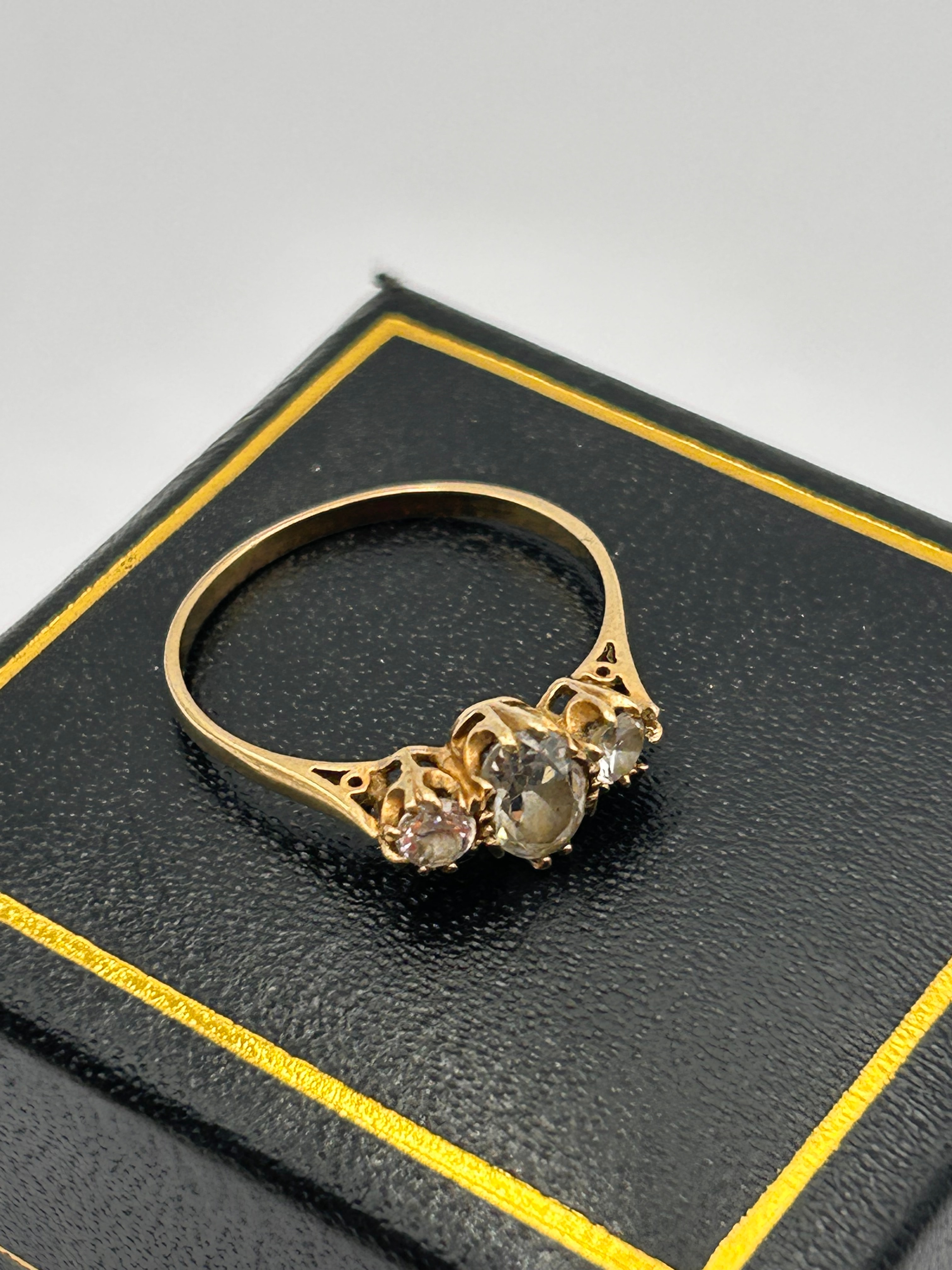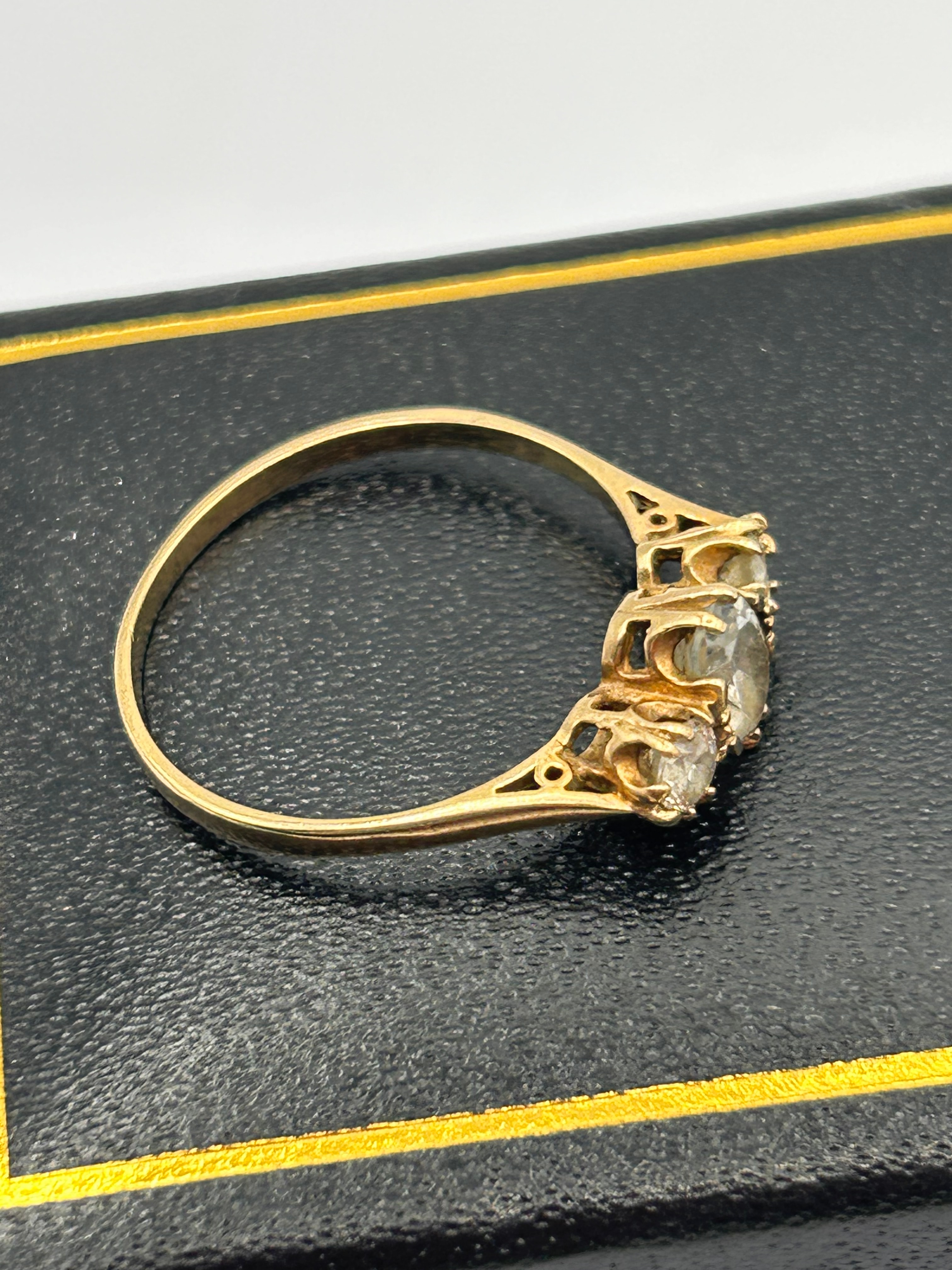 A vintage 9ct gold three-stone ring, featuring a central transparent CZ gemstone flanked by two slightly smaller transparent CZ gemstones, all appearing round or cushion cut. The yellow metal shoulders display ornate openwork detailing. The overall design suggests an antique or vintage aesthetic.
