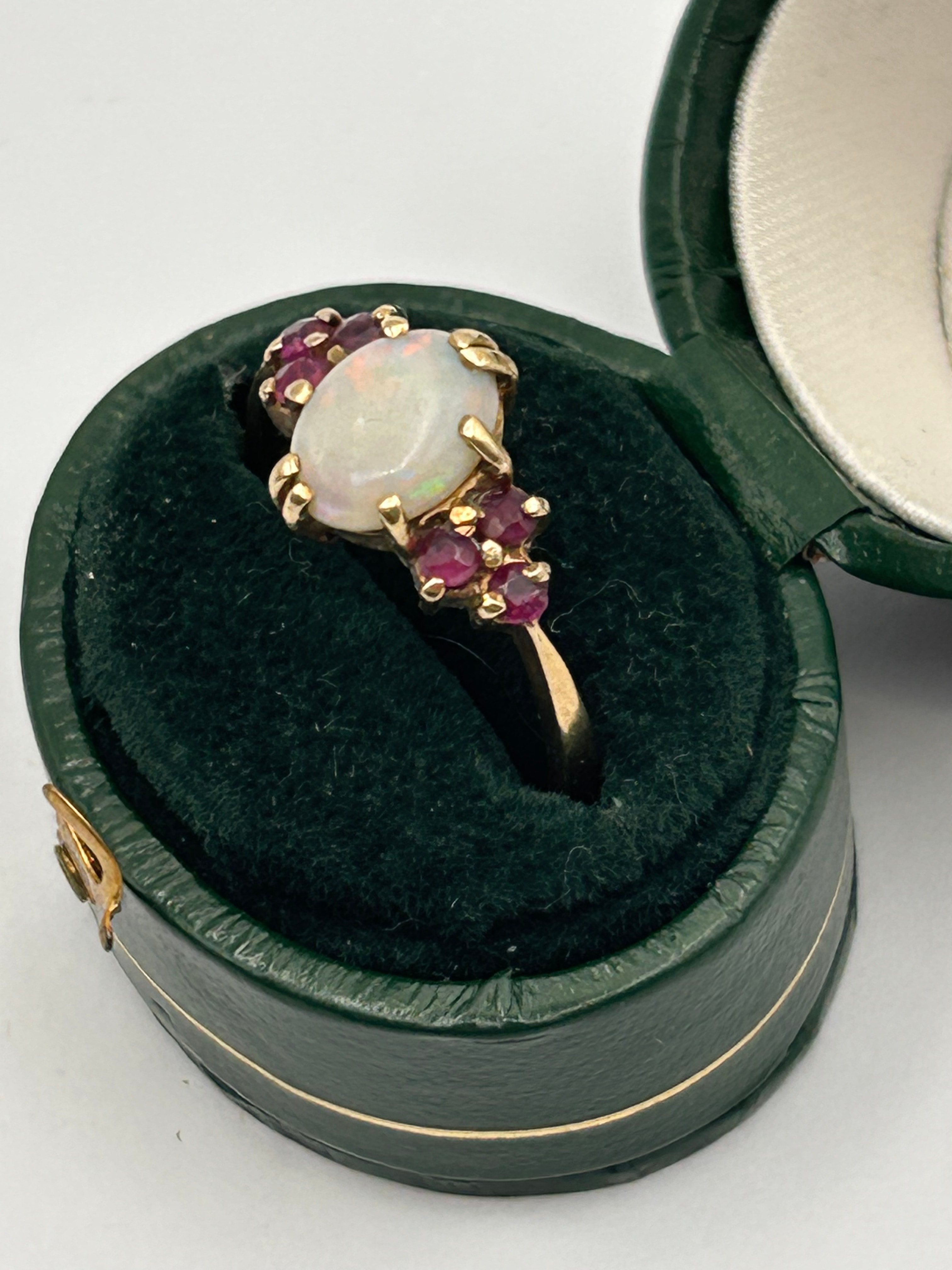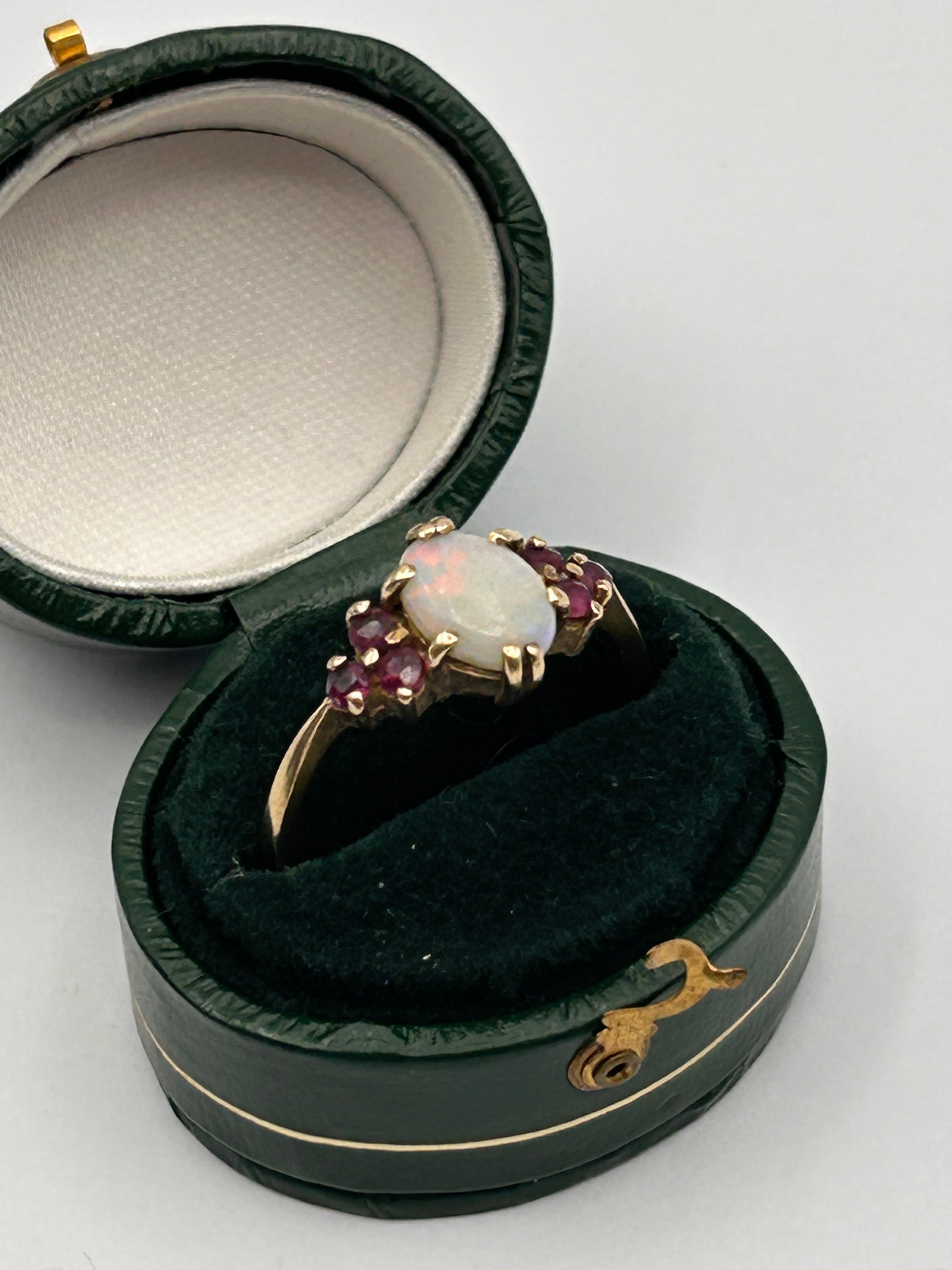 An antique or vintage-style cluster ring, crafted from 9ct yellow gold. The ring features a central oval cabochon-cut opal, exhibiting a milky white body color with iridescent play-of-color. This central stone is flanked and surrounded by approximately eight small, round-cut, faceted garnets. The stones are secured in a prong setting. The ring is presented in a dark green leatherette or faux leather ring box with a cream satin lid lining and a dark green velvet base.