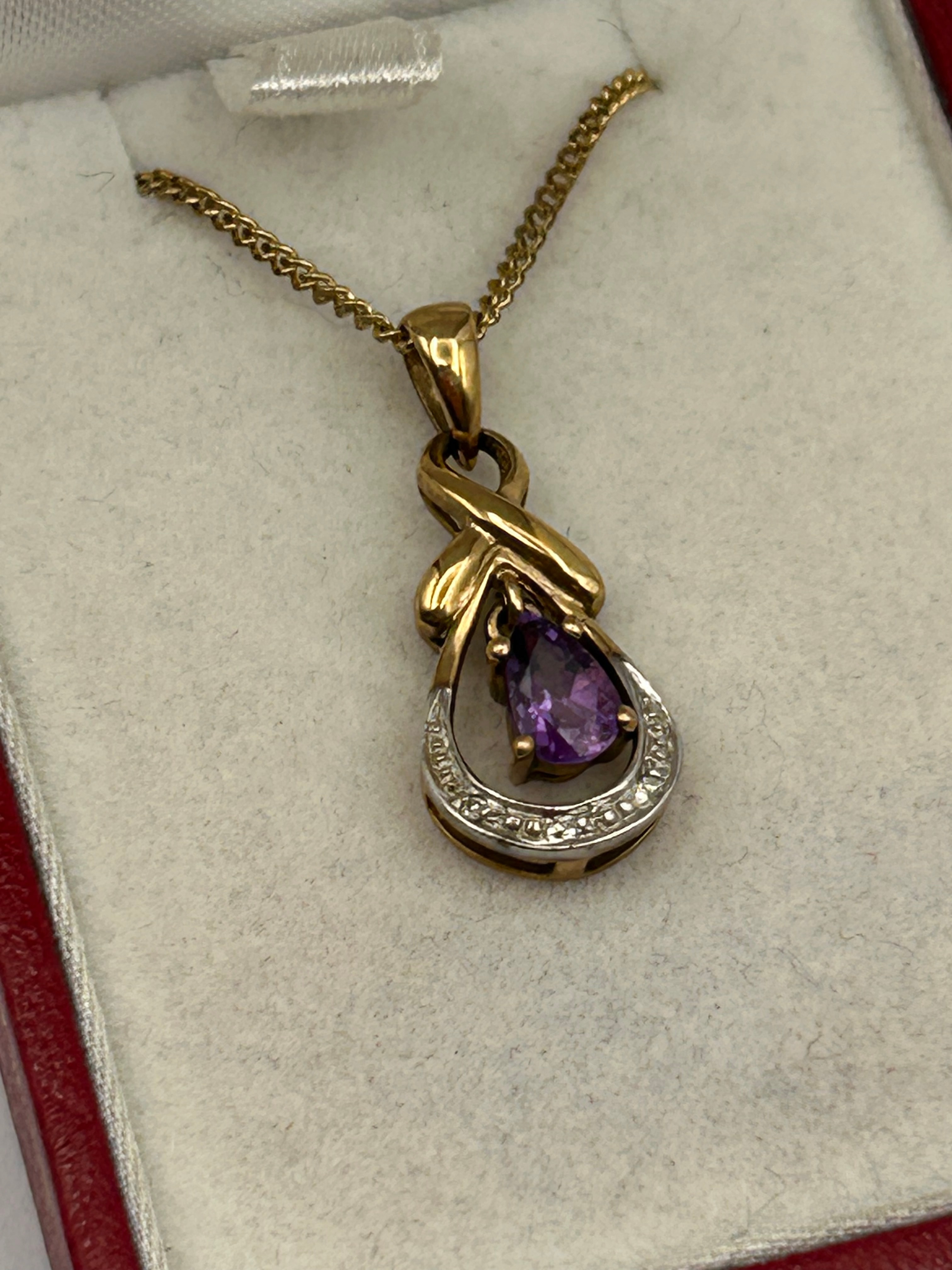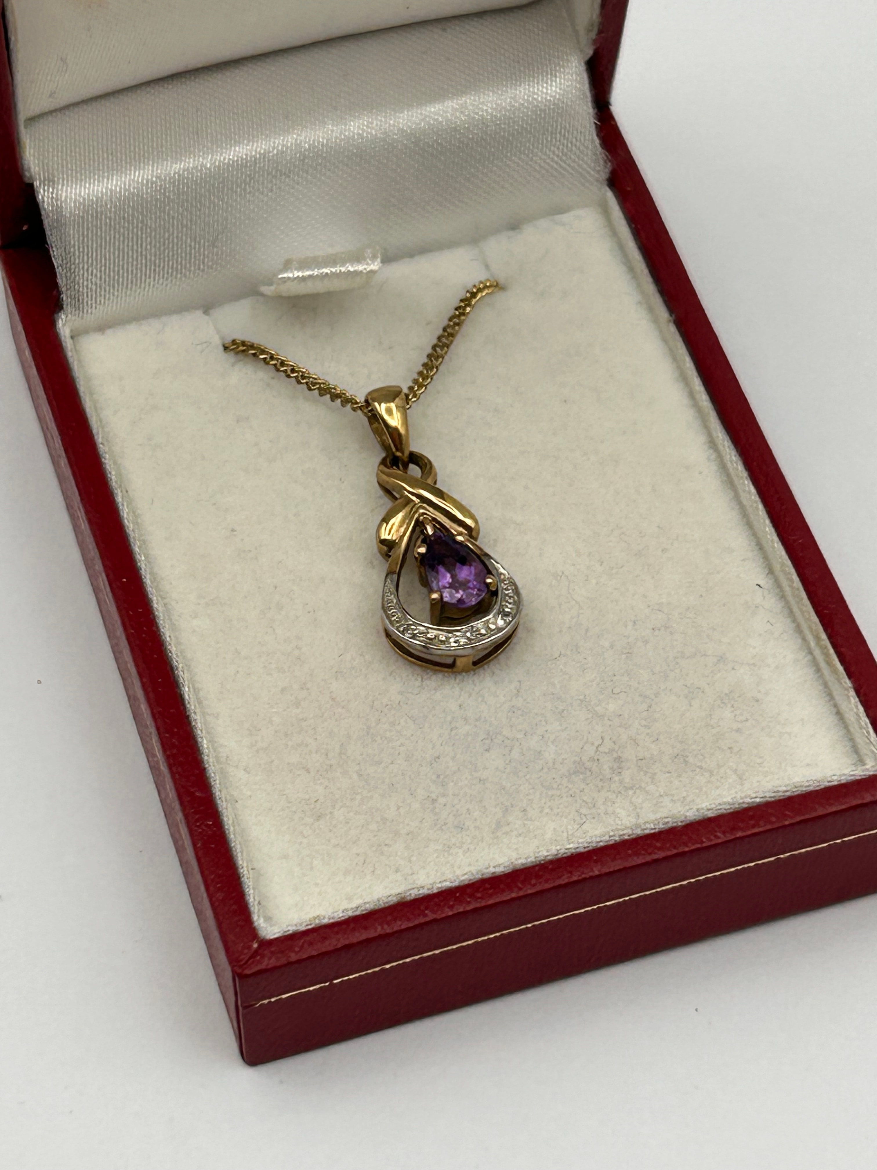 A 9ct Yellow Gold Amethyst and Diamond Pendant Necklace. The necklace features an abstract design pendant, with a polished yellow metal ribbon-like element partially encircling a pear-shaped, faceted Amethyst gemstone. Below this, a curved white metal element is pavé-set with multiple small, round, colorless stones, identified as diamonds. The pendant is suspended from a fine, yellow metal chain. It is presented within a red hinged jewelry box with a white satin-lined lid and a white velvet interior.