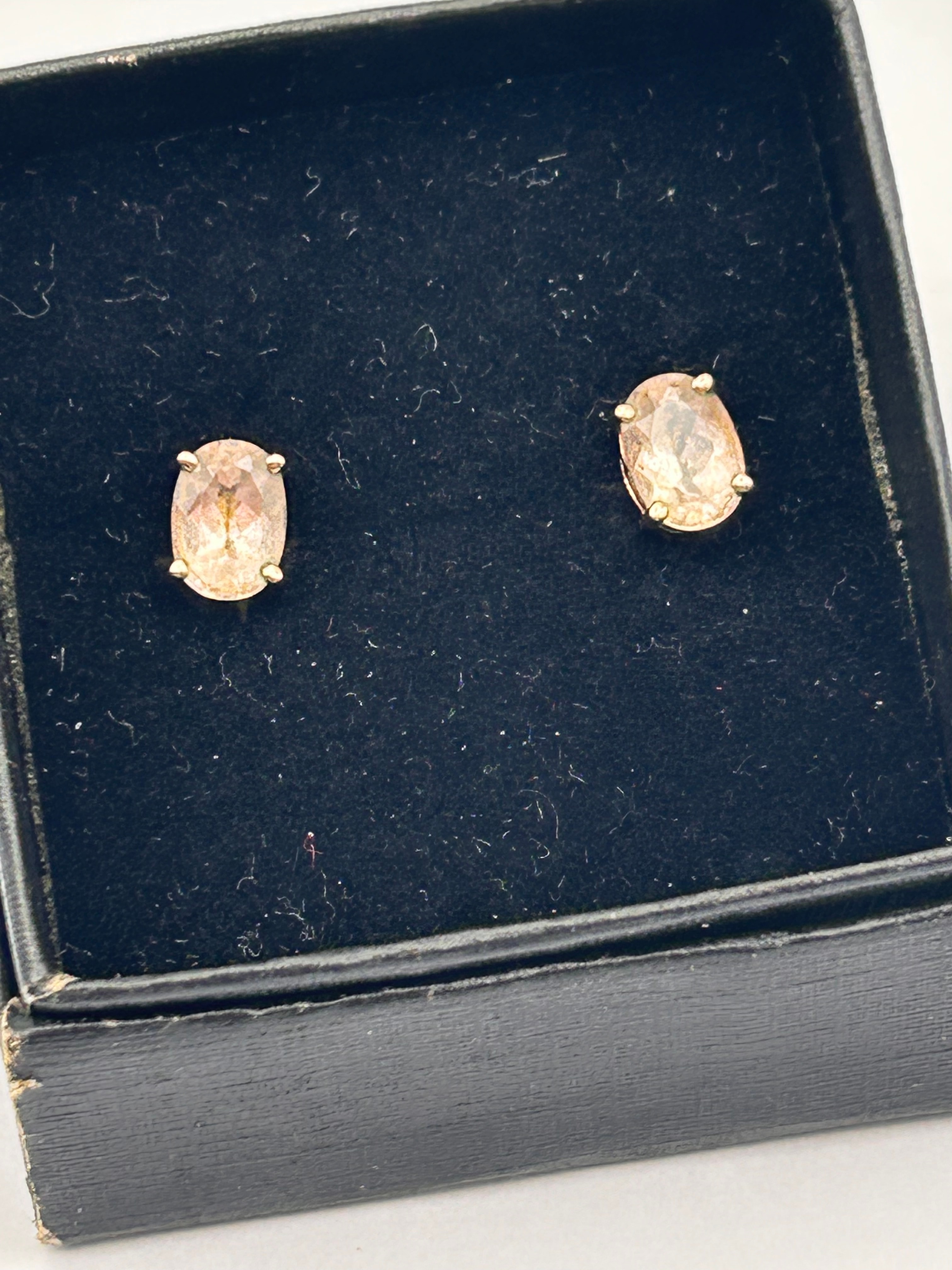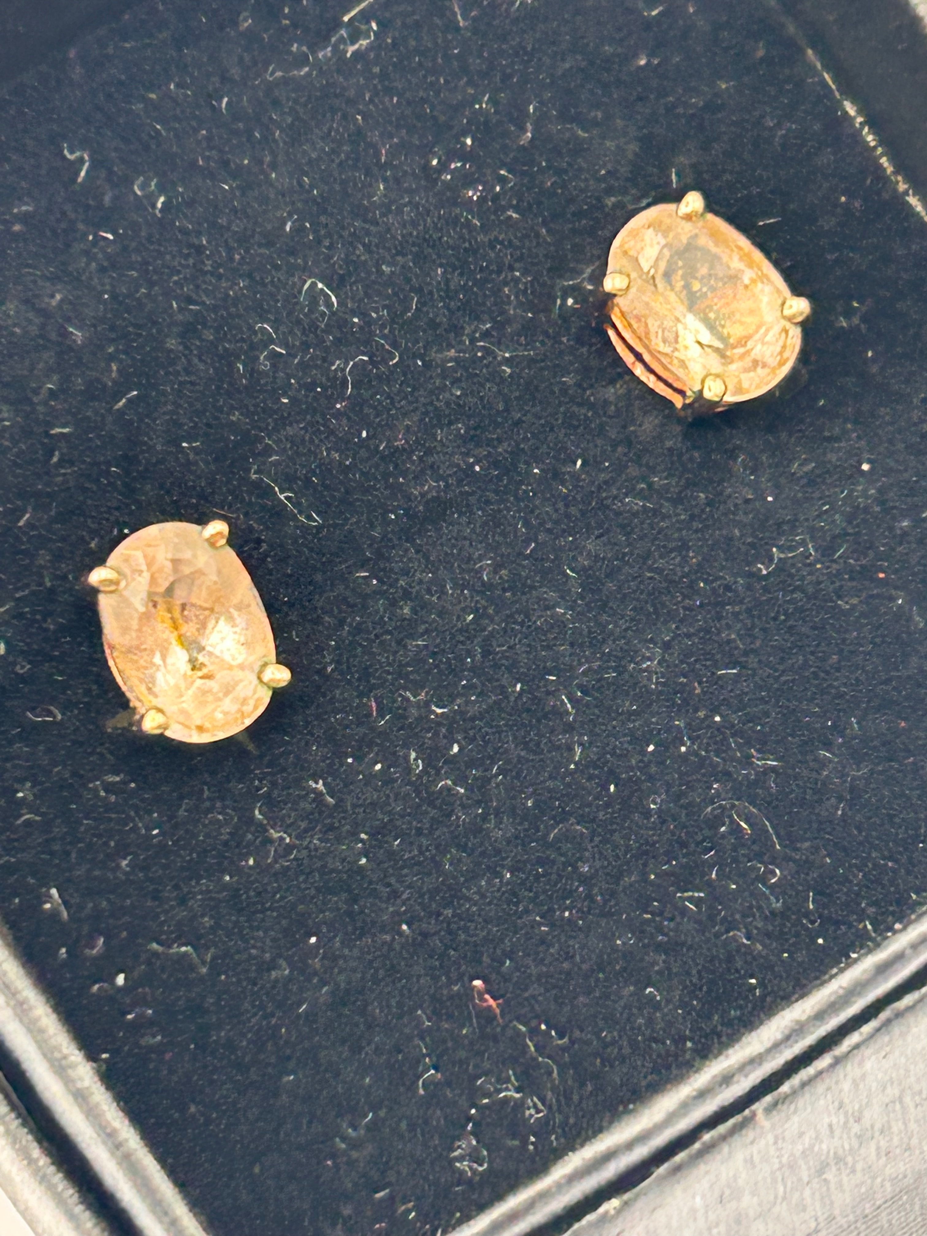 A pair of 9ct yellow gold stud earrings, each featuring a faceted oval-cut Quartz gemstone displaying a peachy-orange to light champagne hue, secured by a four-prong setting. The earrings are presented in a black box with a velvet-lined interior.