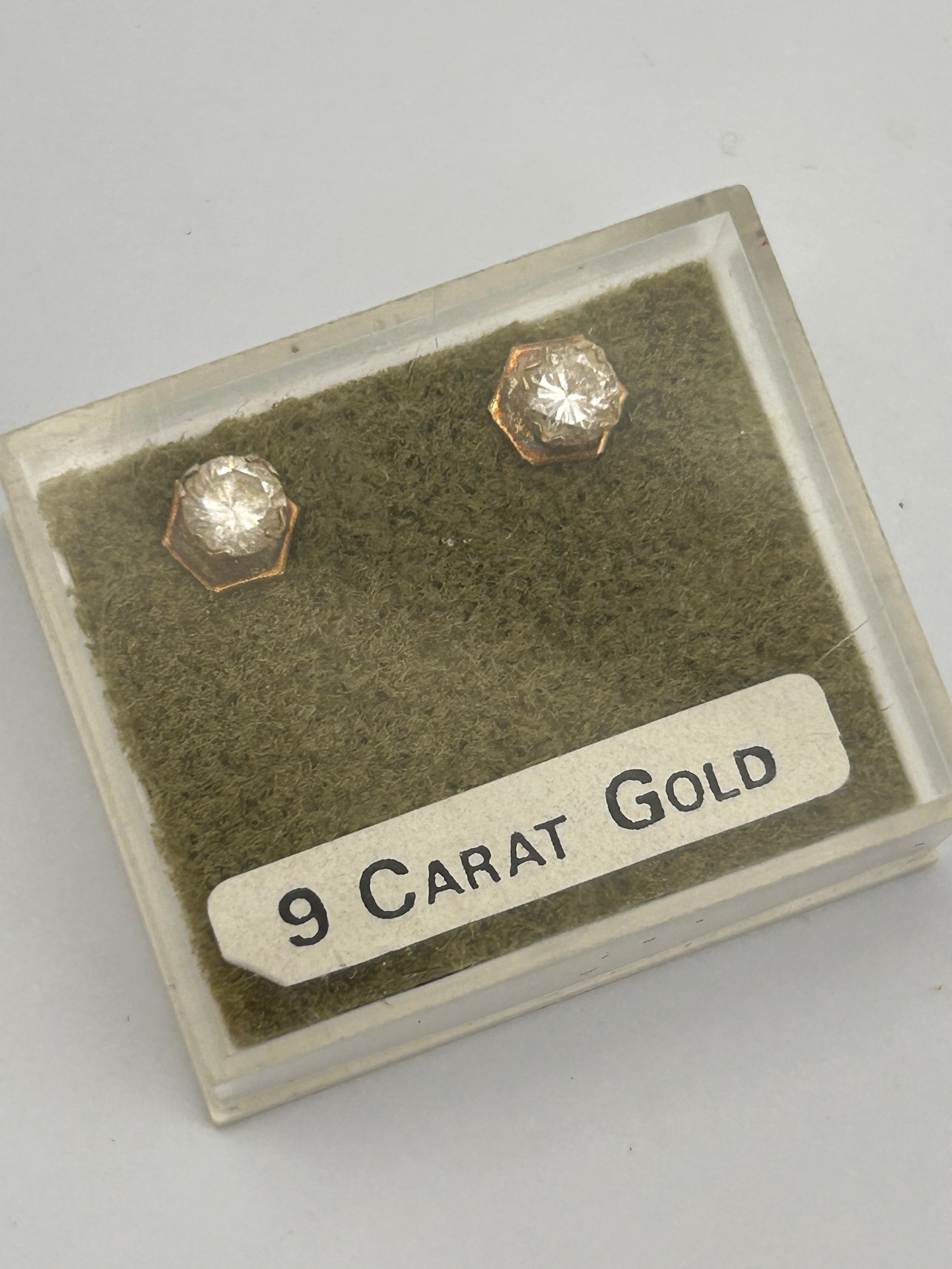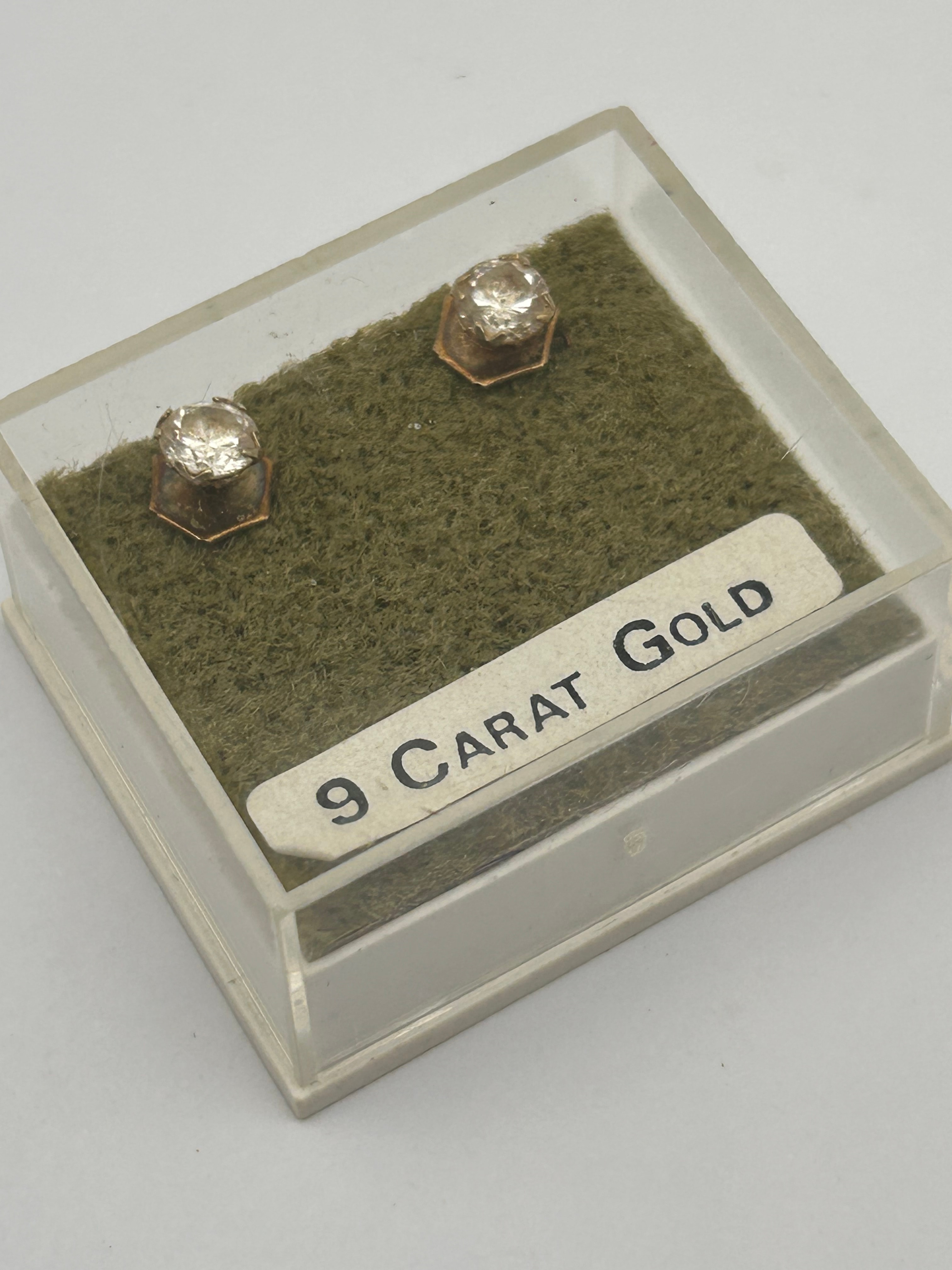 A pair of 9ct yellow gold stud earrings, each featuring a round-cut, faceted CZ stone securely set within a hexagonal bezel. The earrings are presented in a small, clear plastic display box with a textured green felt-like insert, which contains a white paper label prominently reading ‘9 Carat Gold’.