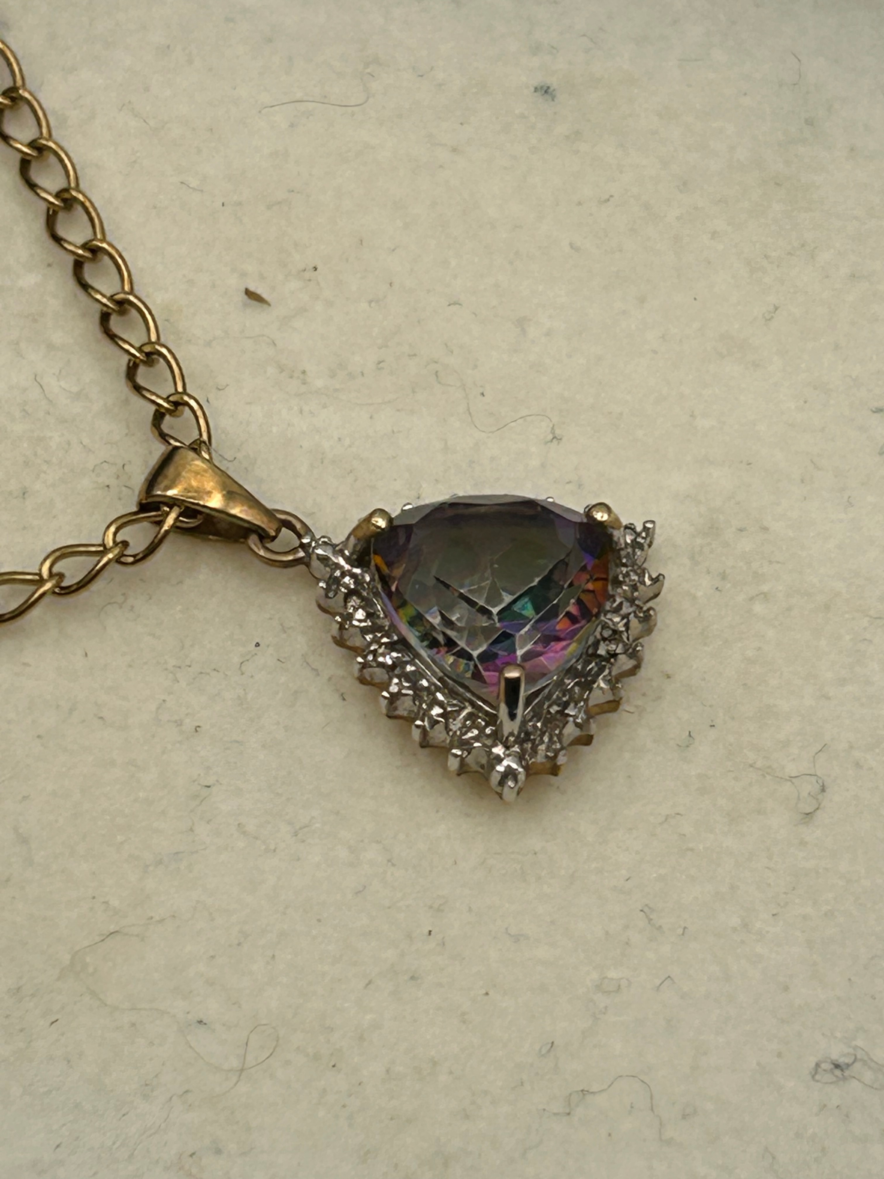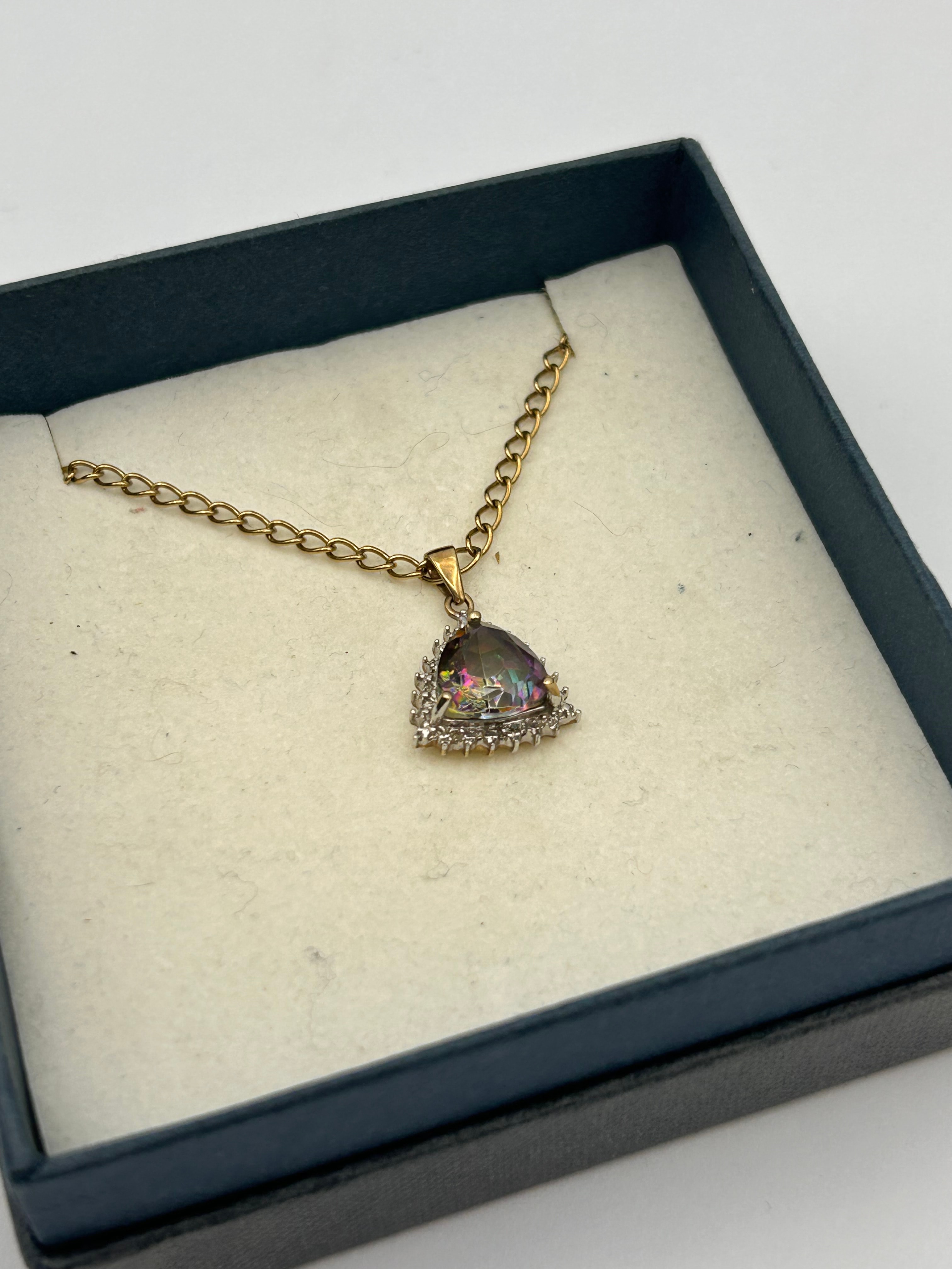 A contemporary pendant necklace featuring a prominent triangle-cut Mystic Topaz central stone, displaying a vibrant iridescent, multi-color effect. The central stone is framed by a halo of smaller, round-cut, clear simulant stones set in sterling silver. The pendant is suspended from a matching 9ct yellow gold bail, attached to an oval-link 9ct yellow gold chain. The item is presented in a dark blue display box with a cream-colored insert.