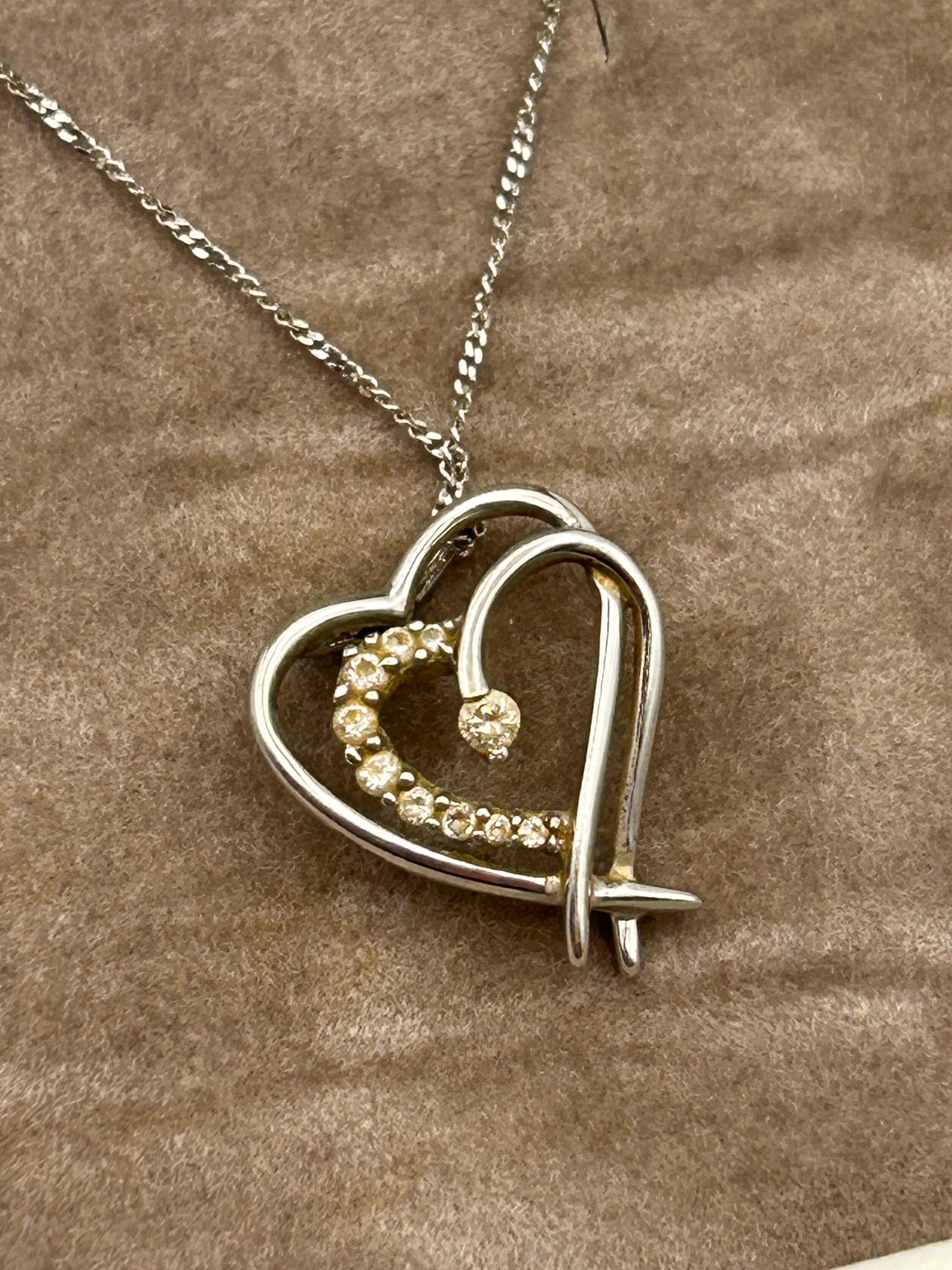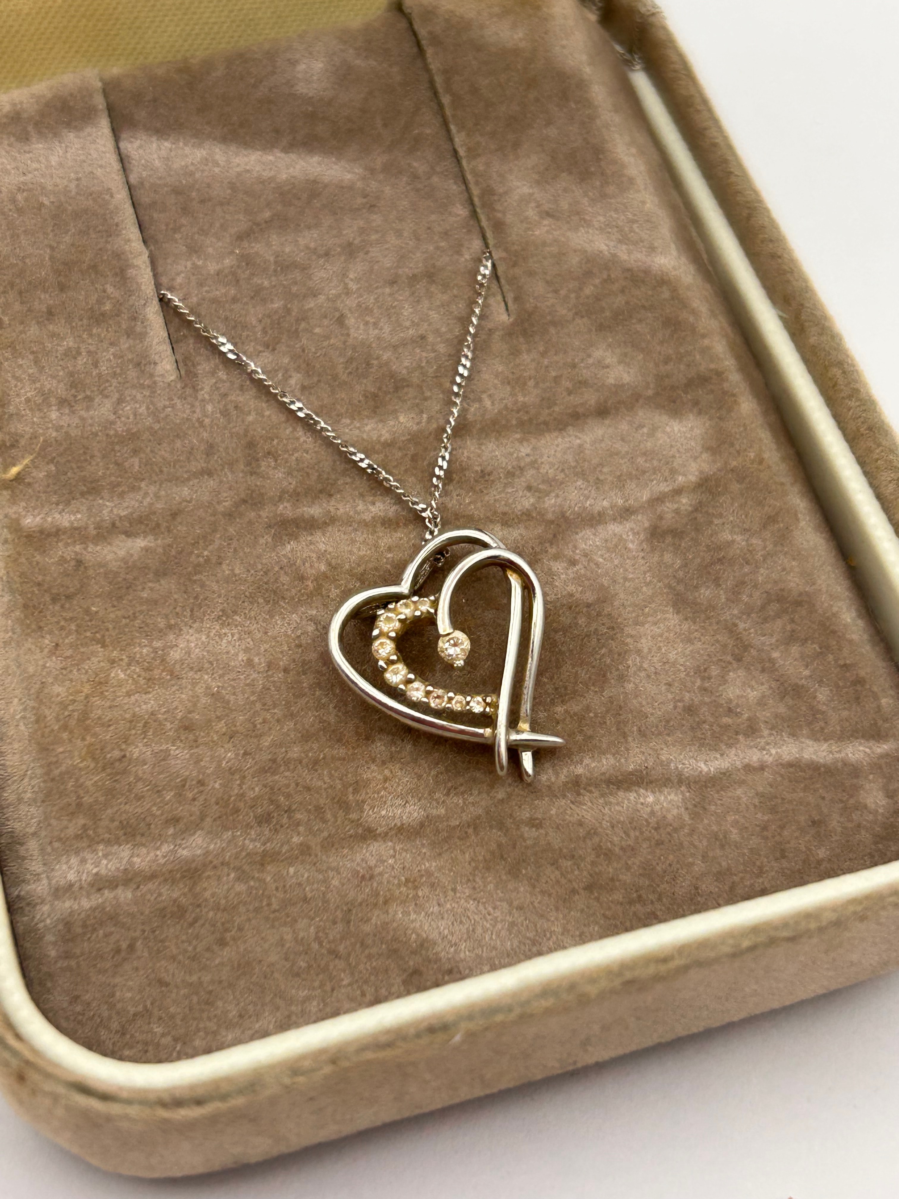 A contemporary necklace featuring a polished 9K gold chain connected to an interlocking heart-shaped pendant. The pendant comprises a larger, polished white gold heart outline interwoven with a smaller, yellow gold heart which is pavé-set with numerous small, round diamonds, accented by a single larger clear diamond at its lower tip. The item is presented within a tan velvet-lined jewelry box.