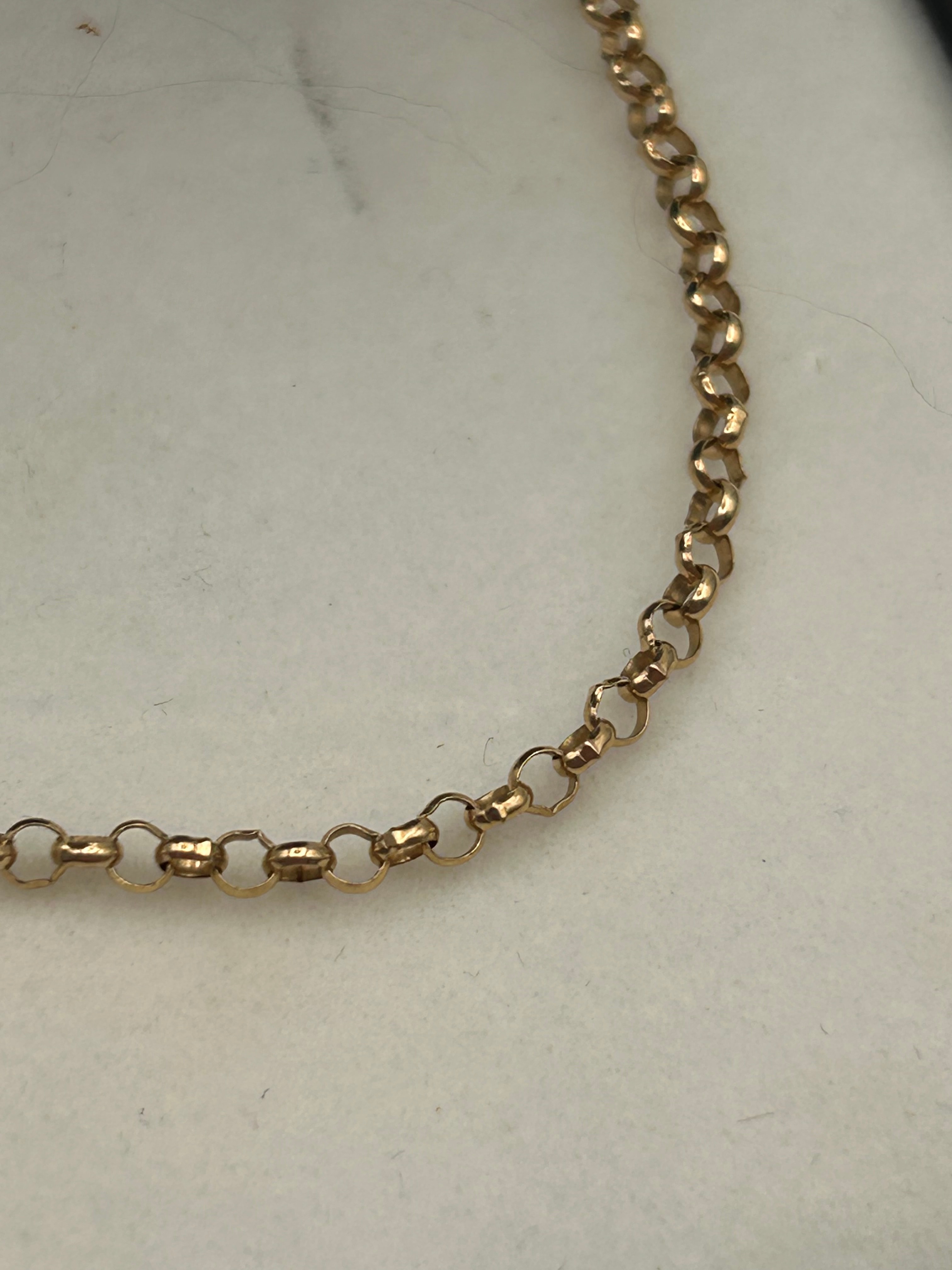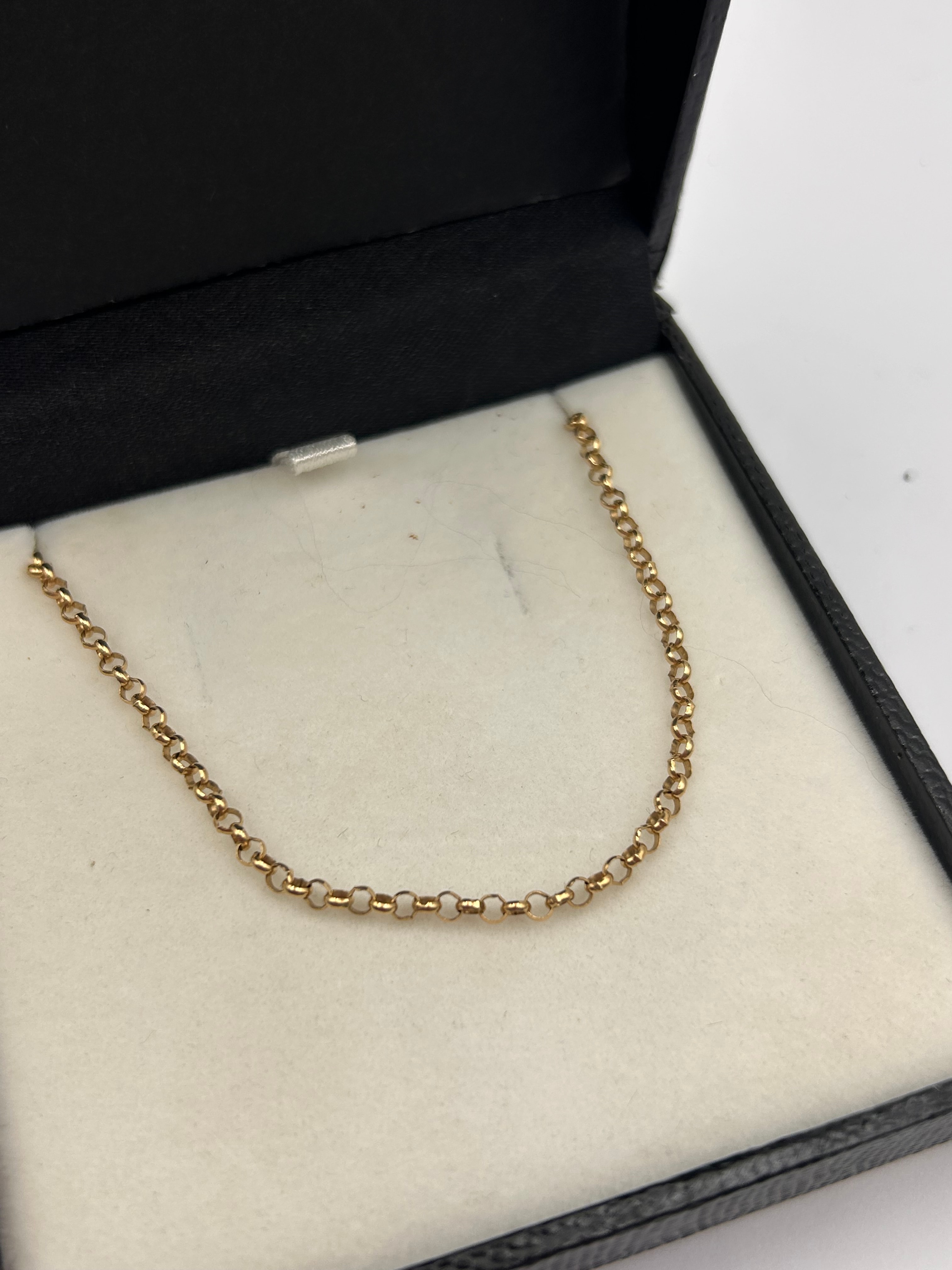 A 9ct yellow gold Belcher chain necklace. The chain is crafted in a classic Belcher link style with uniformly sized, rounded, interlocking circular links, exhibiting a consistent bright luster. No visible hallmarks, maker’s marks, or inscriptions are discernible. The chain is presented in a black hinged jewelry box with a white velvet-like interior.