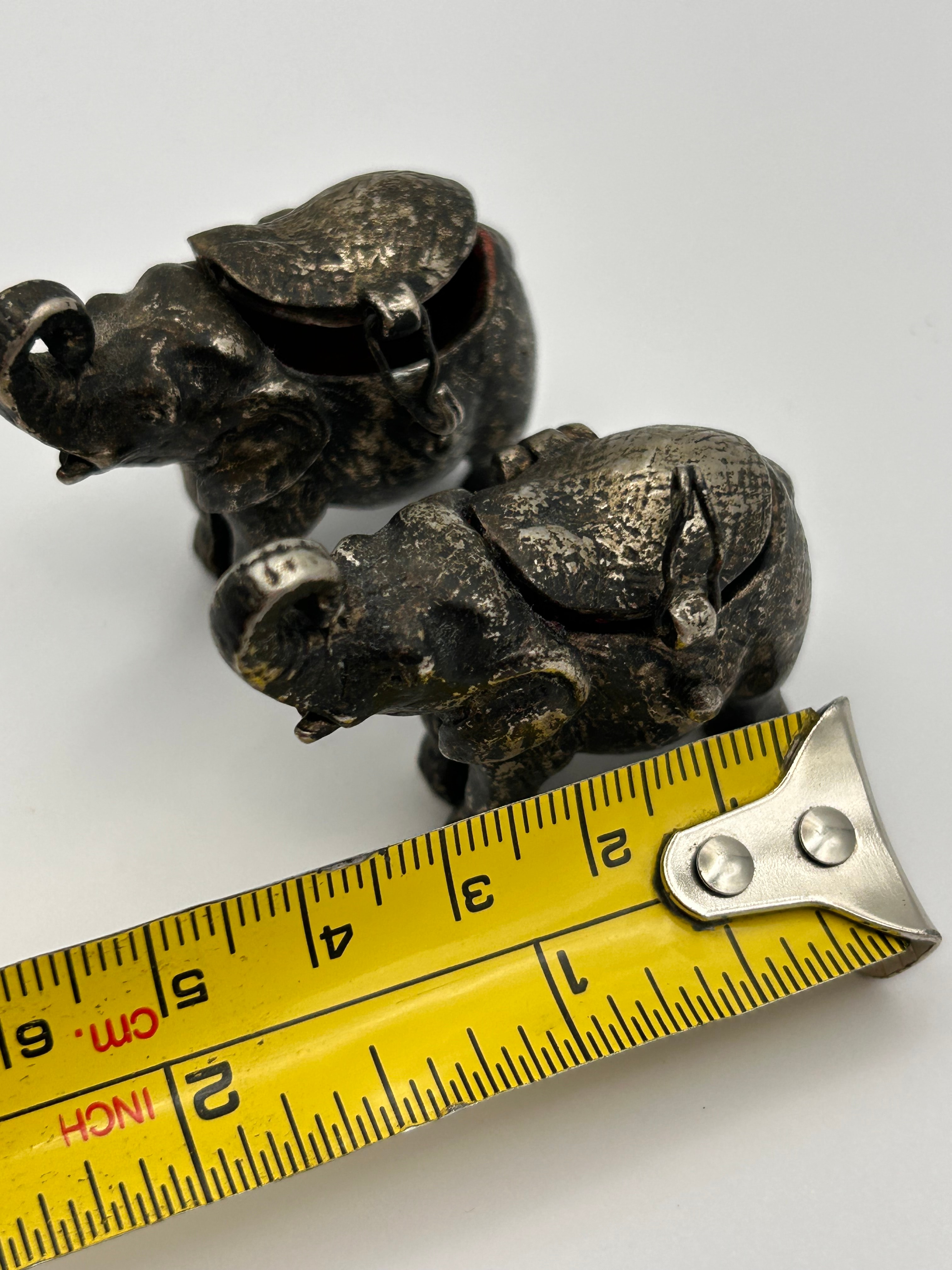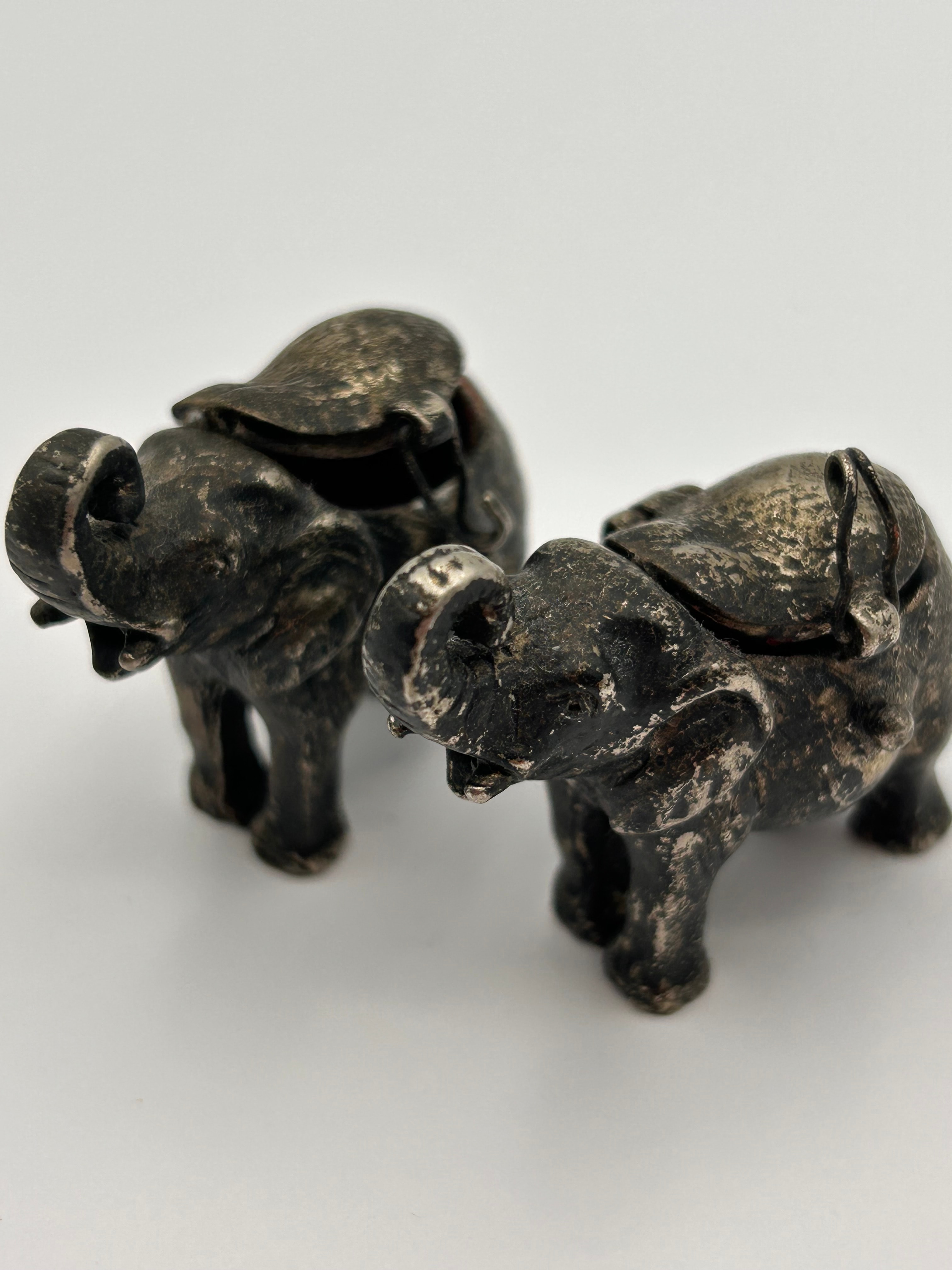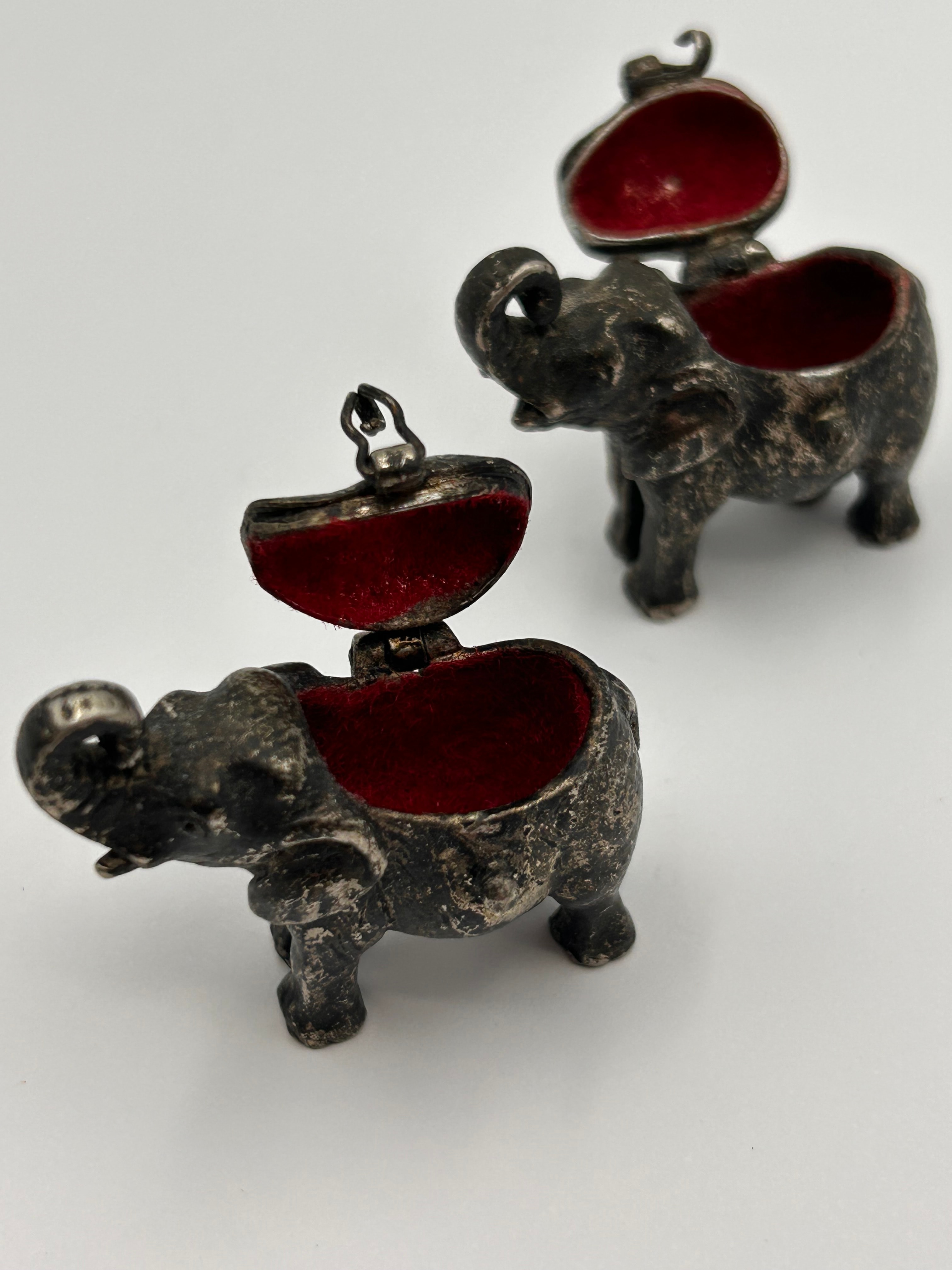 A pair of vintage elephant-form trinket or pill boxes. Each crafted from a darkened, patinated silver-toned metal, likely pewter as suggested by web intelligence, exhibiting a worn finish with brighter metallic highlights. Both feature a hinged lid on the elephant’s back, opening to reveal an interior lined with deep red velvet or flocking. One elephant displays a small suspension loop attached to its lid. The style is decorative and appears consistent with vintage manufacture. No visible maker’s marks or textual inscriptions are present on either object.
