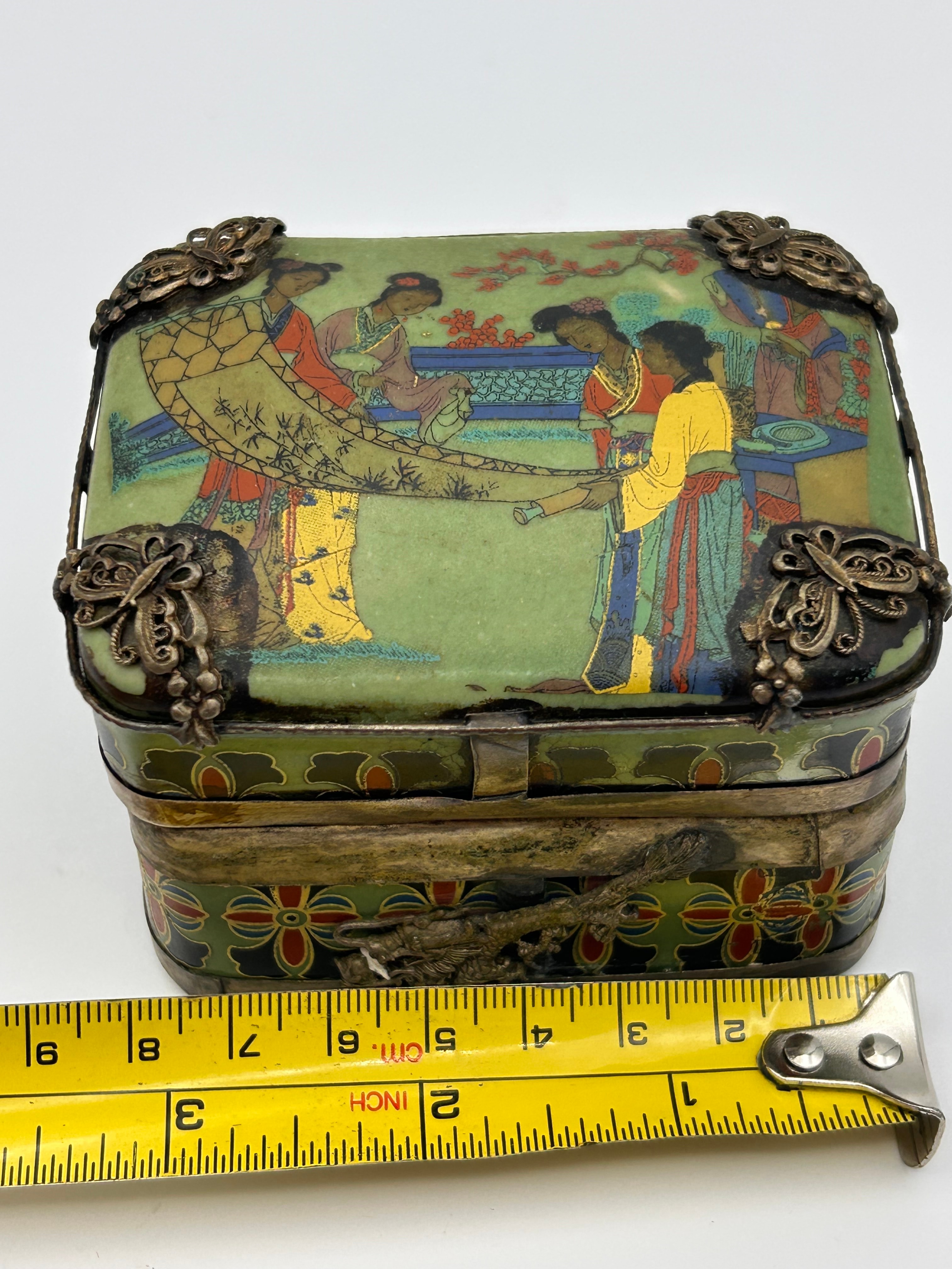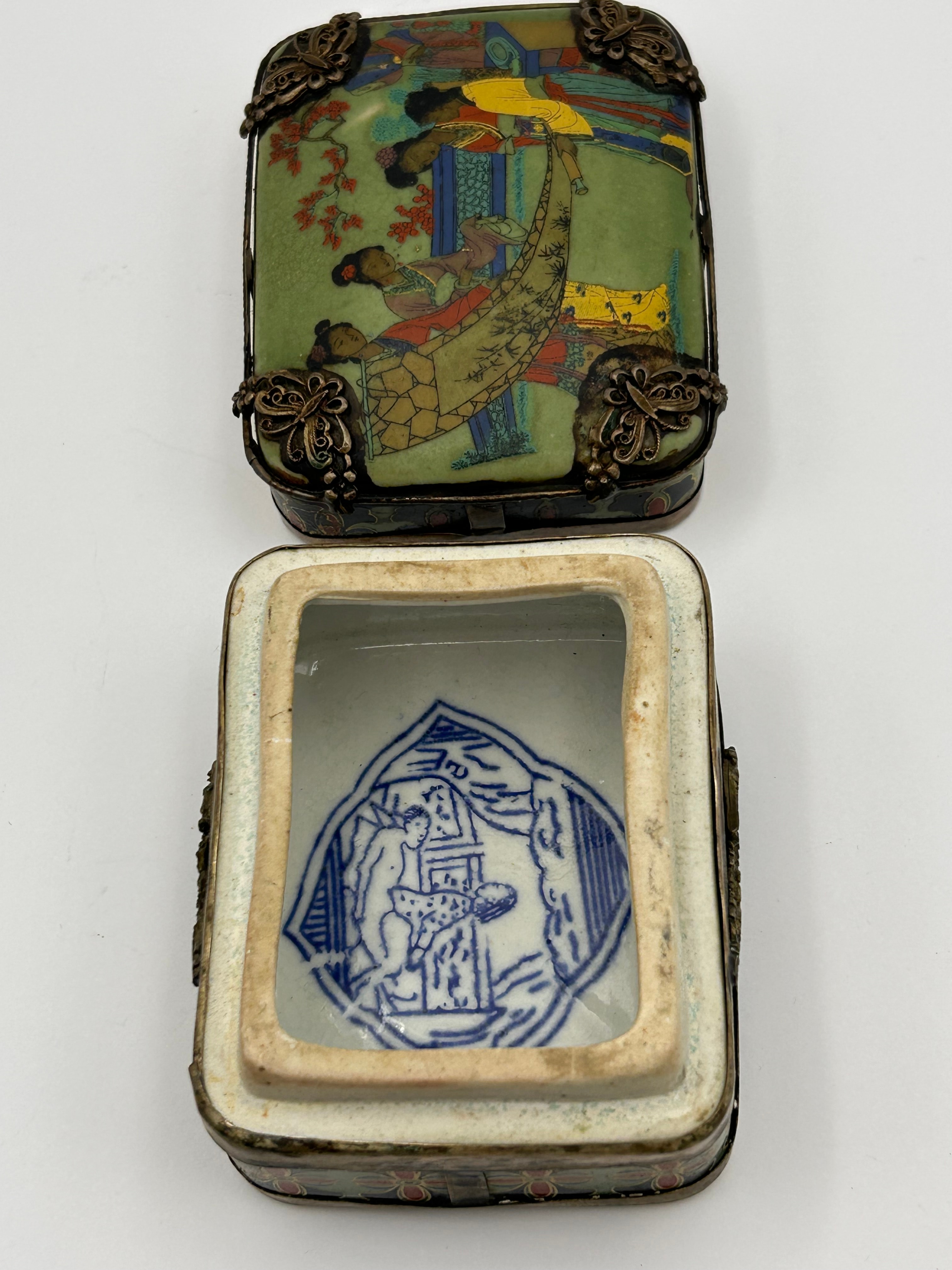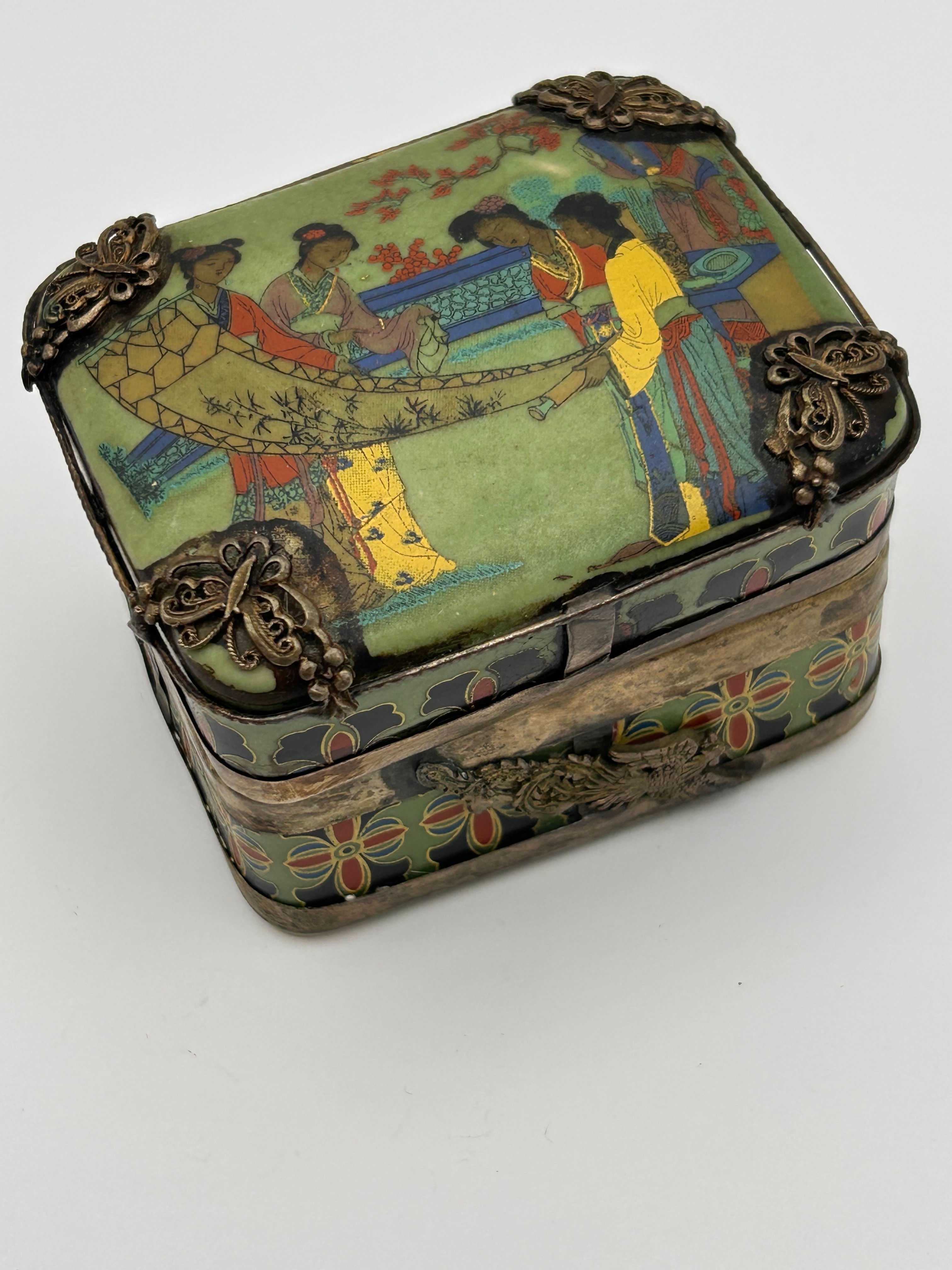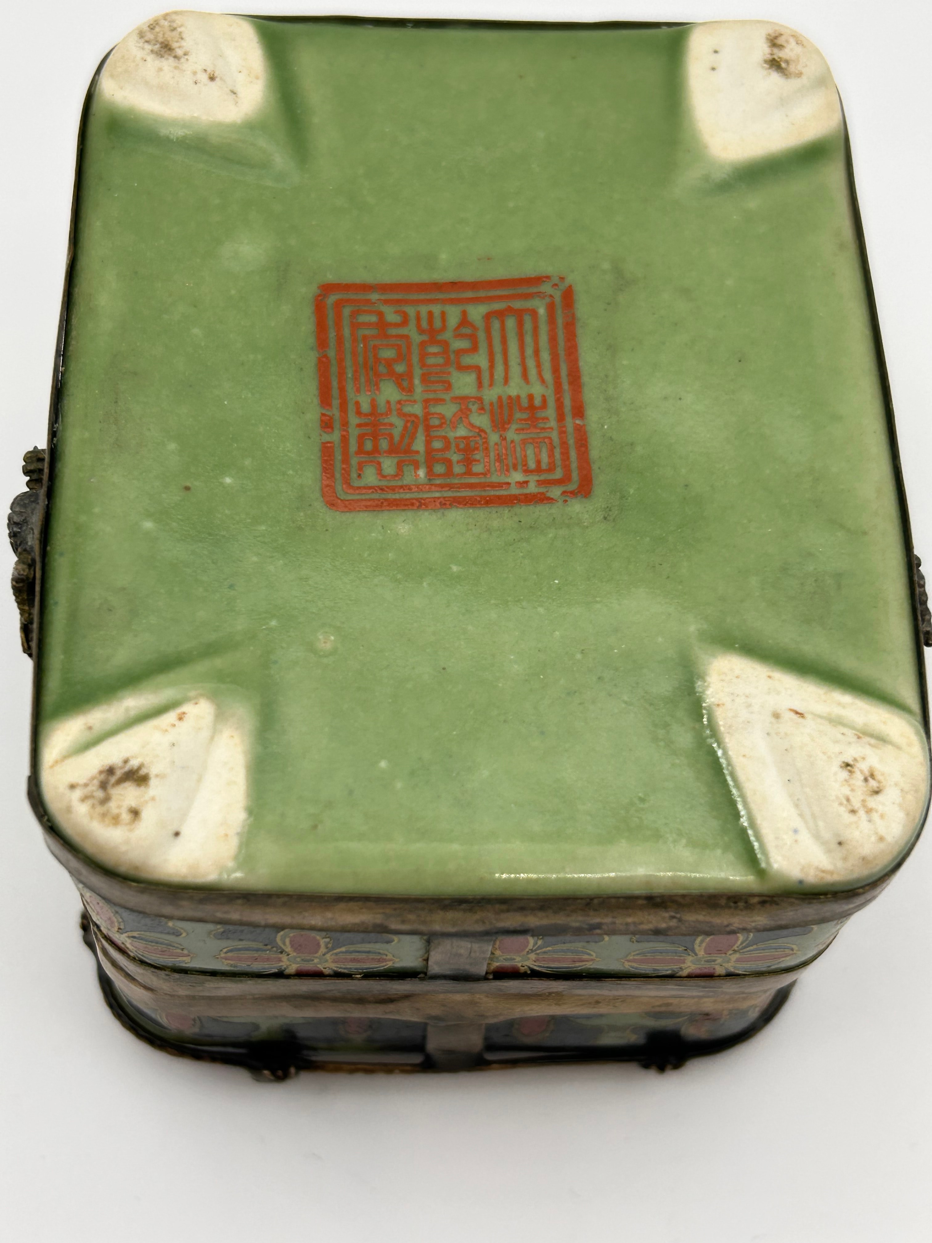 This small, rectangular hinged box, approximately 4 inches in length, is crafted from multiple materials. The exterior features enameled panels set within ornate, aged silver-tone metal mounts and bands. The lid depicts a vibrant, polychrome scene of traditional figures, possibly engaged in textile work, against a green background. The box’s sides display continuous floral patterns in red, blue, and green. The interior contains a removable white ceramic or porcelain insert with a blue underglaze figurative design centered within a cartouche. The bottom of the box is a green enameled or ceramic surface and bears a red square seal mark, which translates to “Made in the Great Qing Qianlong reign” (大清乾隆年製).