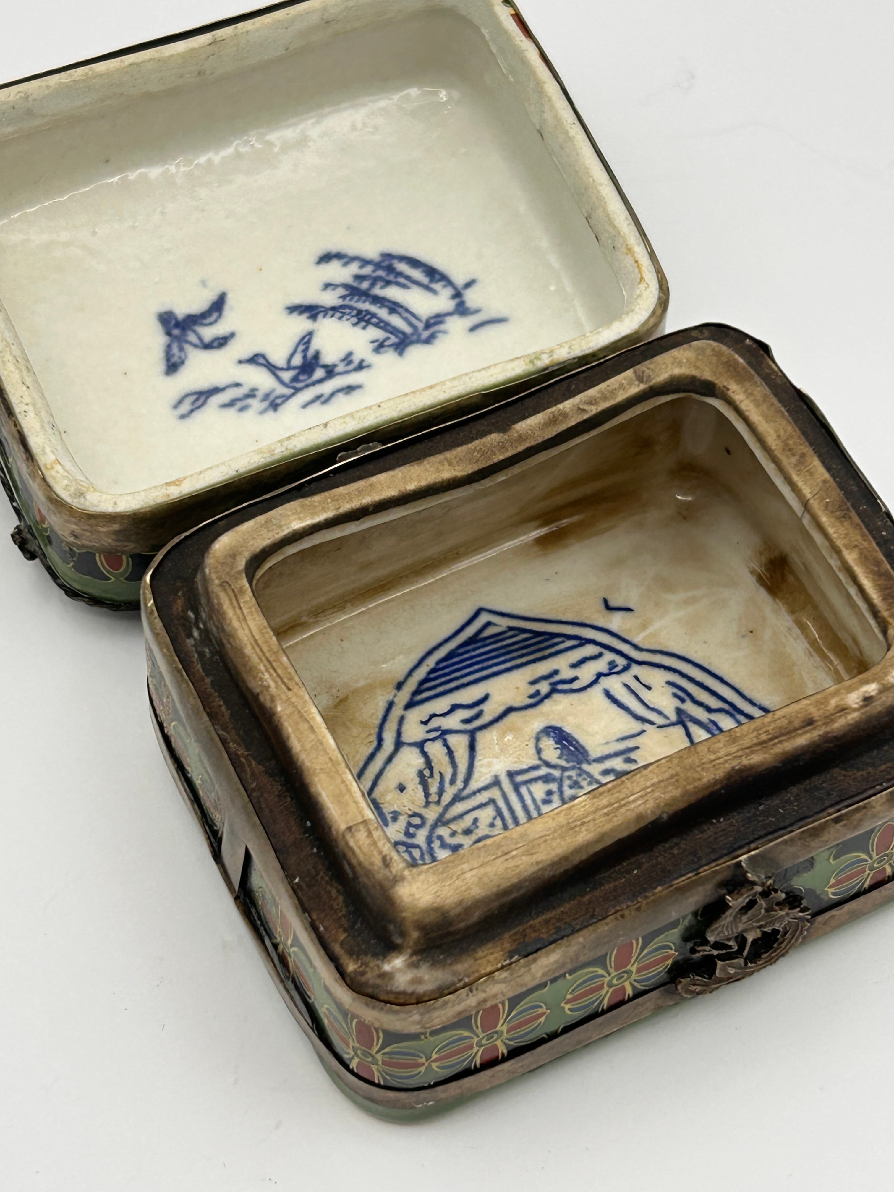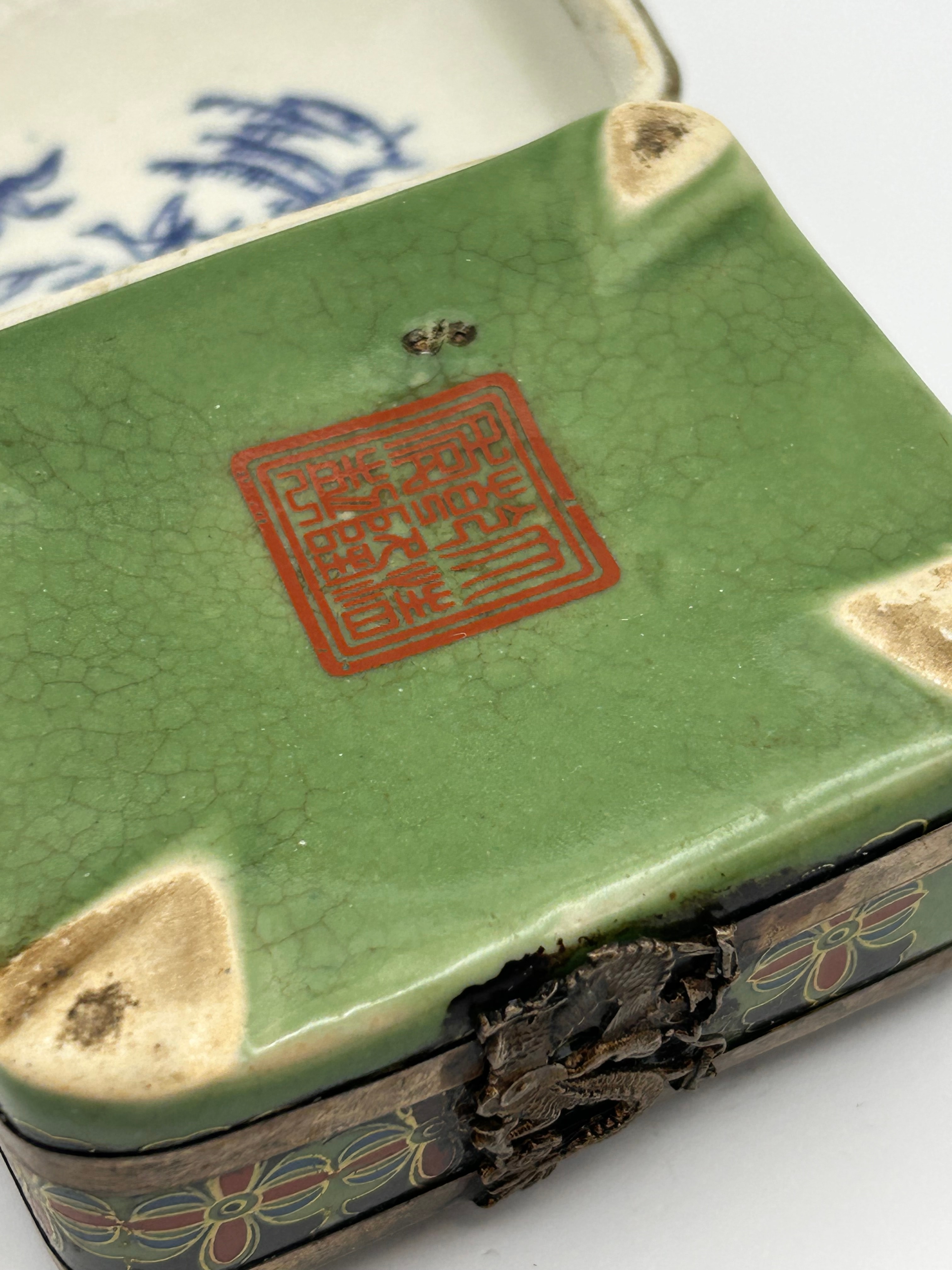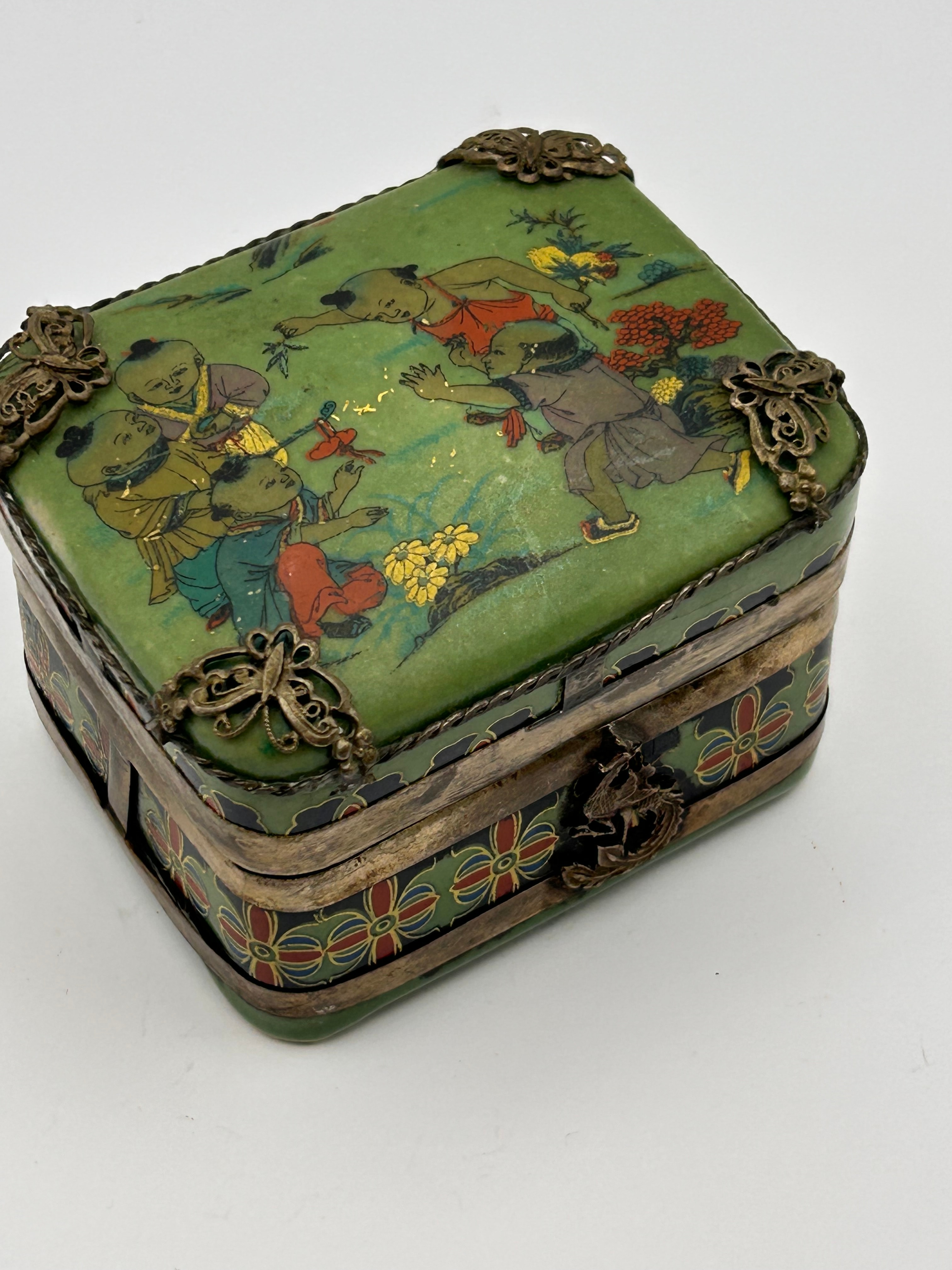 A decorative rectangular lidded box, described as a Chinese inlaid porcelain box. The exterior features ornate, darkened brass or bronze corner mounts and a front clasp, framing a vibrant green top panel adorned with polychrome painted depictions of playful children amidst floral elements. The sides are decorated with a repetitive floral and geometric pattern. The box opens to reveal a white ceramic interior with blue underglaze decoration: the lid depicts birds in a landscape, and the base shows a traditional building. The exterior bottom surface is a crackled green glaze, centered with a red seal mark reading “乾隆年製” (Qiánlóng Nián Zhì), which translates to “Made in the Qianlong reign.”