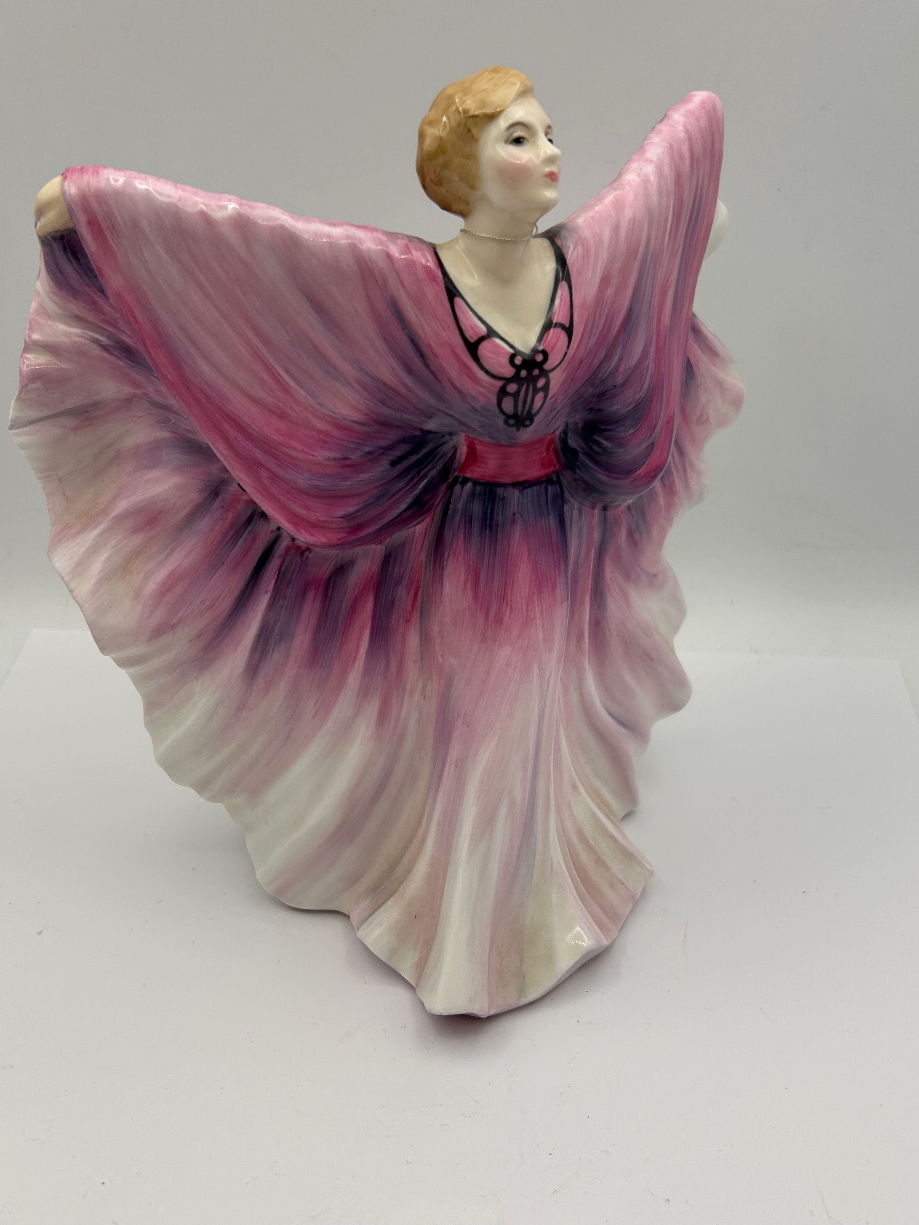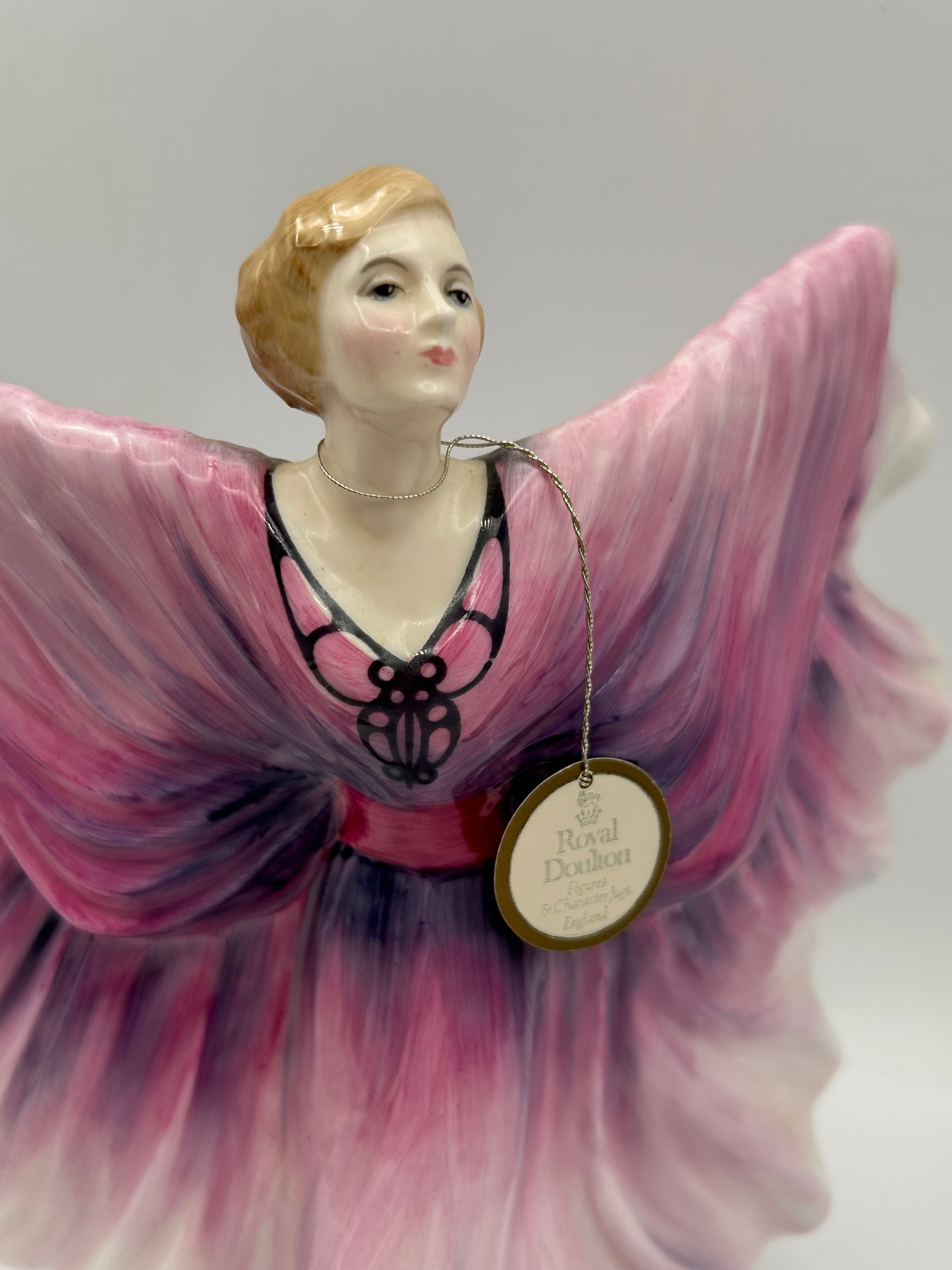 A Royal Doulton ‘Isadora’ figurine, model number HN2938, modelled by Peter A Gee. This ceramic figurine depicts a female figure with blonde, bobbed hair, clad in a dramatically flowing gown with a gradient from vibrant pink to deep purple, featuring black scrollwork on the bodice and a cinched waist. Her arms are outstretched in an elegant pose, suggesting movement or dance. The material is glazed porcelain or bone china. A round, gold-rimmed hang tag is attached by a silver chain, bearing a crown logo above the text ‘Royal Doulton,’ ‘Figurines & Character Jugs,’ and ‘England.’