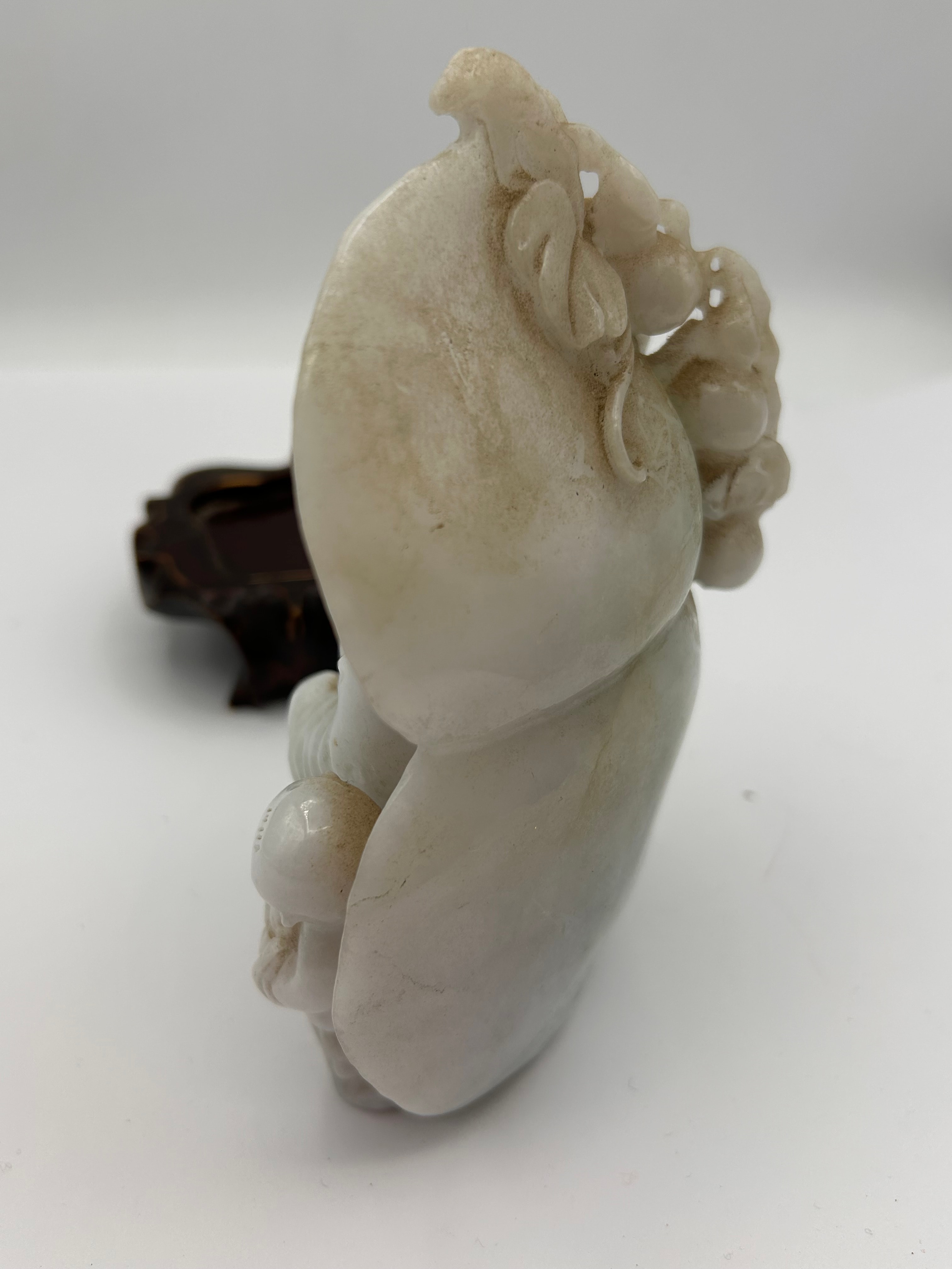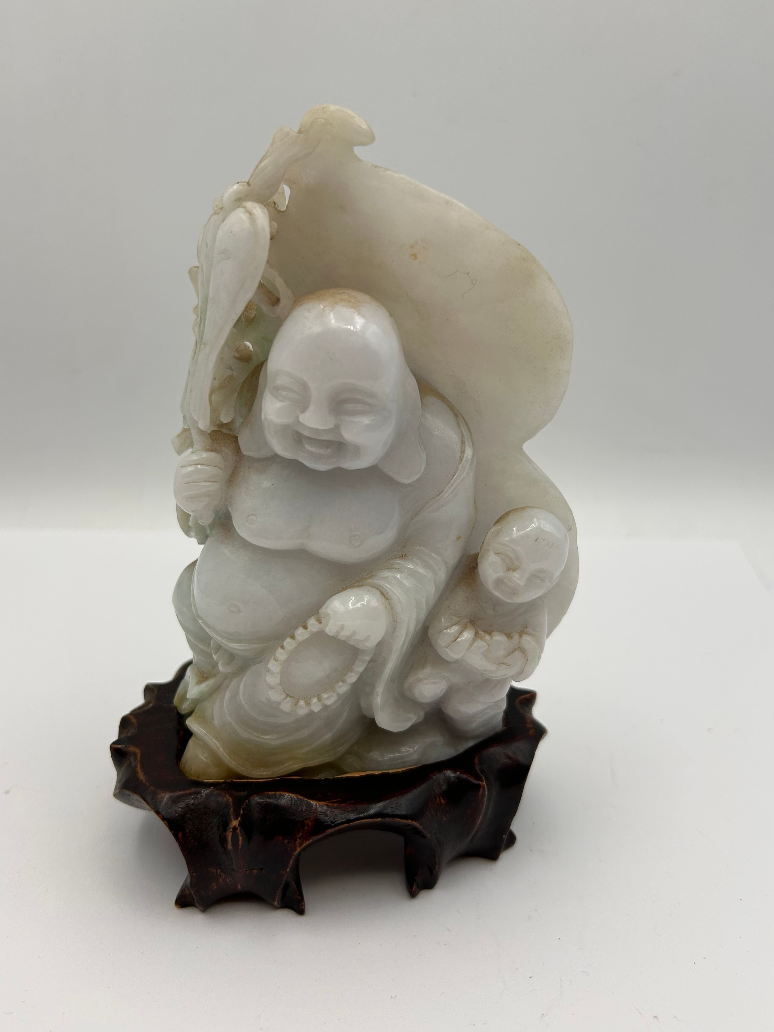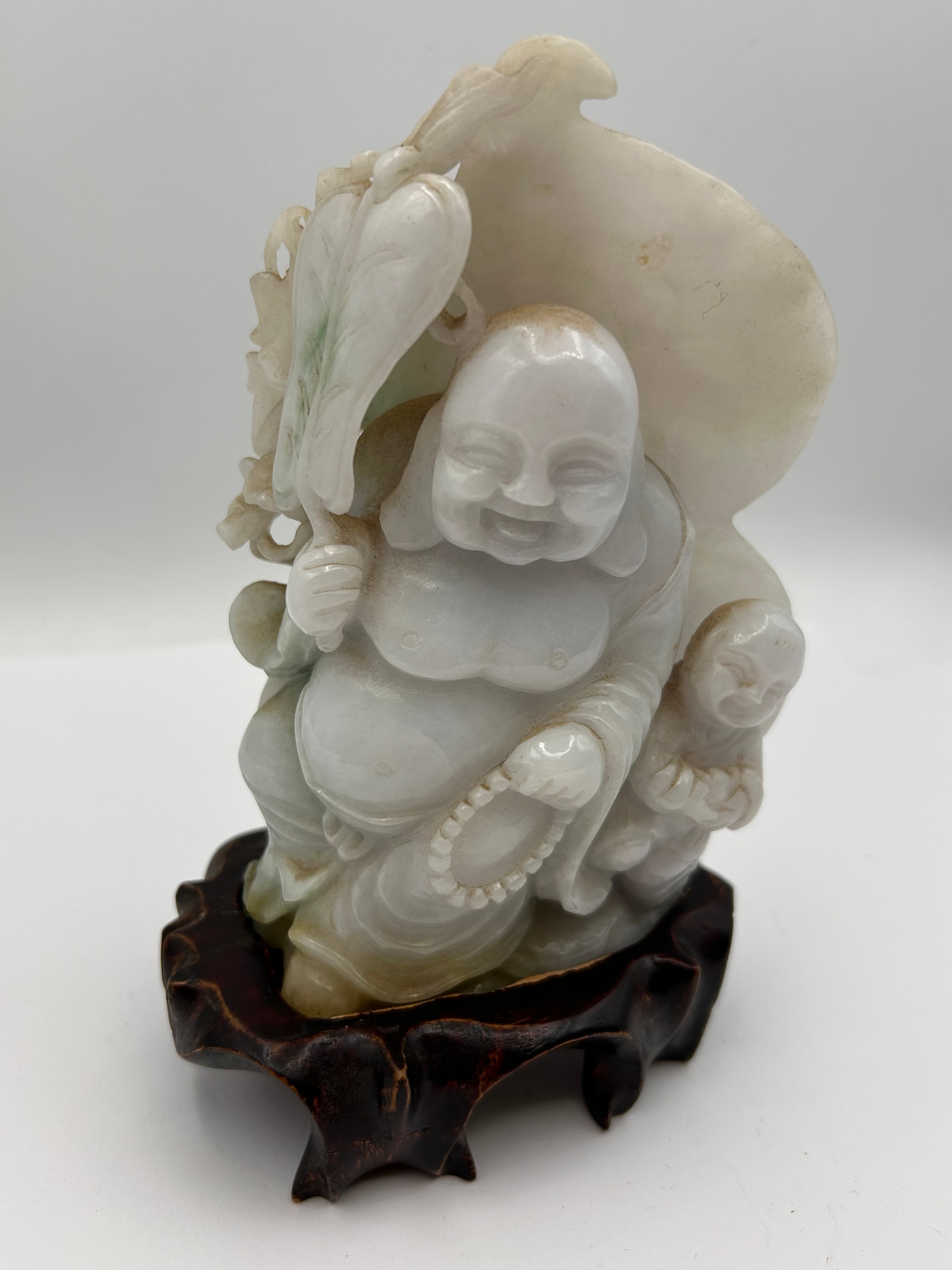 A Chinese Natural Jadeite Jade carving depicting Maitreya Buddha (Budai) with two playful children. The jovial Budai figure is seated, holding a staff-like object and a string of beads. A large, leaf-shaped element or sack is positioned behind the main figure. The material exhibits a translucent quality with a predominant pale greenish-white to off-white coloration and natural inclusions. The carving is mounted on a fitted, dark brown, carved wooden display stand.