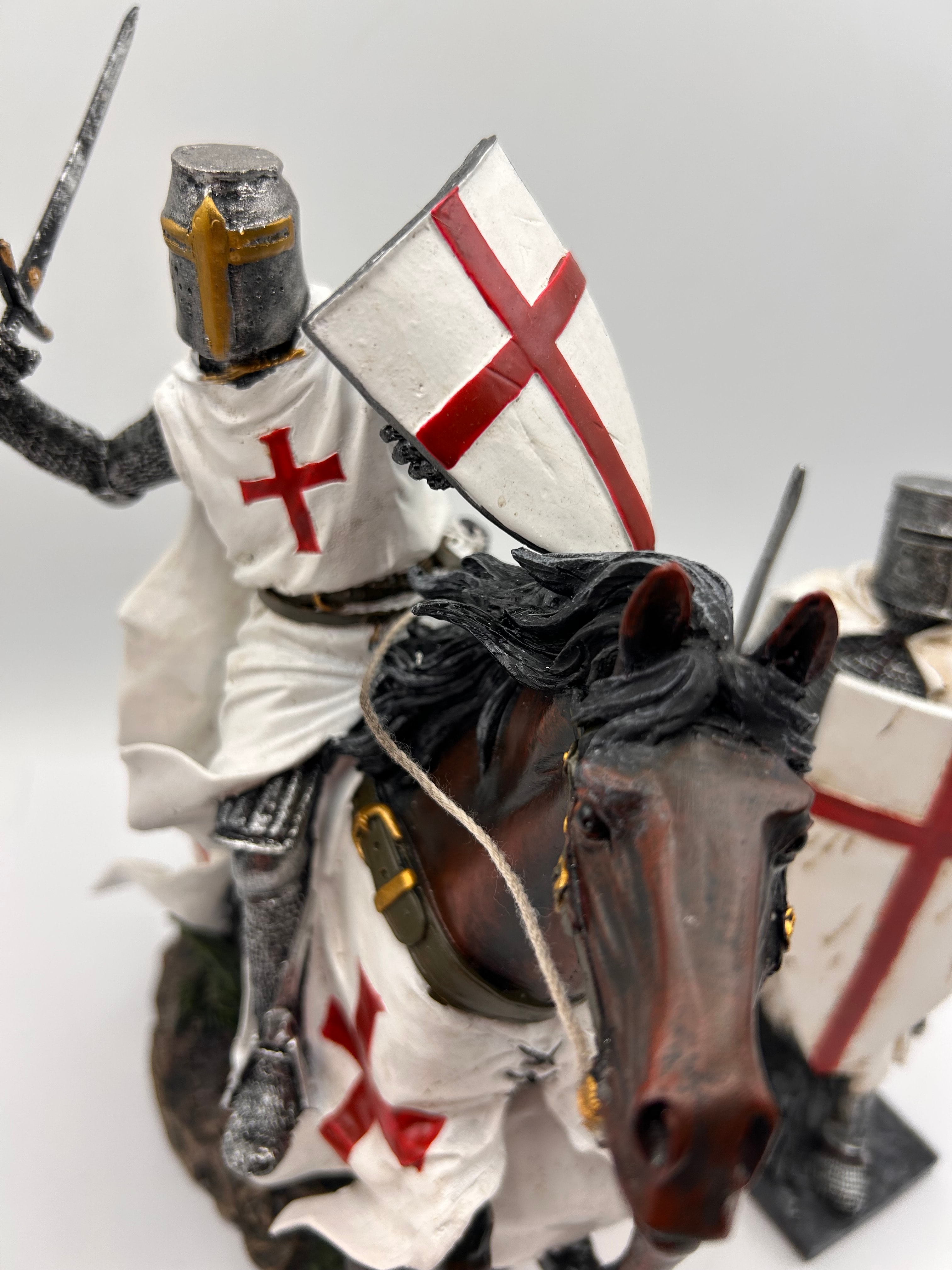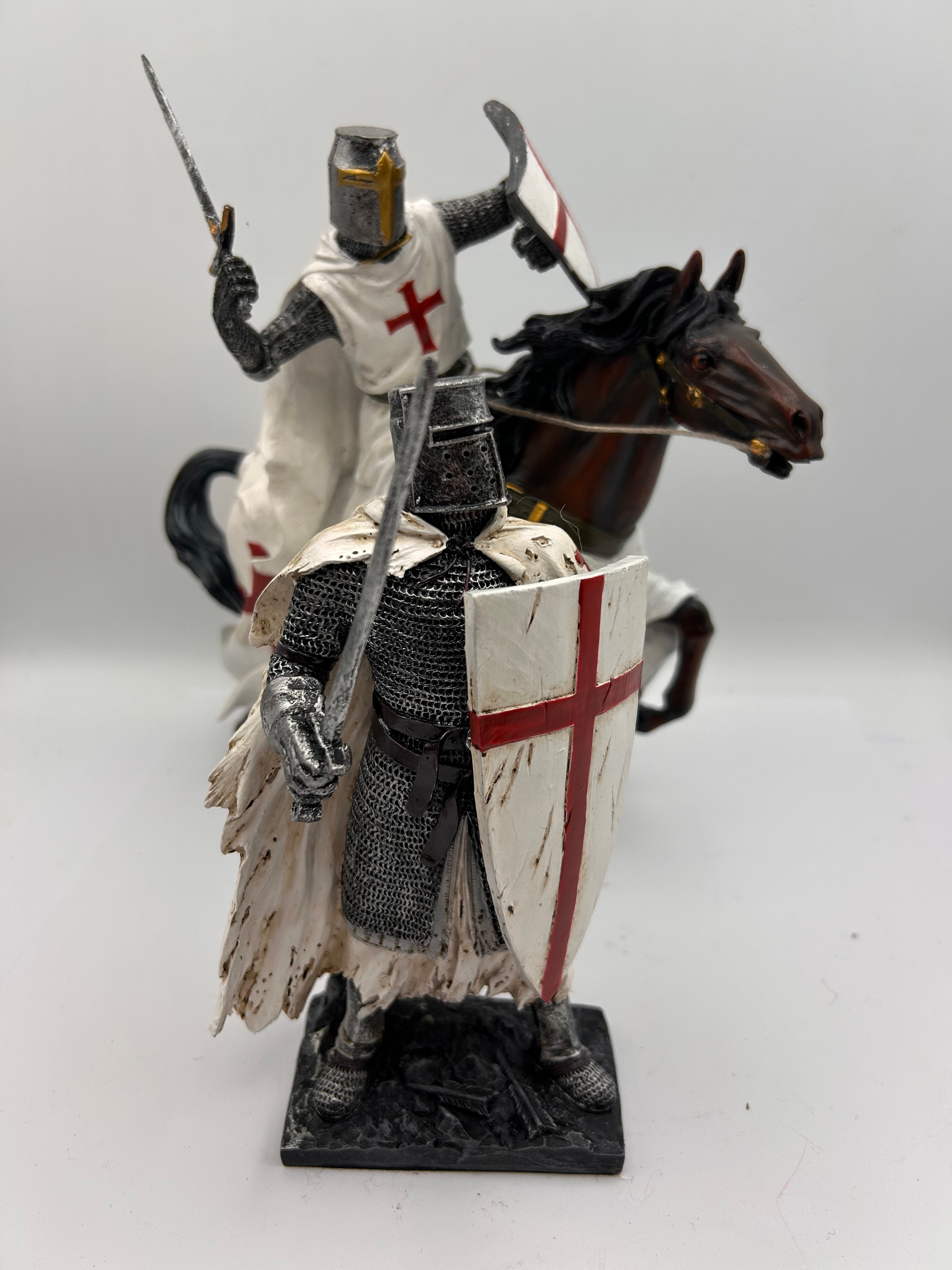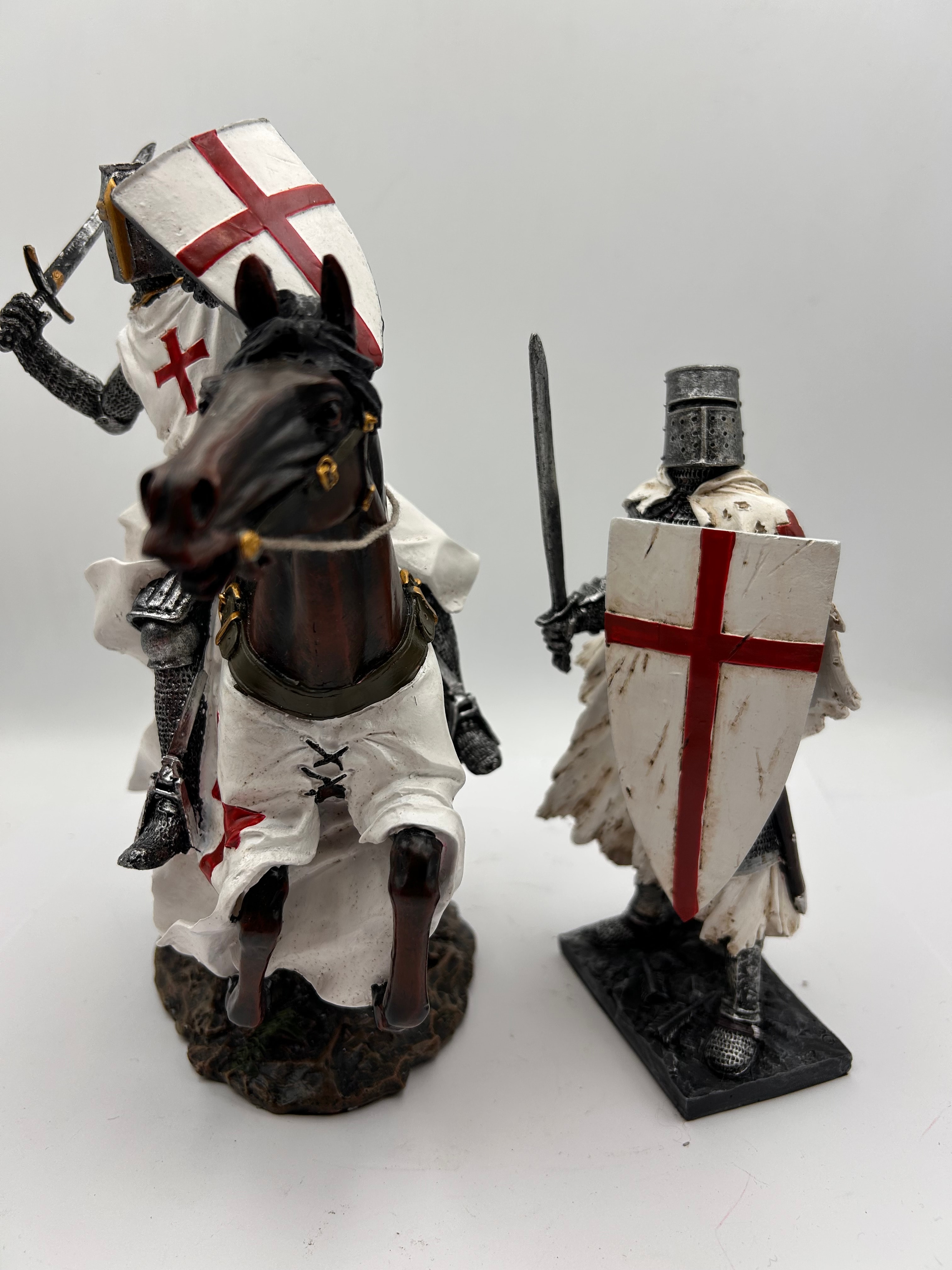A pair of decorative figurines, one depicting a mounted knight and the other a standing knight, both rendered in a medieval Crusader style. Each figure is characterized by a great helm, chainmail armor, and a white surcoat or cape emblazoned with a red cross. Both knights are armed with swords and shields, the latter also bearing a red cross on a white field. The figurines are constructed from a cast resin or composite material and feature a hand-painted matte finish. The standing knight is presented on a rectangular dark base, while the mounted knight rests on a more organic, textured dark base. No visible text or manufacturer markings are discernible.