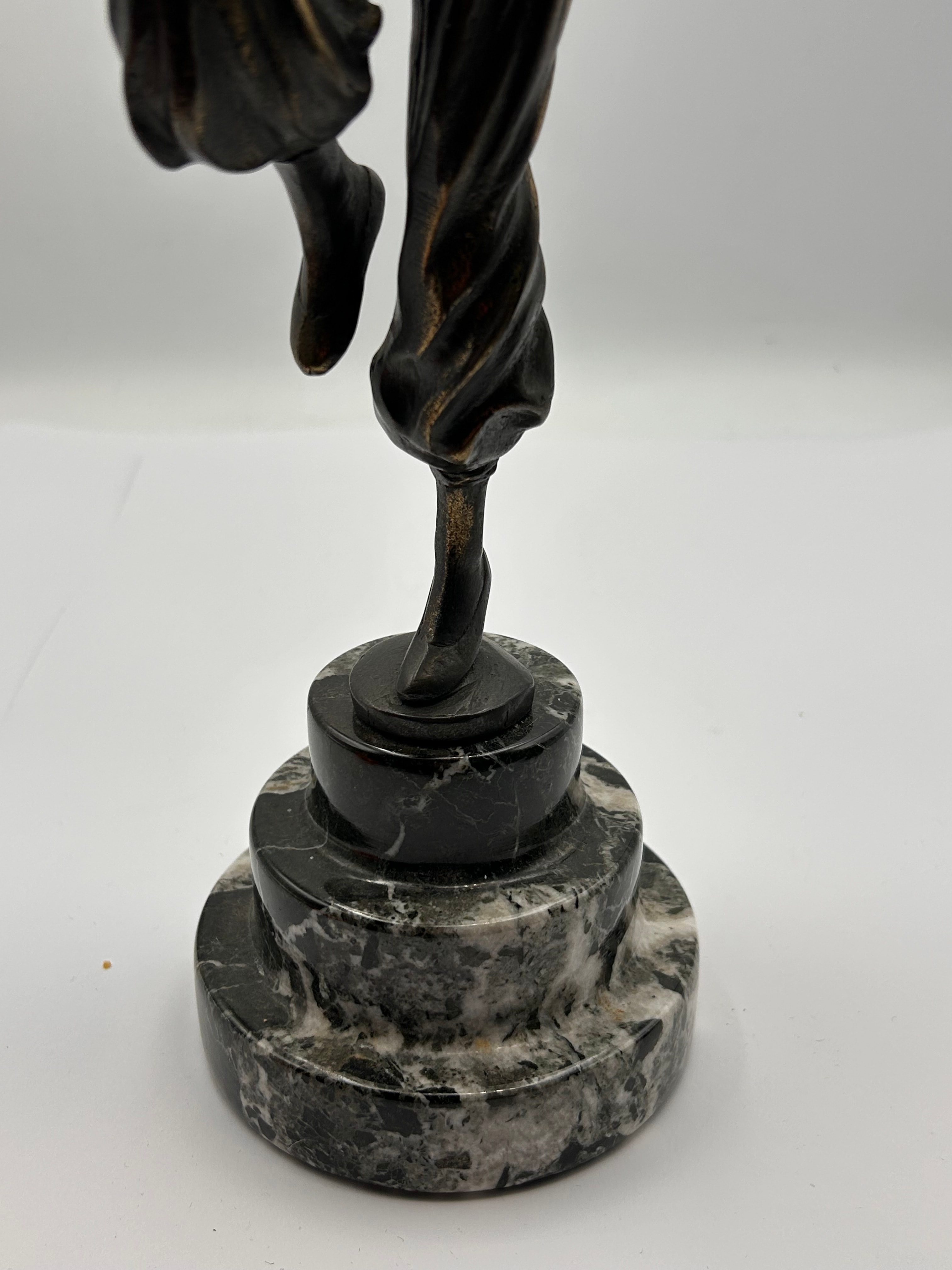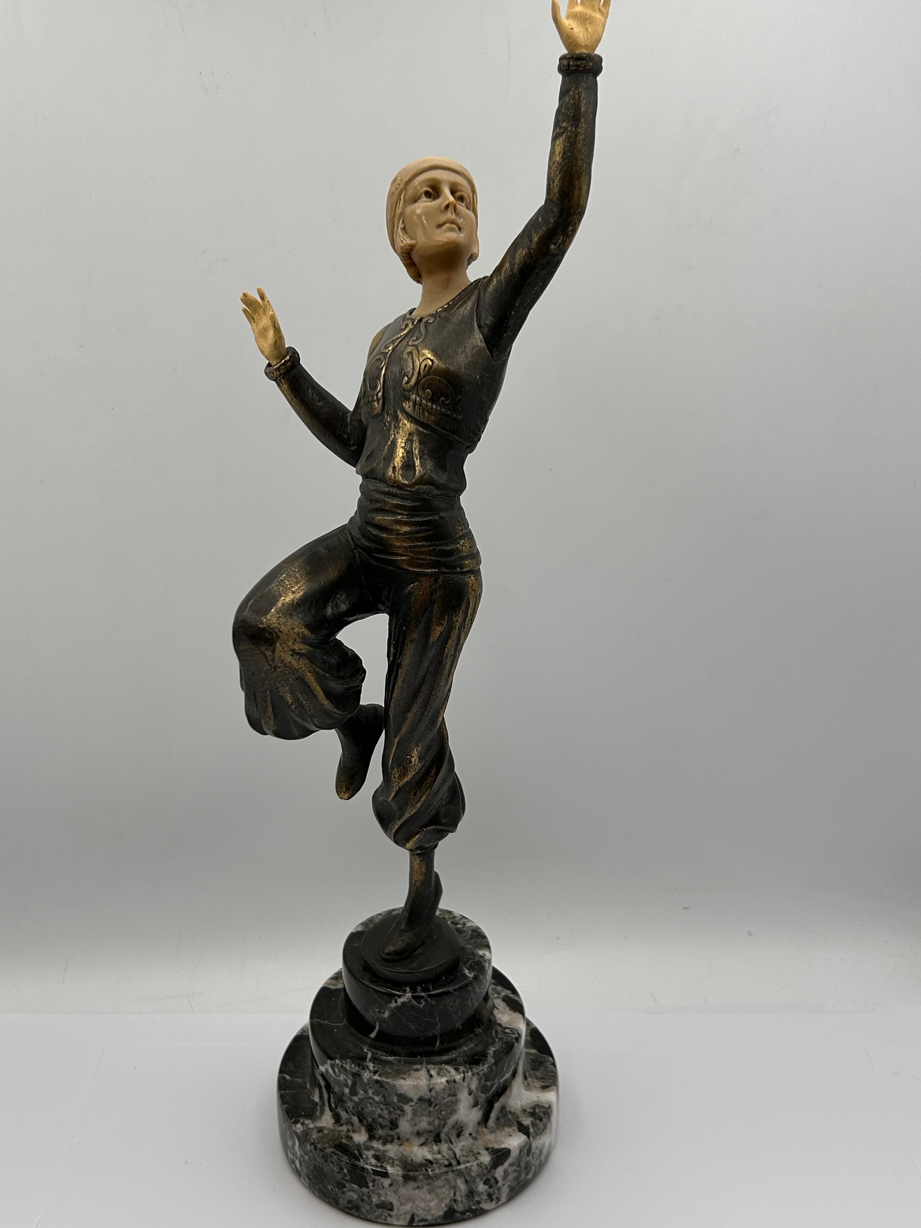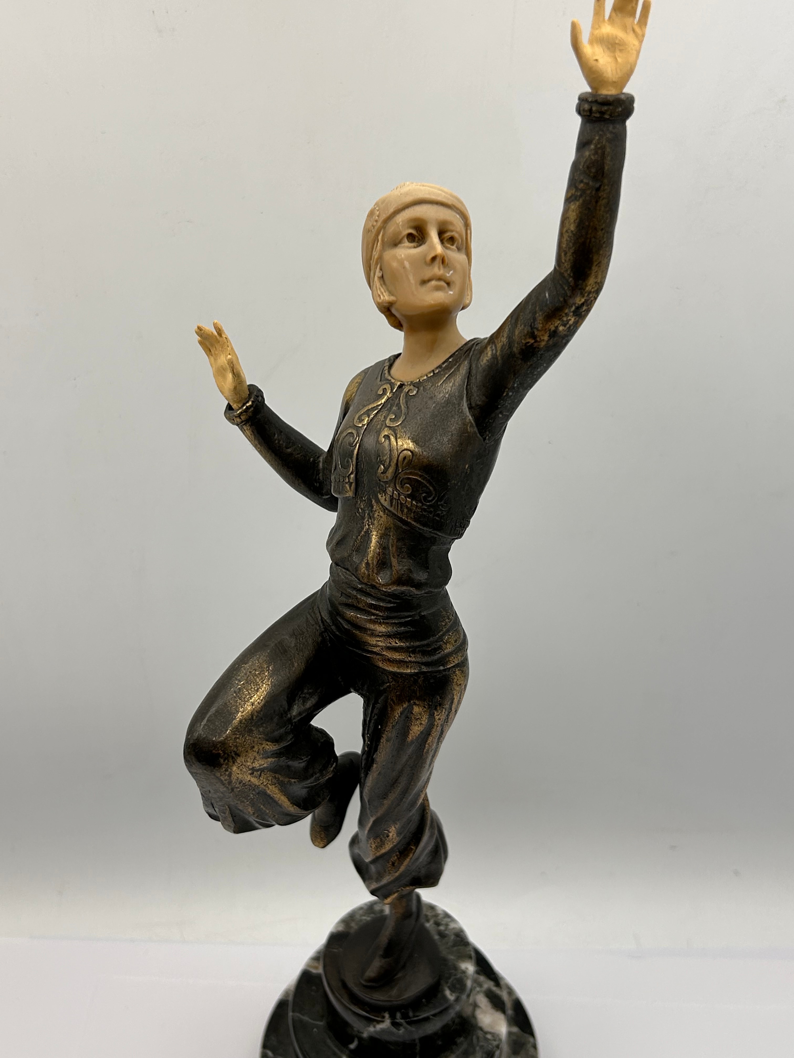 An Art Deco bronze and composite figure of a dancer, after Demetre Haralamb Chiparus. The figural sculpture depicts a female dancer in a dynamic Art Deco style, balancing on one foot with arms raised, evocative of a theatrical performance. The figure’s head and hands are rendered in a light-toned composite material. Her stylized costume and body are executed in a dark patinated metal, likely bronze or spelter, featuring gilded decorative accents. The entire piece is securely mounted on a multi-tiered, veined black and white marble base.