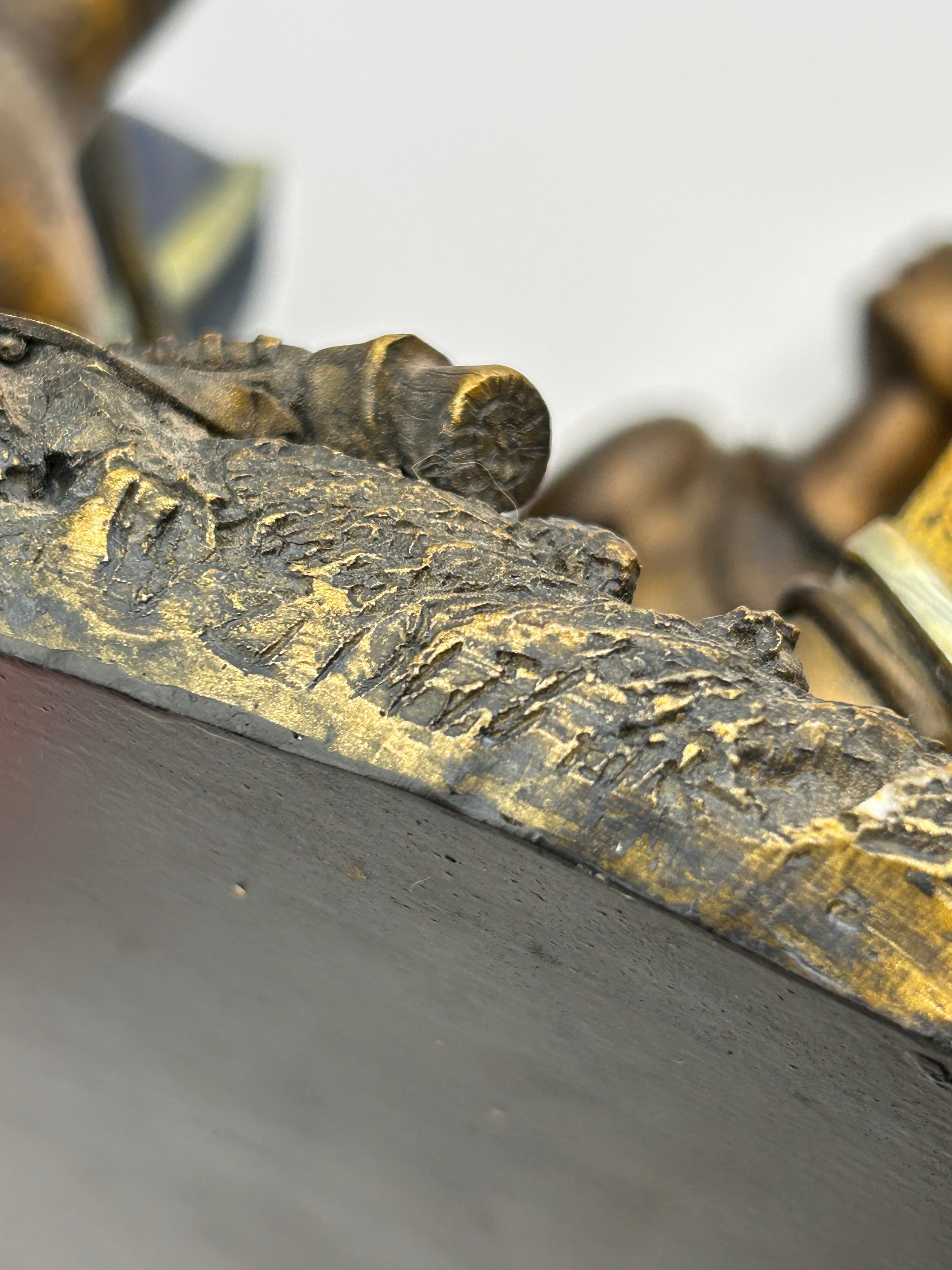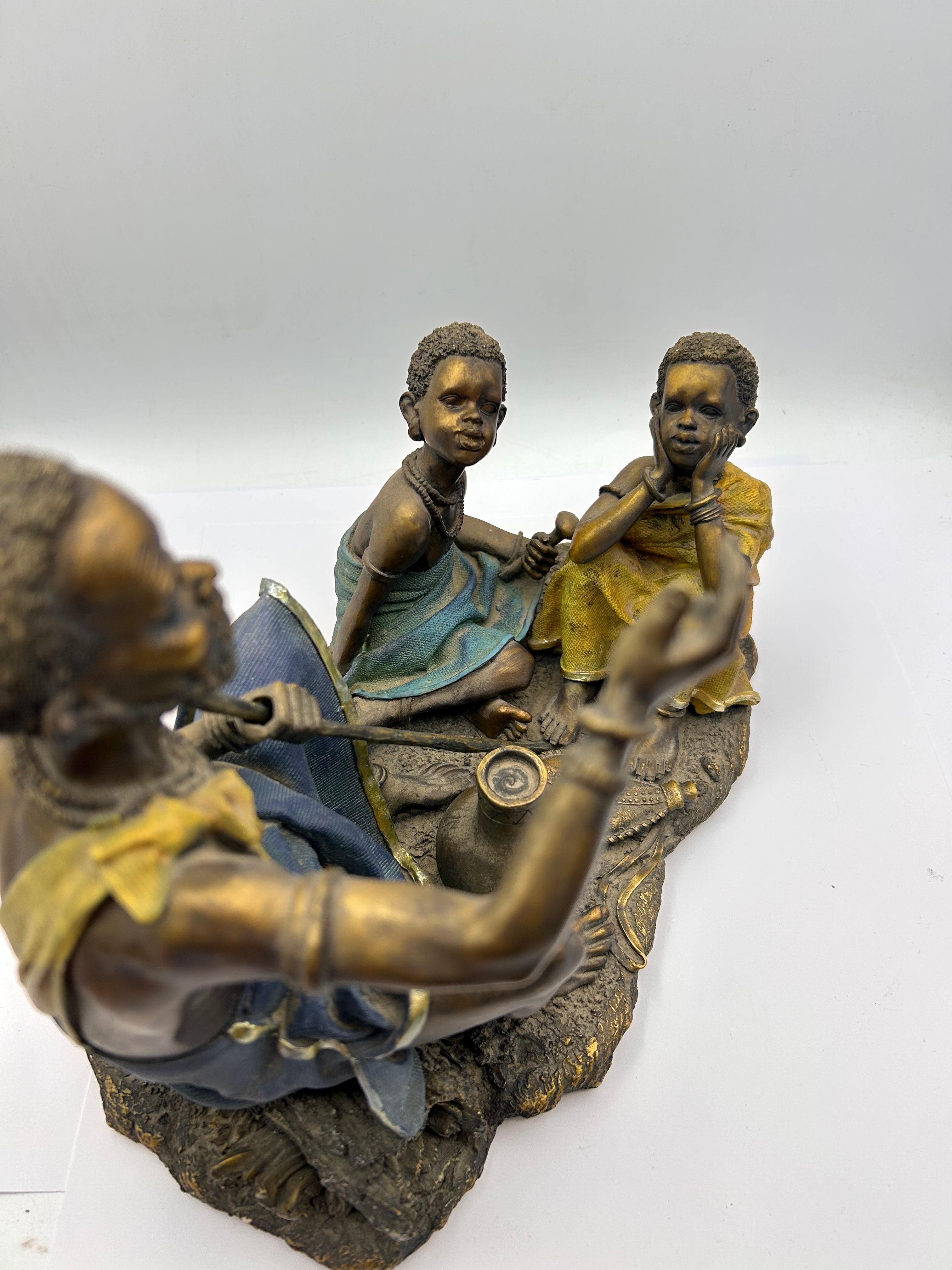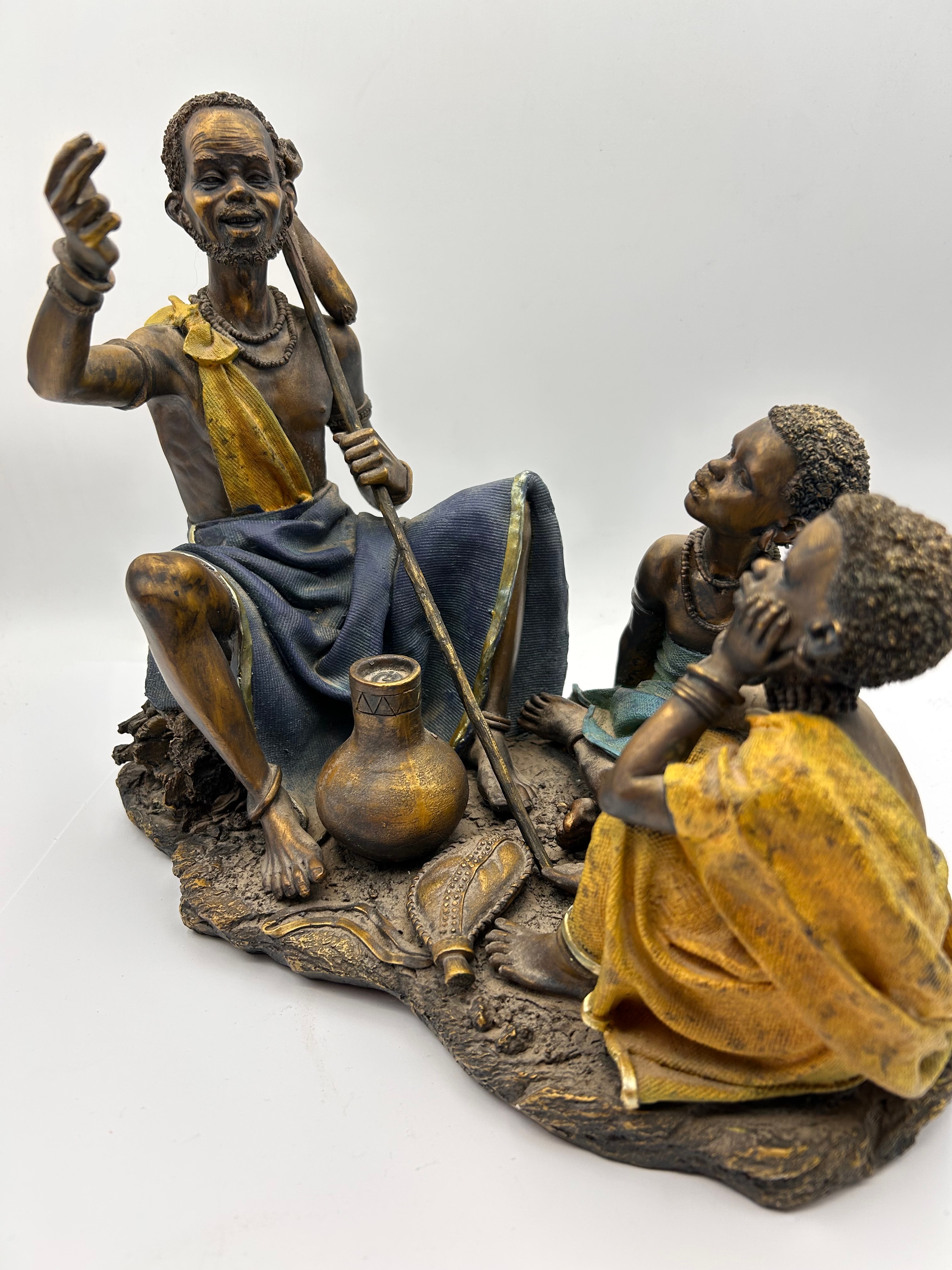 A vintage ethnographic-inspired figural sculpture group, likely 20th-21st century. The piece depicts an older male figure seated and gesturing, addressing two younger, seated figures, all arranged on a textured, rock-like base. The figures wear draped garments in blue, yellow, and green, with the male figure holding a staff. Several ancillary items, including a pot and gourd-like objects, are present on the base. Constructed from a composite material, possibly resin, finished with a multi-toned bronze-effect patina and painted details.