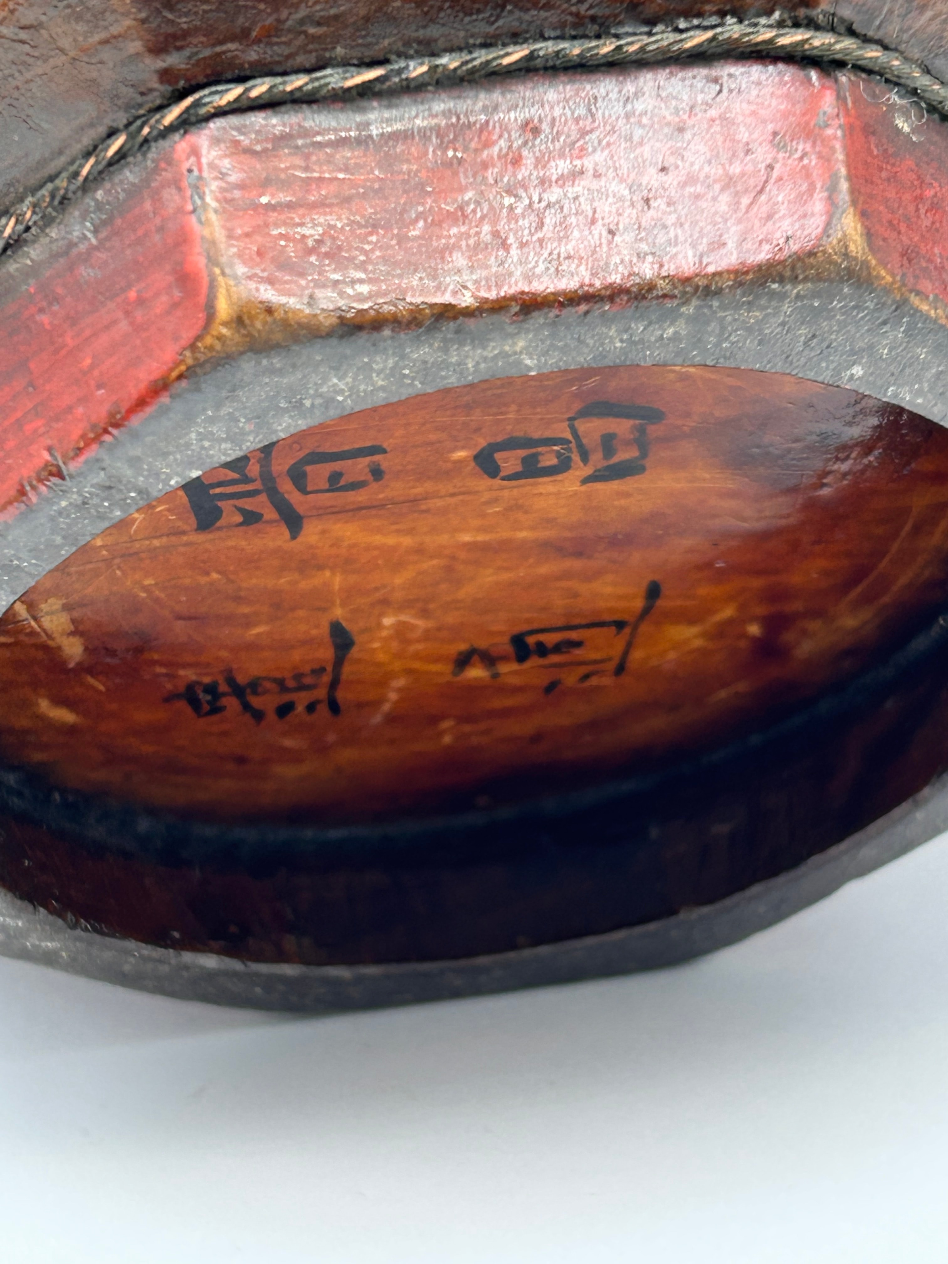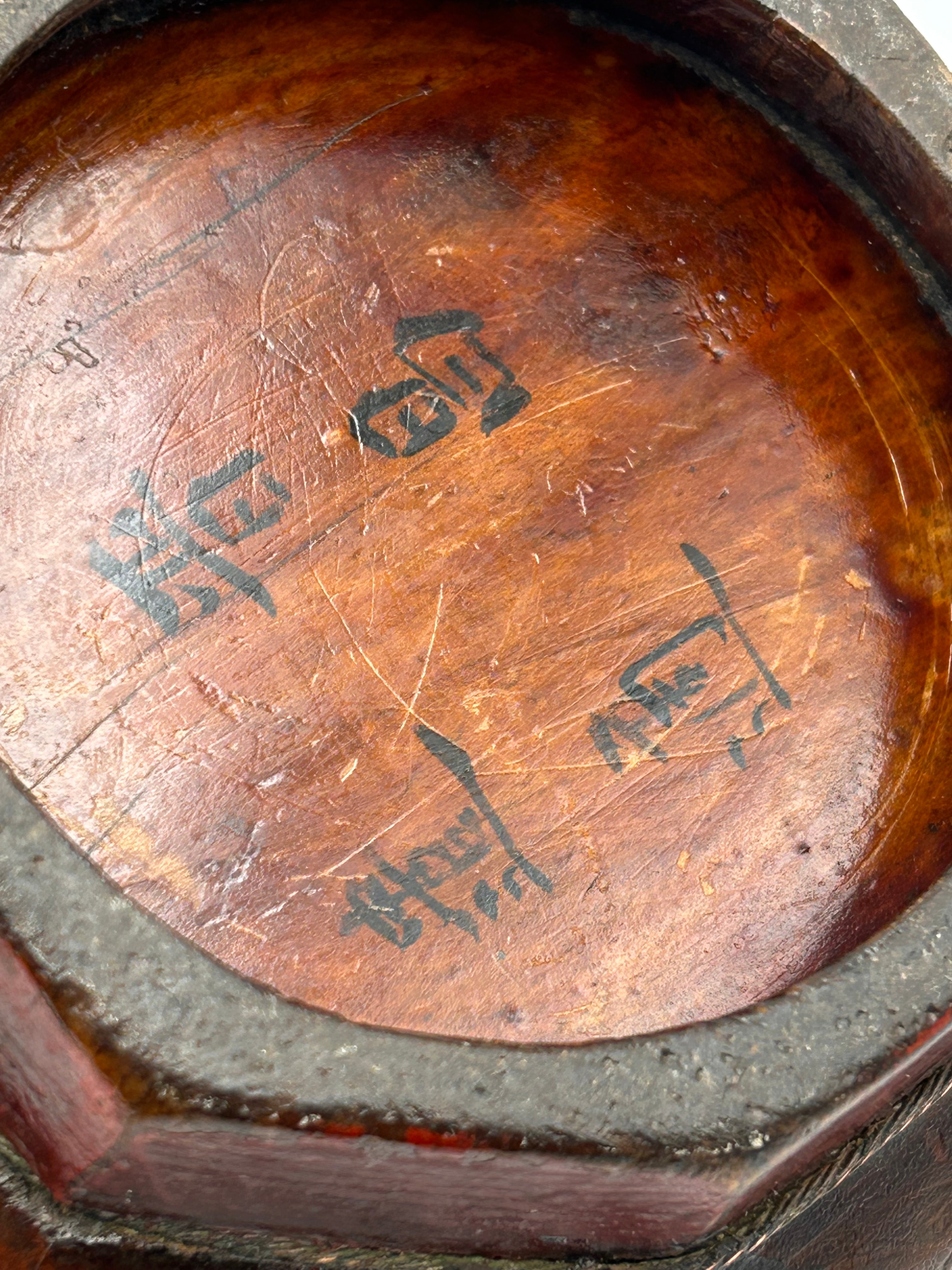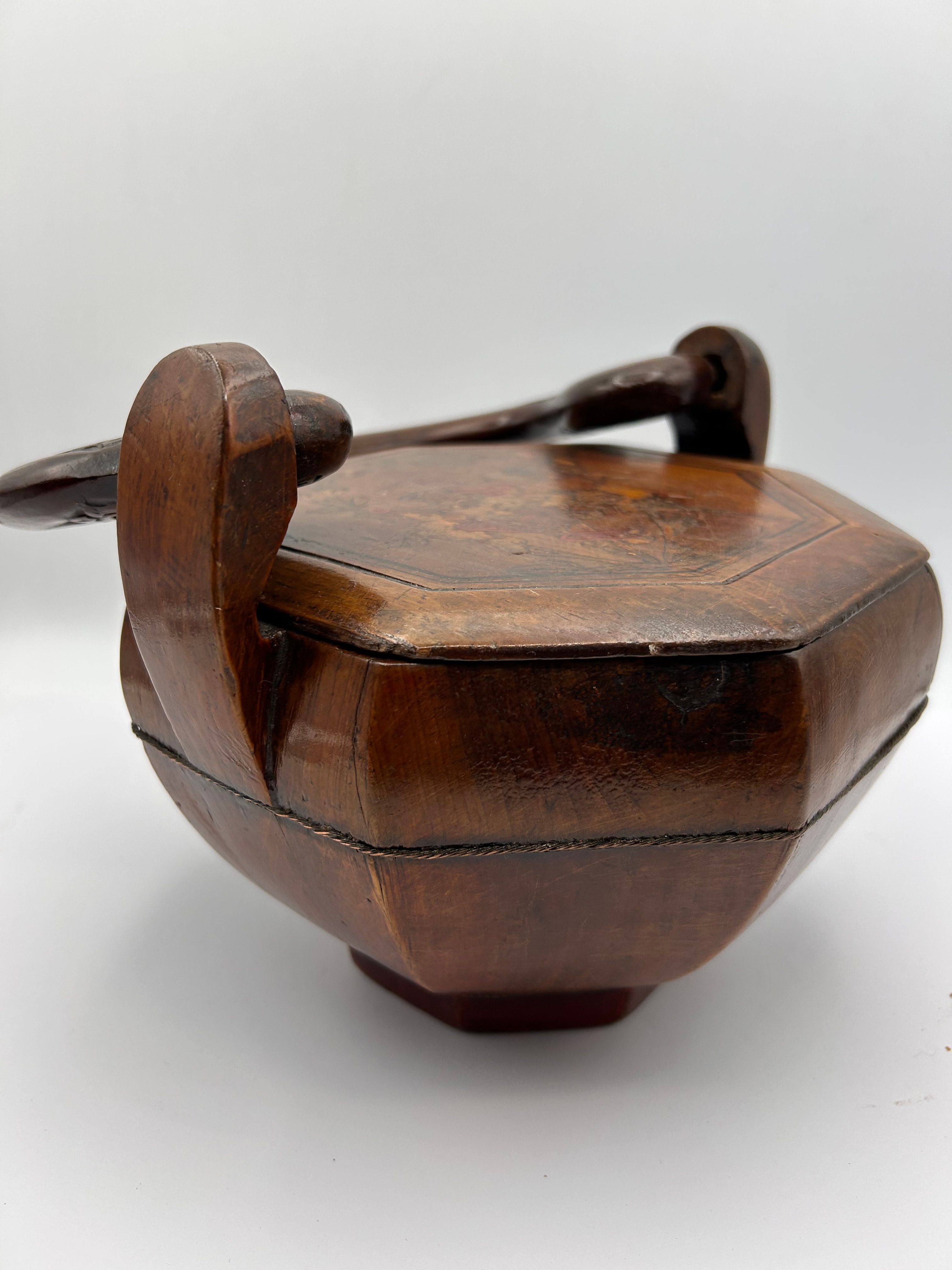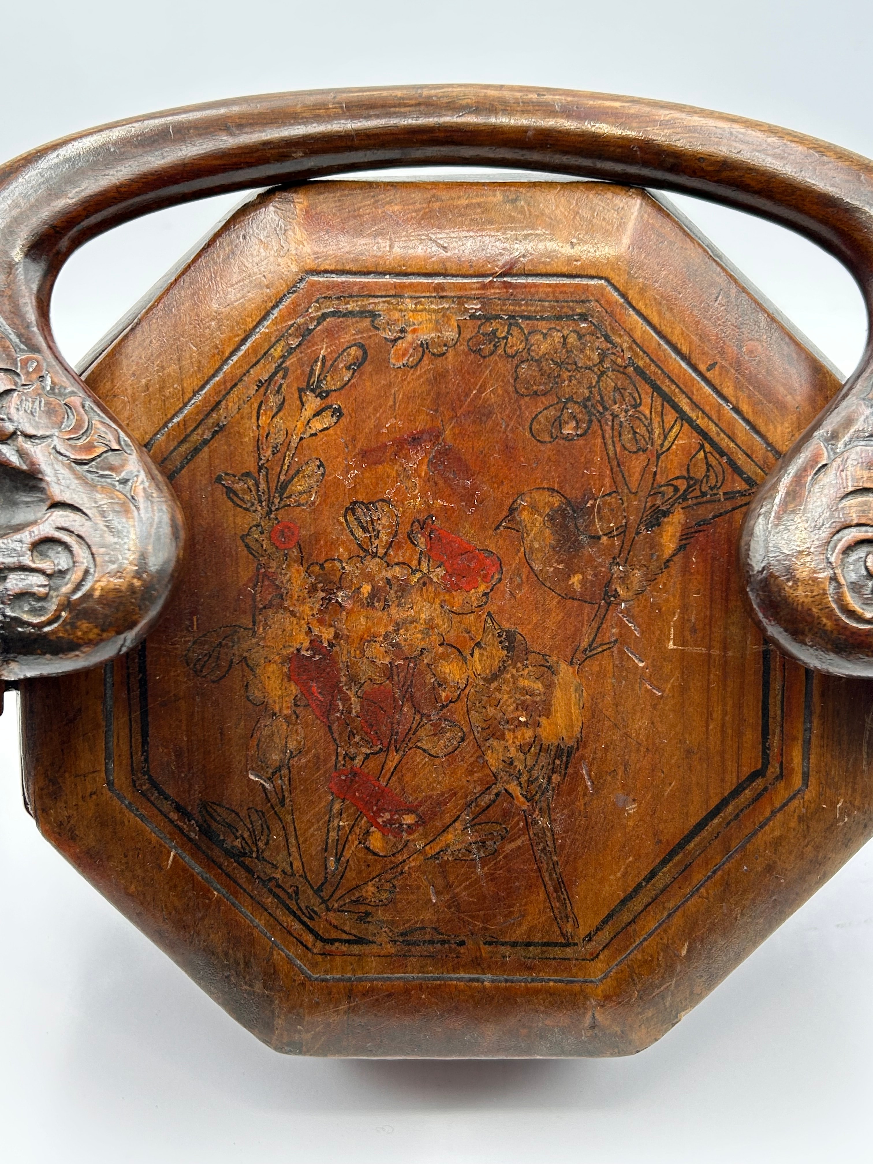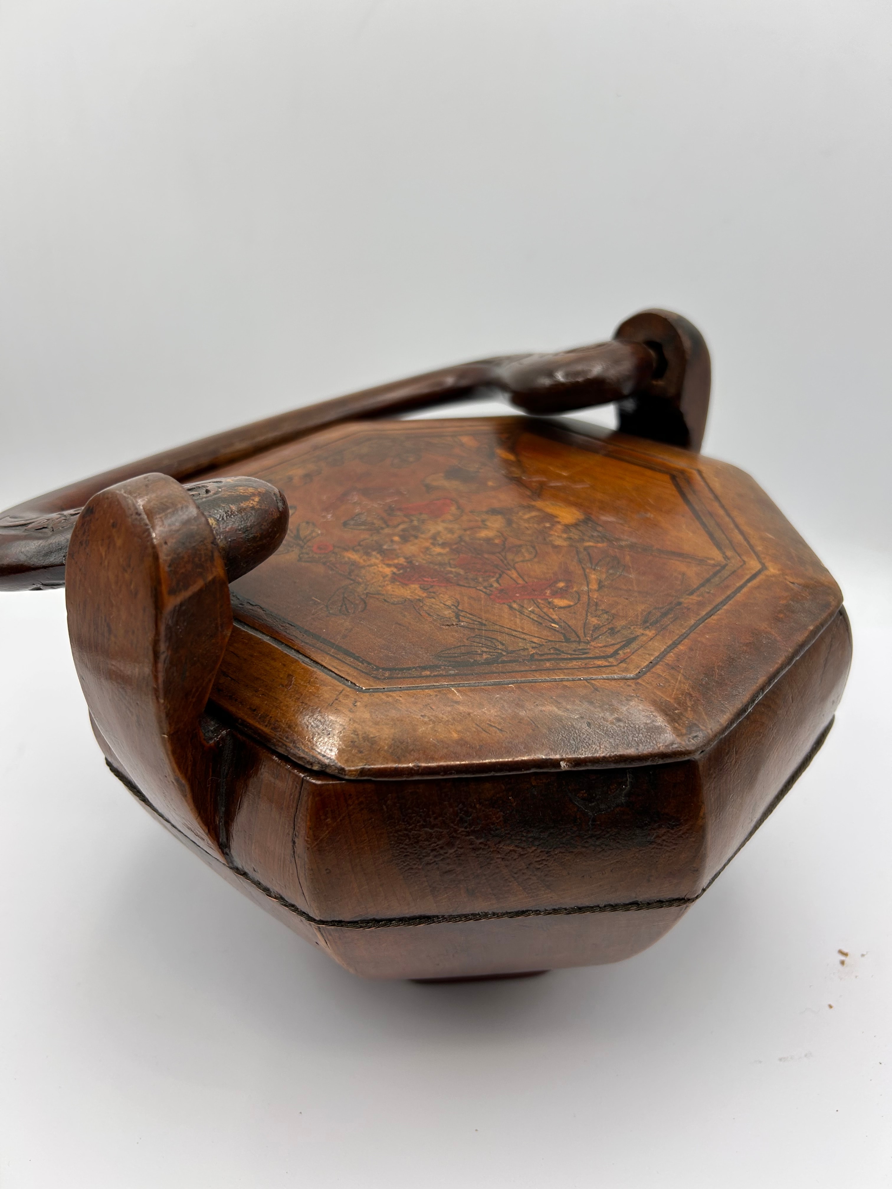 A Vintage Chinese Wedding Basket, crafted from red lacquered wood in an octagonal form, featuring a fitted lid and a curved, fixed handle. The handle is attached via carved supports featuring scrollwork. The lid is decorated with an incised and painted motif of birds among flowering branches. The interior base of the basket bears black calligraphic characters, reading “Wànshòu” (萬壽) and “Wànnián” (萬年), which translate to “longevity” and “ten thousand years” respectively, conveying a wish for eternal longevity.