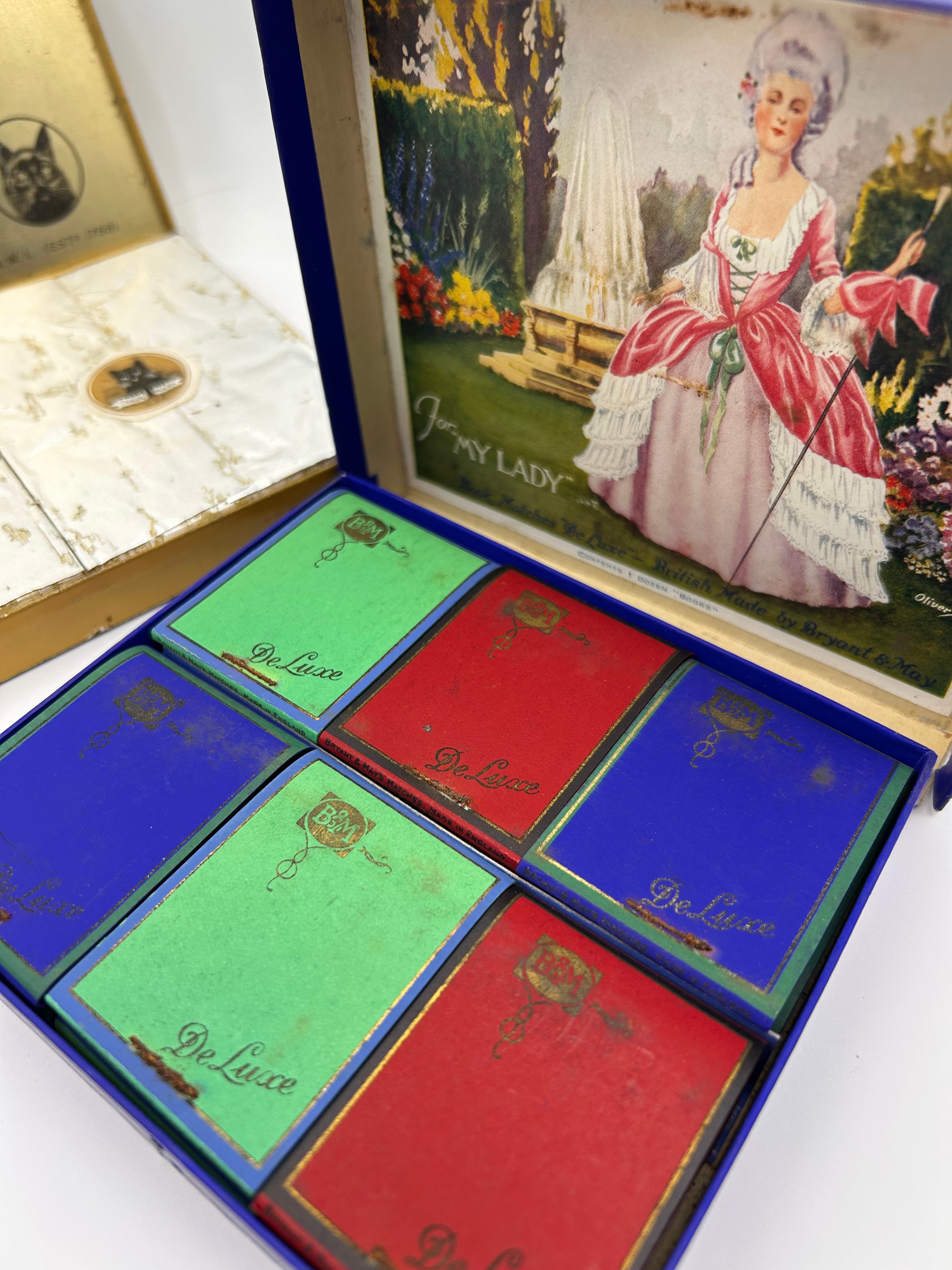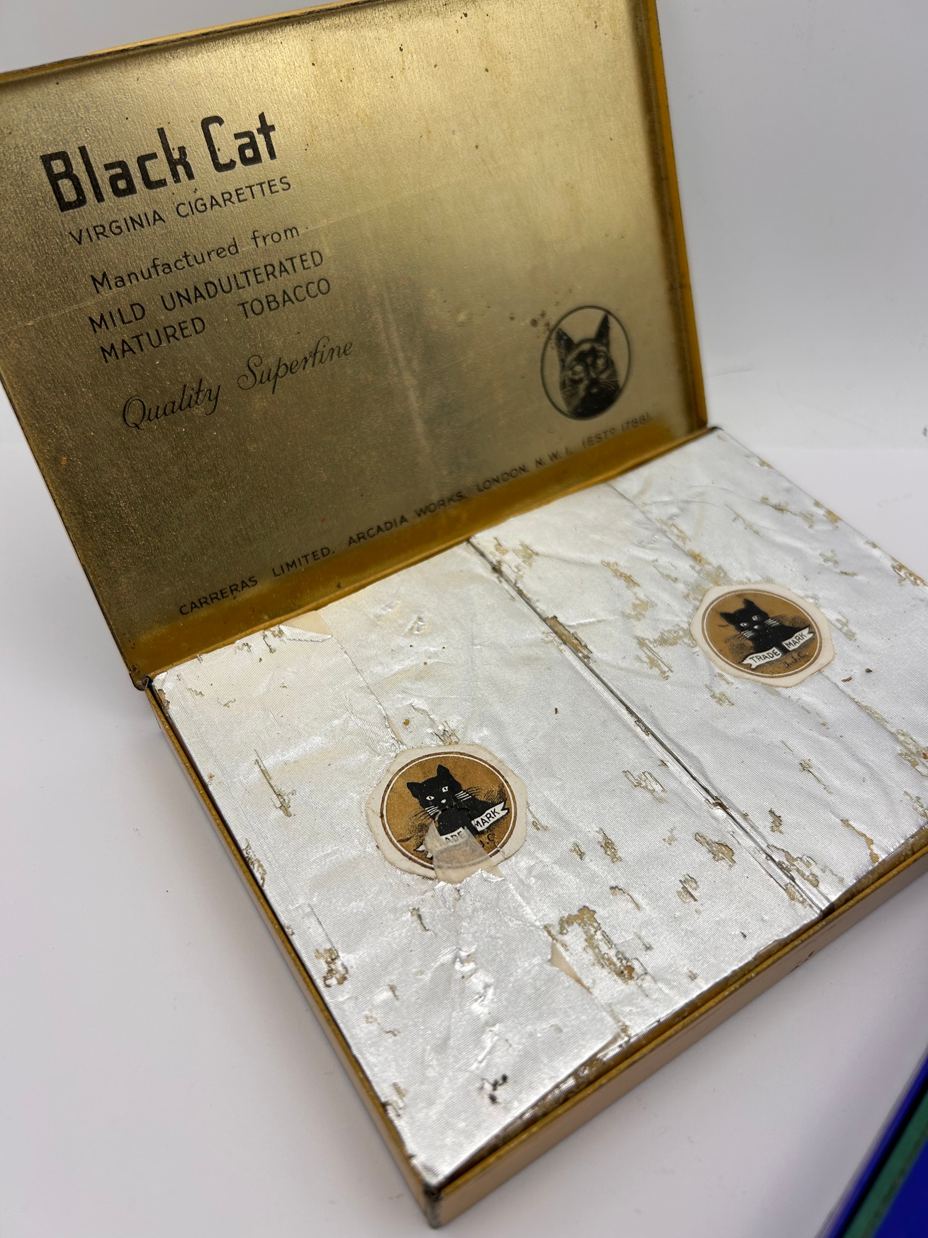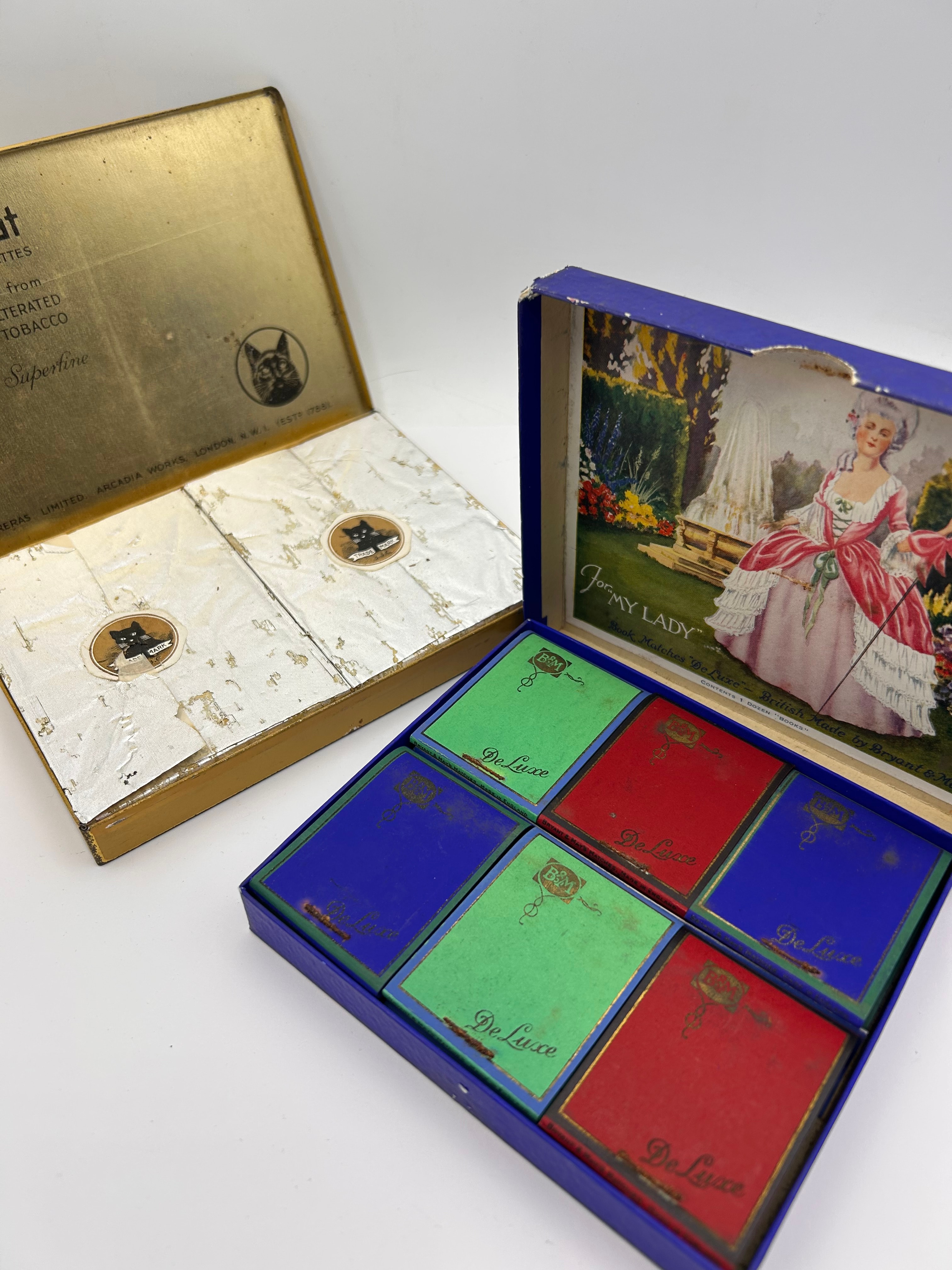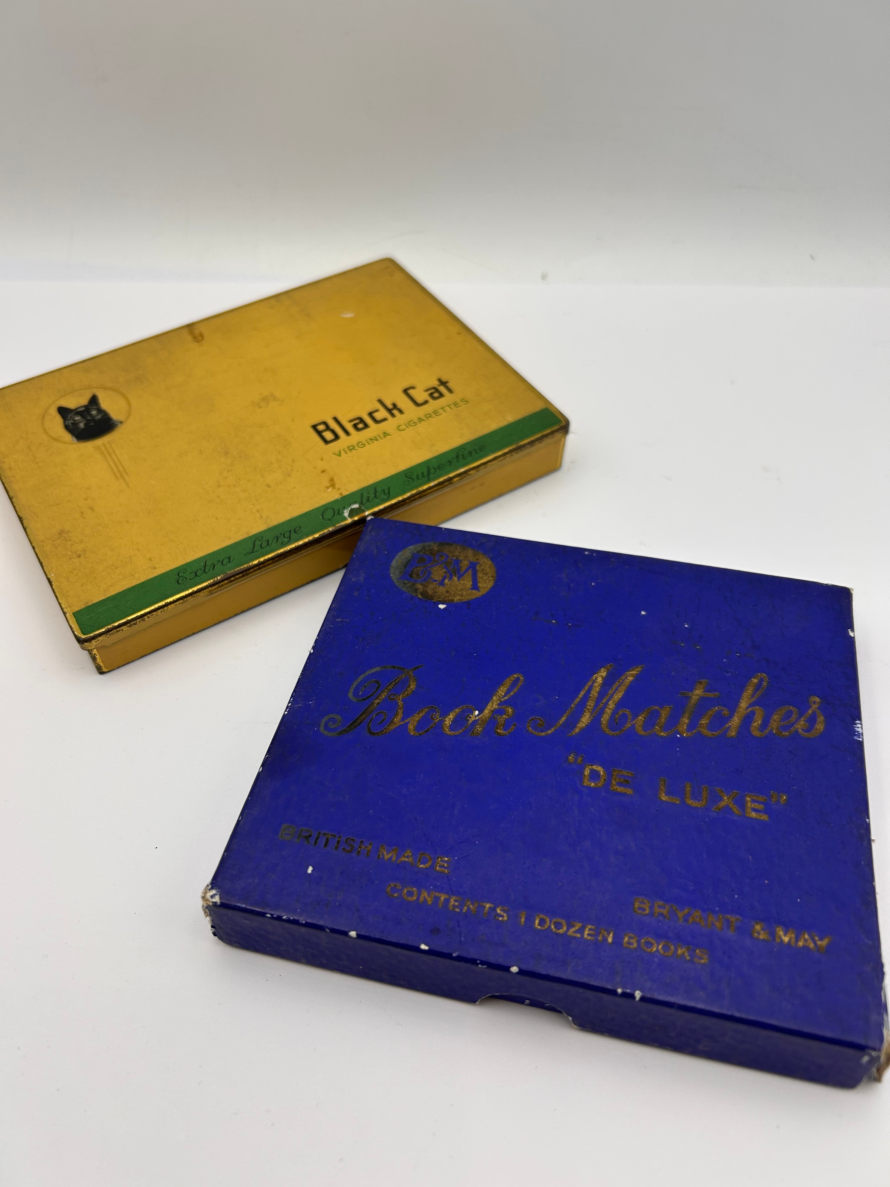 A lot comprising two vintage advertising boxes. The first is a gold-colored rectangular metal tin for ‘Black Cat Virginia Cigarettes,’ featuring a black cat logo and internal text detailing ‘Carreras Limited, Arcadia Works, London N.W.1.’ The tin’s interior contains several foil-wrapped blocks, likely original cigarette packets, each bearing a small ‘Black Cat’ label. The second item is a blue rectangular cardboard box, labeled ‘B&M Book Matches ‘De Luxe’,’ stating ‘BRITISH MADE’ and ‘CONTENTS 1 DOZEN BOOKS’ by ‘BRYANT & MAY.’ Its lid interior features a colorful illustration of an 18th-century-style lady in a garden with the text ‘FOR MY LADY.’ This box contains twelve smaller matchbooks in alternating red, green, and blue, each marked ‘De Luxe’ and with a ‘B&M’ logo.