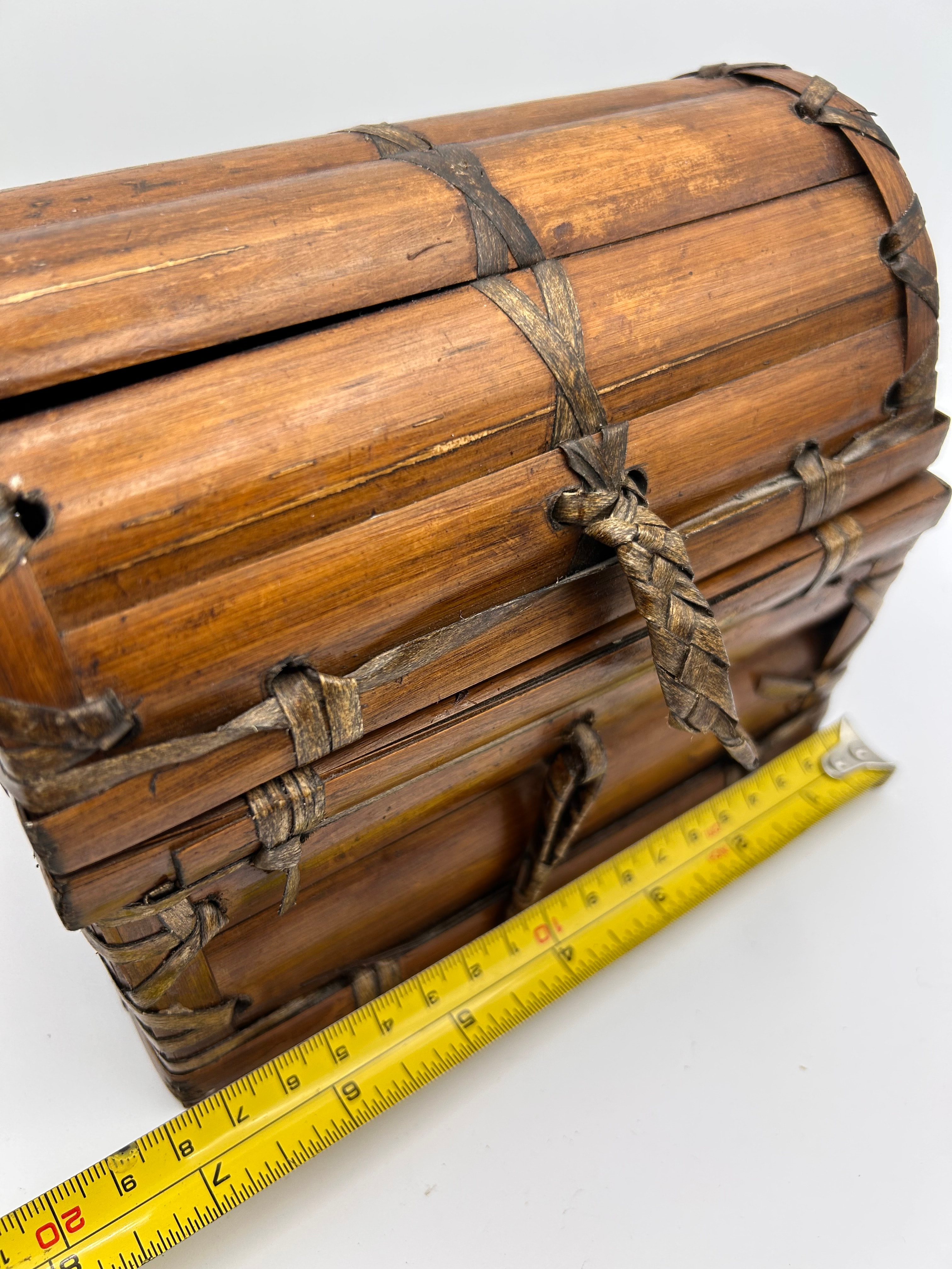 A vintage domed bamboo chest. This small, rectangular decorative box is styled as a miniature treasure chest or trunk. It is constructed from split bamboo or similar reed-like wood strips, which form the body and lid, and are secured together with darker, woven binding strips that wrap around the edges and along the lid. The material displays a medium to dark brown hue with an aged patina. The hinged lid opens to a simple, unlined interior consistent with the exterior construction. A braided loop is visible on the front, suggesting a former latch or decorative closure. No specific manufacturer’s marks or textual inscriptions are visible on the item itself.