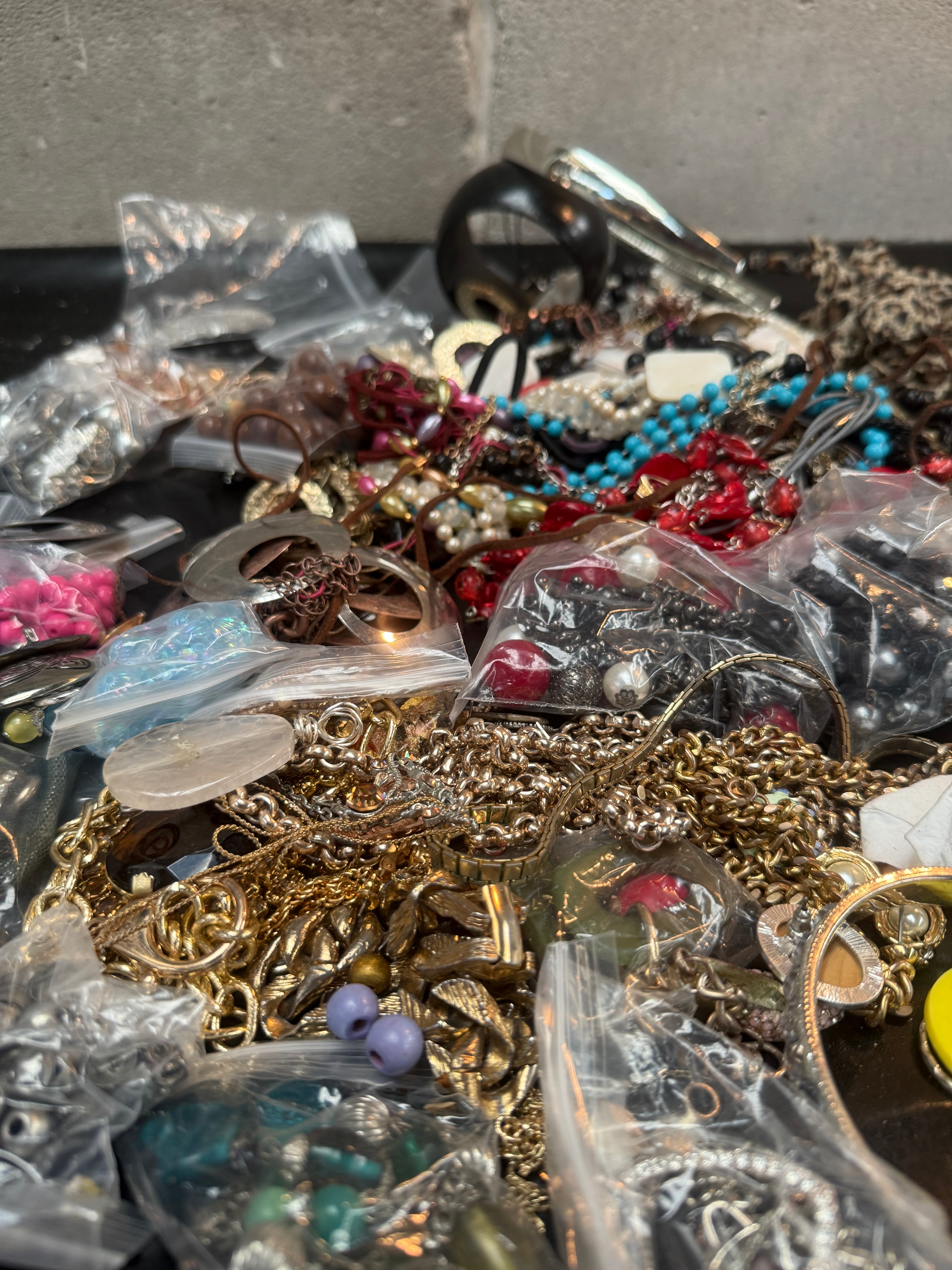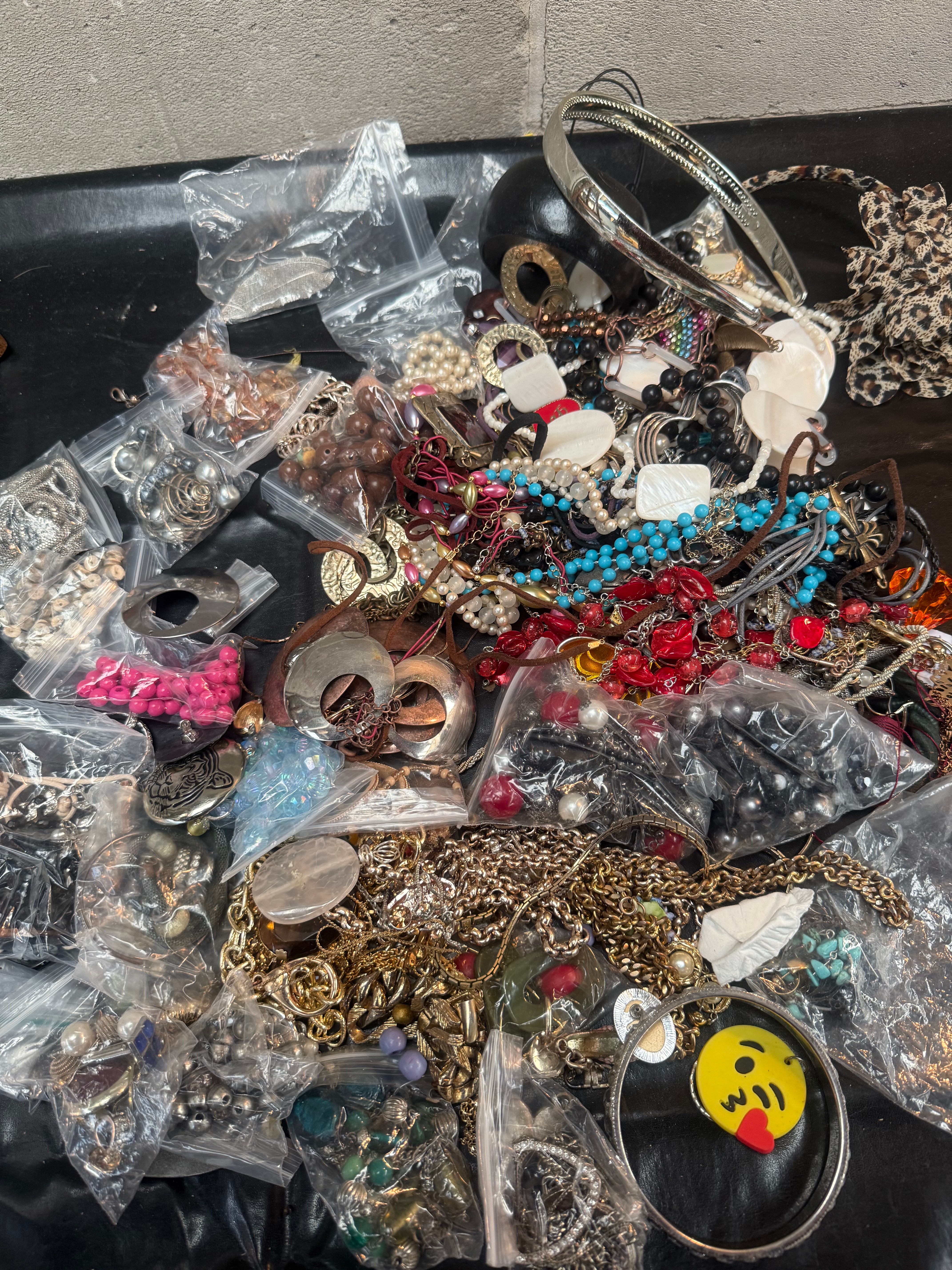 A large collection of assorted costume jewelry, predominantly from the 20th and 21st centuries, presented as a bulk lot suitable for craft, repair, or wear. The collection comprises a substantial quantity of items, including necklaces, bracelets, earrings, and rings, exhibiting diverse styles from minimalist to ornate. Many individual pieces are contained within small clear plastic bags. Materials observed are extensive, encompassing various base metals (gold-tone, silver-tone, copper-tone), plastic, glass, faux pearls, acrylic, resin, and textile components, often set with imitation stones in numerous colors. No specific hallmarks, brand names, or unique identifying text are clearly discernible on individual pieces, though a yellow emoji-style charm is visible among the items.