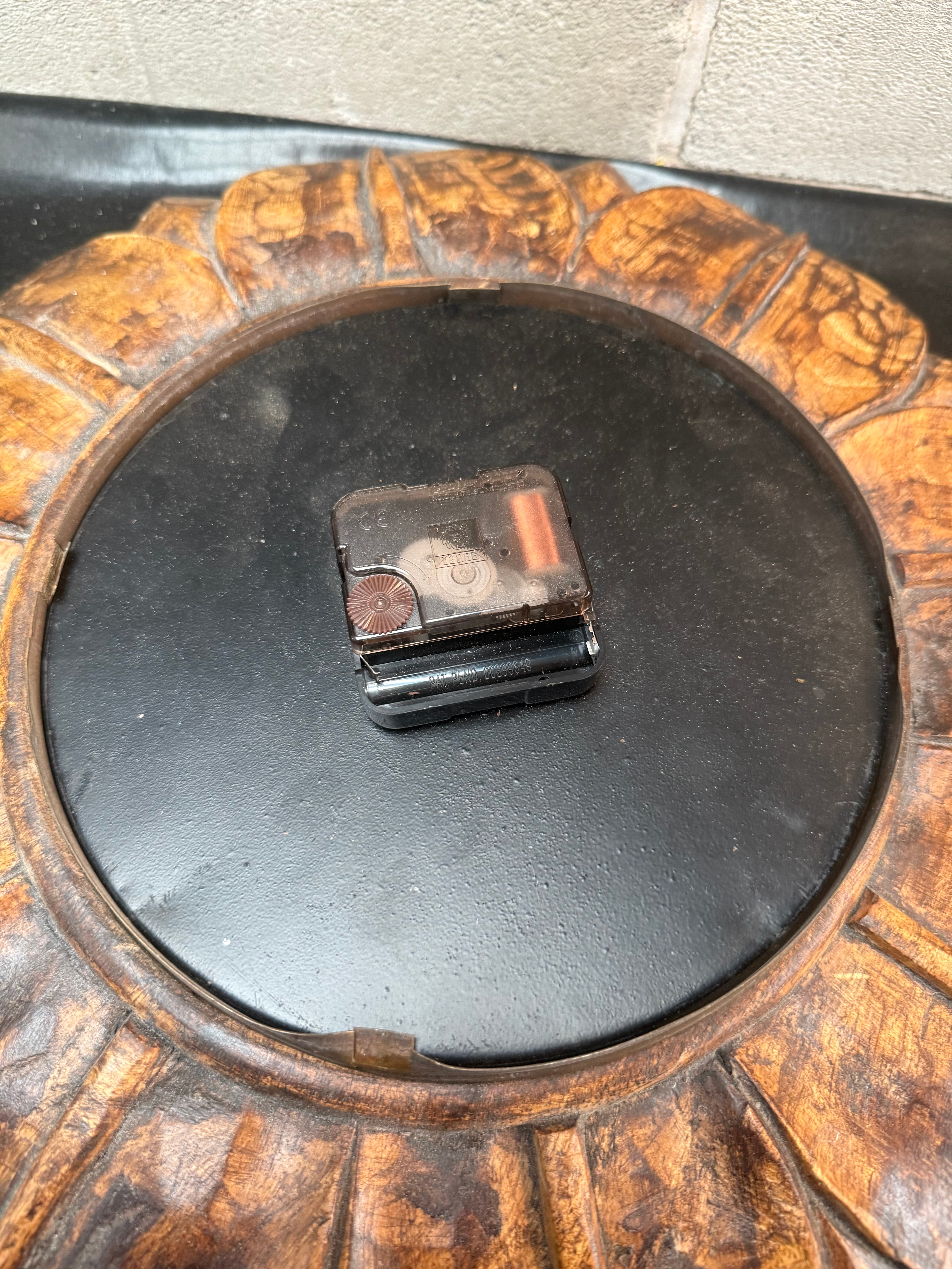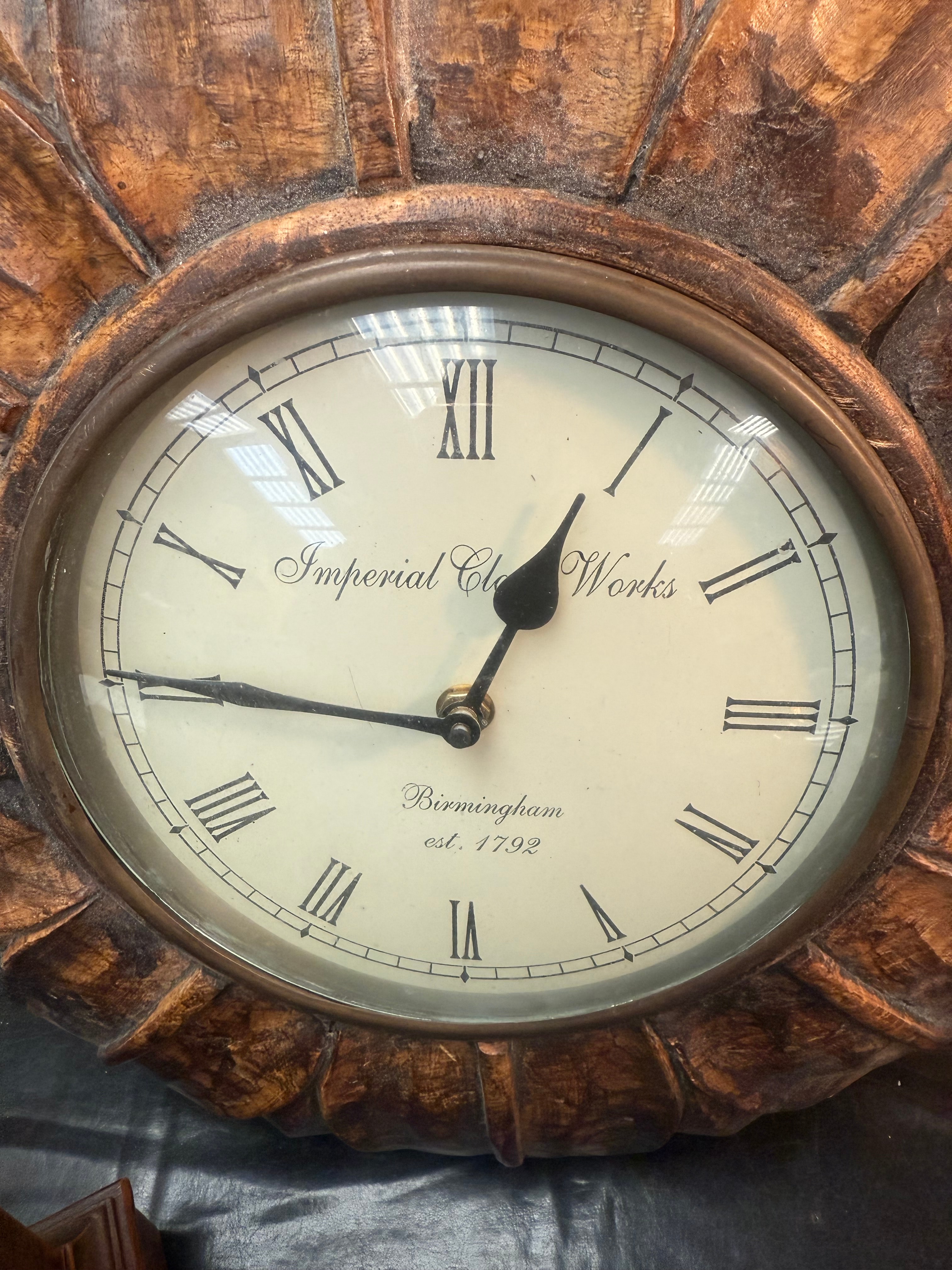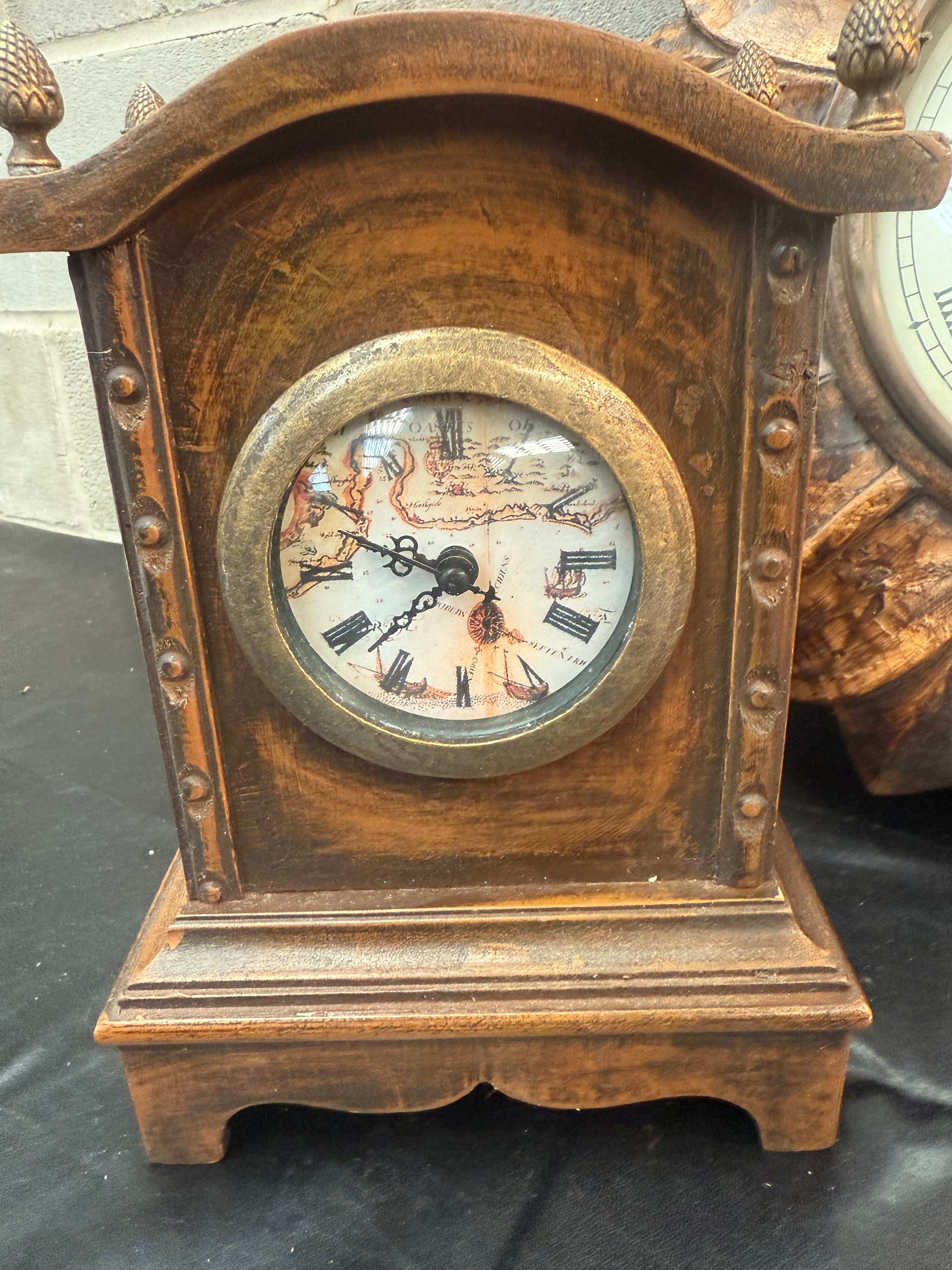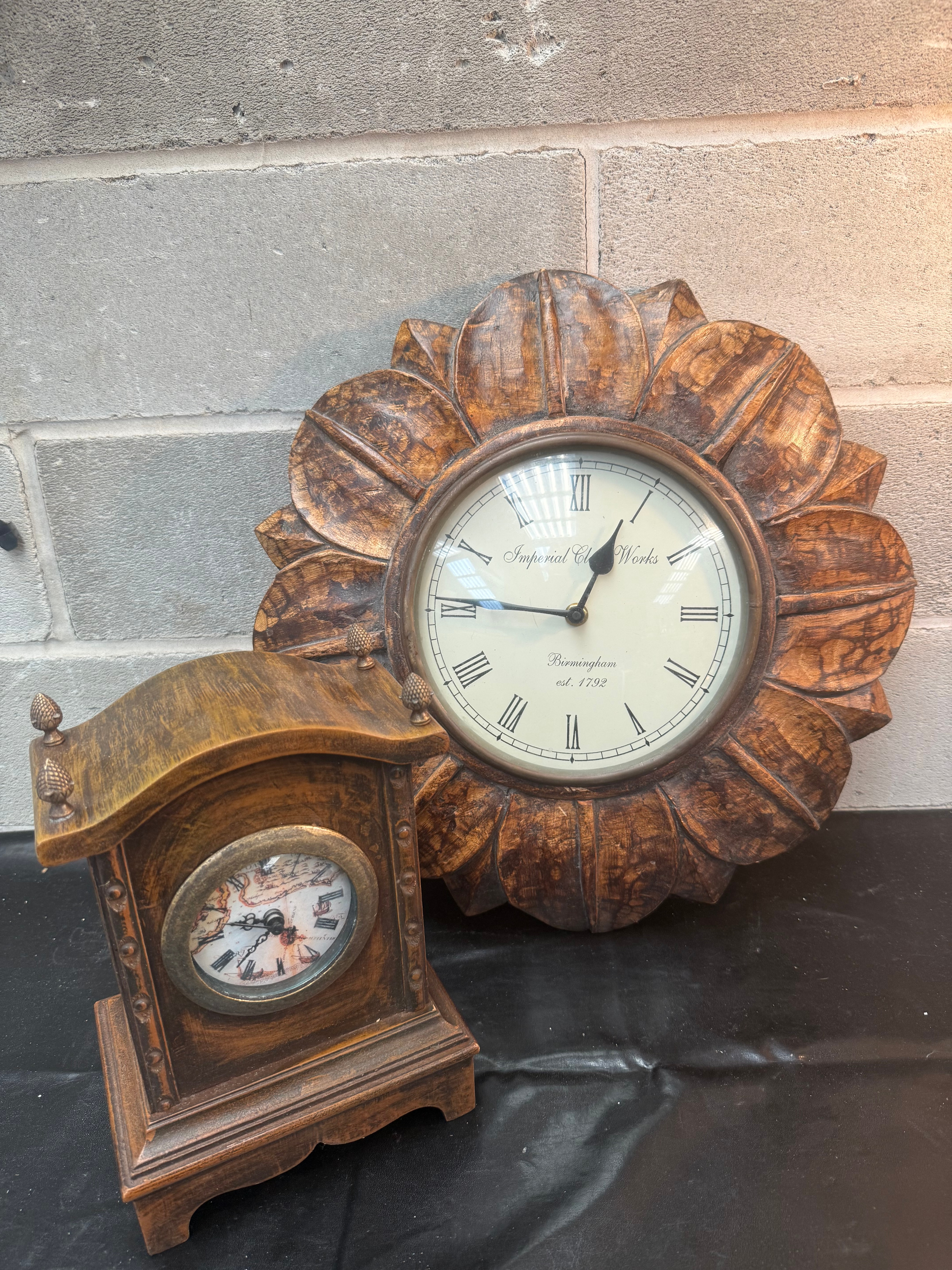 A pair of contemporary decorative clocks. The larger is a round wall clock featuring a distressed, carved or molded wood-tone frame resembling a sunburst or floral design, with a metallic inner bezel. Its cream-colored dial displays black Roman numerals and is inscribed “Imperial Clock Works,” “Birmingham,” and “est. 1792.” The reverse reveals a modern quartz movement. The smaller item is a mantel or table clock with a house-like or architectural form, adorned with finials and a similar distressed bronze-tone finish, likely made of wood or resin. Its circular dial features an old-world map design with Roman numerals and visible text including “ATLANTIC OCEAN” and “SOUTH SEA.”