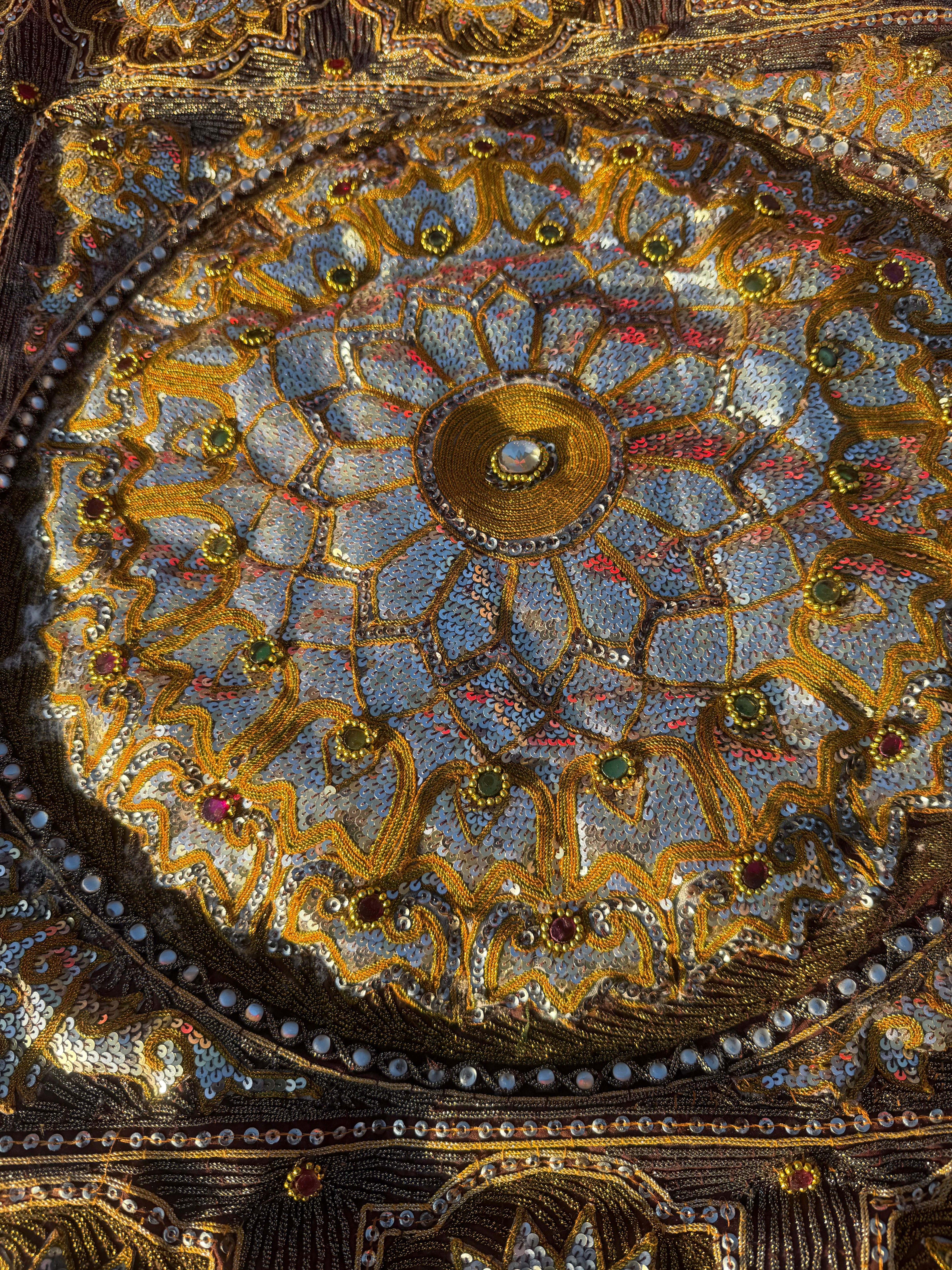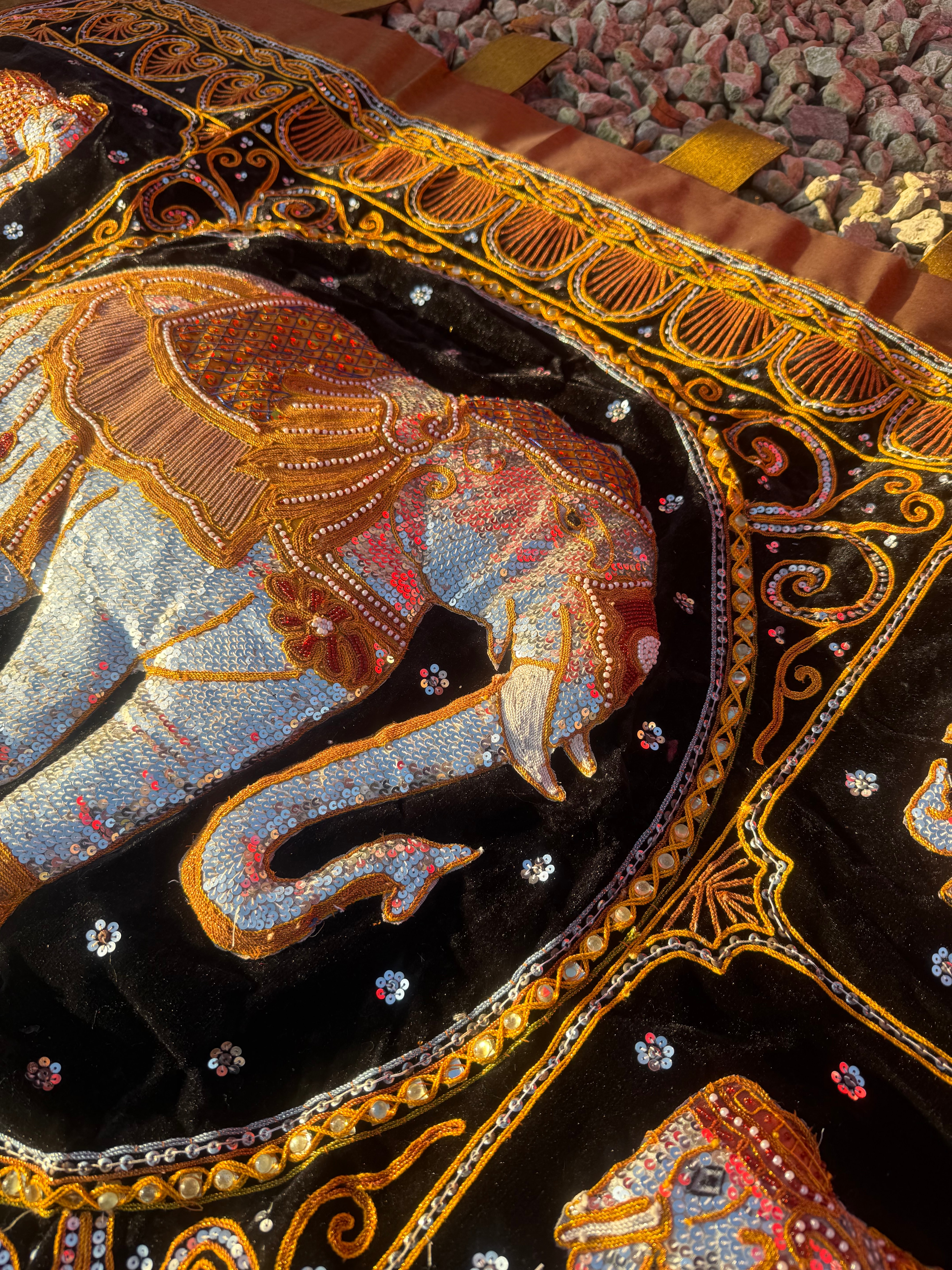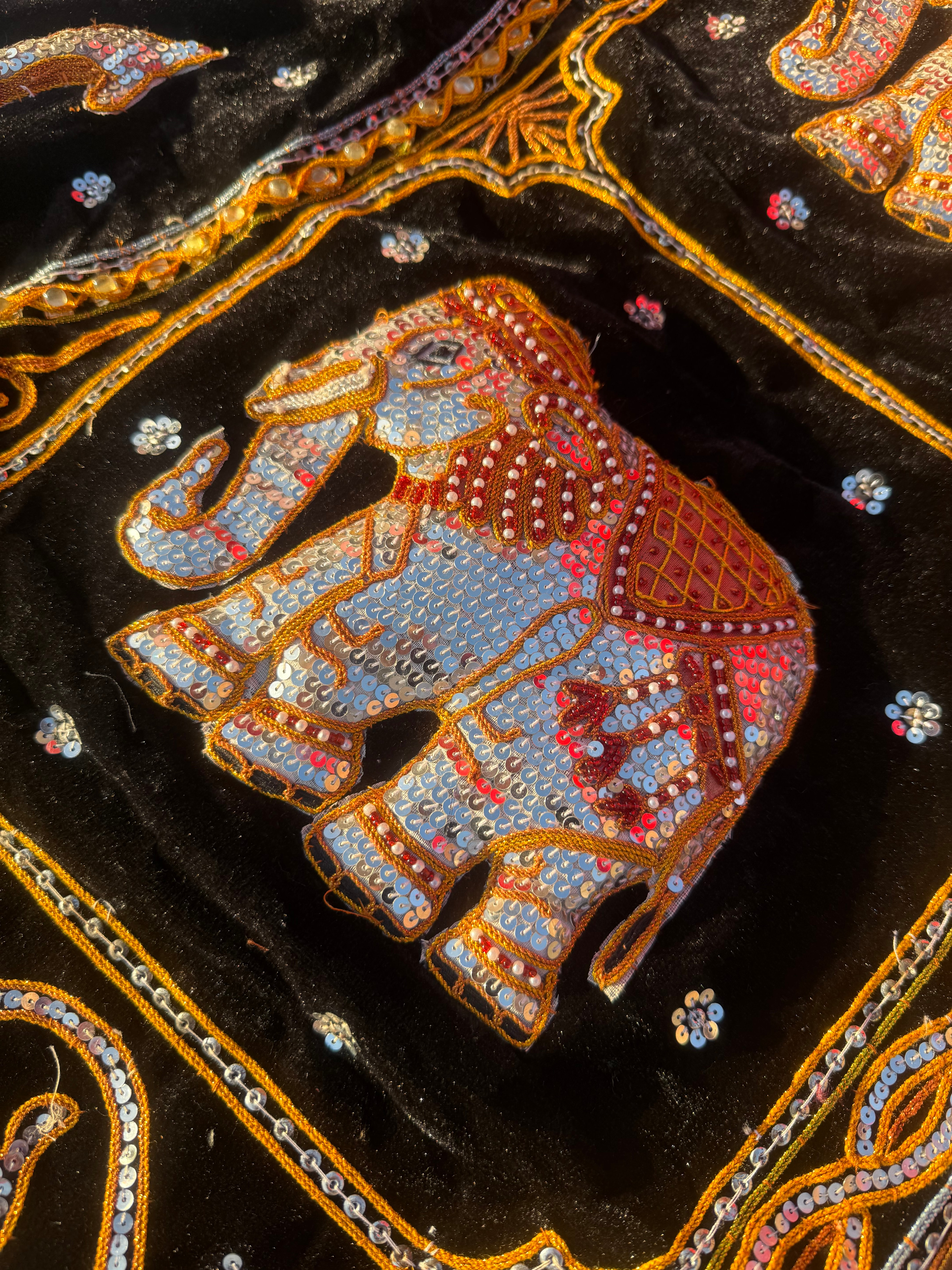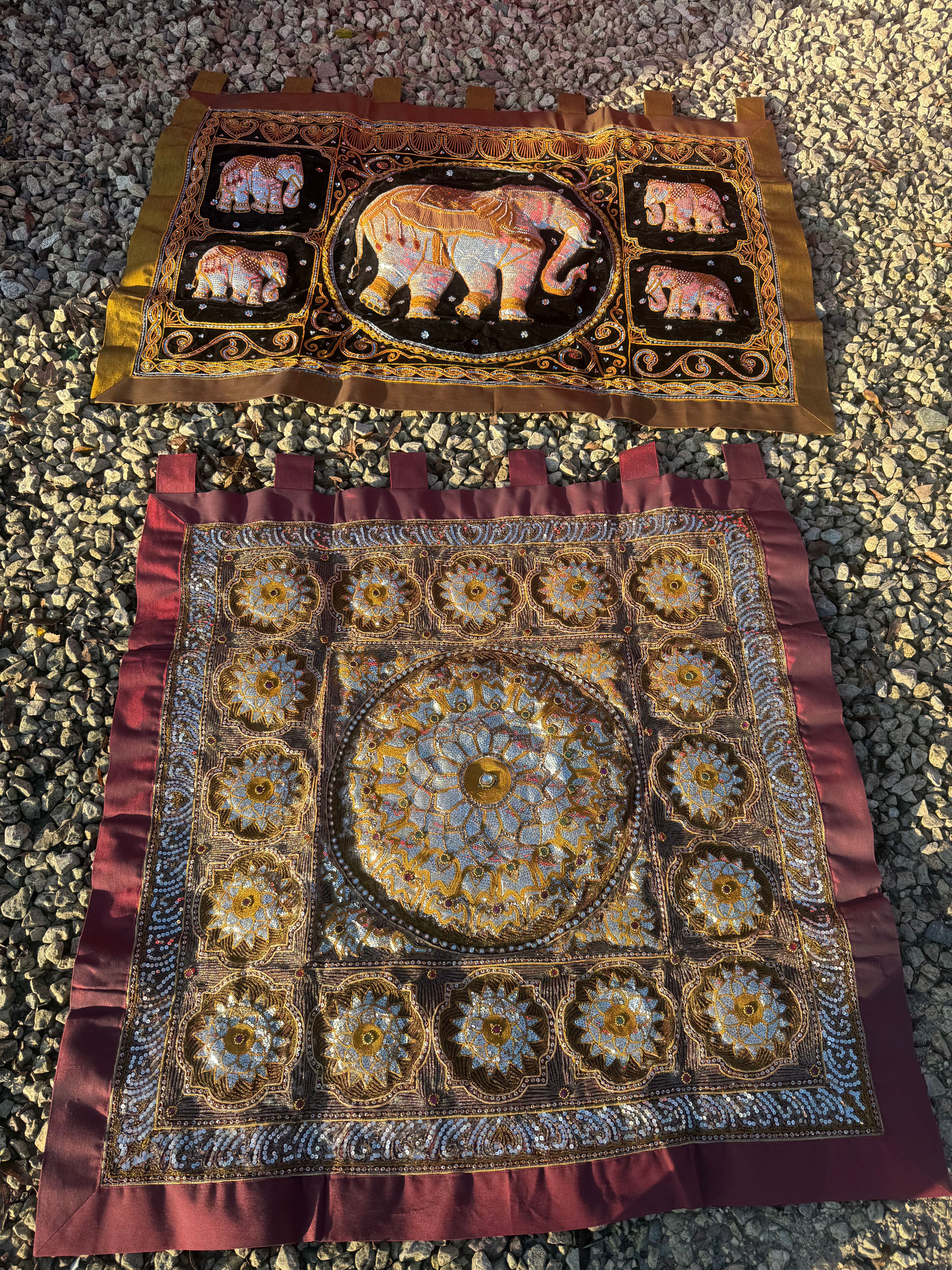 A pair of Burmese/Thai Kalaga embroidered wall hangings, crafted from Fabric. The upper textile, set on a black velvet-like ground with a brown border, features a large central elephant motif surrounded by four smaller elephants in the corners, all intricately detailed with silver, red, and blue sequins and outlined in gold-toned embroidery. The lower textile, on a maroon fabric, displays a prominent central circular medallion encircled by sixteen smaller repeating floral or mandalic motifs, extensively decorated with gold-toned thread embroidery, silver-toned sequins, and small colored beads in green, red, and white. Both items are fitted with fabric loops along their top edges for hanging. No discernible text or markings are visible.