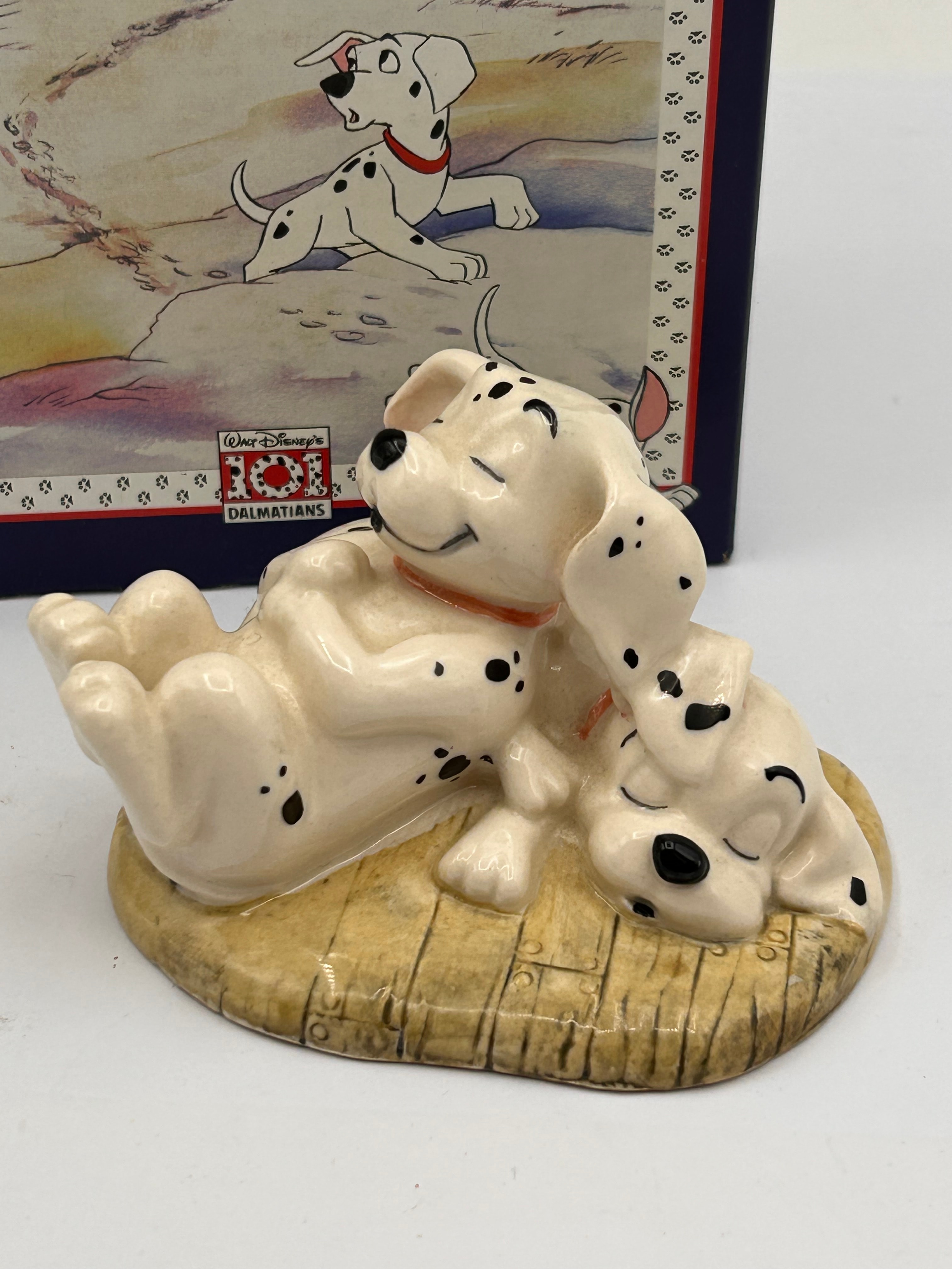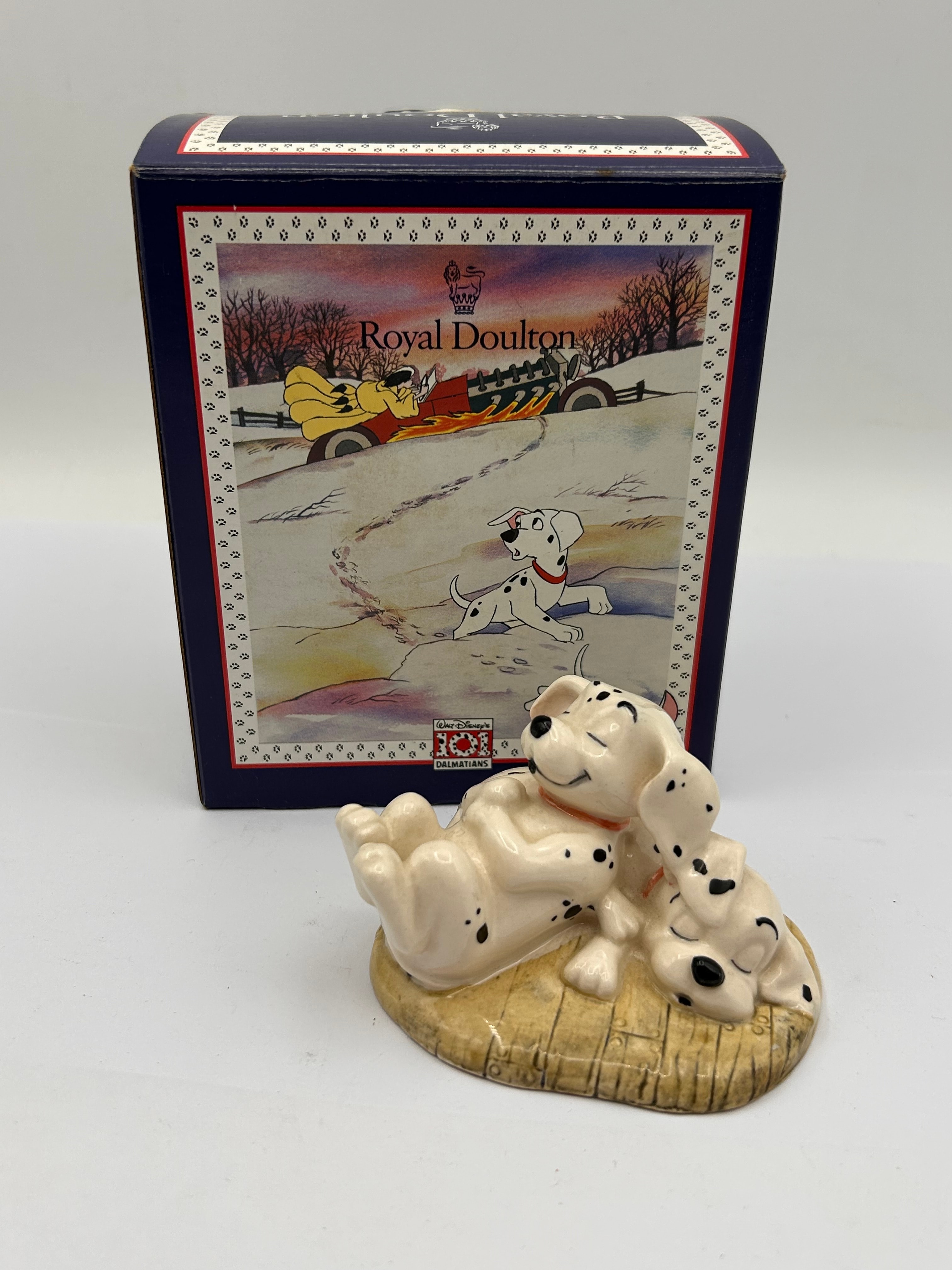 A Royal Doulton Disney Showcase Collection ‘101 Dalmatians’ ceramic figurine. This glazed ceramic or porcelain figurine depicts two animated-style Dalmatian dogs, one larger and one smaller, in a reposed, affectionate pose on a textured, tan-colored base. The larger dog wears a red collar. The figurine is accompanied by its original dark blue cardboard box, which features a colorful illustration of Dalmatians in a snowy scene bordered by paw prints. Prominent text on the box includes “Royal Doulton” beneath a crown motif, and a “Walt Disney’s DALMATIANS” logo.