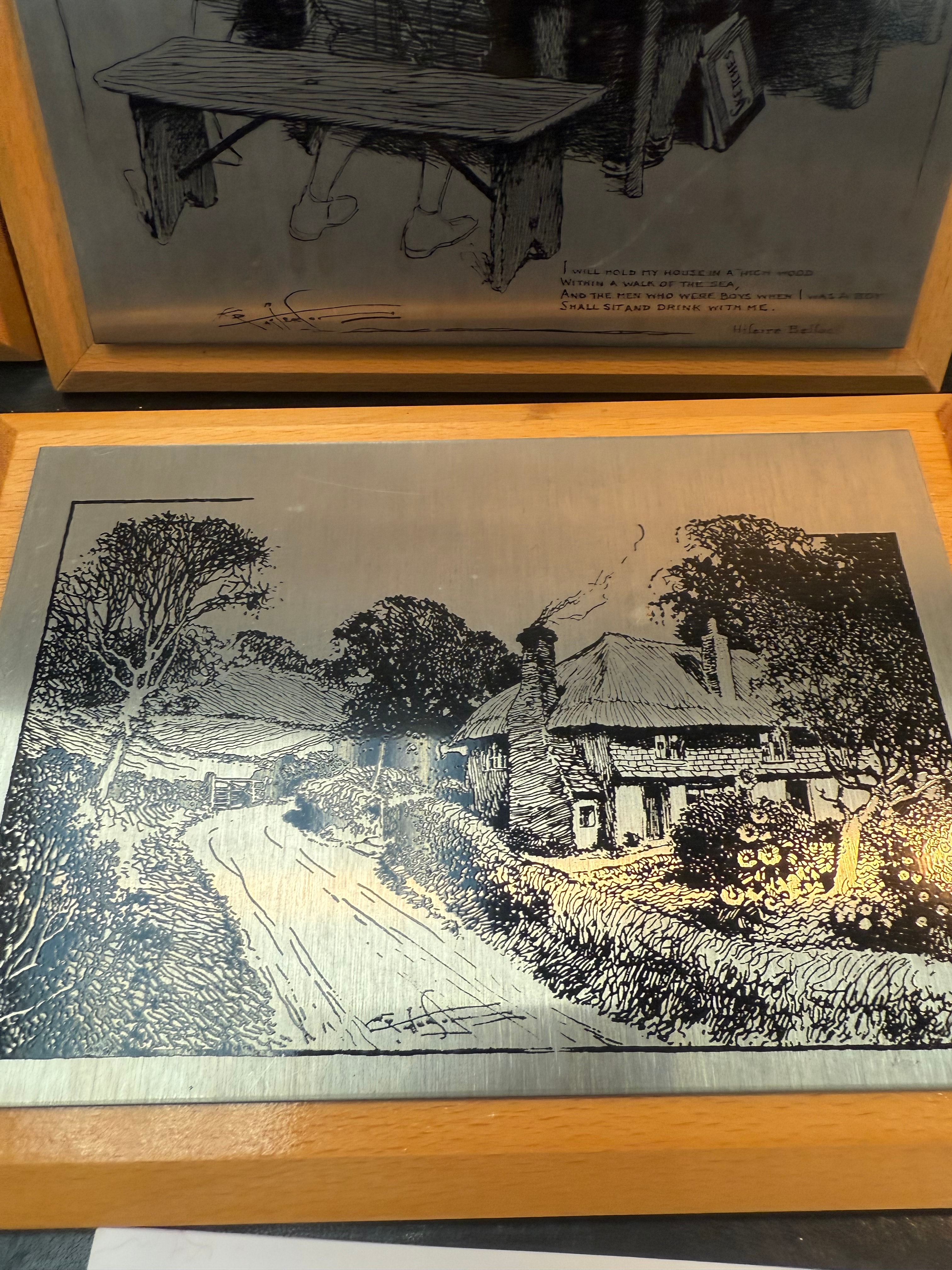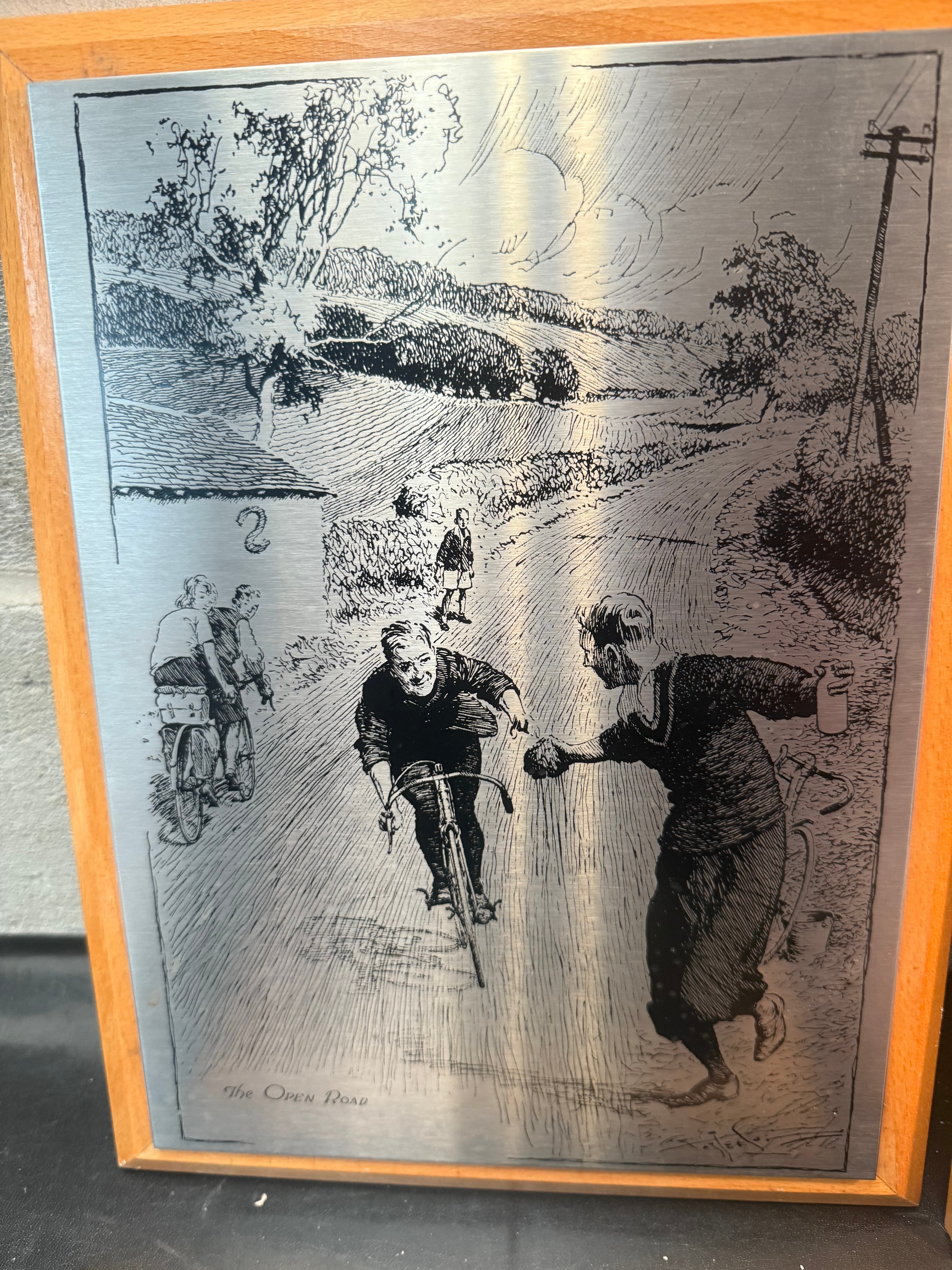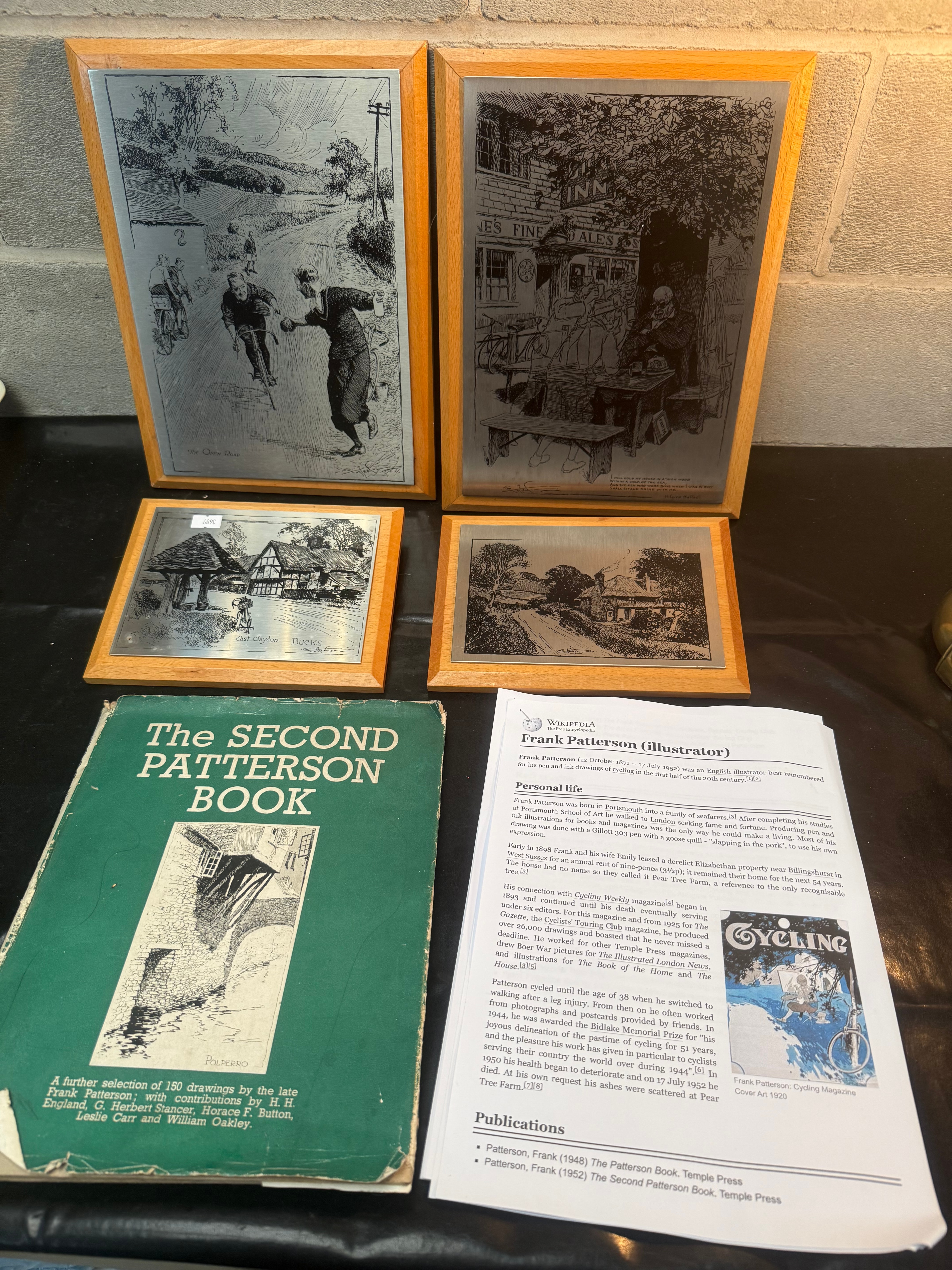 This lot comprises a collection of four framed metallic plates, likely aluminum or steel, featuring etched or engraved illustrations in the distinct pen-and-ink style of Frank Patterson (1871–1952). The imagery predominantly depicts cycling-themed rural and village scenes, including a road with cyclists titled “The Open Road,” a pub exterior marked “INN” and “JONES FINE ALES” with a quote by Hilaire Belloc, a village scene identified as “East Claydon Bucks,” and an additional plate portraying a thatched cottage in a landscape. Each plate is encased in a simple light-colored wooden frame. Accompanying these is a green hardcover book titled “THE SECOND PATTERSON BOOK,” published in 1952, featuring an illustration on its cover, and a printed informational sheet from Wikipedia about Frank Patterson (illustrator), highlighting his connection to cycling and publications like “Cycling Weekly magazine.” The collective style and artist’s dates suggest a mid-20th-century period.