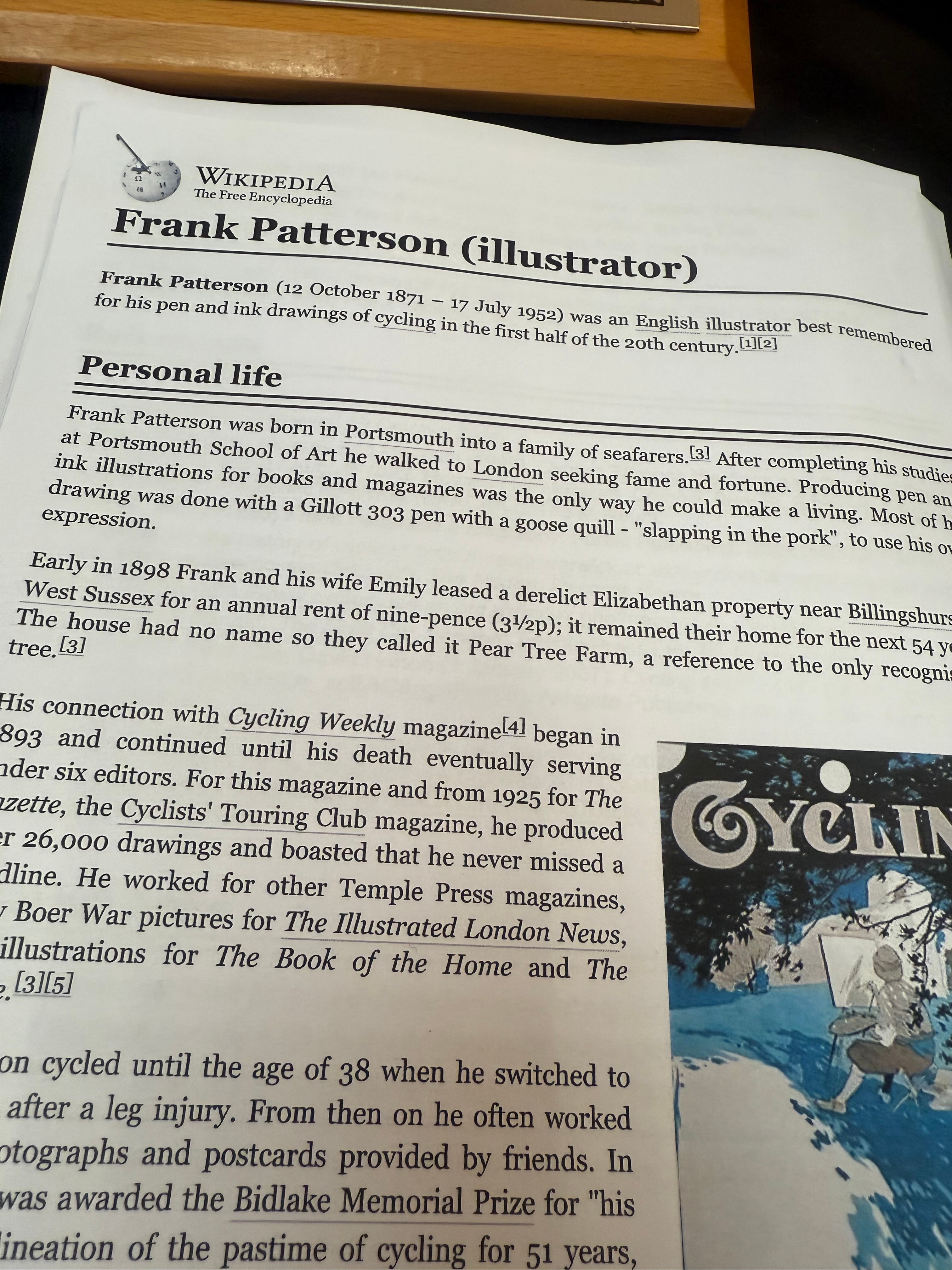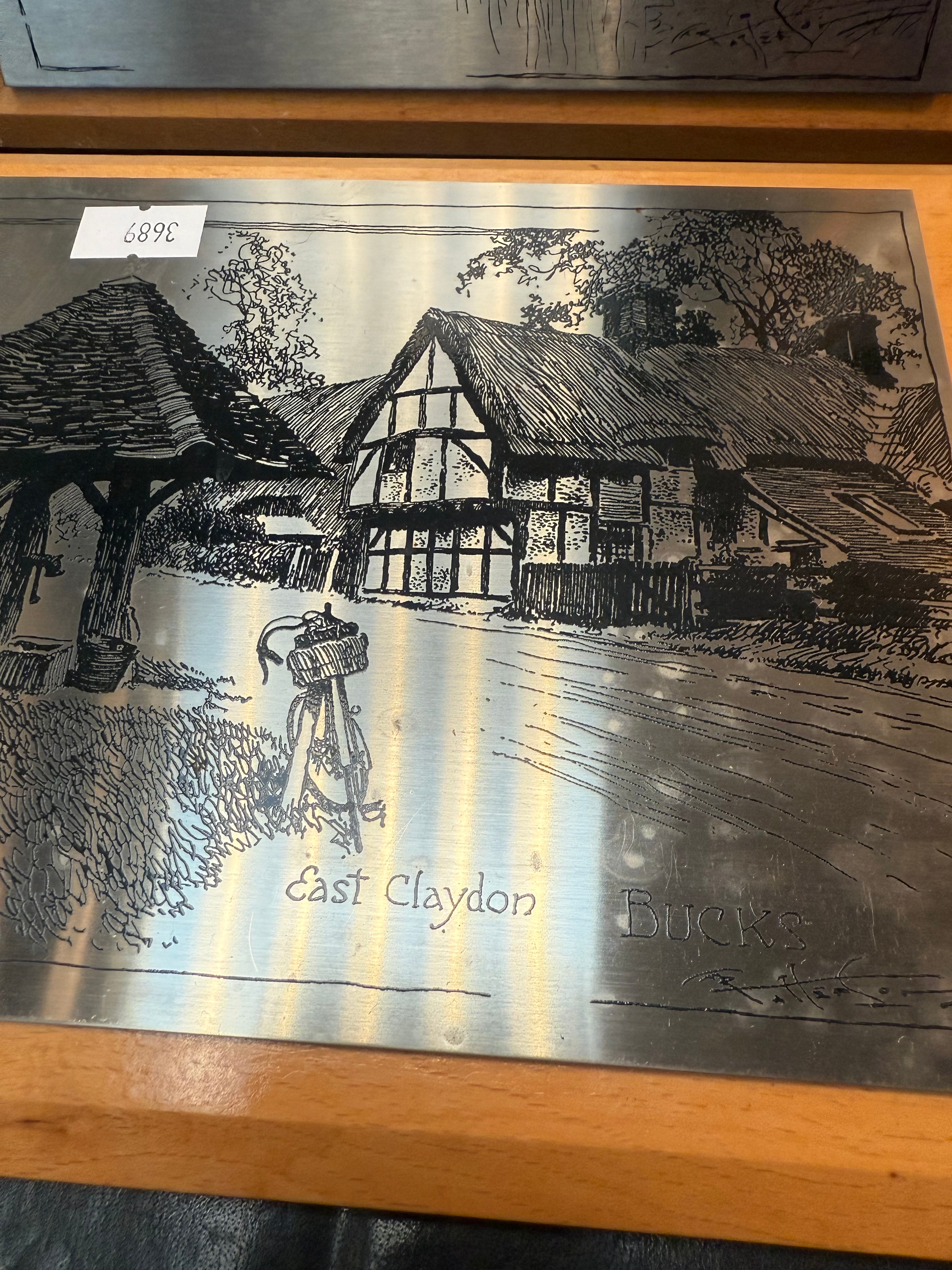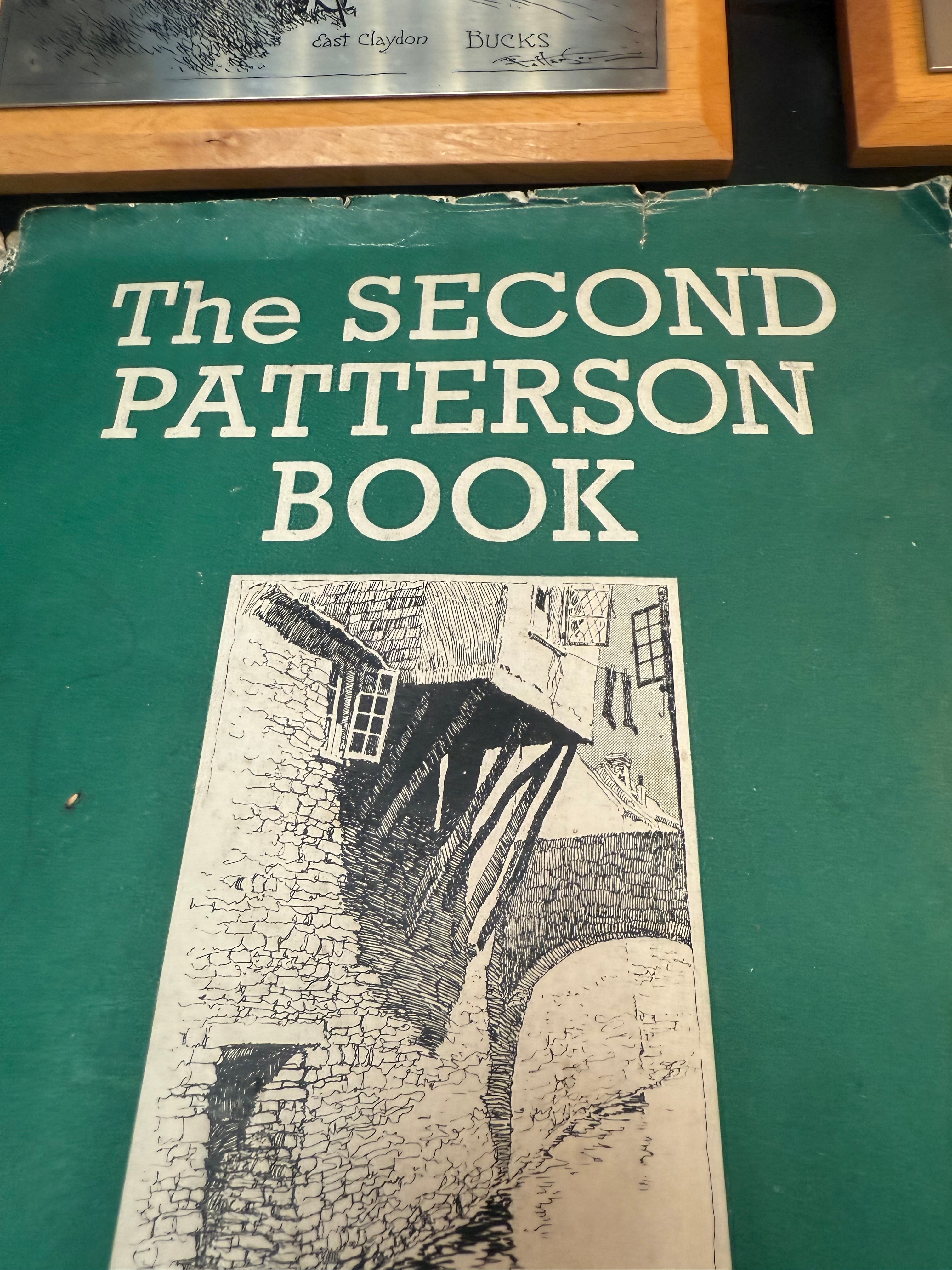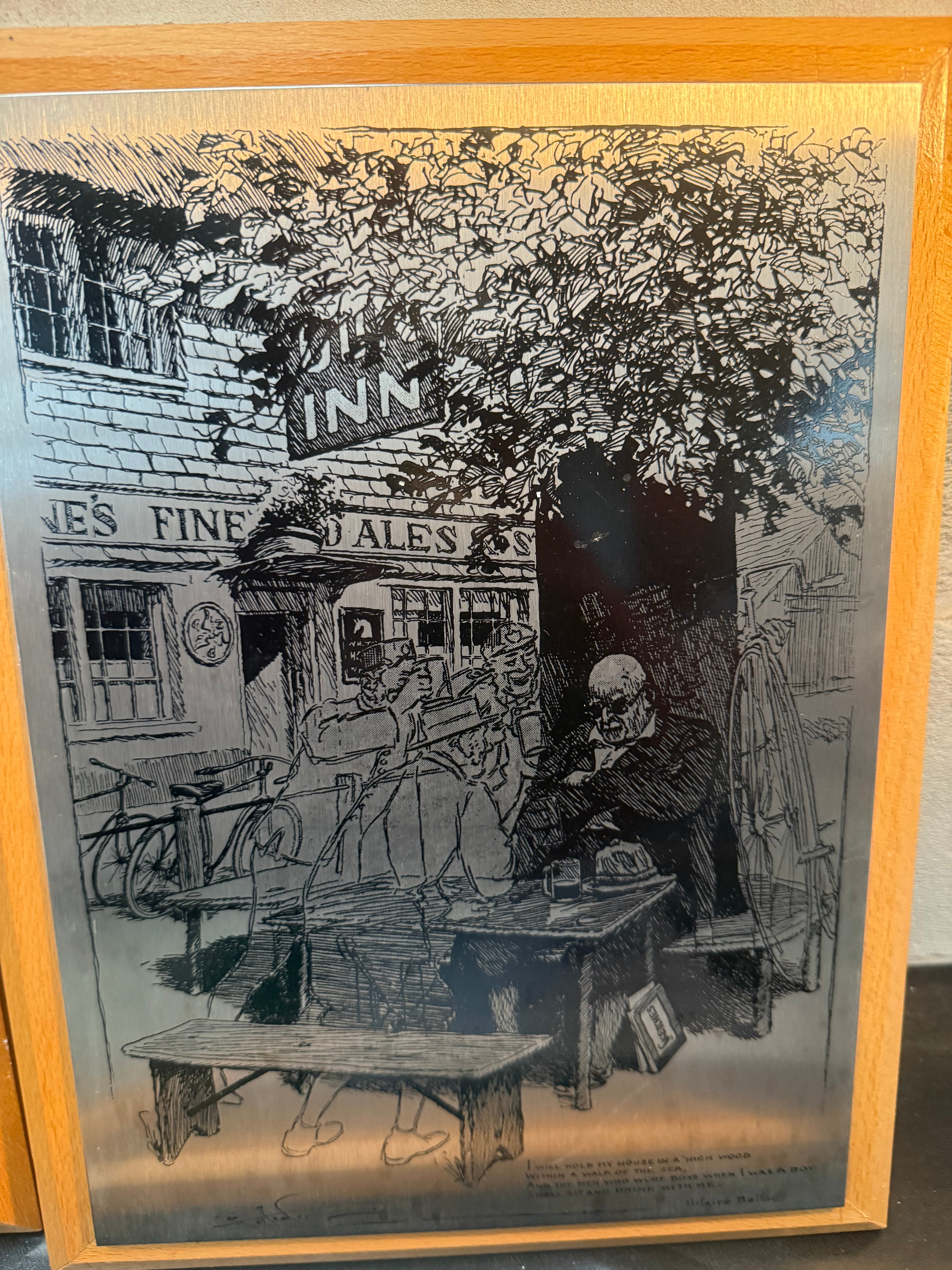 This lot comprises a collection of four framed metallic plates, likely aluminum or steel, featuring etched or engraved illustrations in the distinct pen-and-ink style of Frank Patterson (1871–1952). The imagery predominantly depicts cycling-themed rural and village scenes, including a road with cyclists titled “The Open Road,” a pub exterior marked “INN” and “JONES FINE ALES” with a quote by Hilaire Belloc, a village scene identified as “East Claydon Bucks,” and an additional plate portraying a thatched cottage in a landscape. Each plate is encased in a simple light-colored wooden frame. Accompanying these is a green hardcover book titled “THE SECOND PATTERSON BOOK,” published in 1952, featuring an illustration on its cover, and a printed informational sheet from Wikipedia about Frank Patterson (illustrator), highlighting his connection to cycling and publications like “Cycling Weekly magazine.” The collective style and artist’s dates suggest a mid-20th-century period.