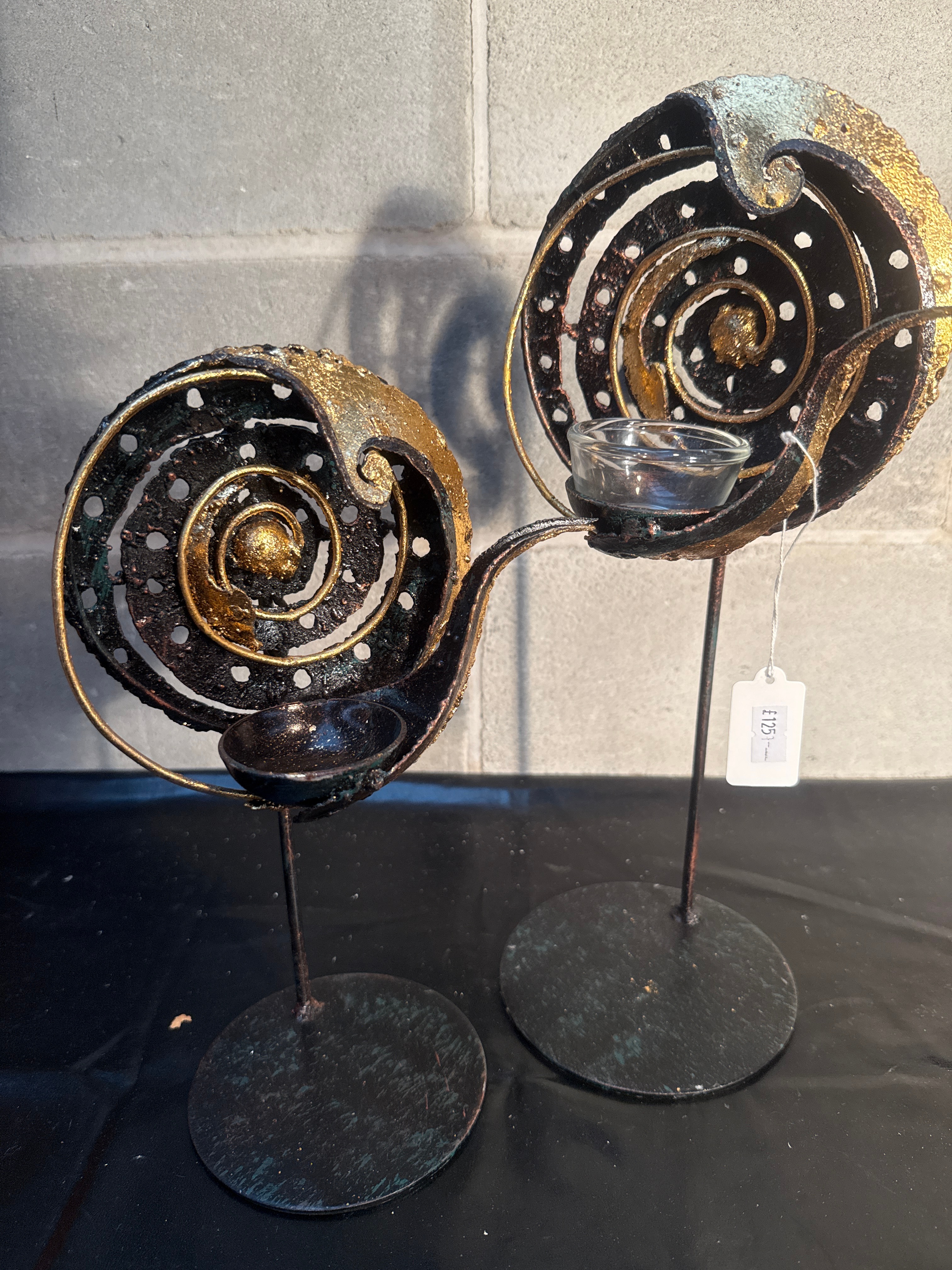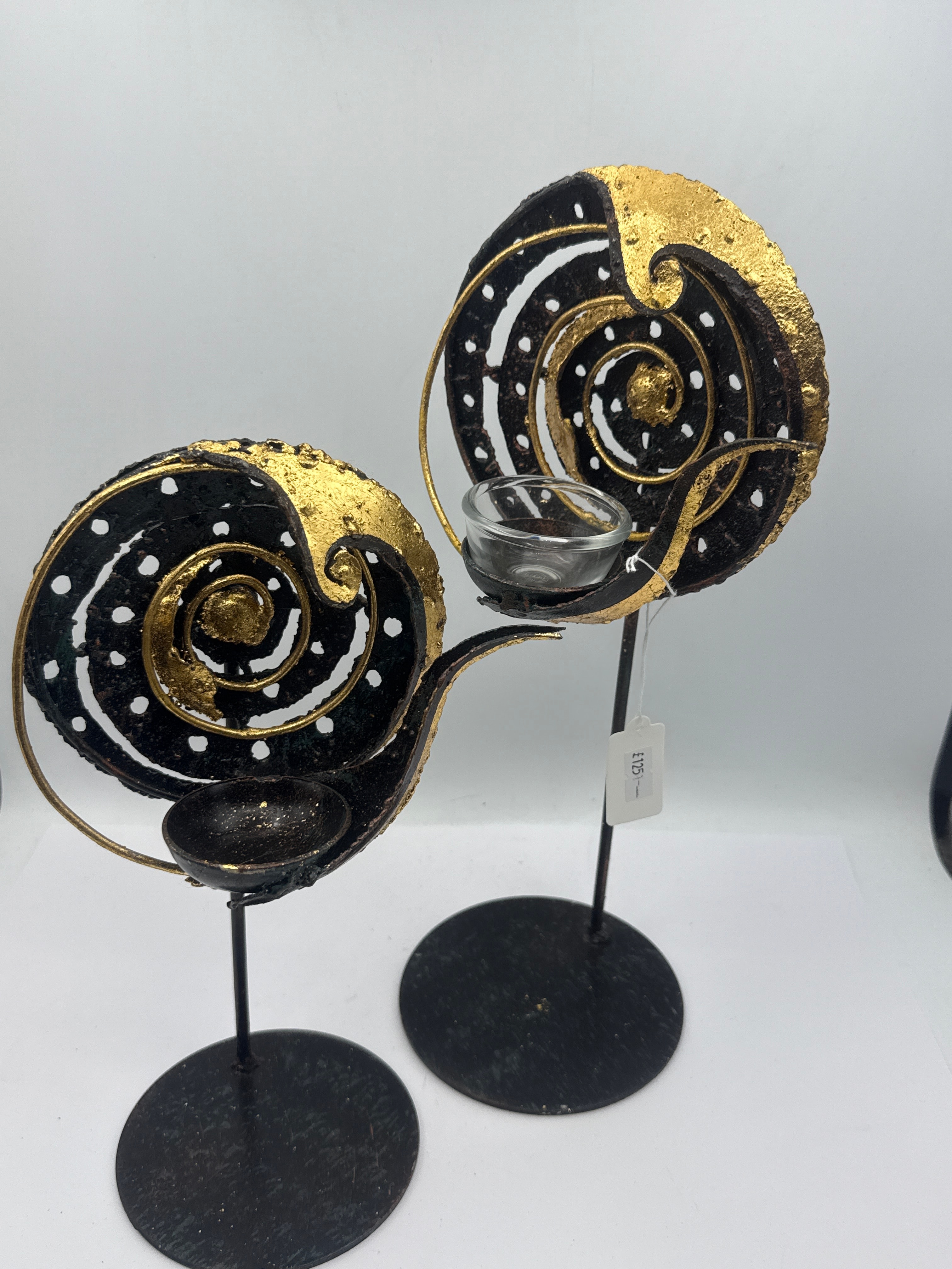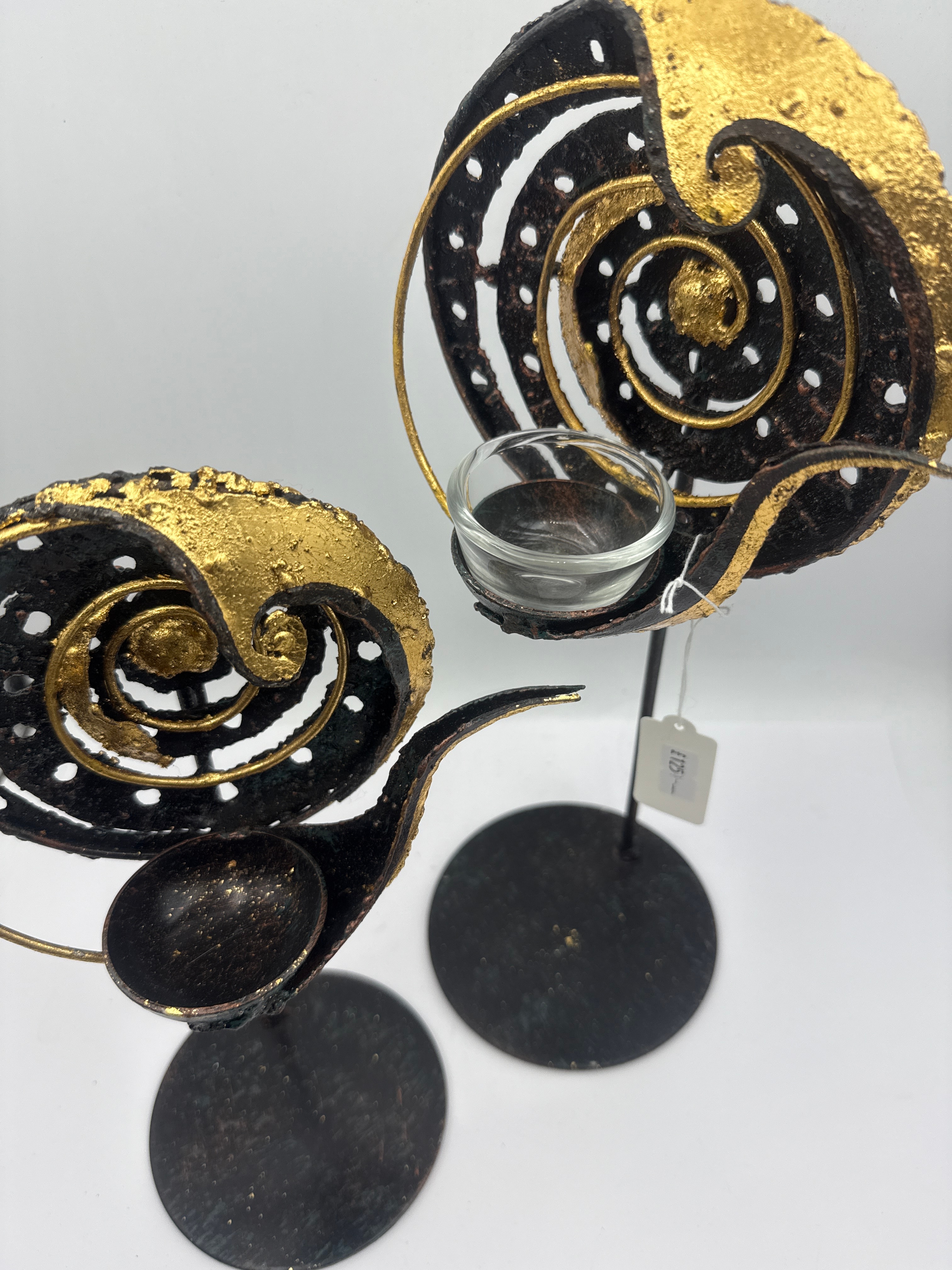 A pair of modern decorative candle holders. The materials for this item are confirmed as: 13” & 10”. Visually, these holders are crafted from dark-finished metal, possibly iron or steel, with textured gold-toned accents forming abstract, multi-layered spiral designs, consistent with a ‘copper look’ and ‘gold ornate’ aesthetic found in similar market items. Each piece stands independently on a circular base. One holder includes a clear glass insert for a candle.