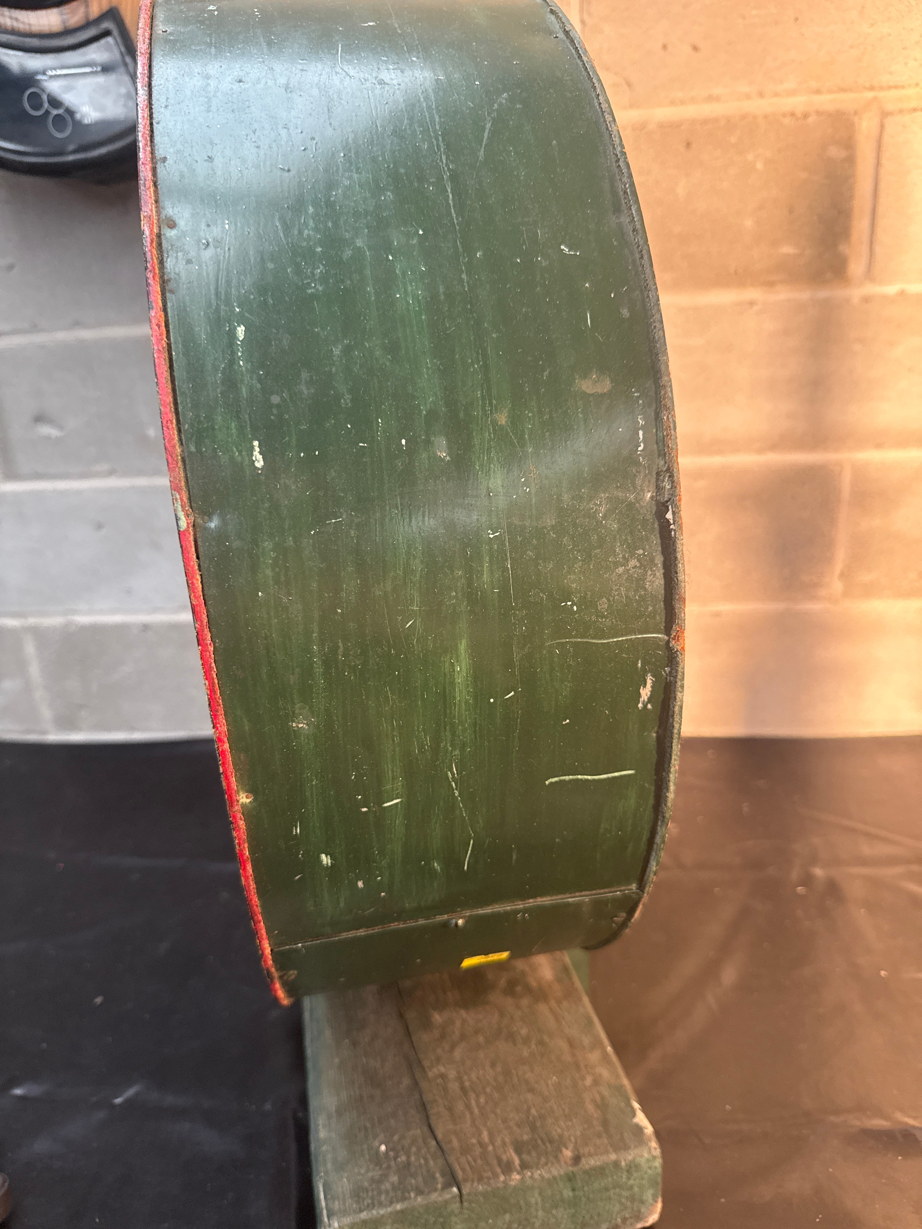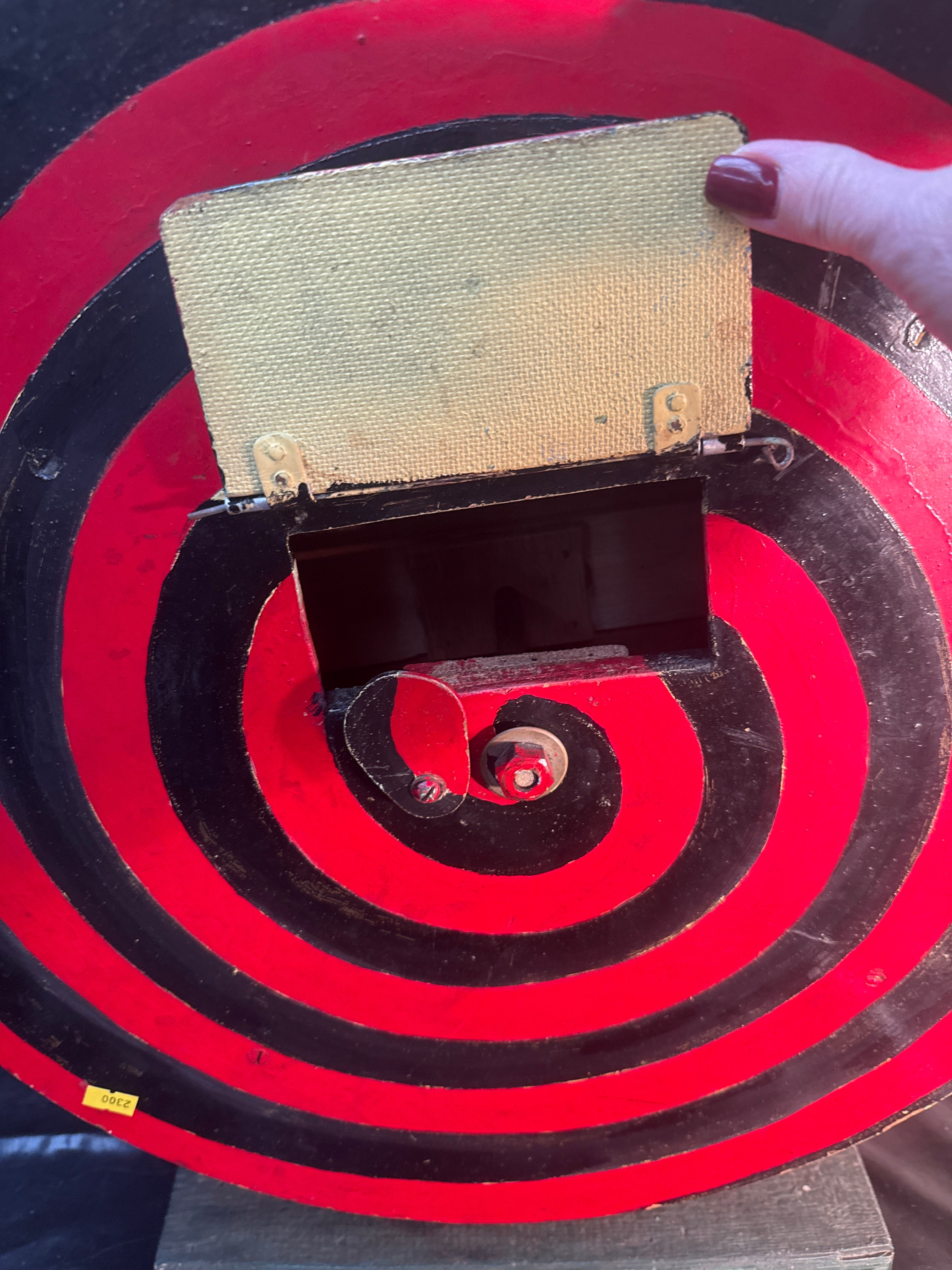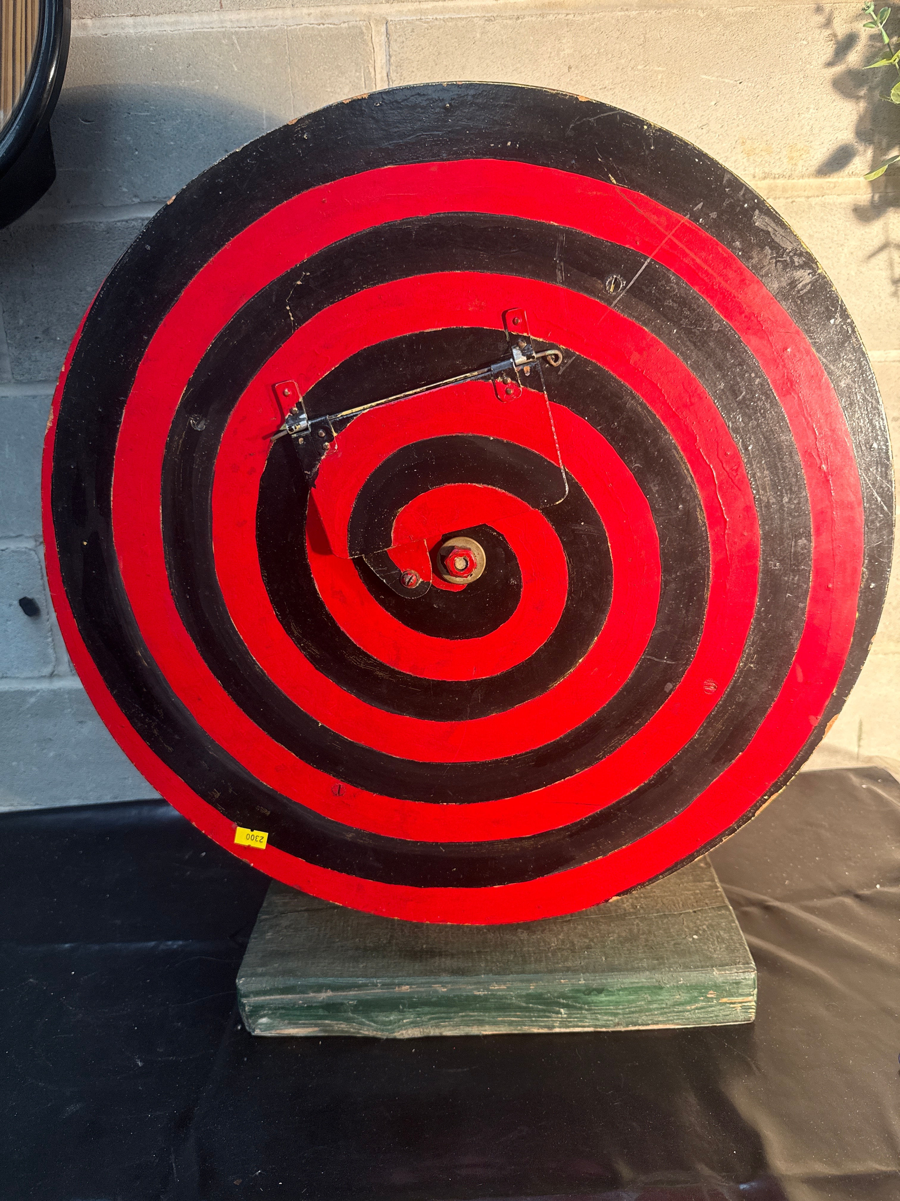 A large, circular, vintage-style game wheel or display, predominantly constructed from painted wood. The face features a striking red and black concentric spiral design, while the thick side is painted dark green. A central metal pin and a visible string-and-pivot mechanism are present on the face, along with a hinged access panel, possibly wood covered with a textured material, which opens to reveal a rectangular slot and internal components. A yellow sticker displaying the number “2300” is affixed to the lower left edge.