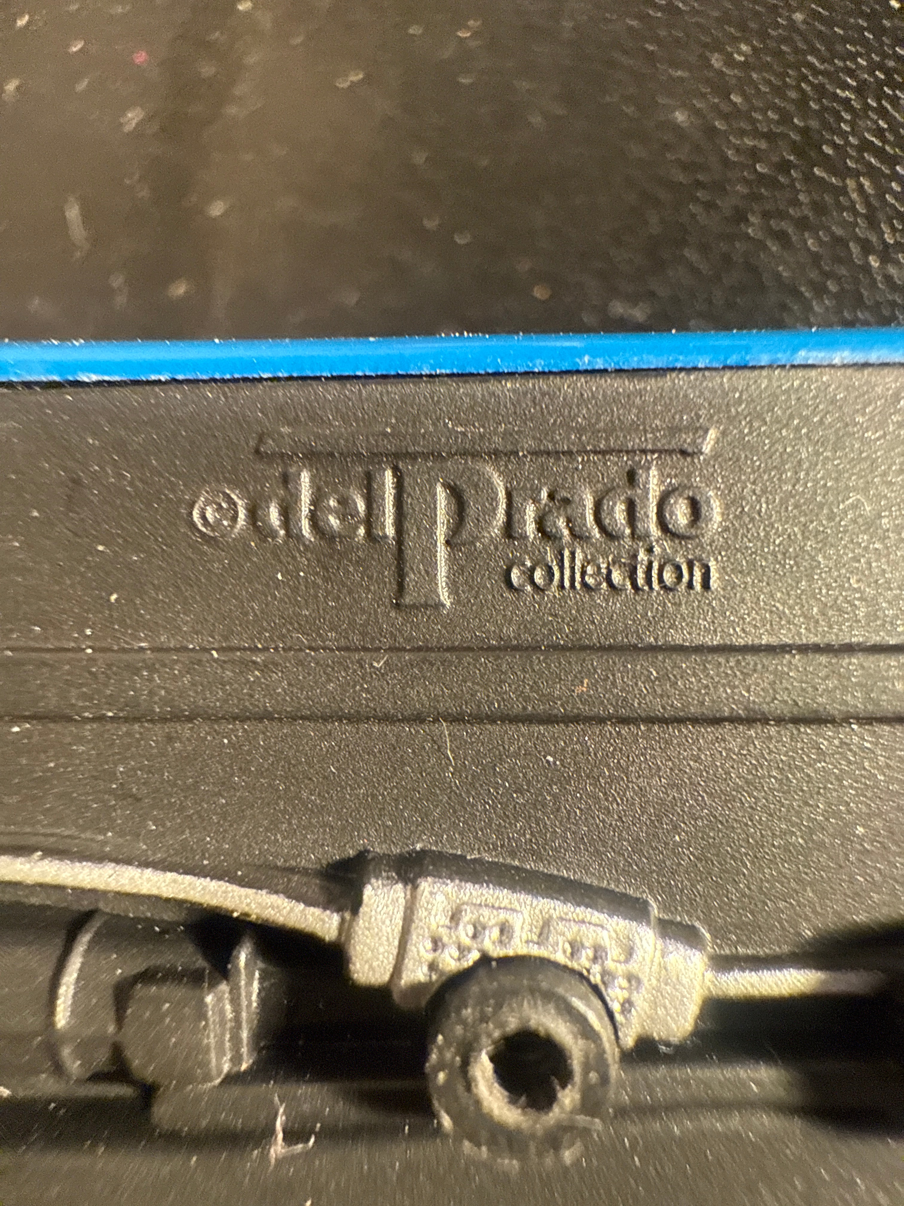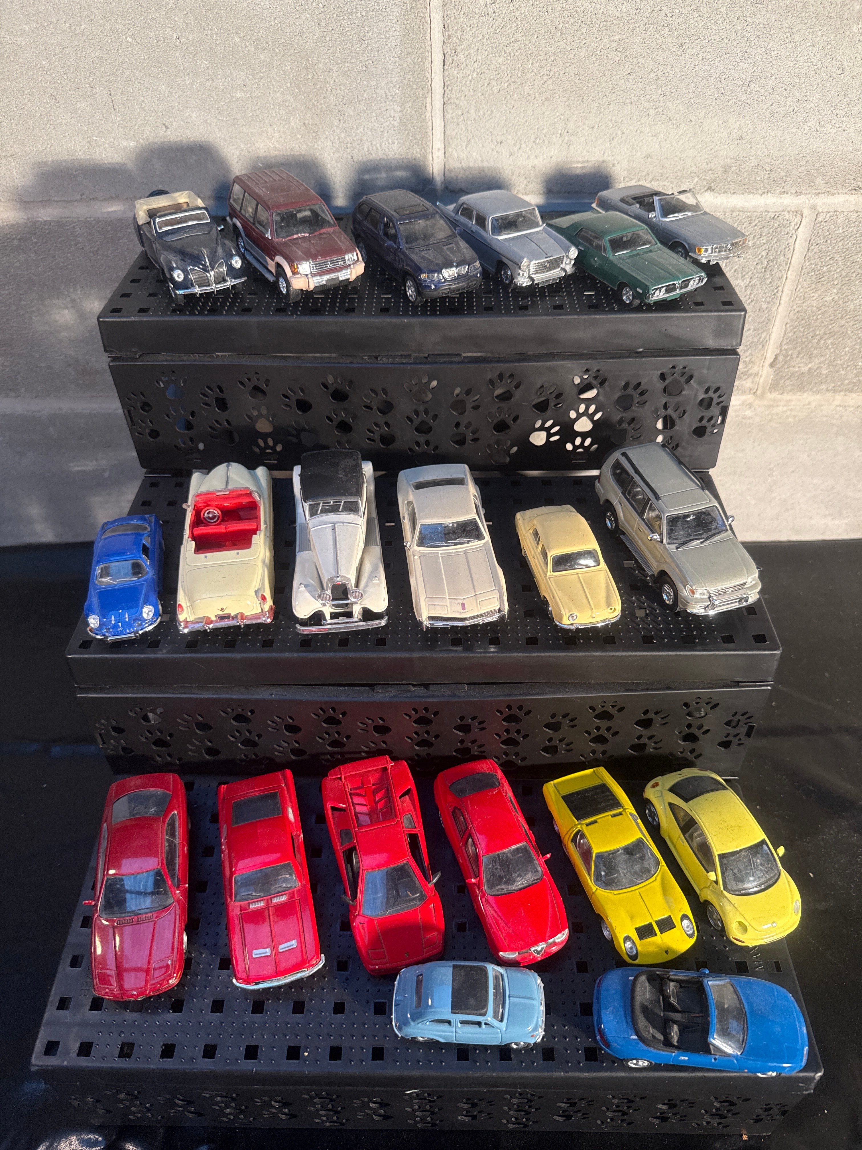 A collection of 20 Del Prado Car Collection miniature model automobiles, likely in 1:43 scale, rendered in diverse colors and styles encompassing classic and contemporary designs, including sedans, sports cars, and utility vehicles. These models are likely constructed from die-cast metal and plastic. They are displayed on four interlocking black plastic racks, each featuring decorative paw print cutouts. A clear embossed marking on one of the racks reads “© delPrado collection.”