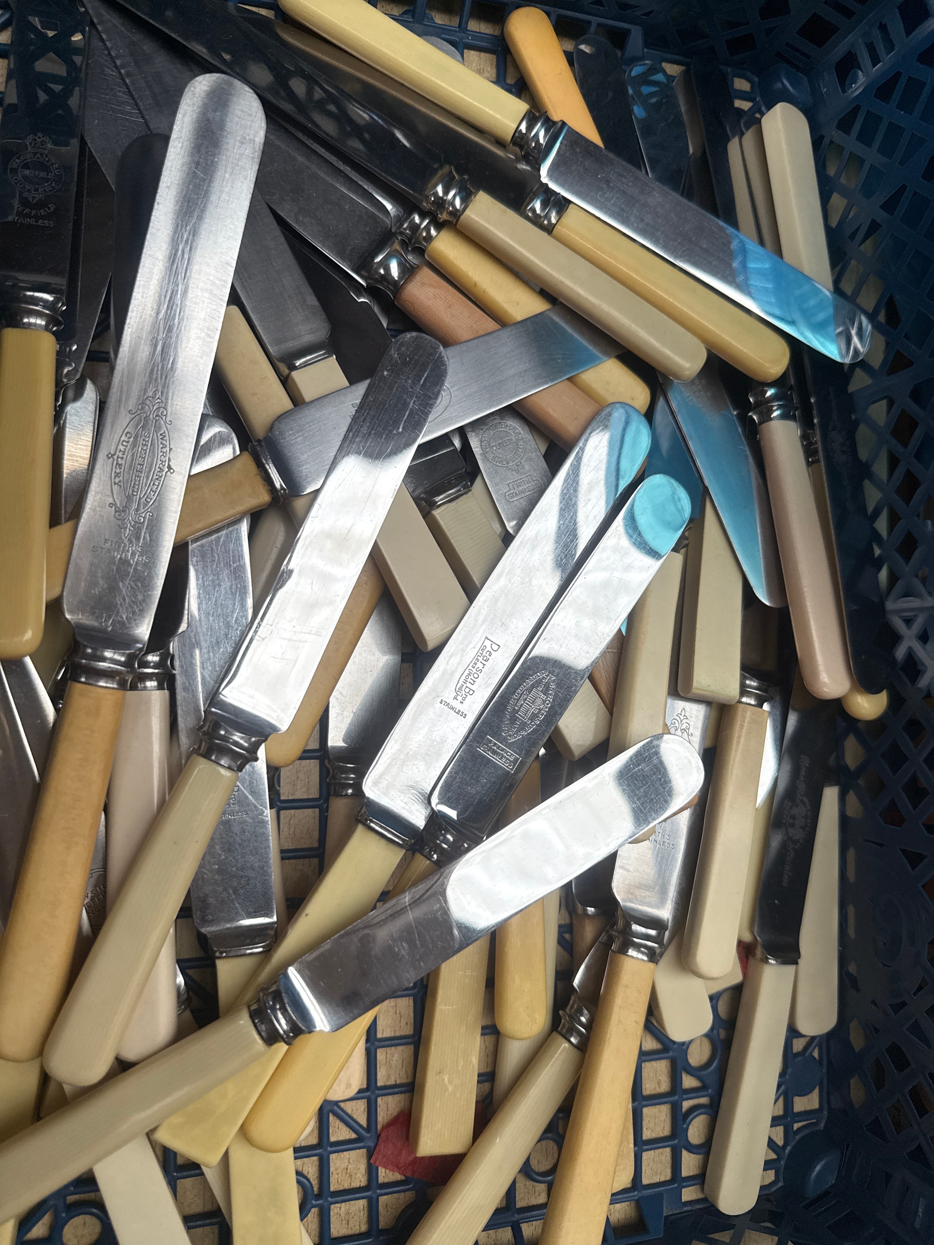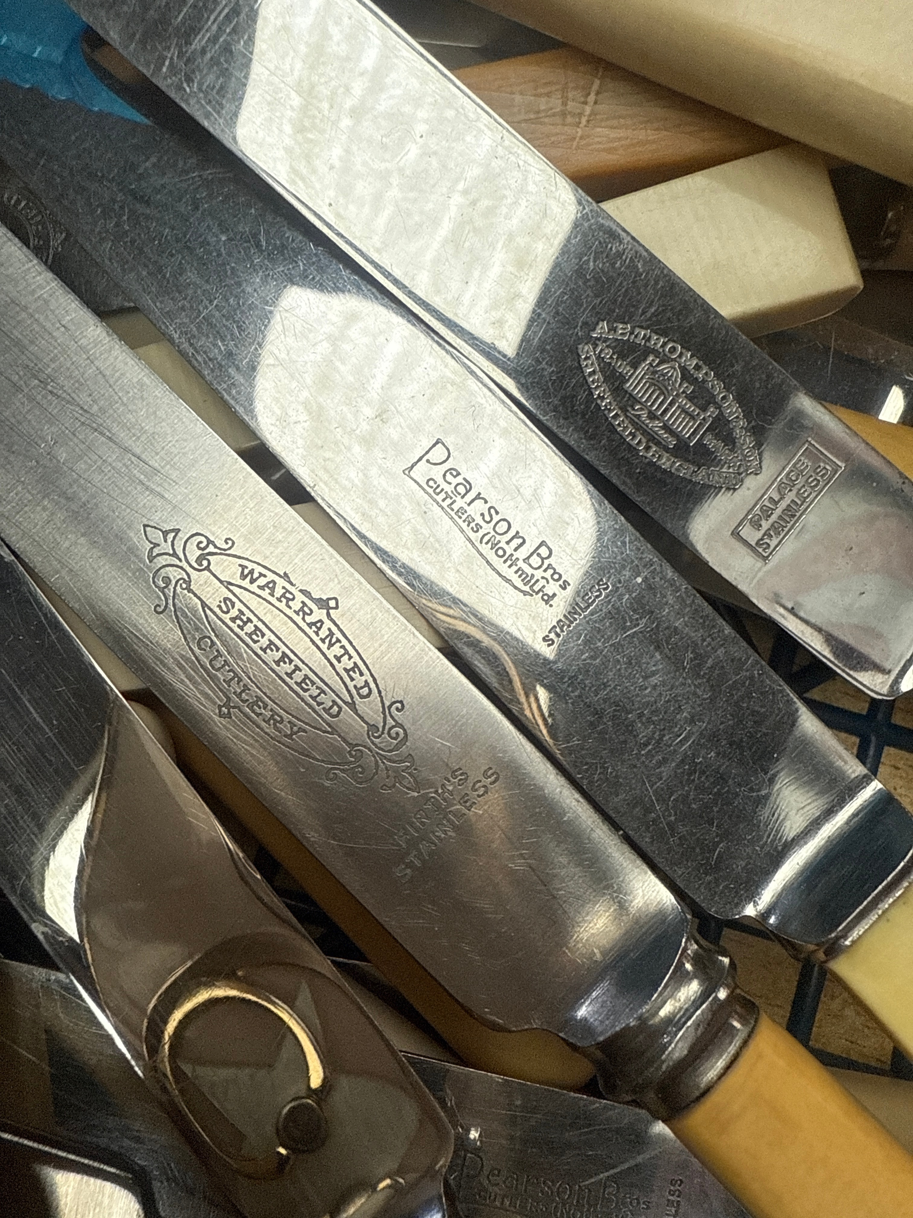 A large collection of assorted table knives, primarily featuring stainless steel blades and handles in varying shades of cream, pale yellow, light brown, and a few light blue, suggesting synthetic materials like celluloid or similar early plastics. Several blades bear engraved maker’s marks, including “WARRANTED SHEFFIELD CUTLERY FIRTH’S STAINLESS”, “Pearson Bros CUTLERY (mow-mfd.) STAINLESS”, and “A. THOMPSON SHEFFIELD PALACE STAINLESS”, indicating their origin from the renowned Sheffield manufacturing region and generally dating to the mid-20th century.