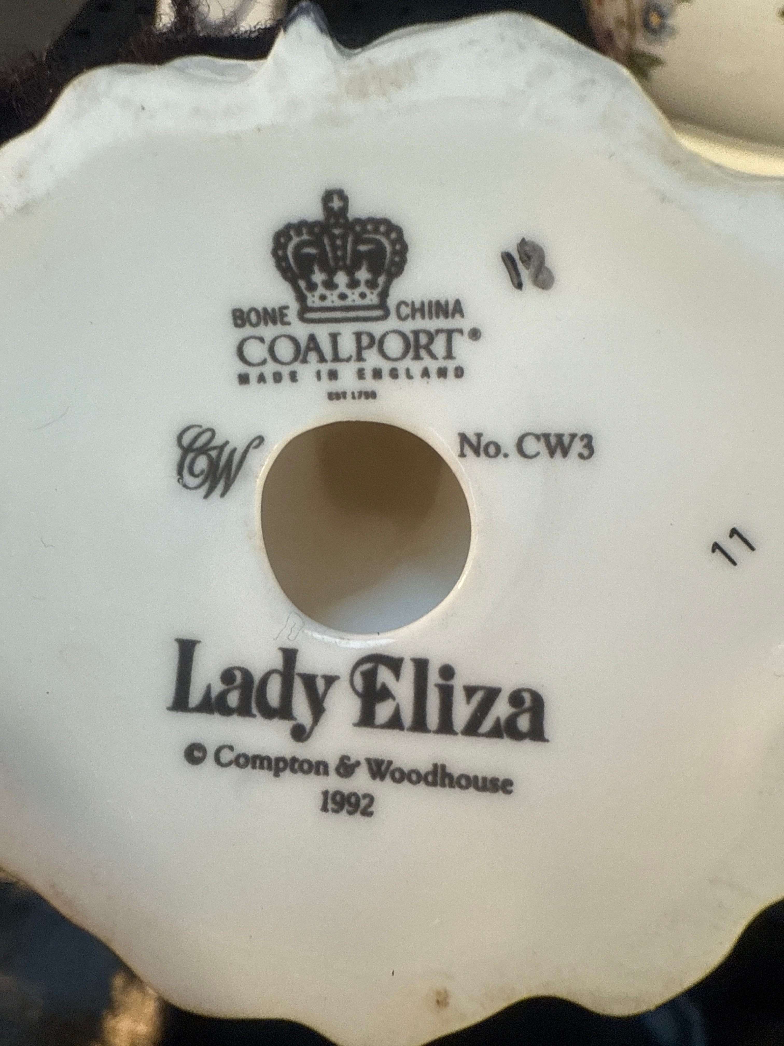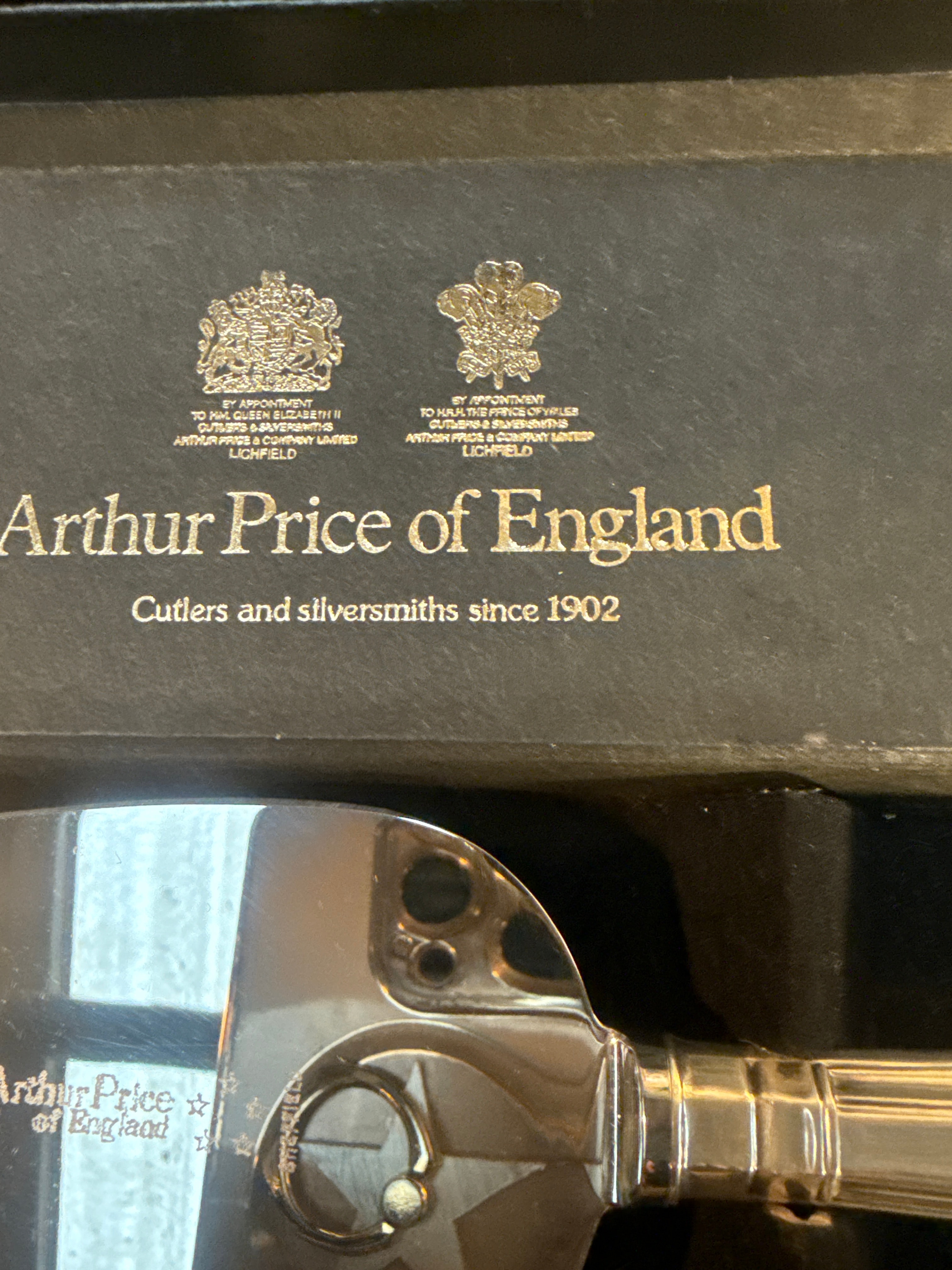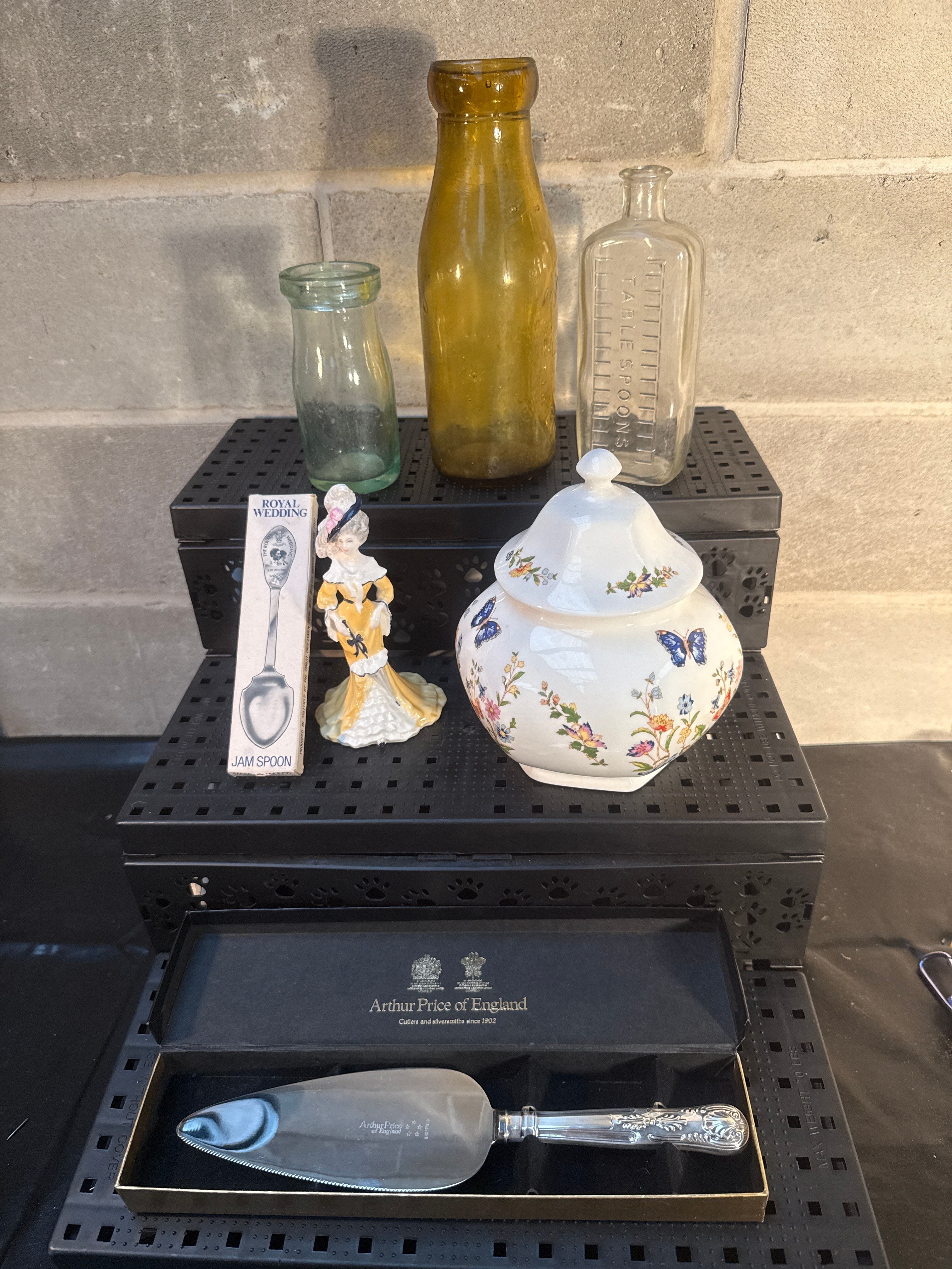 Accompanied by a Coalport ‘Lady Eliza’ bone china figurine, depicting a woman in a yellow and white period gown, marked on its base “BONE CHINA COALPORT MADE IN ENGLAND EST 1750 © Compton & Woodhouse 1992.” Also included are three glass bottles, one amber and two clear, with one clear bottle marked with volumetric measurements including “TABLE SPOONS.” Further items comprise a boxed silver-toned “ROYAL WEDDING JAM SPOON” and an Arthur Price of England silver-toned cake server, presented in its original box marked “Cutlers and silversmiths since 1902” and displaying royal warrants for Queen Elizabeth II and HRH The Prince of Wales.