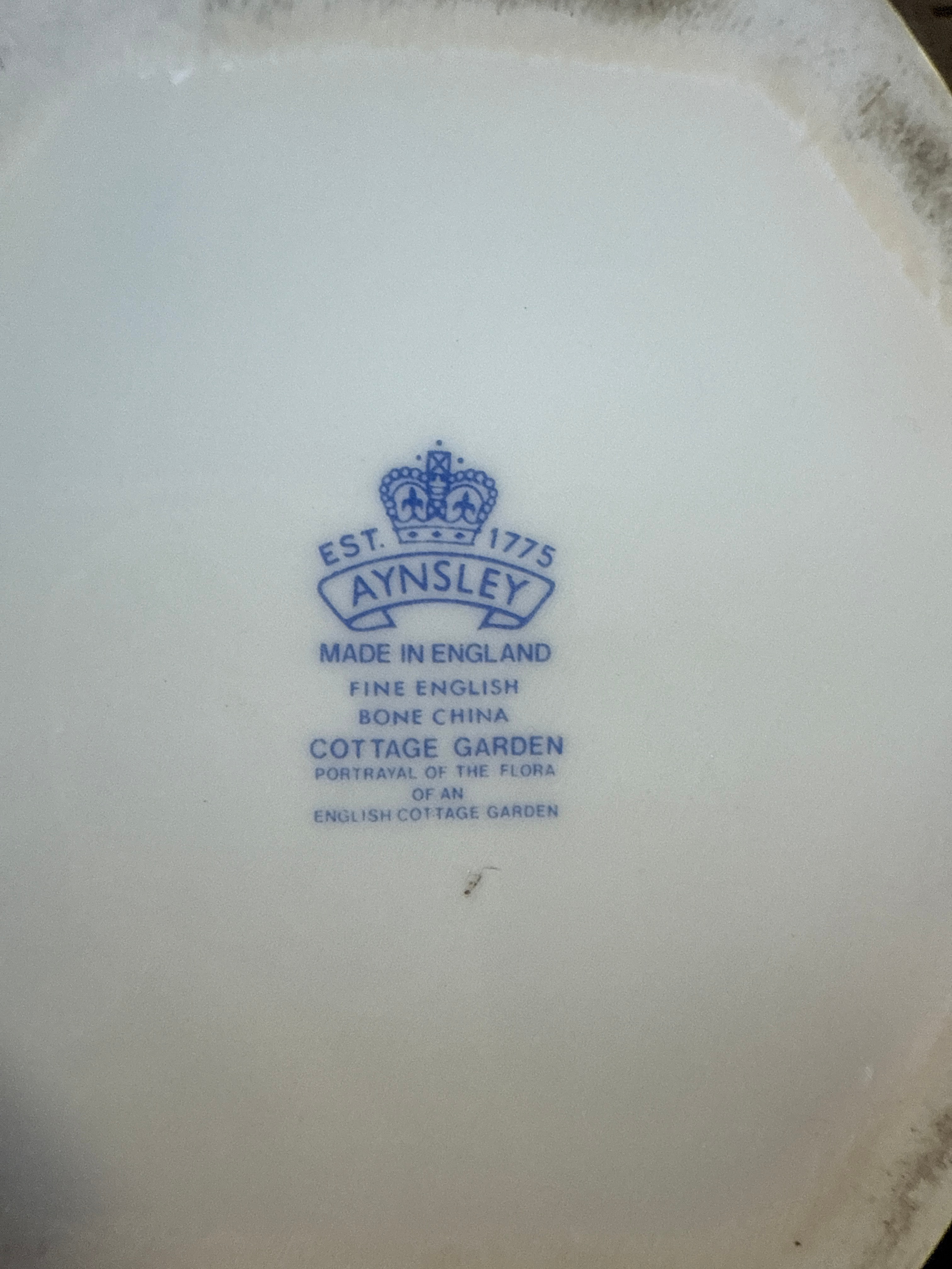 An Aynsley ‘Cottage Garden’ Fine English Bone China Ginger Jar, a lidded pot adorned with vibrant floral and butterfly motifs. Its base is marked “EST. 1775 AYNESLEY MADE IN ENGLAND FINE ENGLISH BONE CHINA COTTAGE GARDEN PORTRAYAL OF THE FLORA OF AN ENGLISH COTTAGE GARDEN.”