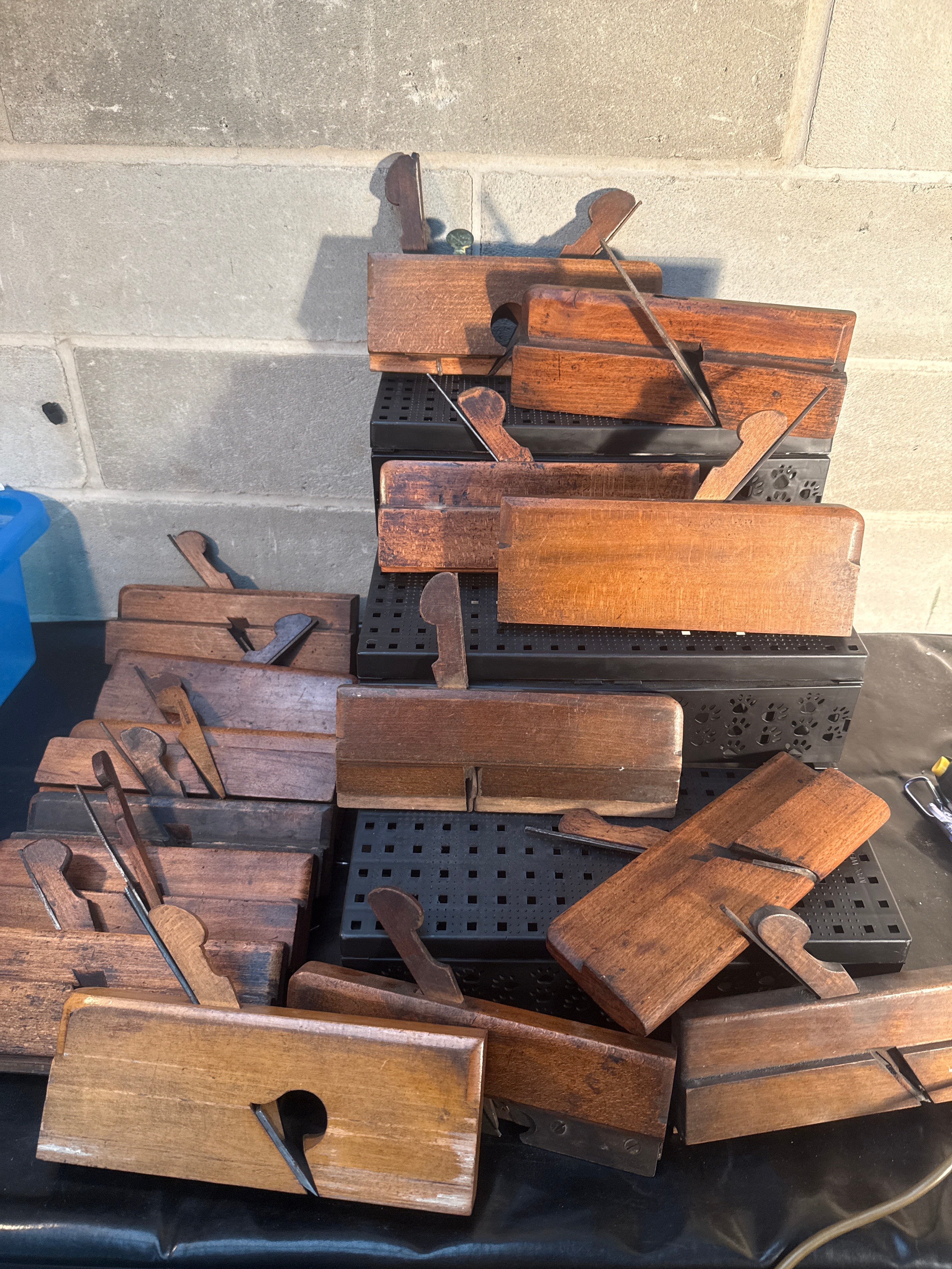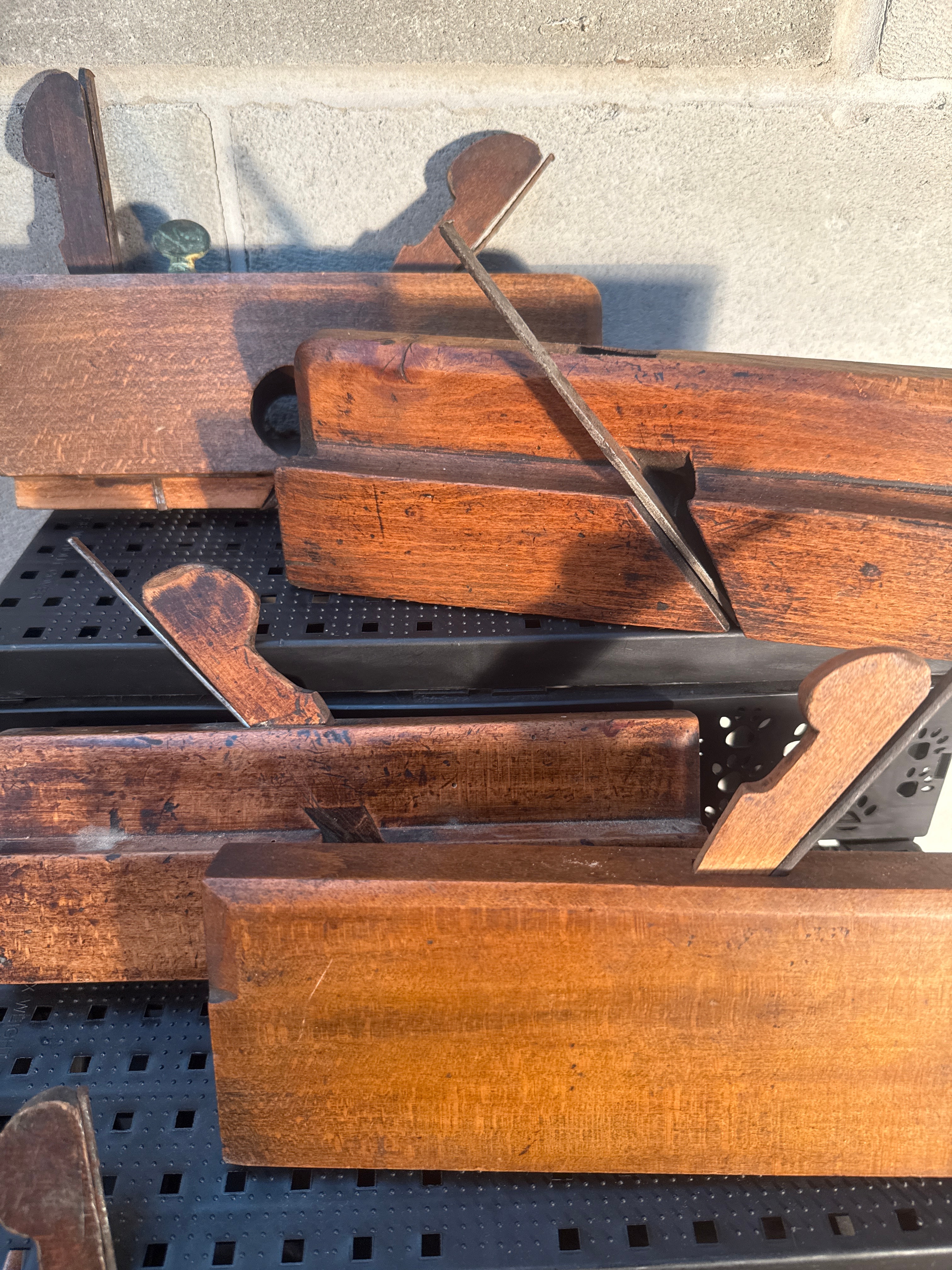 This lot comprises 15 antique and vintage wooden hand planes. Each plane is primarily constructed from hardwood, appearing to be beech or a similar dense wood, with steel cutting irons and metal wedges or adjusters. The designs are traditional, consistent with woodworking tools from the 19th to early 20th century, and include various molding planes, rabbet planes, and some bench planes. No specific period or manufacturer’s markings are discernible from the images.