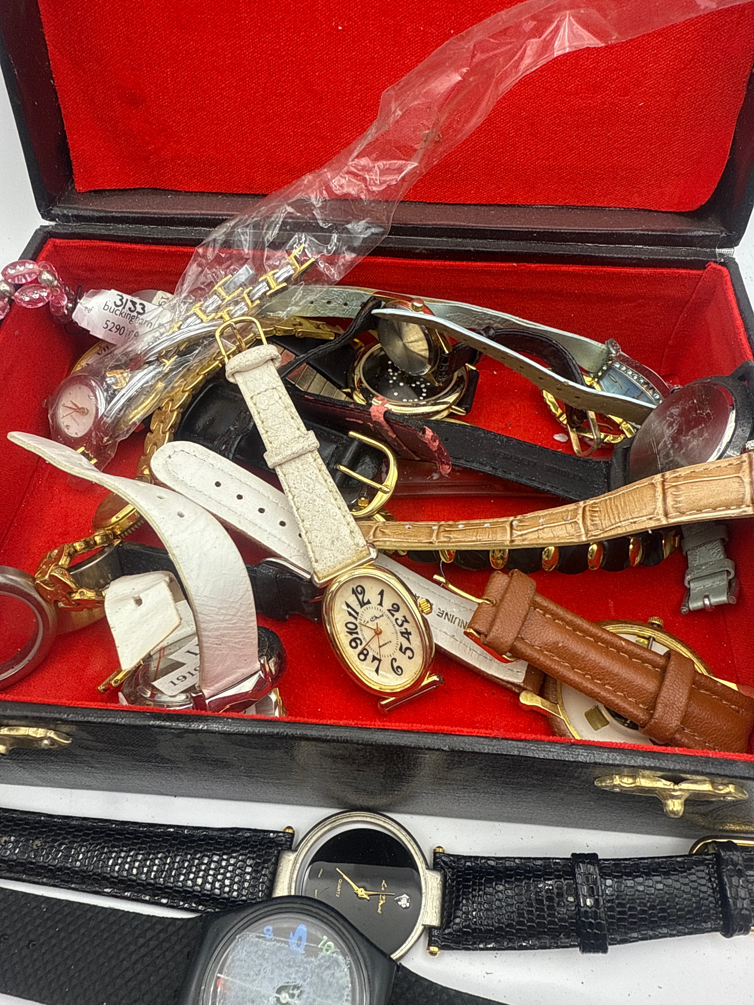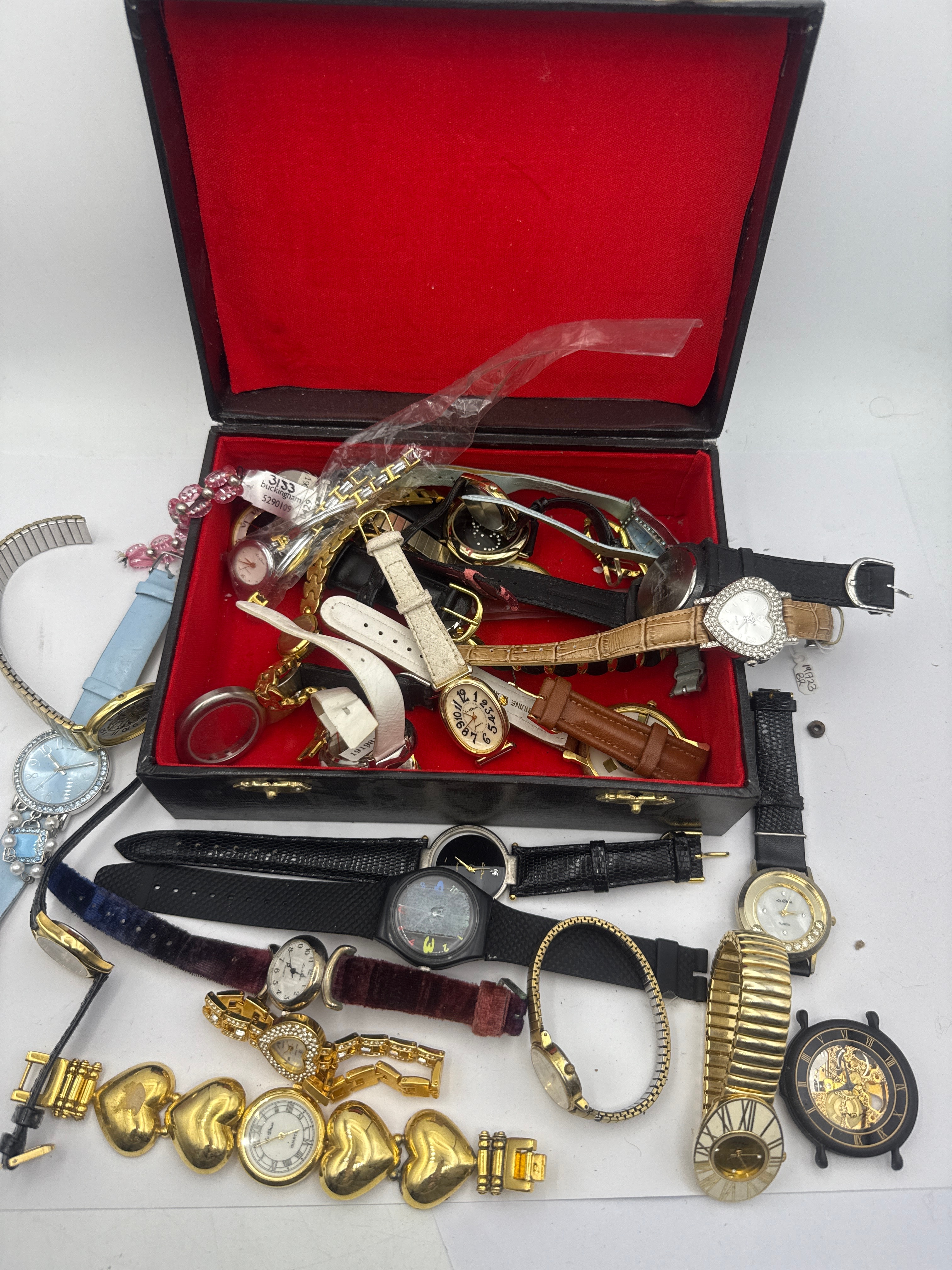 A collection of approximately 25-30 assorted wristwatches, predominantly women’s styles, accompanied by a few pieces of costume jewelry, such as bracelets. The items are contained within and spilled from a black, hard-sided case featuring a red felt interior. The watches exhibit a wide variety of styles, periods, and materials, including cases in gold-tone, silver-tone, and black-tone metals, paired with straps made of leather (some visibly marked “GENUINE LEATHER”), faux leather, metal links, and plastic. Visible details include various dial designs with Arabic and Roman numerals, decorative elements, and some watches with heart-shaped or oversized faces. A small paper tag inside the case displays “3/33”, “buchstabeln”, and “S2901962”.
