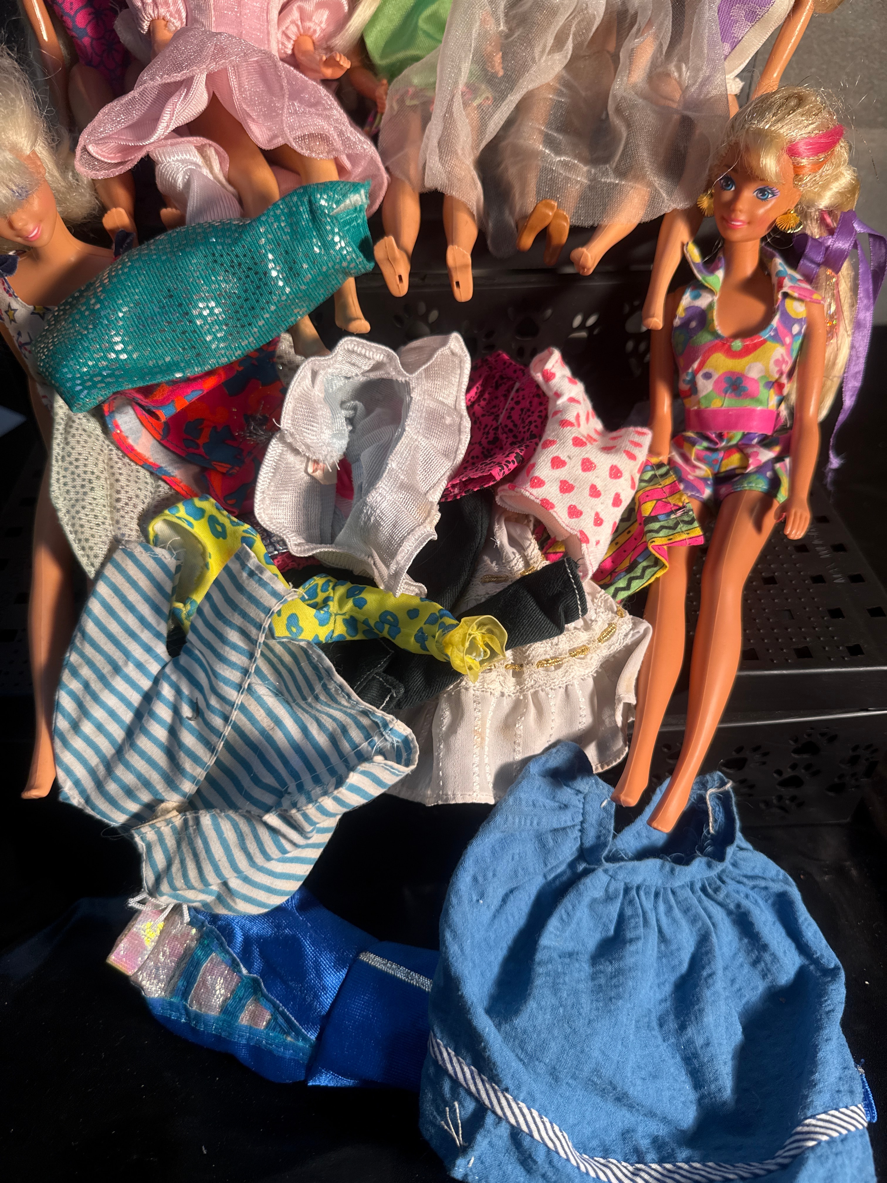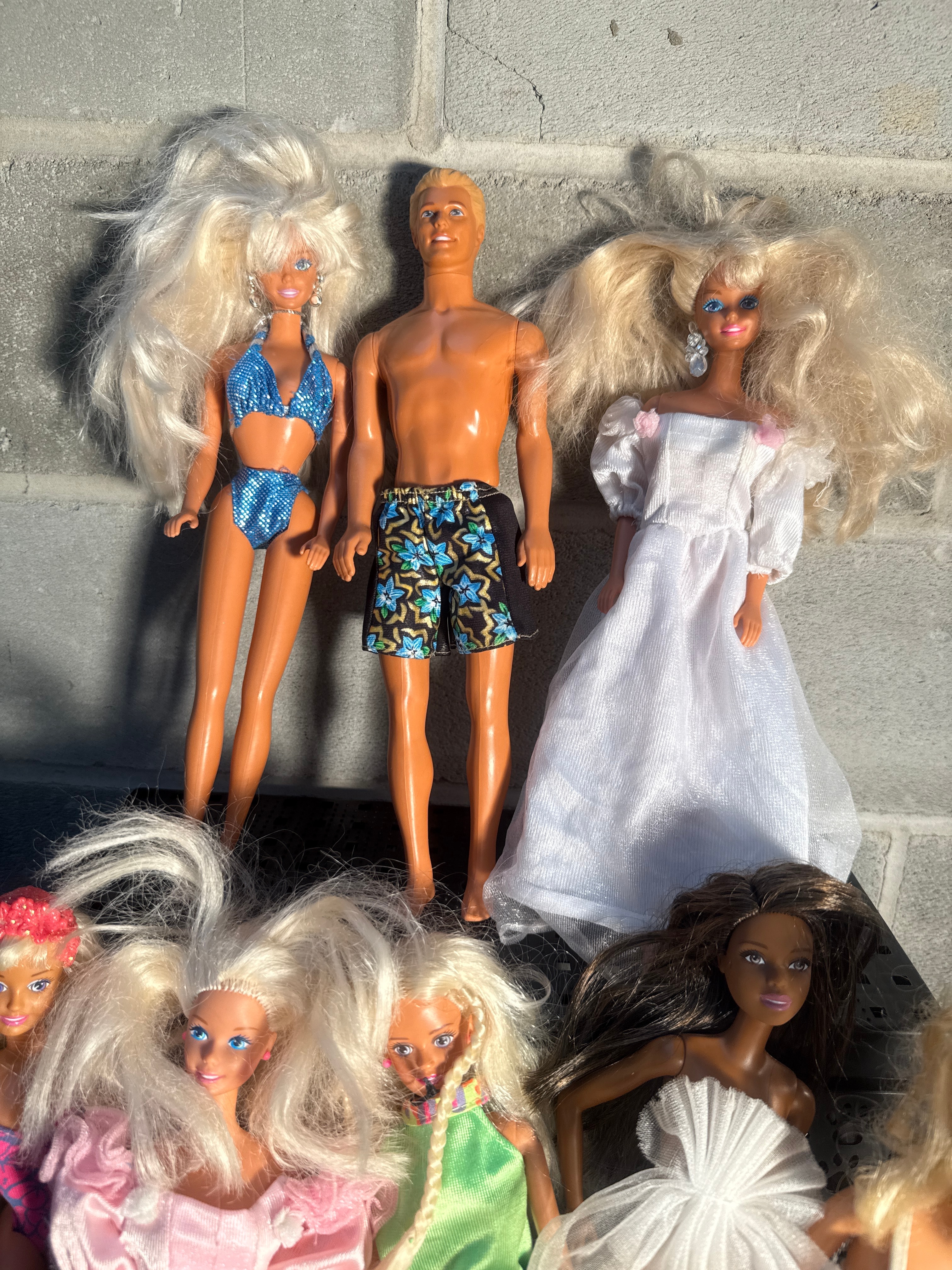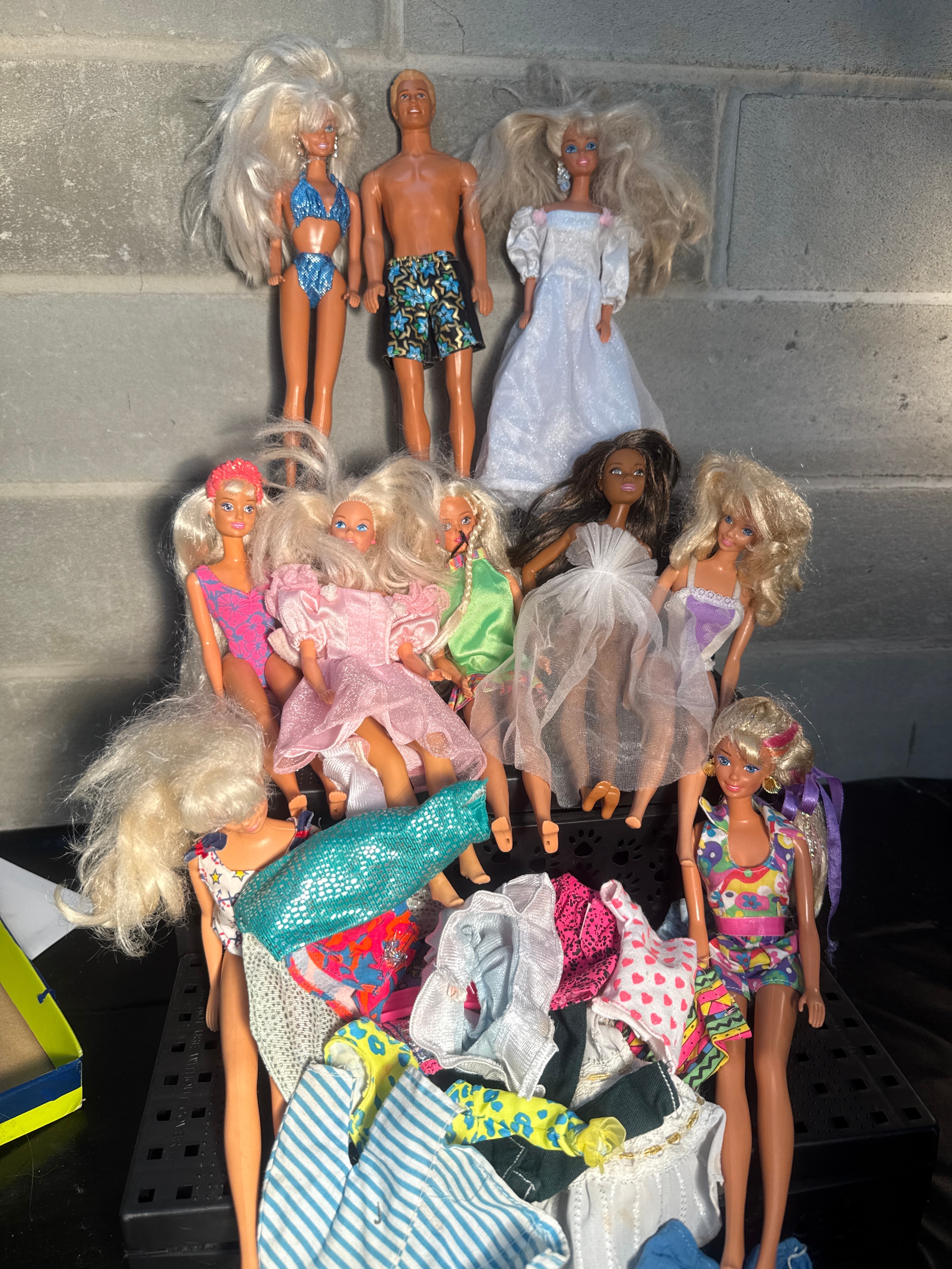 A collection of ten Mattel Barbie and Ken dolls, including a Tropical Splash Ken doll, accompanied by a varied assortment of doll clothing. The lot comprises primarily blonde female fashion dolls consistent with the Barbie line and one male doll, identifiable as Ken, with features and styling characteristic of late 20th-century production. The dolls feature voluminous hair and are dressed in diverse wardrobes including swimsuits, dresses, and casual attire in various synthetic fabrics. No distinct manufacturer marks or textual inscriptions are clearly visible on the items.