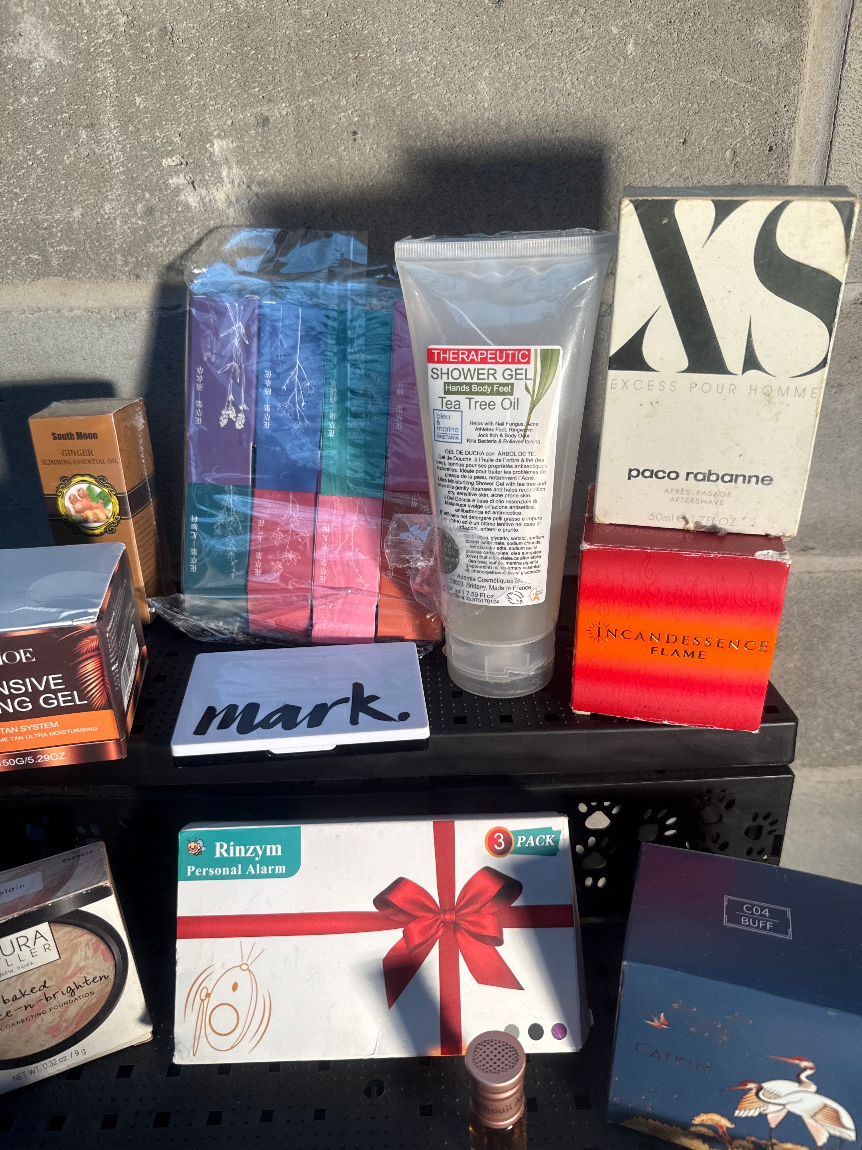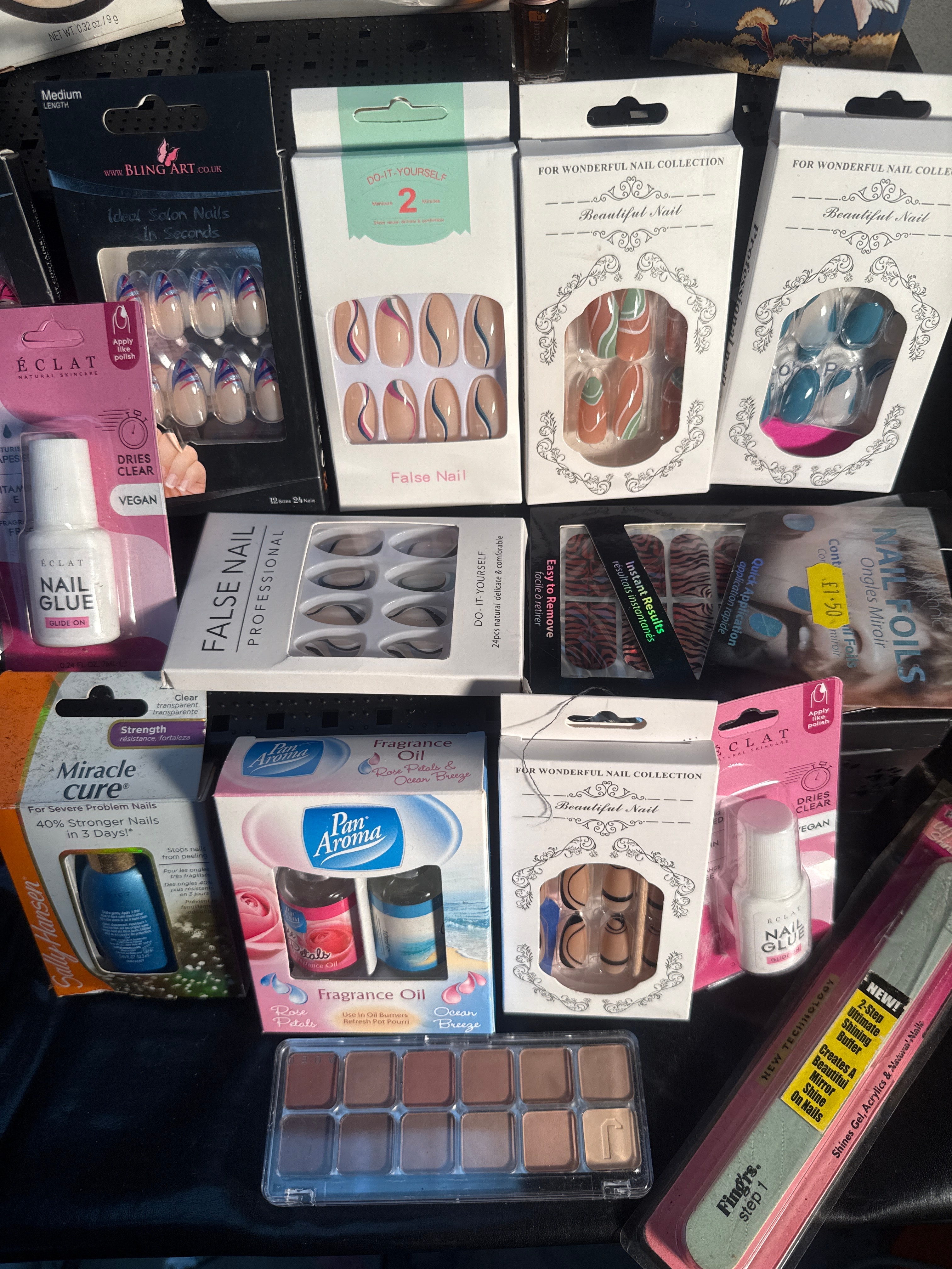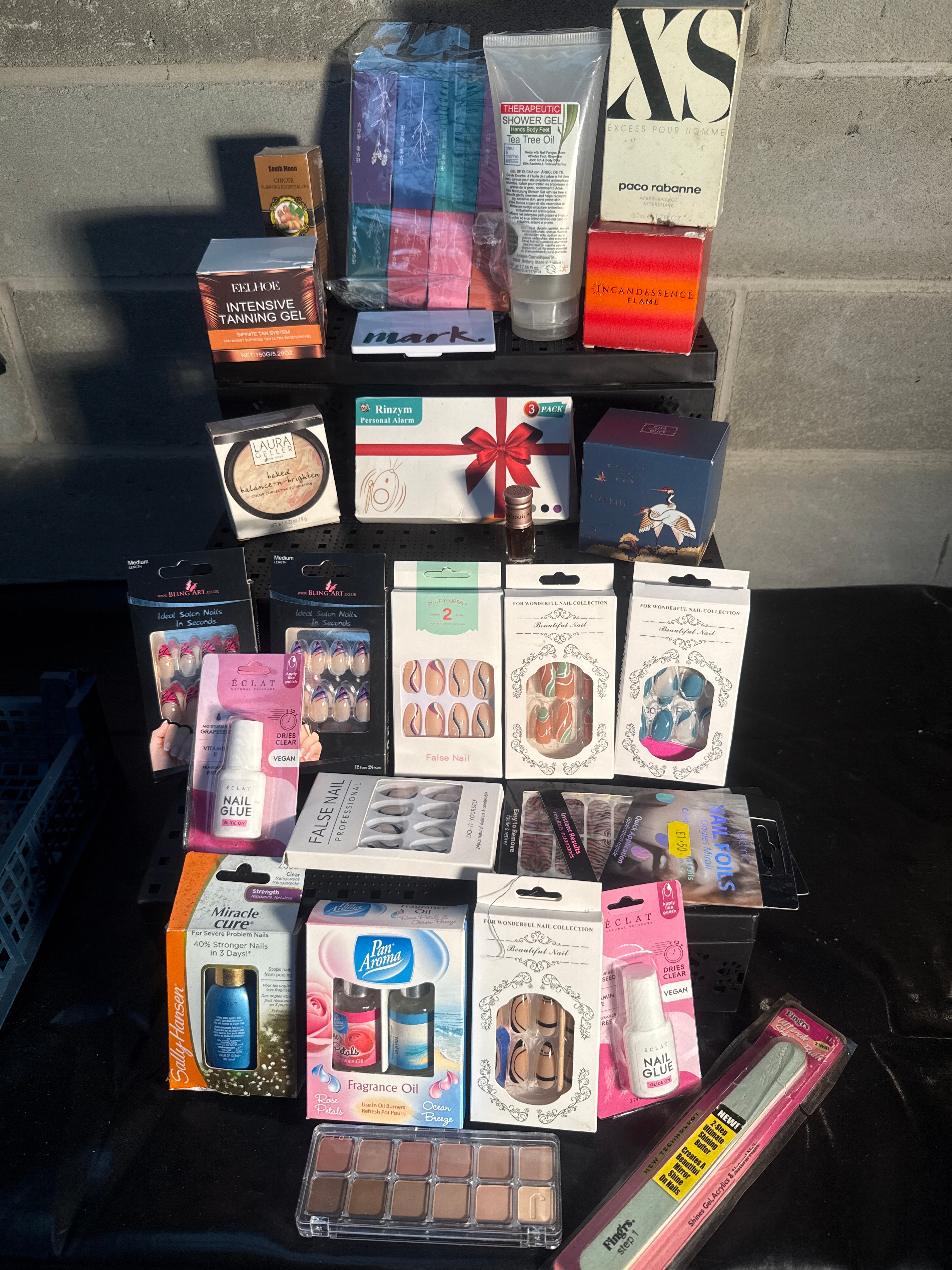 A collection of contemporary, mass-market beauty and personal care products, predominantly new and in their original retail packaging. The lot features various nail care products, including multiple sets of press-on or false nails from brands such as Blingart, Eclat, and “For Wonderful Nail Collection.” These are complemented by nail glues, a “Kiss Miracle Cure For Severe Problem Nails” treatment, and several nail files, including “Flexifit” and “New Techniques” brands. Cosmetics include an eyeshadow palette, “Laura Geller New York Baked ‘N’ Brighten” powder, and “RECHOE INTENSIVE TANNING GEL.” Fragrance and personal hygiene items comprise a “THERAPEUTIC SHOWER GEL Tea Tree Oil,” “Paco Rabanne XS EXCESS POUR HOMME” aftershave, “INCANDESCENCE FLAME” perfume, and “Par Aroma Fragrance Oil.” Further items include “South Moon Slimming Essential Oil,” a “Rinzm Personal Alarm 3 PACK,” and products from the “mark.” and “CATKIN” brands. Some items are explicitly labeled “VEGAN.”