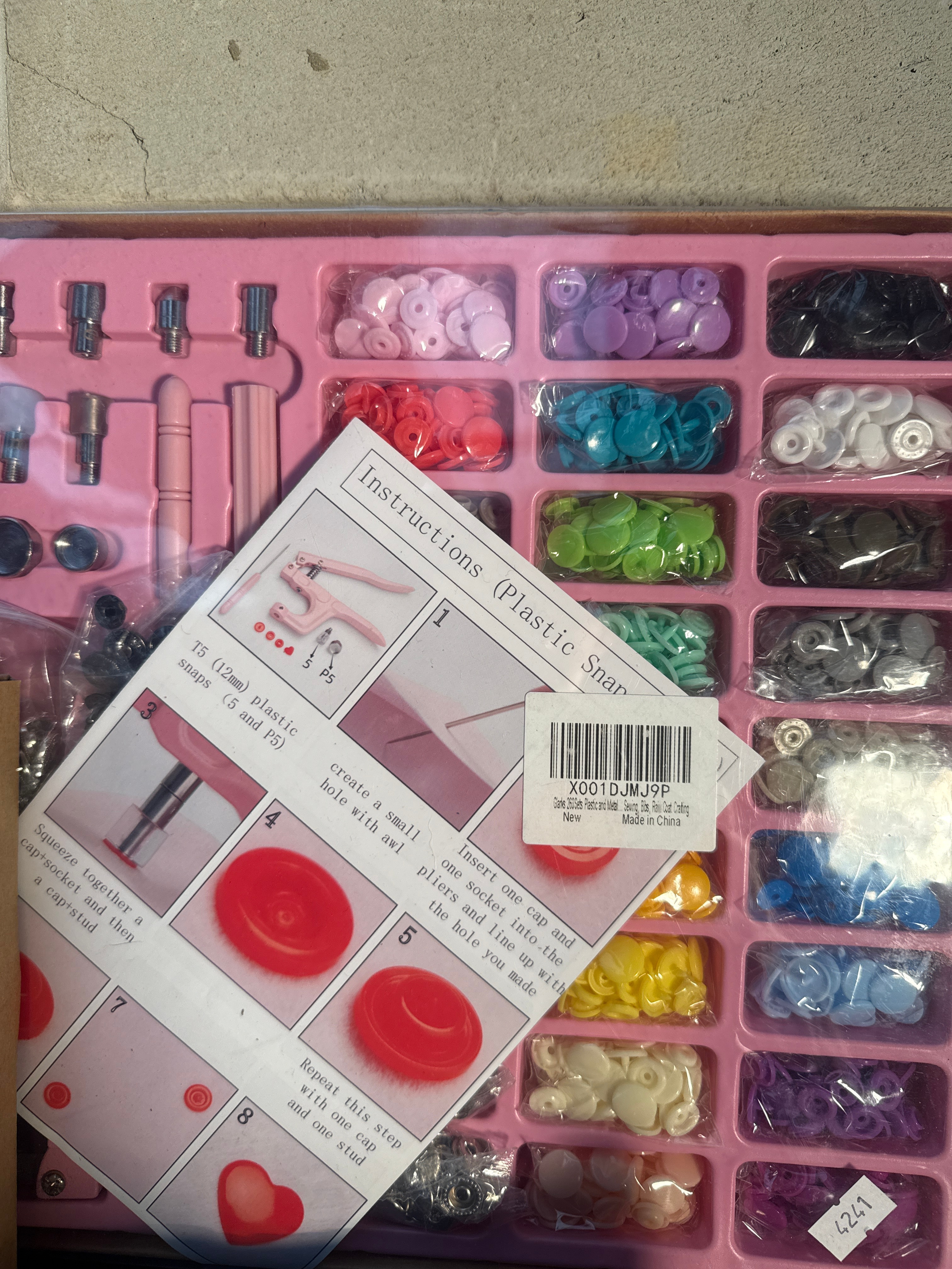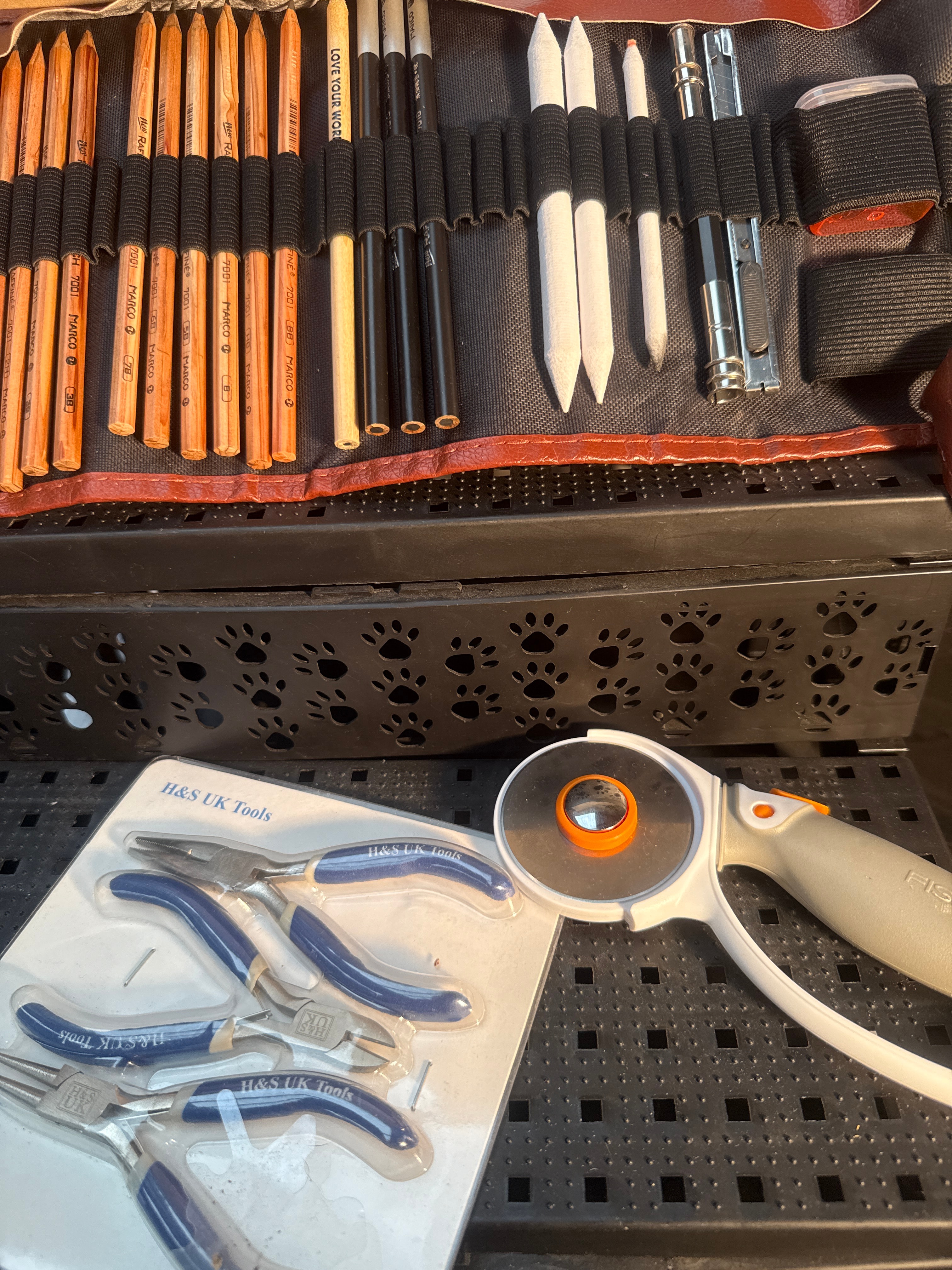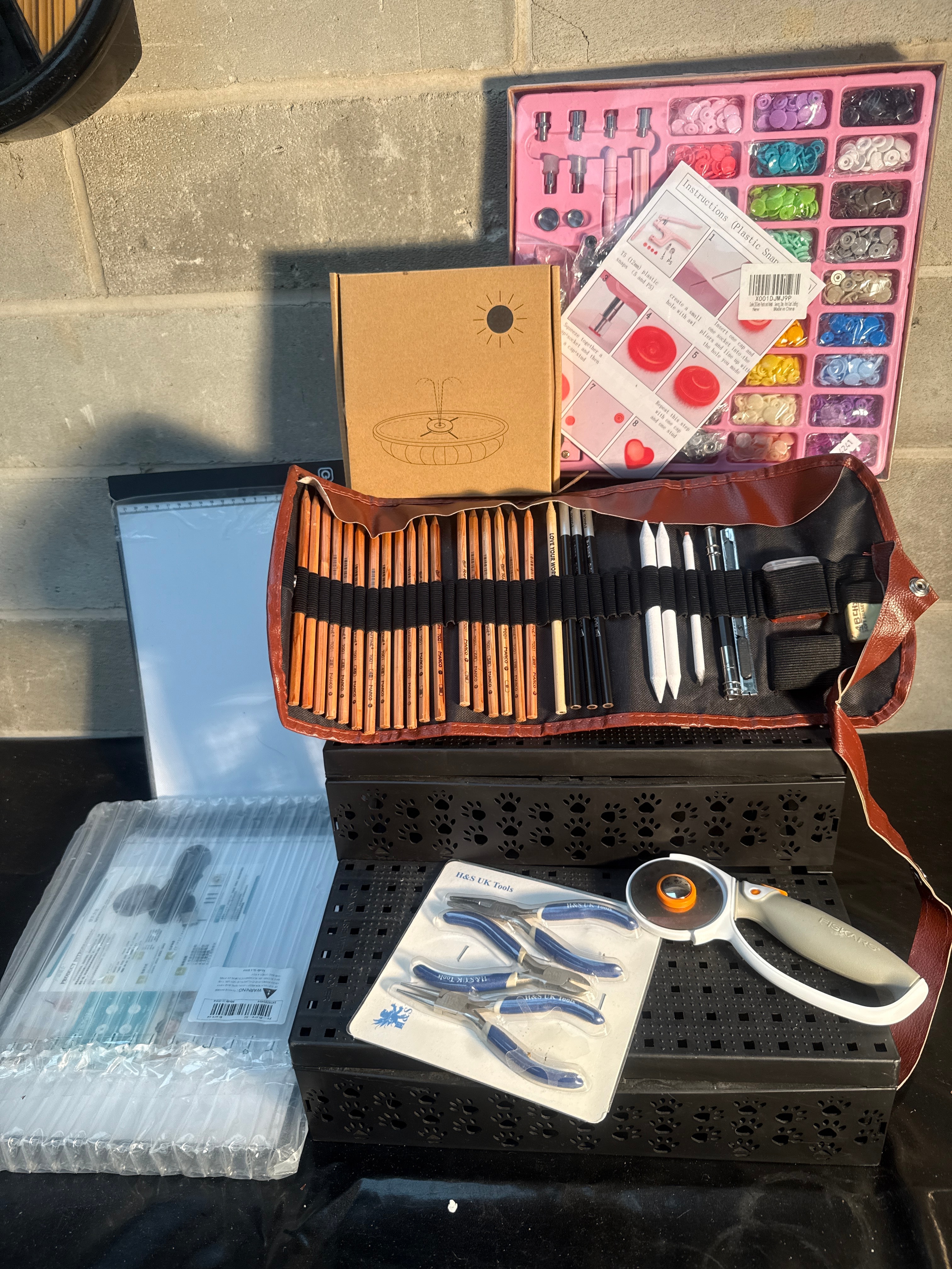 A professional sketching and drawing art set, comprising a brown faux-leather roll-up case filled with ‘LYRA COLOR WOOD’ pencils, blending stumps, and additional drawing implements. Also included is a pink multi-compartment plastic kit containing numerous ‘T5 (12mm) plastic snaps’ in various colors, complete with tools and instructions for a ‘Qing Shun Plastic Snap Fastener Kit’ manufactured in China. The lot further features three stackable black plastic storage bins with paw print perforations, a blister-packed set of ‘H&S UK Tools’ pliers, an ‘OLFA’ brand rotary cutter, a packaged A4 LED light box tracer, and other miscellaneous packaged craft items.