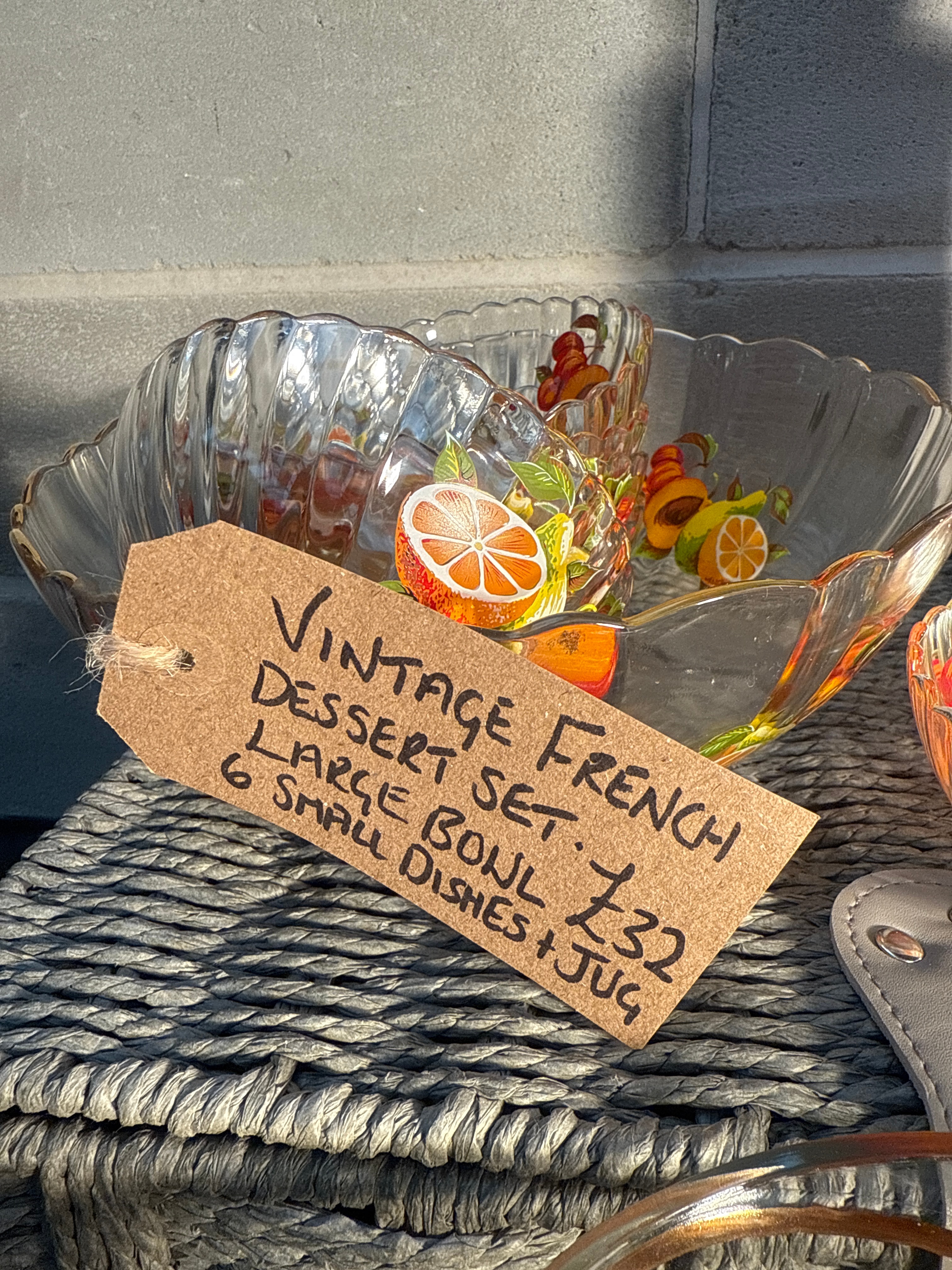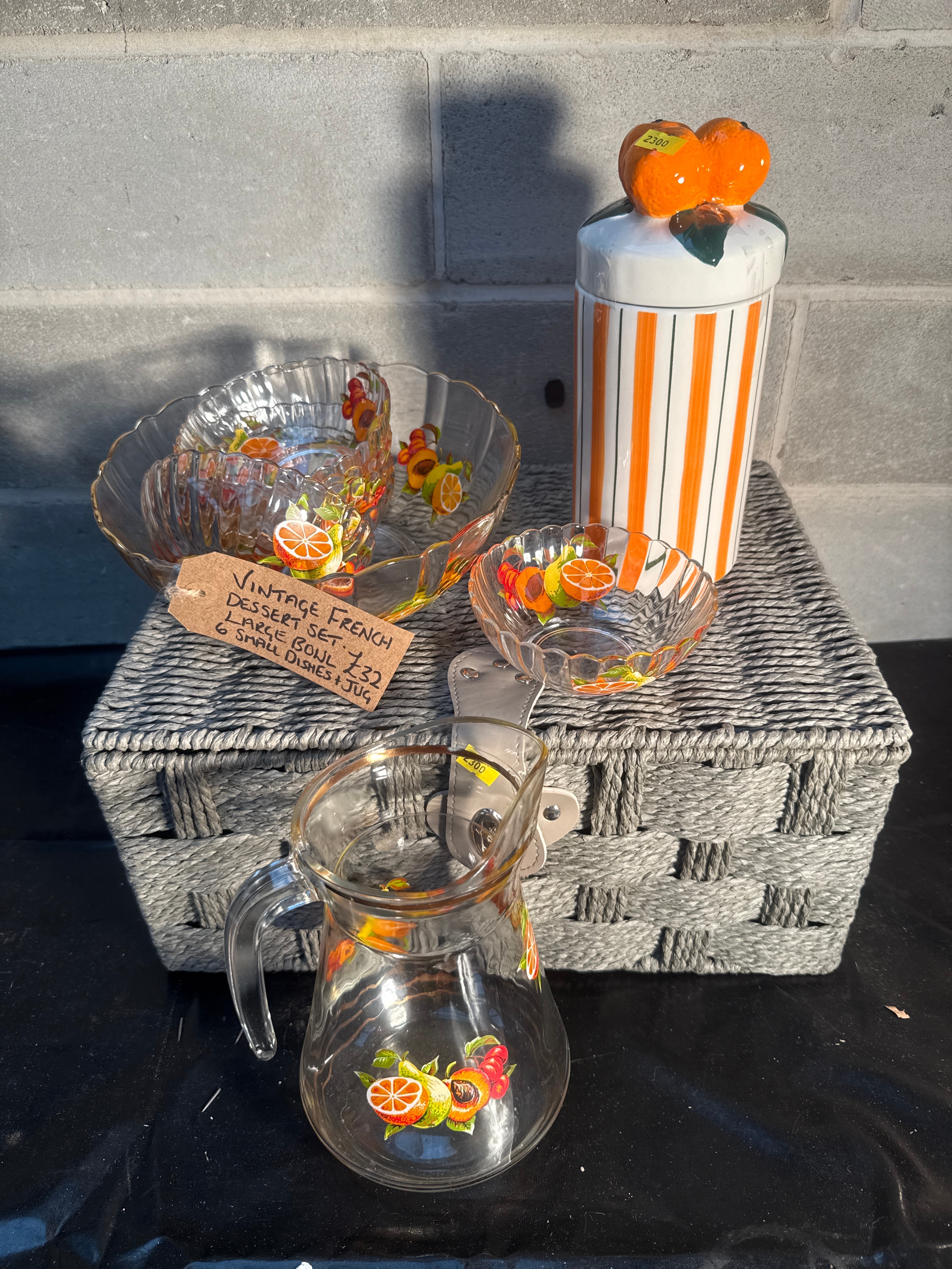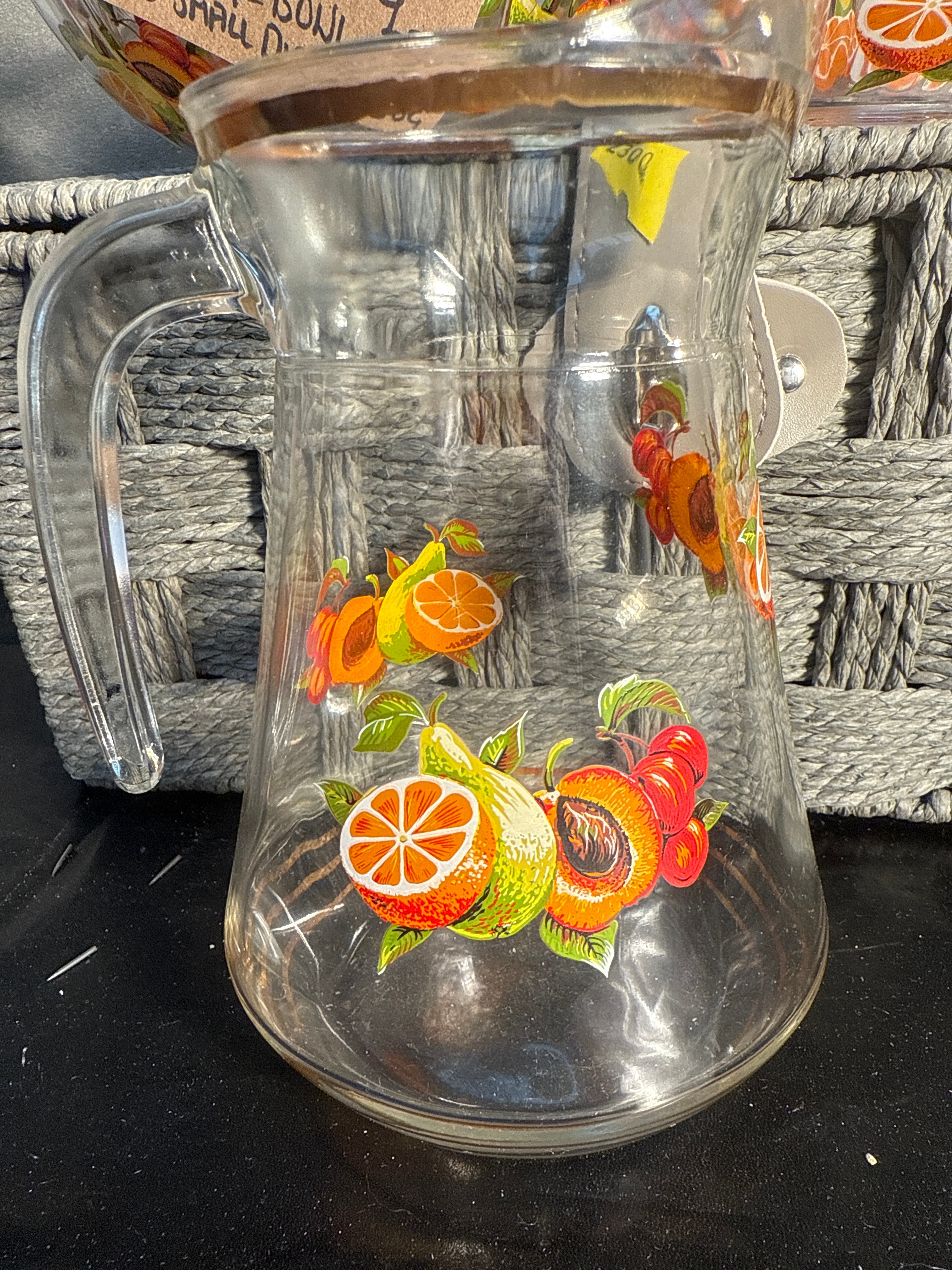A vintage French dessert set comprising one large clear glass bowl, six small matching clear glass dishes, and a clear glass jug. Each piece features a ruffled rim and vibrant screen-printed fruit motifs including oranges, peaches, and lemons.