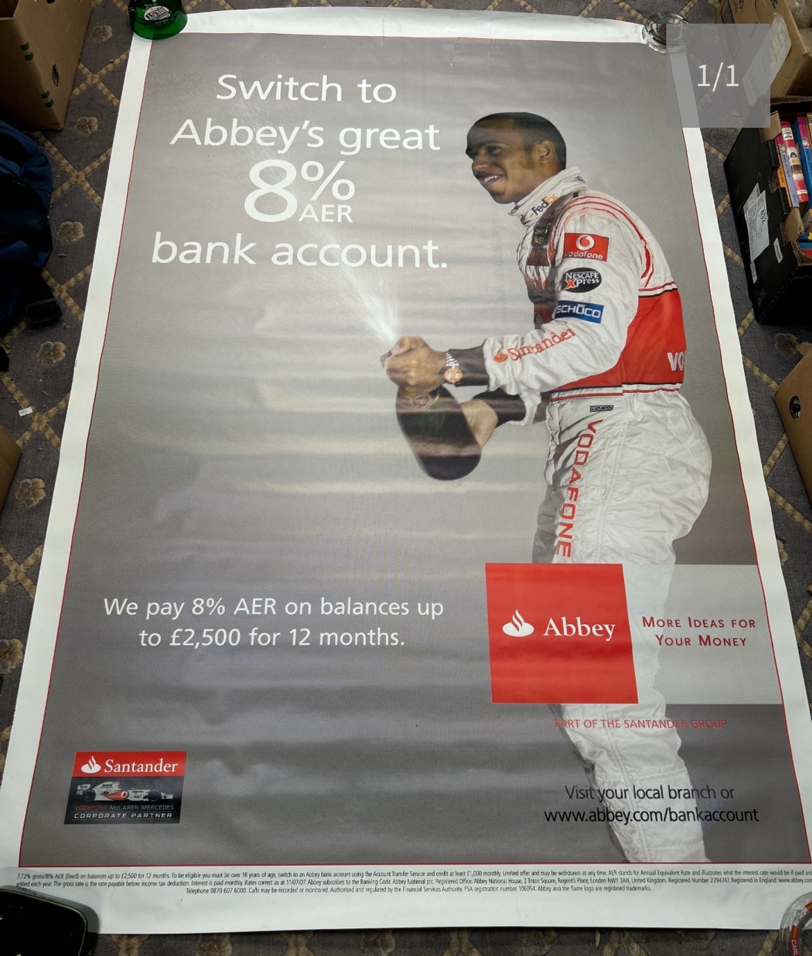 A pair of contemporary promotional banners, likely constructed from flexible vinyl or heavy-duty paper, featuring a striking design transitioning from red to black. The banners prominently display text in white and gold/yellow, reading “GET BEHIND THE WHEEL WITH LEWIS HAMILTON.” Each banner includes an image of the book cover for “LEWIS HAMILTON MY STORY,” featuring a portrait of Lewis Hamilton. Additional text indicates “Out now at WHSmith” and the publisher “HarperCollins.”