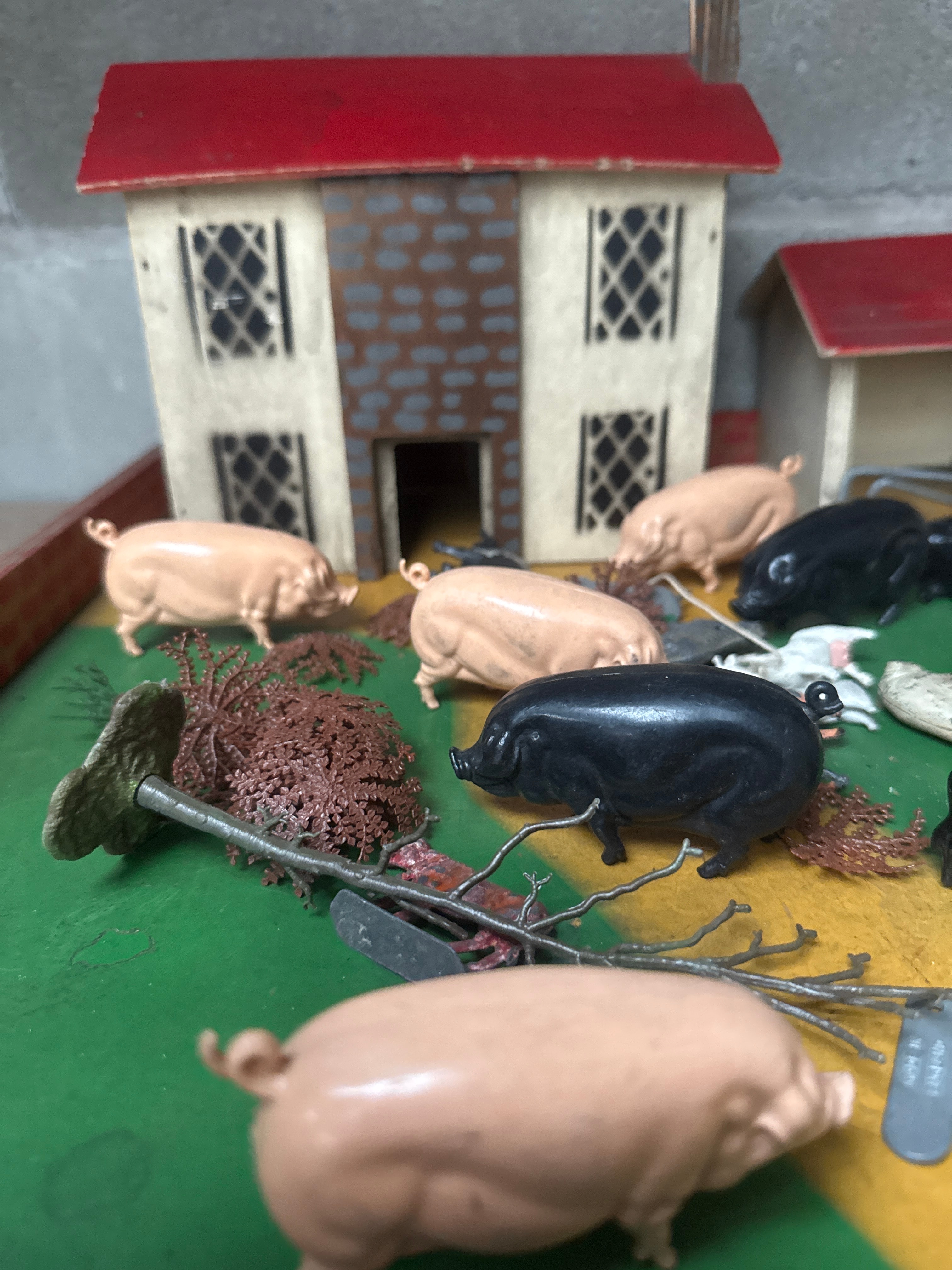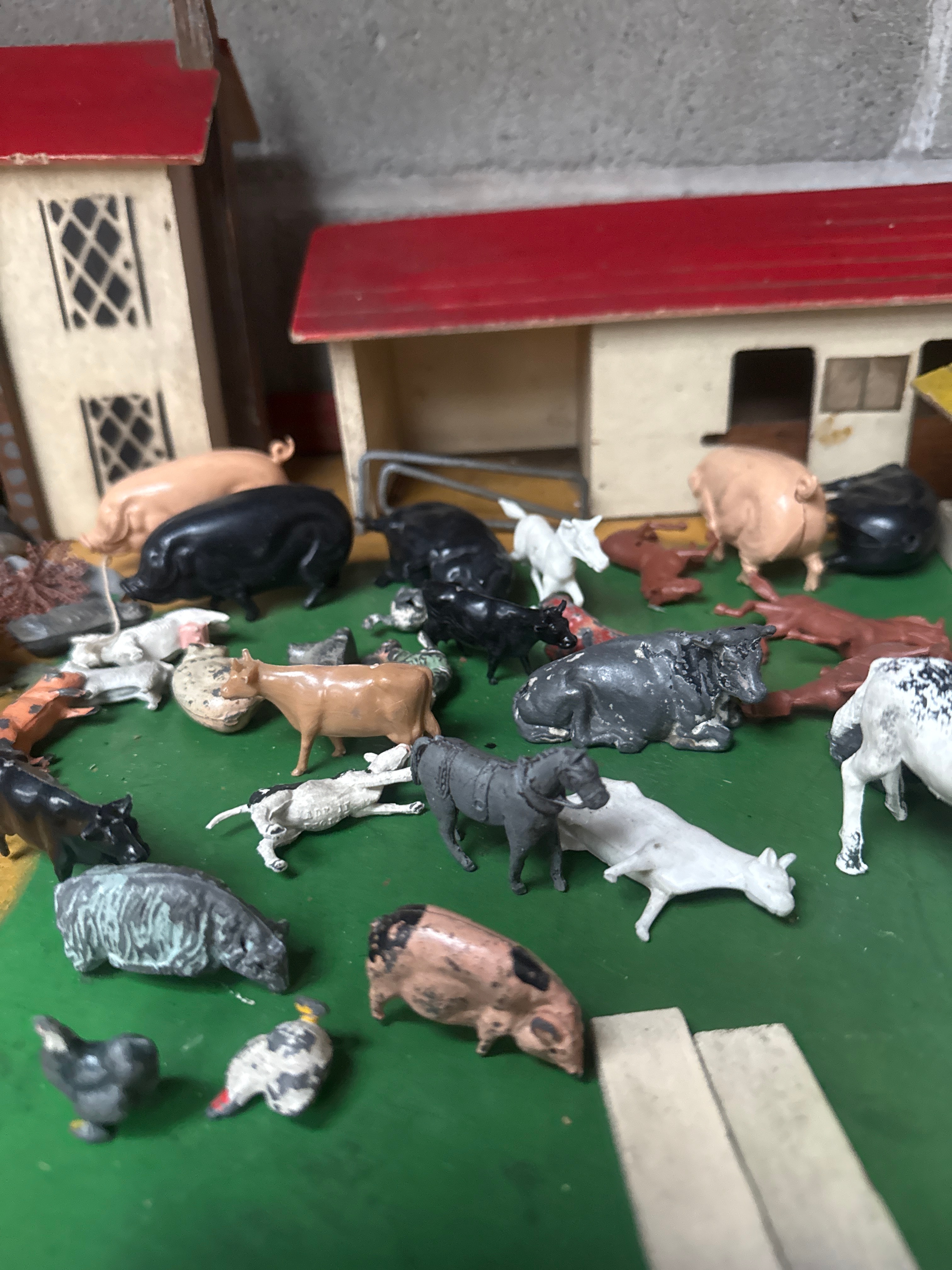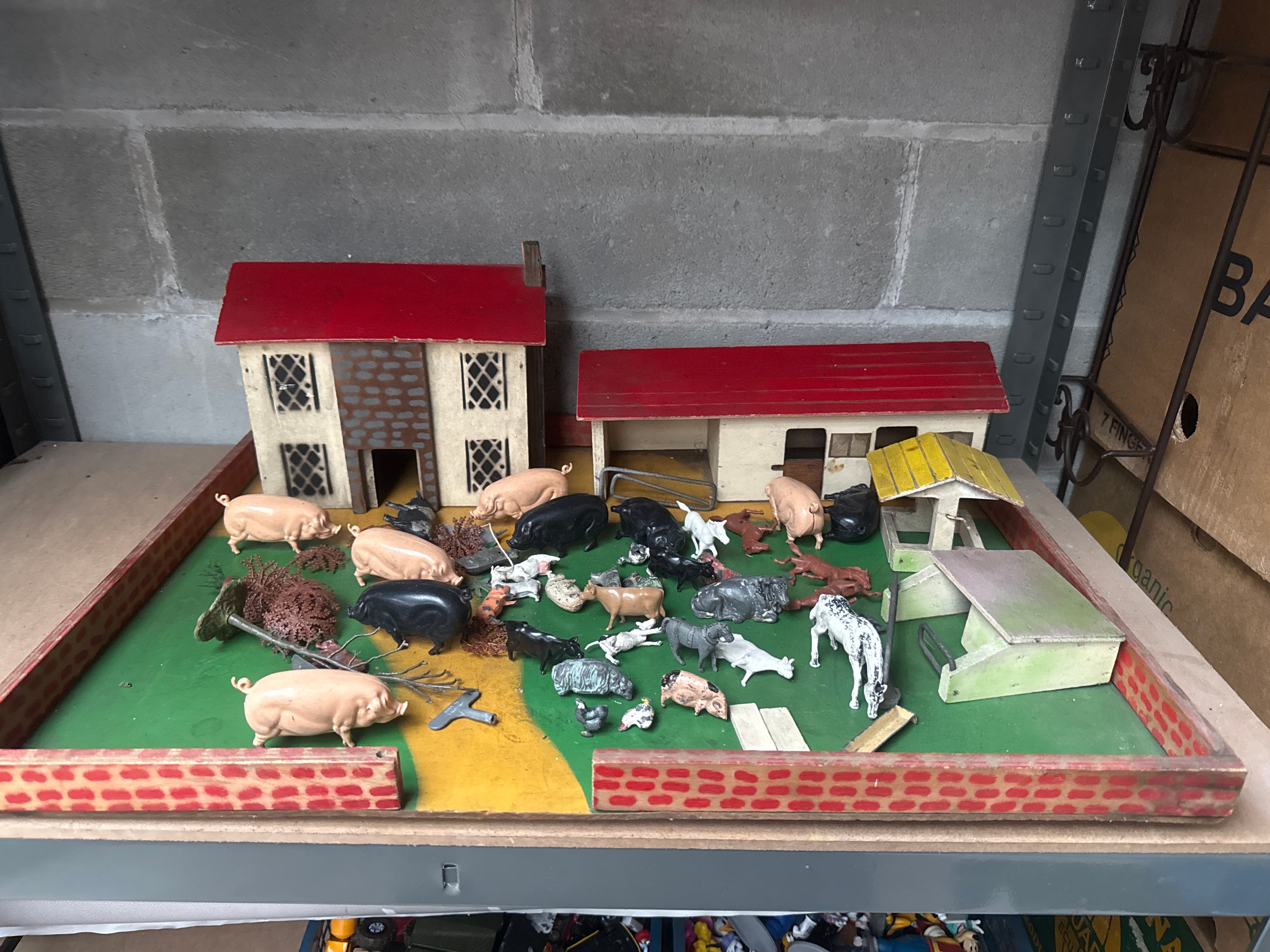 A vintage farm playset, likely dating from the mid-20th century, comprising a rectangular base depicting a green field and a yellow path, enclosed by a red and white striped border. The set includes three main structures: a two-story house, a barn-like building, and a smaller shed, all featuring red roofs and predominantly cream-colored walls, constructed from painted wood or pressed composite material. Populating the farm scene is a collection of miniature animal figures, including pigs, cows, sheep, horses, and various poultry, identified as Britains animals. This collection includes die cast figures alongside those made of molded plastic or composition material. The playset also features plastic trees and farm tools.