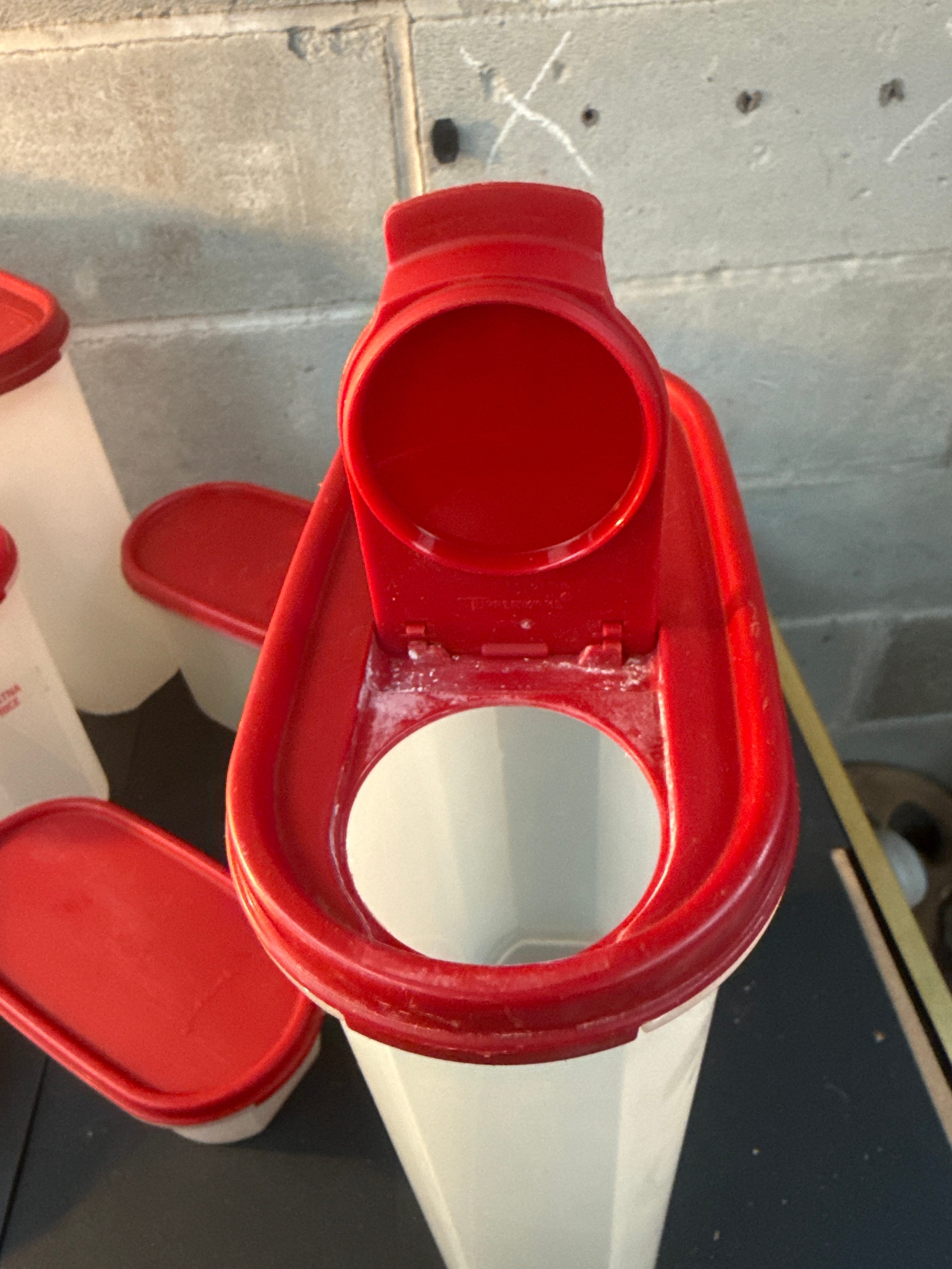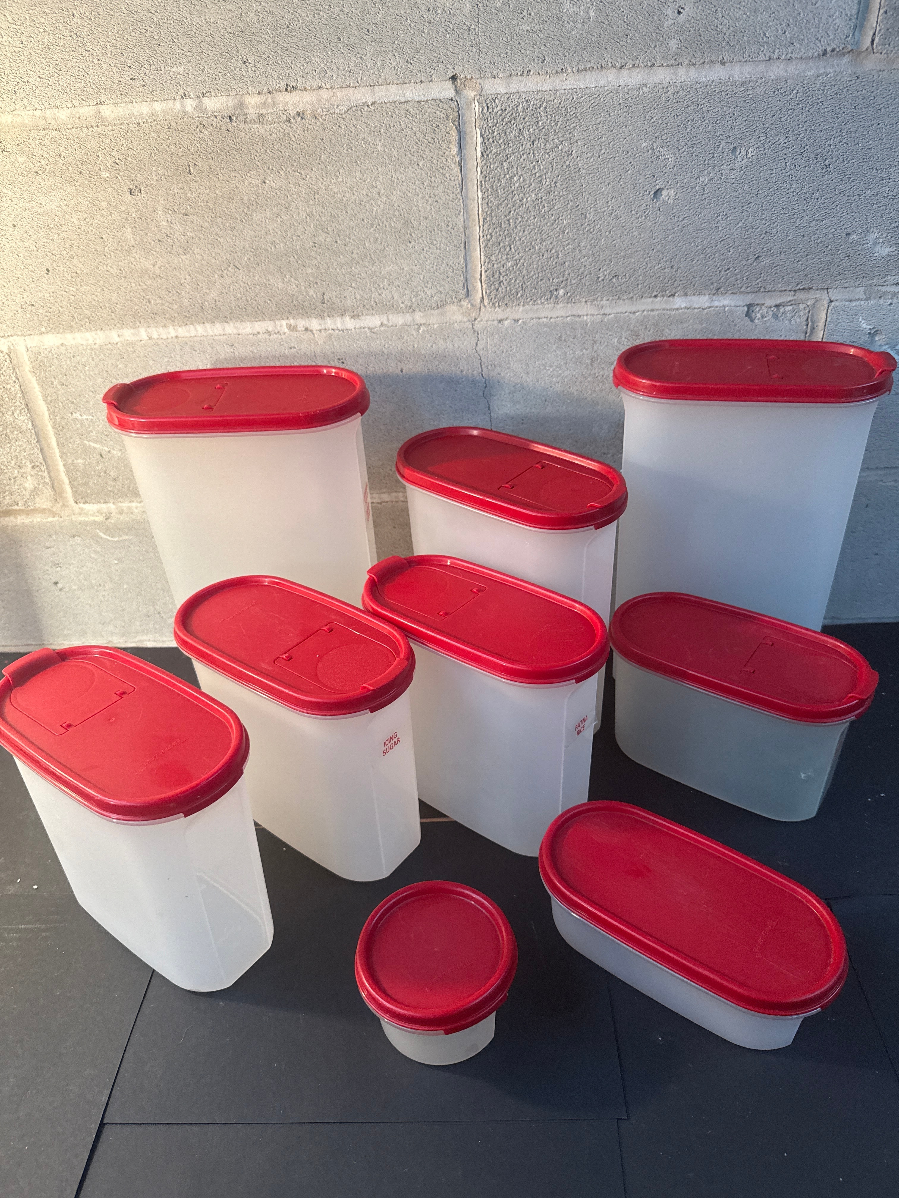 A set of 9 Tupperware Modular Mates Oval storage containers. Each container is constructed from translucent white plastic with a contrasting red plastic lid. The set includes a variety of sizes and shapes, predominantly rectangular or oval with gently tapered bodies, and one smaller cylindrical container. Several lids feature flip-top spouts for pouring. Visible markings include the brand name “TUPPERWARE” embossed on the underside of at least one red lid, and product labels such as “CORN MEAL” and “SUGAR” printed on the sides of some container bodies.