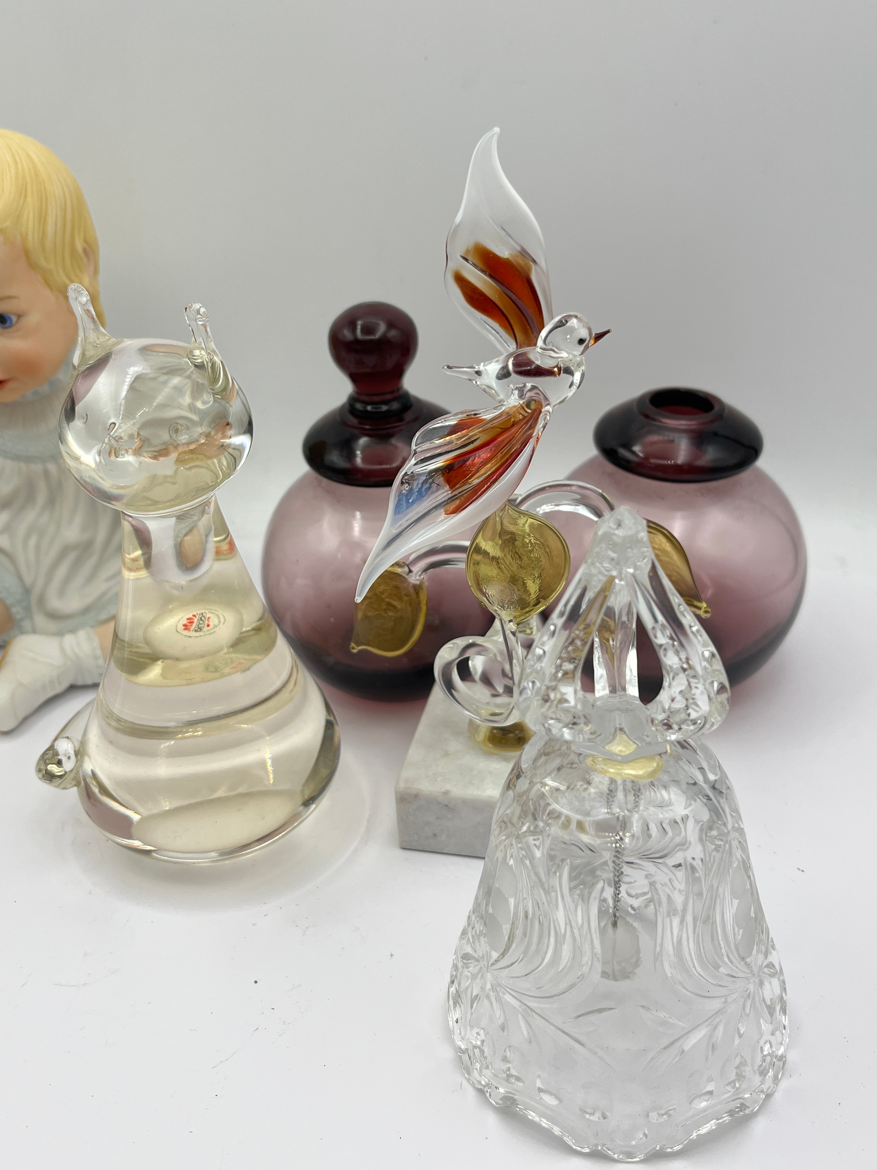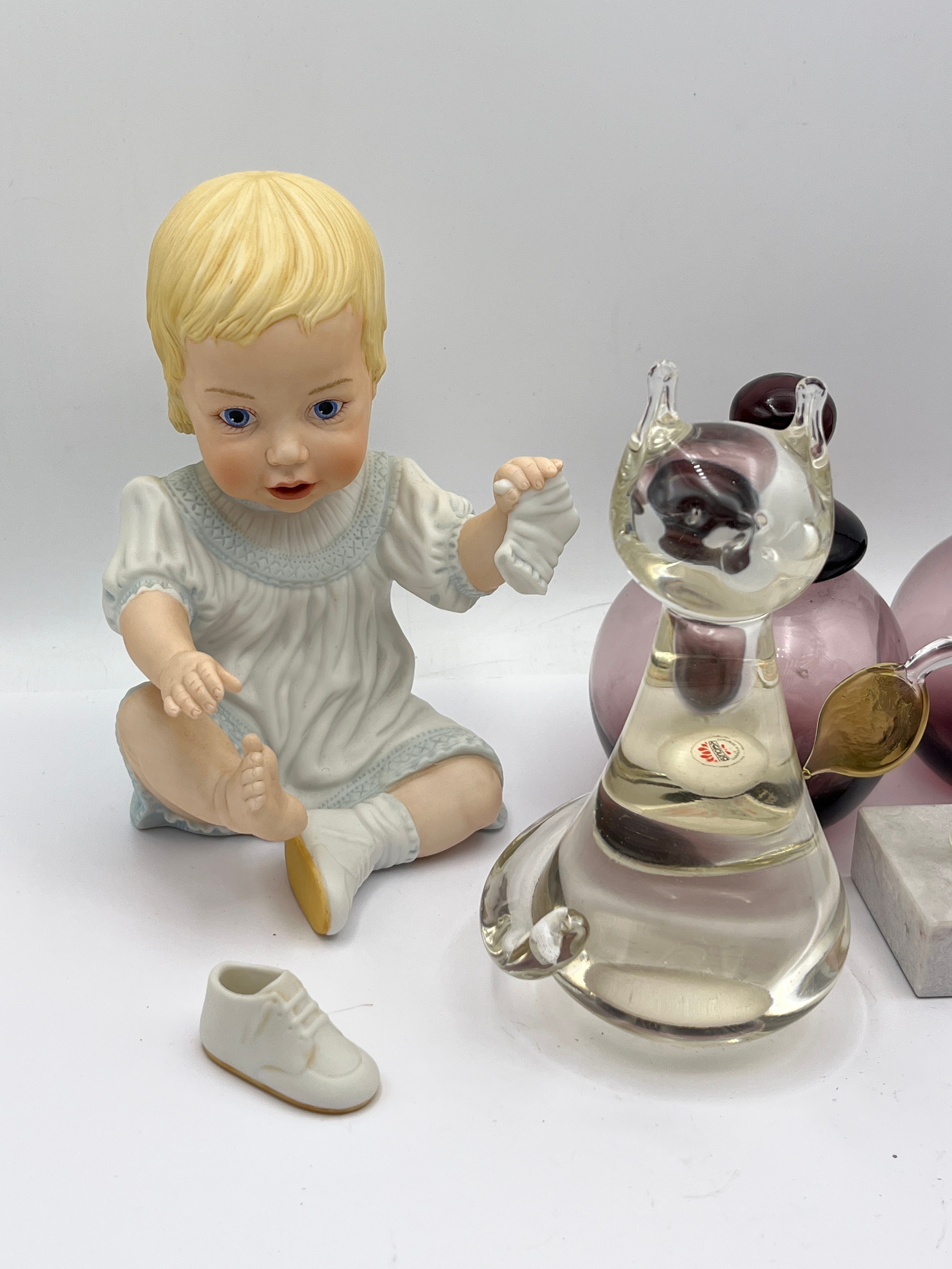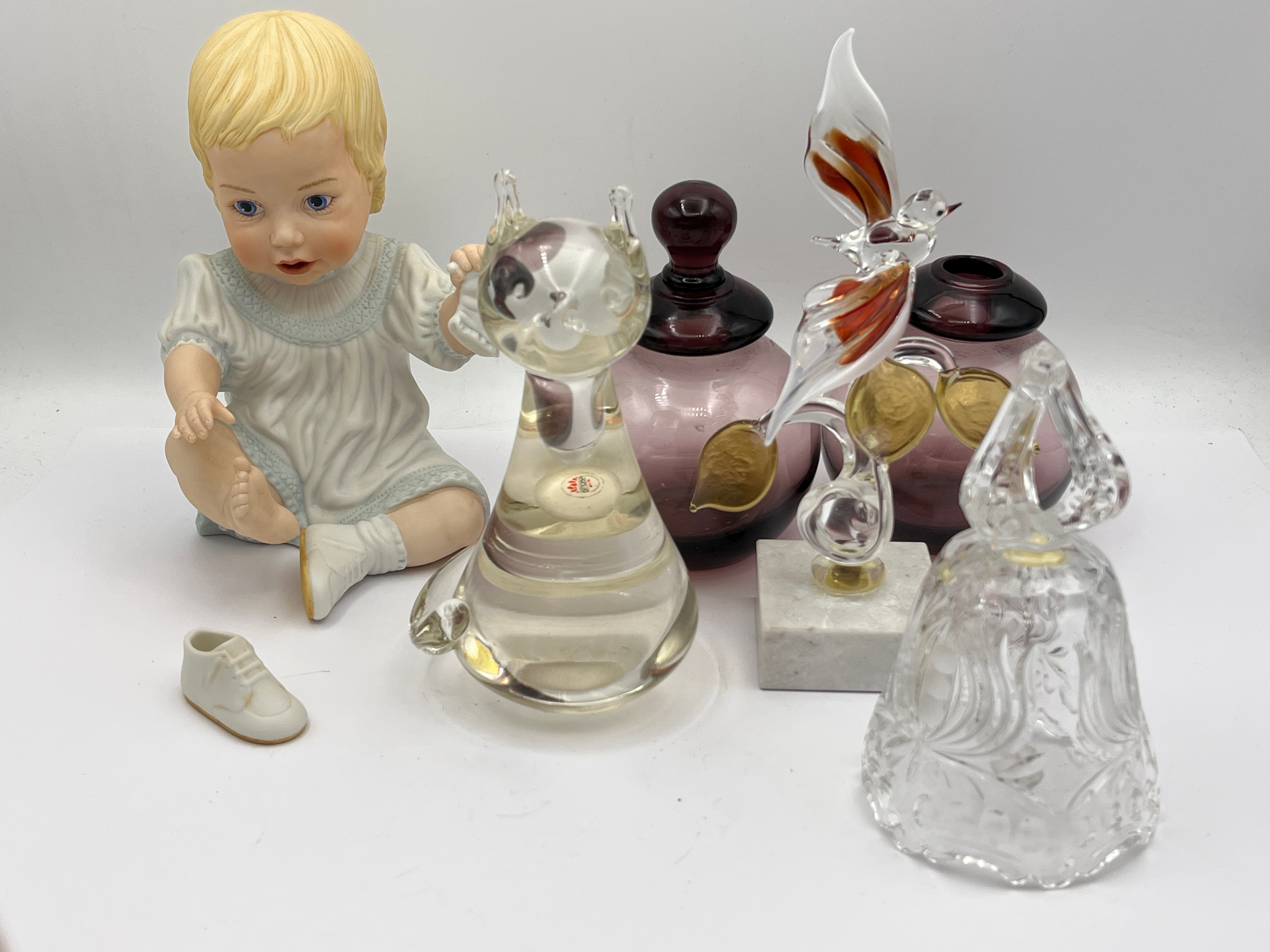 A collection of decorative objects. Comprising a seated porcelain baby figurine from “THE BABY BOOK COLLECTION,” titled “Baby’s First Shoes” and marked “BROOK & BENTLEY FINE PORCELAIN,” accompanied by a miniature porcelain shoe. Also included is a clear glass stylized cat, containing liquid, featuring a “KELONIA HAND MADE IN CANADA” sticker. Further items include two lidded translucent purple glass jars; a clear glass bird figurine with red and orange accents, mounted on a gold-tone metal stem and a white marble base; and a clear pressed glass bell adorned with a floral motif and a small gold-tone clapper.