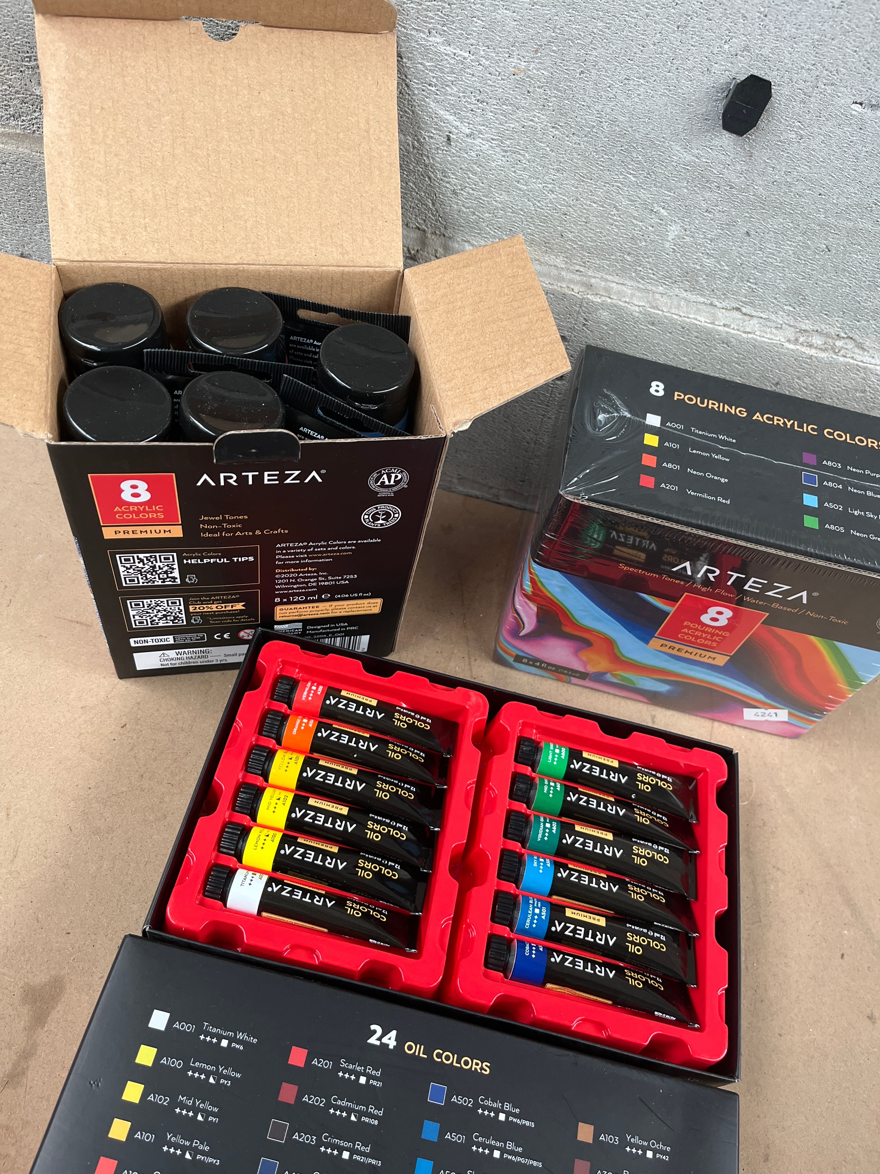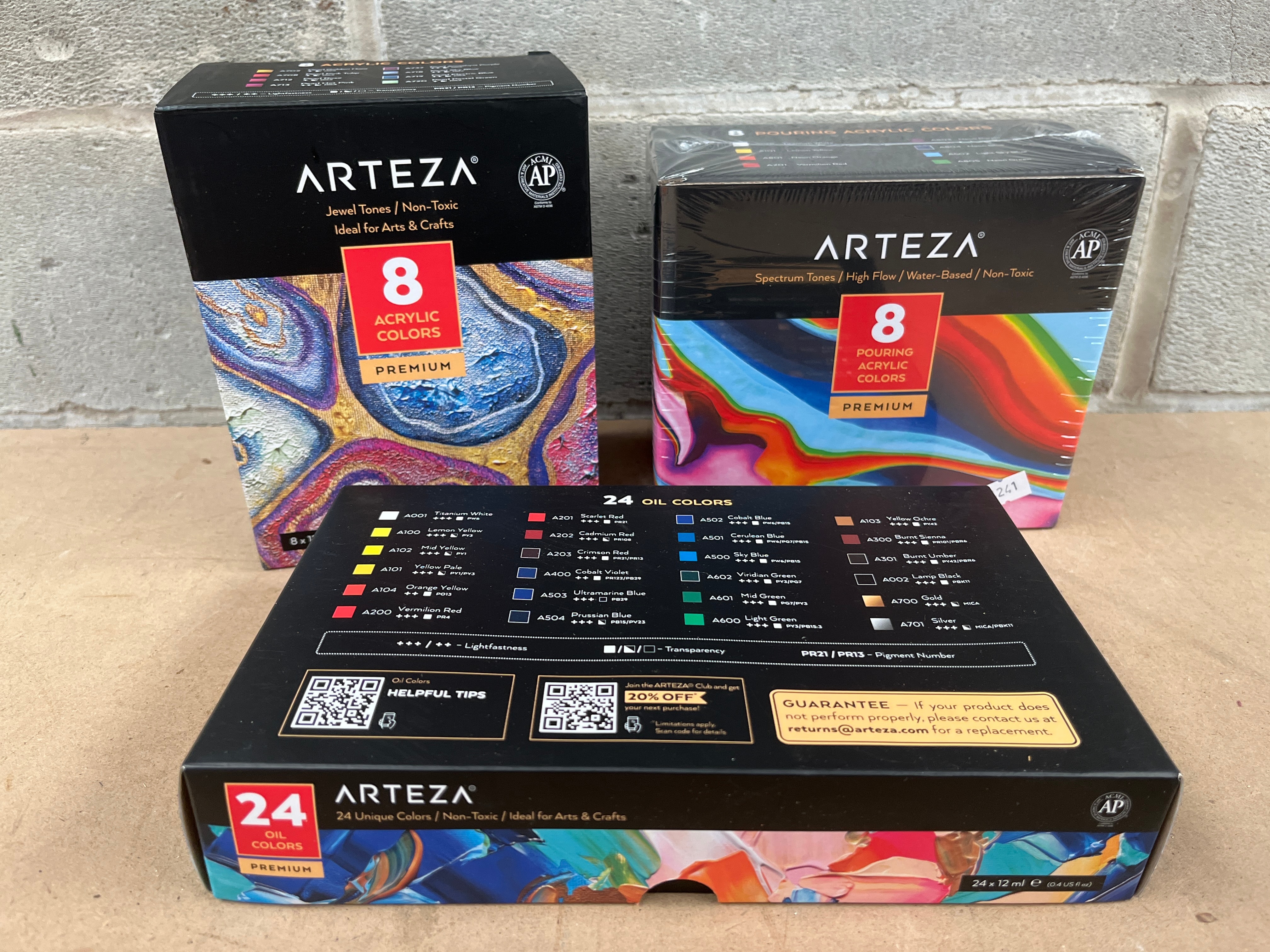 A group of Three retail packages of ARTEZA brand art supplies. The lot includes two sealed, boxed 8-count “PREMIUM” acrylic paint sets, one labeled “Jewel Tones” and the other “Pouring Acrylic Colors” (Spectrum Tones, High Flow, Water-Based). Also included is a third 8-count acrylic paint set, designated “PREMIUM” and “Non-Toxic,” presented open in its cardboard box, revealing individual black plastic jars. The final item is an open 24-count box of “PREMIUM” oil paints, also “Non-Toxic,” featuring 12 ml tubes organized in plastic trays. Visible markings across all items include the “ARTEZA” brand name, the “AP” seal, “Non-Toxic” designation, various product details such as color names (e.g., Titanium White, Lemon Yellow, Scarlet Red), lightfastness and transparency ratings, helpful tips, and guarantee information.