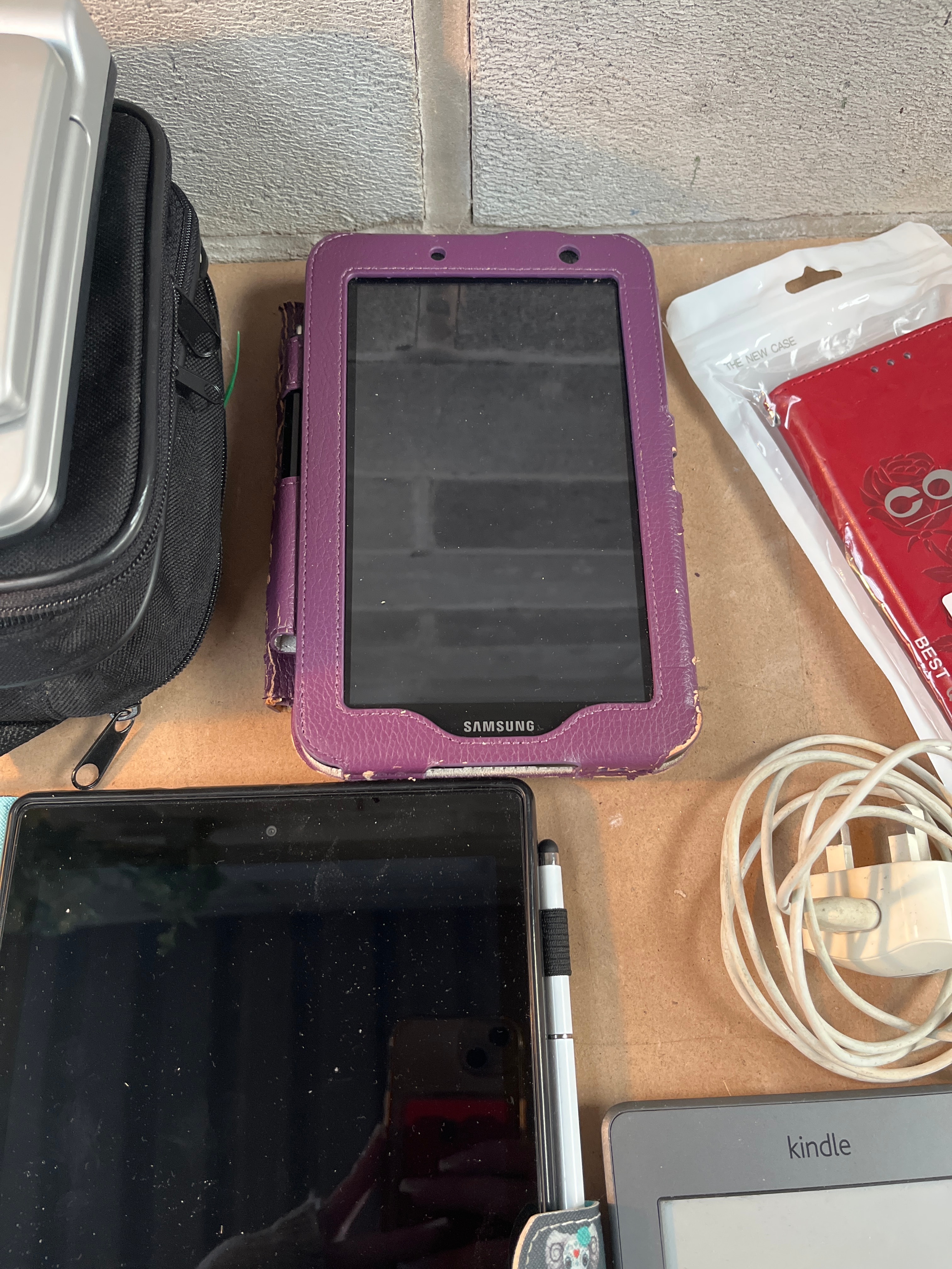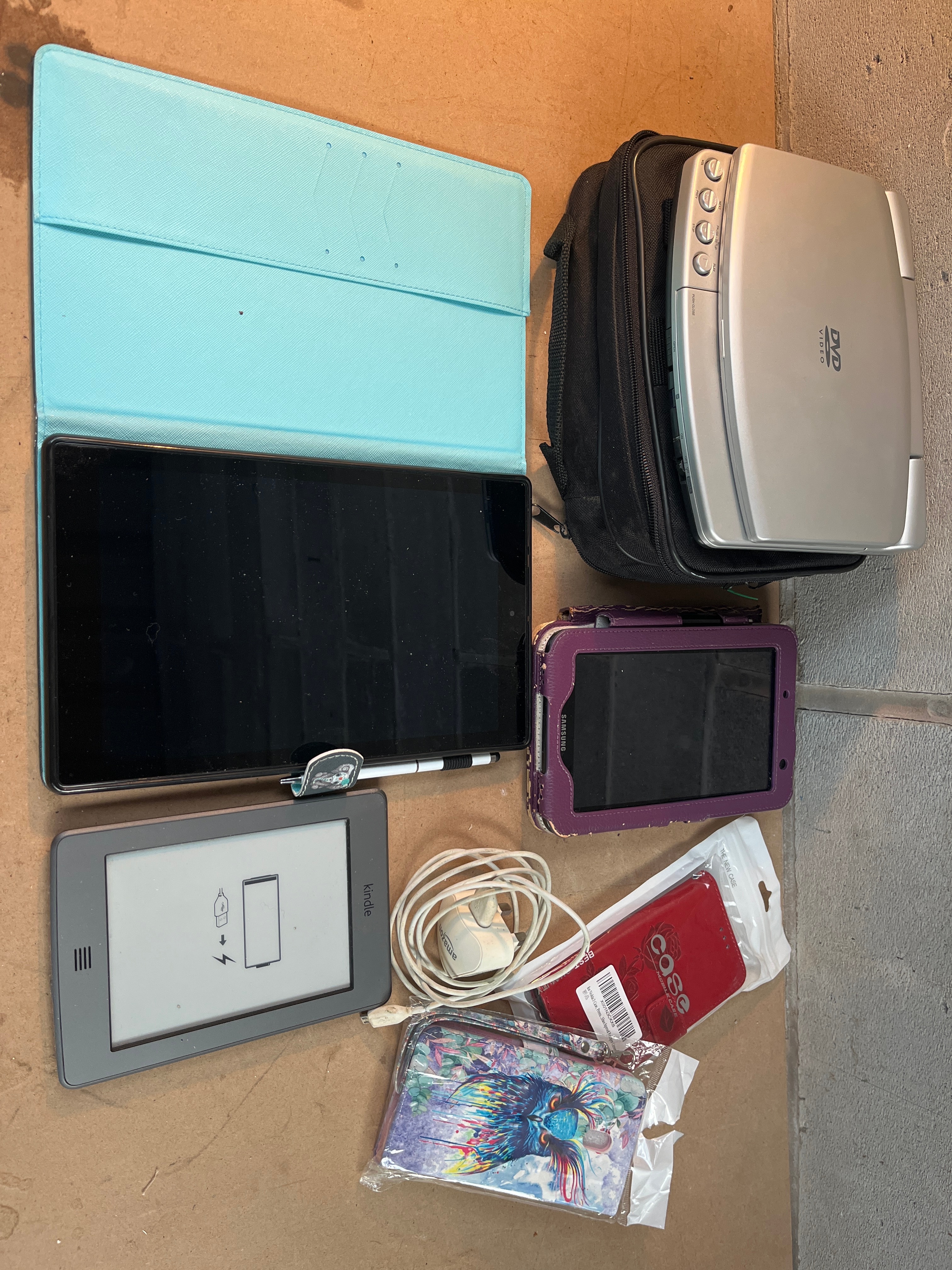 A collection of modern consumer electronics and accessories. The lot includes a silver portable DVD player housed in a black zippered soft case, a large black tablet secured within an open light blue folio case with an attached stylus, and a smaller dark-screened tablet encased in a worn purple protective cover bearing the ‘SAMSUNG’ logo. Also present is a grey ‘kindle’ e-reader. Accessories comprise a white coiled charging cable with a white UK/Type G plug wall adapter, white wired earbuds, a new red protective ‘CASE’ in clear plastic packaging, and a separate new patterned pouch, also in clear packaging.