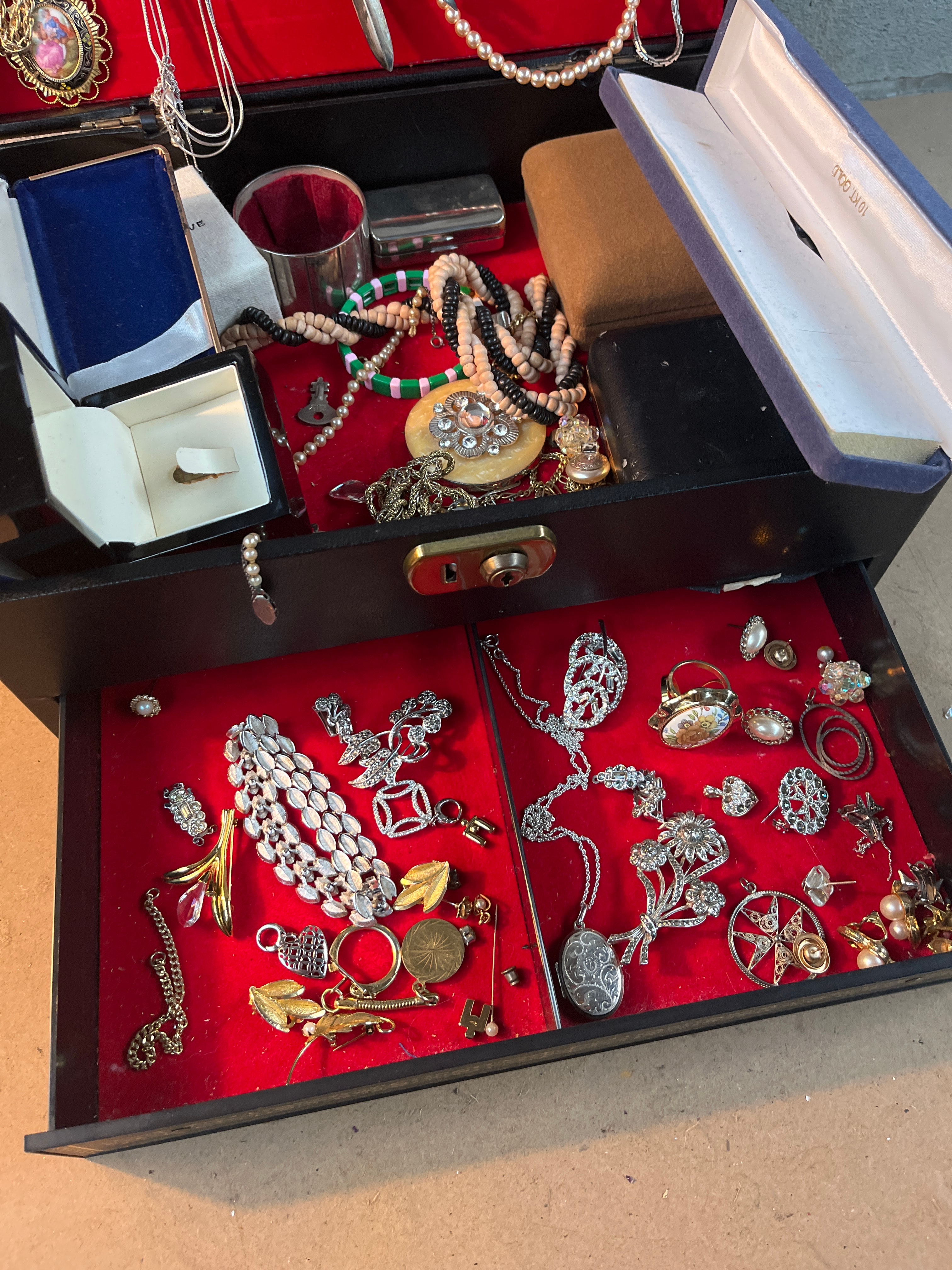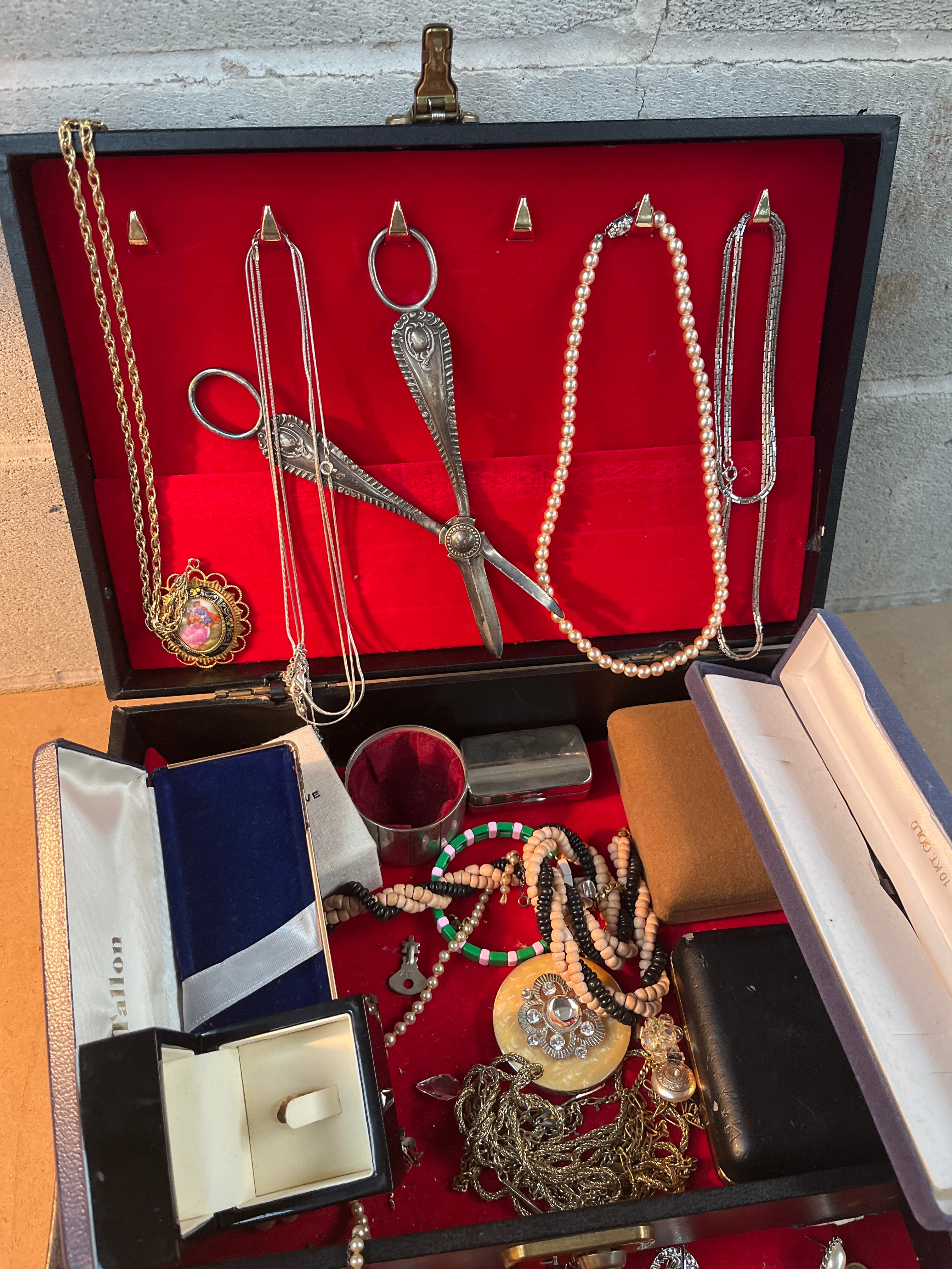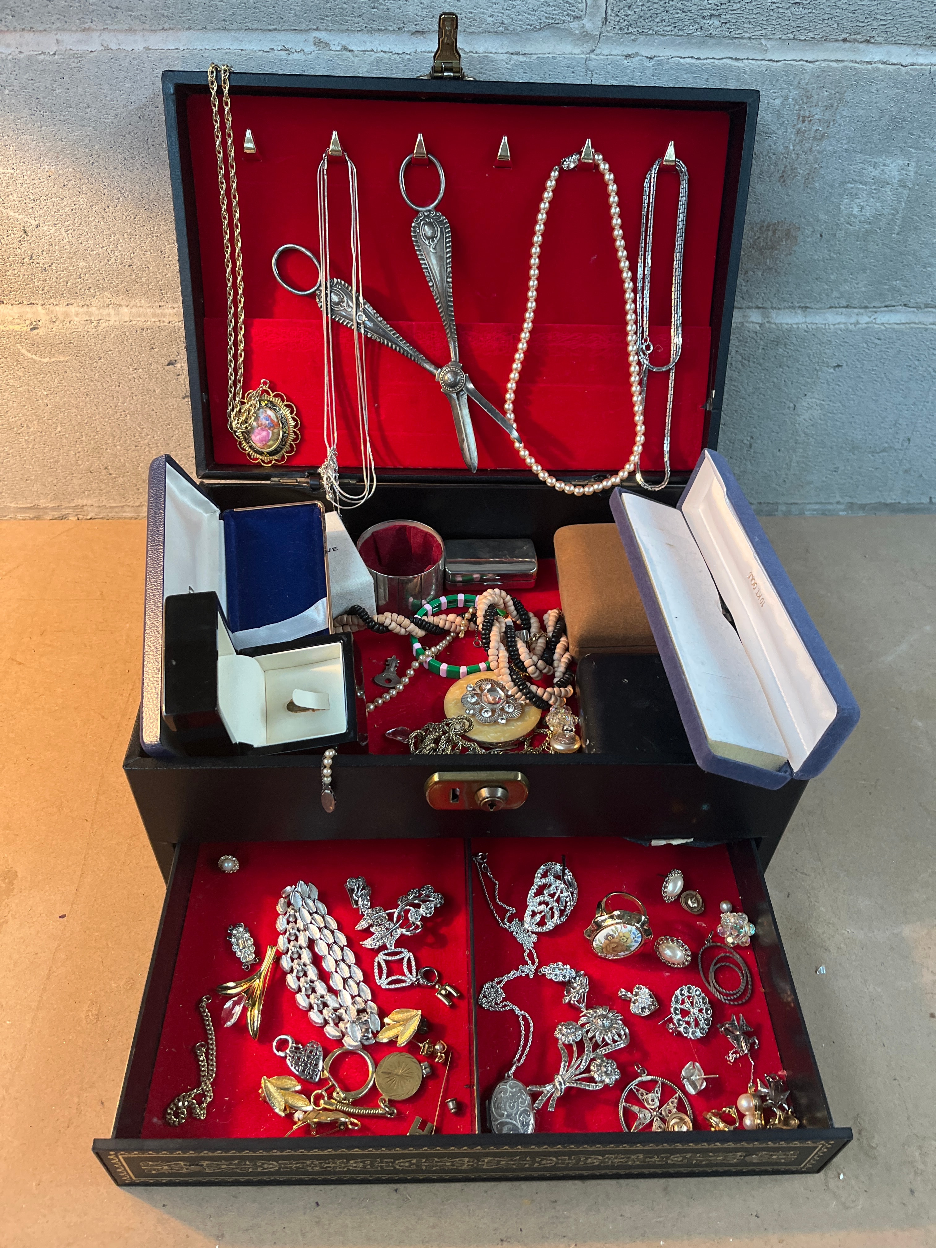 A two-tiered jewelry box, likely wood with a black lacquered finish and brass-tone hardware, opening to reveal a red velvet interior. The lid of the top compartment displays several necklaces, including silver-tone chains, a multi-strand faux pearl necklace, and a gold-tone chain with a locket-style pendant, alongside a pair of decorative metal scissors. The main tray of this compartment holds a mixed assortment of costume jewelry, featuring beaded necklaces, pendants, and rings. Also present are several empty or partially filled jewelry boxes, including one blue velvet box, another white and blue box marked “Dalton,”. The lower pull-out drawer is densely packed with a varied collection of costume jewelry, comprising numerous rings, brooches, earrings, and bracelets, predominantly in silver-tone and gold-tone metals, some adorned with faux pearls, rhinestones, or colored glass stones.