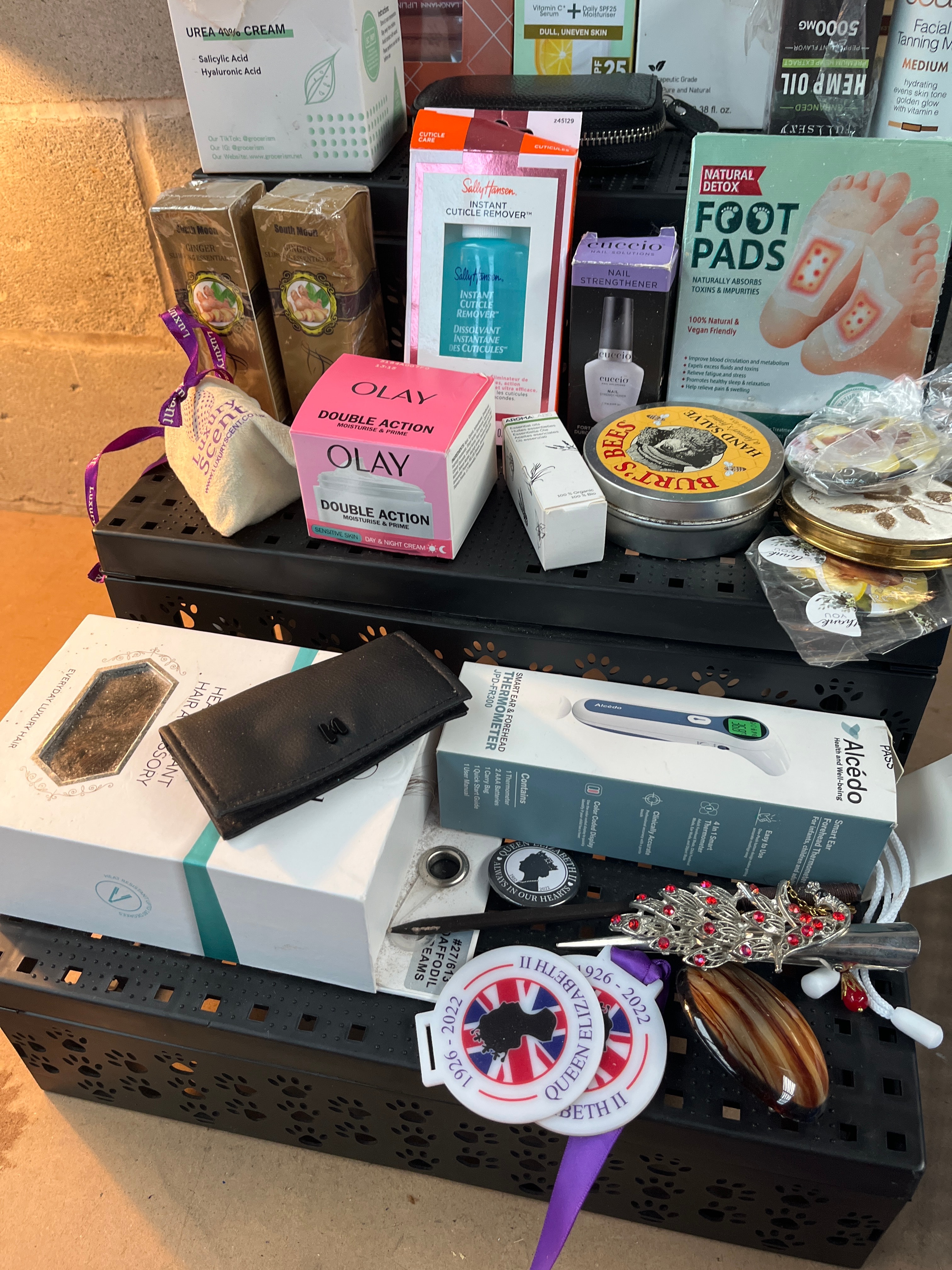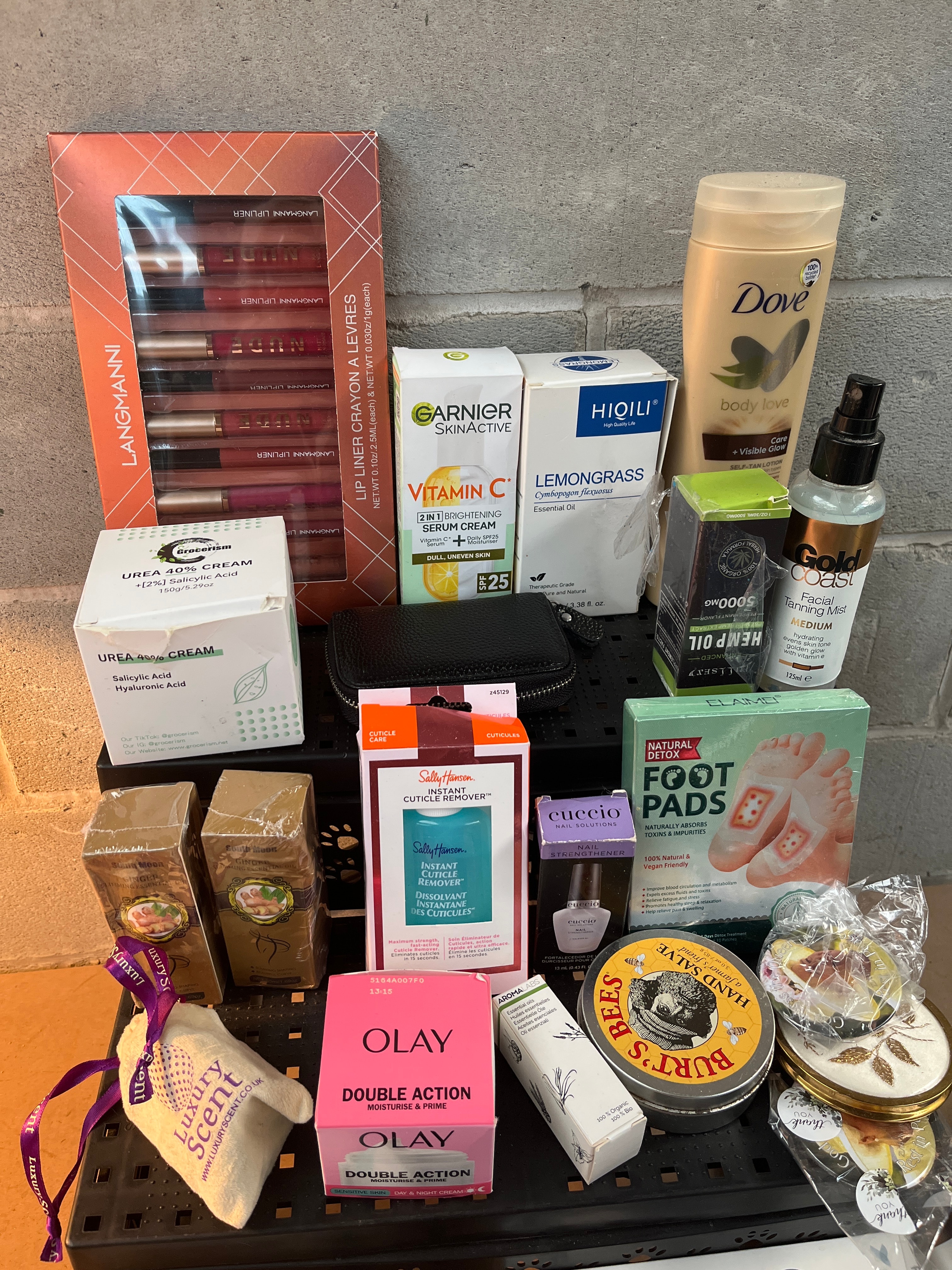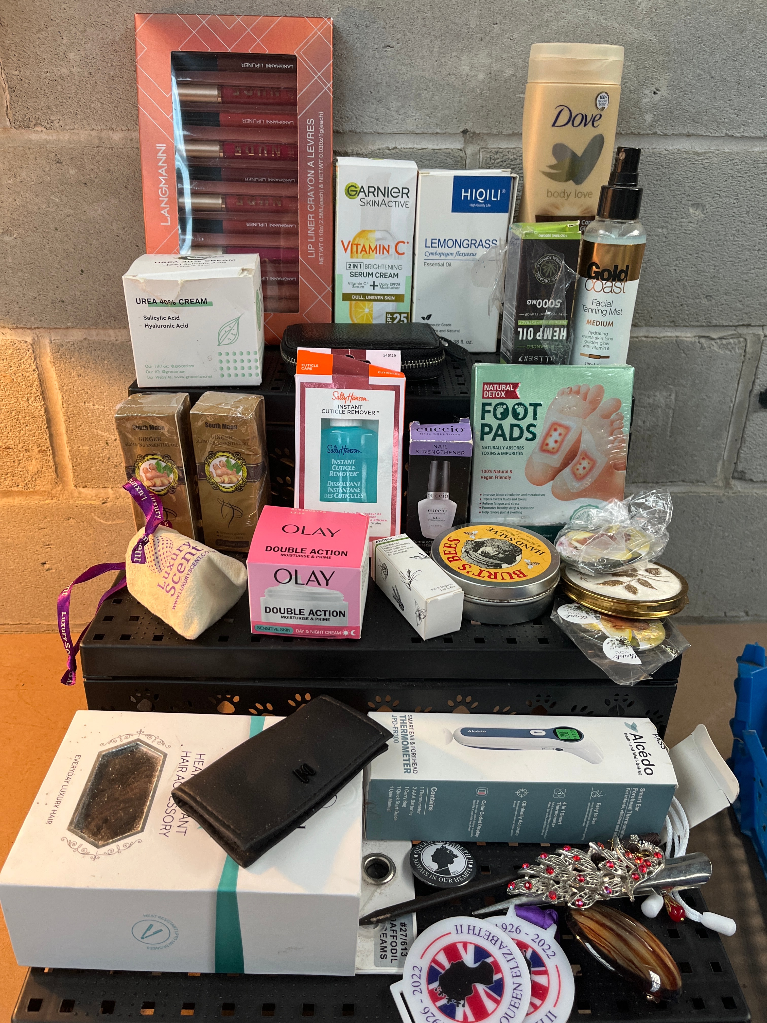 A diverse collection of new, packaged retail merchandise, predominantly comprising health, beauty, and personal care products. The lot includes various cosmetics such as Langmanni lip liner crayons, Garnier SkinActive Vitamin C serum, Olay Double Action Day & Night cream, Cuccio nail strengthener, Sally Hansen Instant Cuticle Remover, and Gold Coast facial tanning mist. Also present are an unlabeled “Heil Oil,” Dove body lotion, Dermaccor Urea 40% cream, Hiolii lemongrass essential oil, Burt’s Bees hand salve, and Natural Detox foot pads. Complementing these are several small brown boxes possibly containing luxury soaps, a “Luxury Scent” sachet, a “Luxury Body Wash” box, and two black wallets/pouches. Miscellaneous items include an Alcedo non-contact thermometer in its original box, various small decorative items (some round with floral motifs), a rhinestone-studded brooch, and a commemorative token for “QUEEN ELIZABETH II” marked “1926-2022.”
