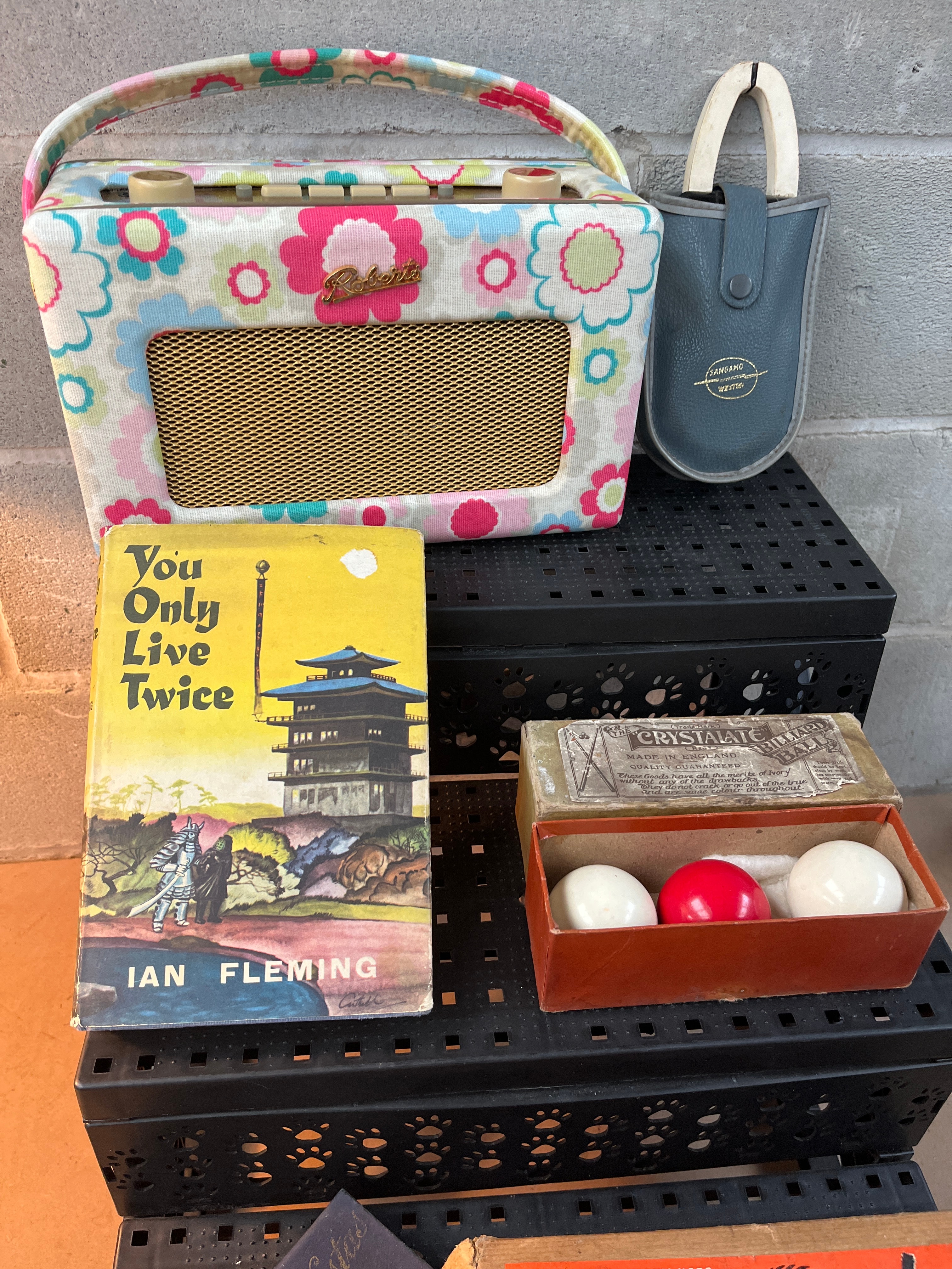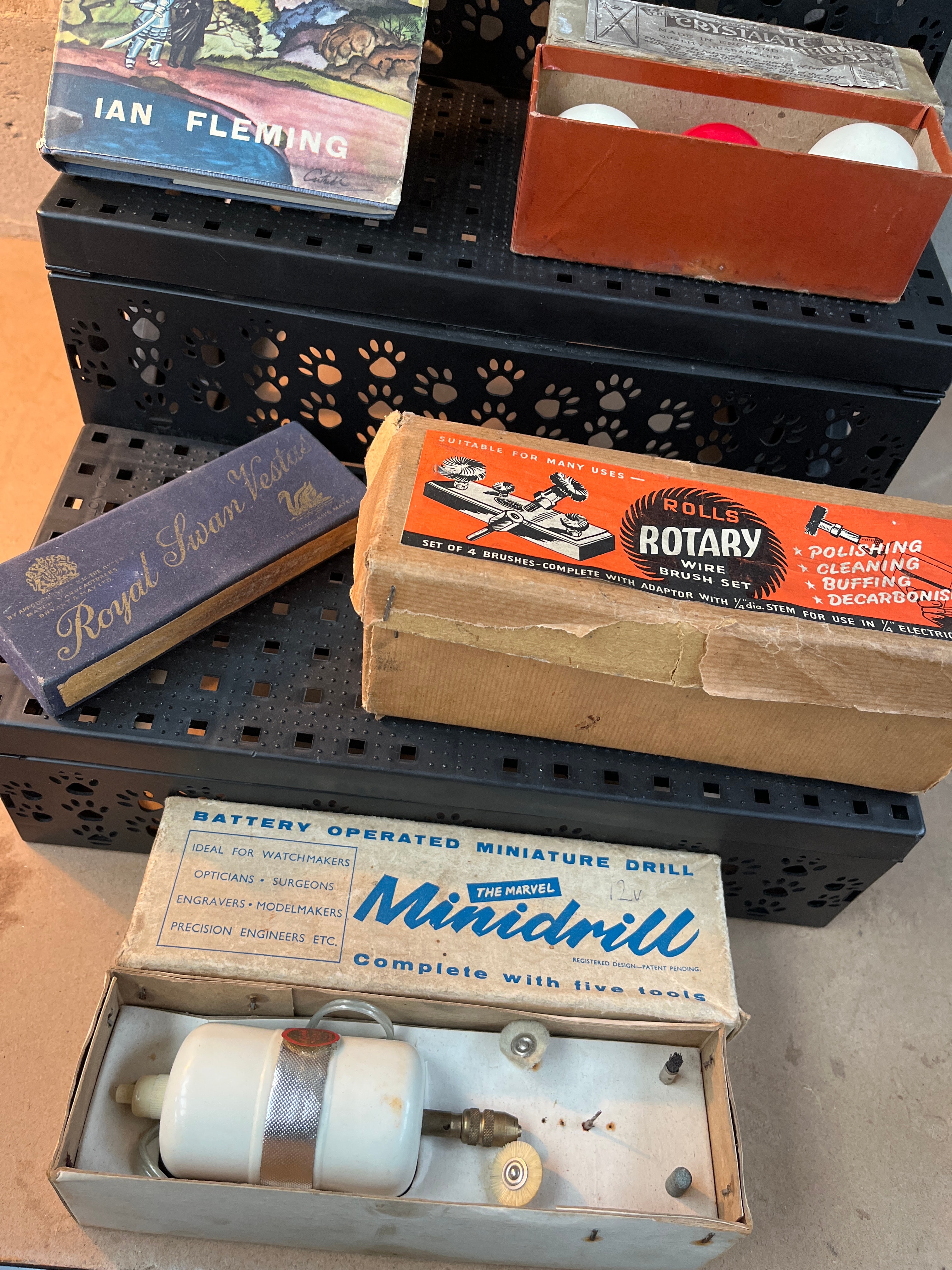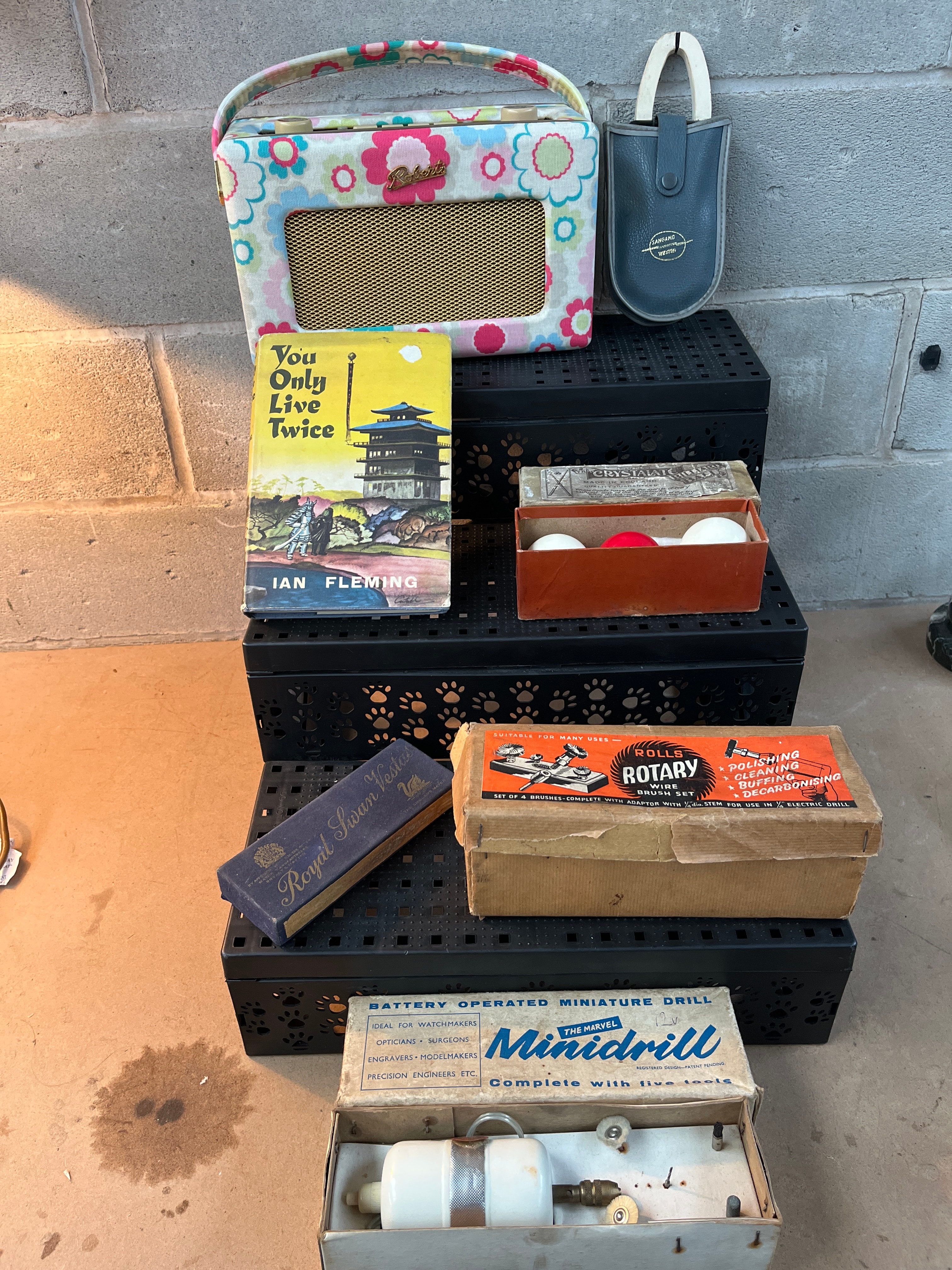 An Ian Fleming ‘You Only Live Twice’ book, identified by web intelligence as a Book Club First Edition, a hardcover copy with its original dust jacket featuring a pagoda illustration. A Roberts portable transistor radio, presented in a floral-patterned fabric casing in cream, pink, blue, and green, featuring a gold-tone grille. Accompanied by a matching grey faux-leather Roberts carrying pouch. A vintage Crystalate table tennis set, comprising a worn red-orange cardboard box marked ‘CRYSTALATE Made in England’ and containing two white and one red spherical table tennis balls. A rectangular blue box inscribed ‘Royal Swan Wessex’ in gold script. A worn cardboard box for ‘Rolls Rotary Wire Brushes,’ detailing its ‘Suitable for Many Uses’ including ‘POLISHING,’ ‘CLEANING,’ and ‘GRINDING.’ A ‘THE MARVEL Minidrill,’ a ‘Battery Operated Miniature Drill’ advertised as ‘Complete with five tools,’ presented in its original cardboard packaging, revealing the white drill unit and various small brass-colored accessories.