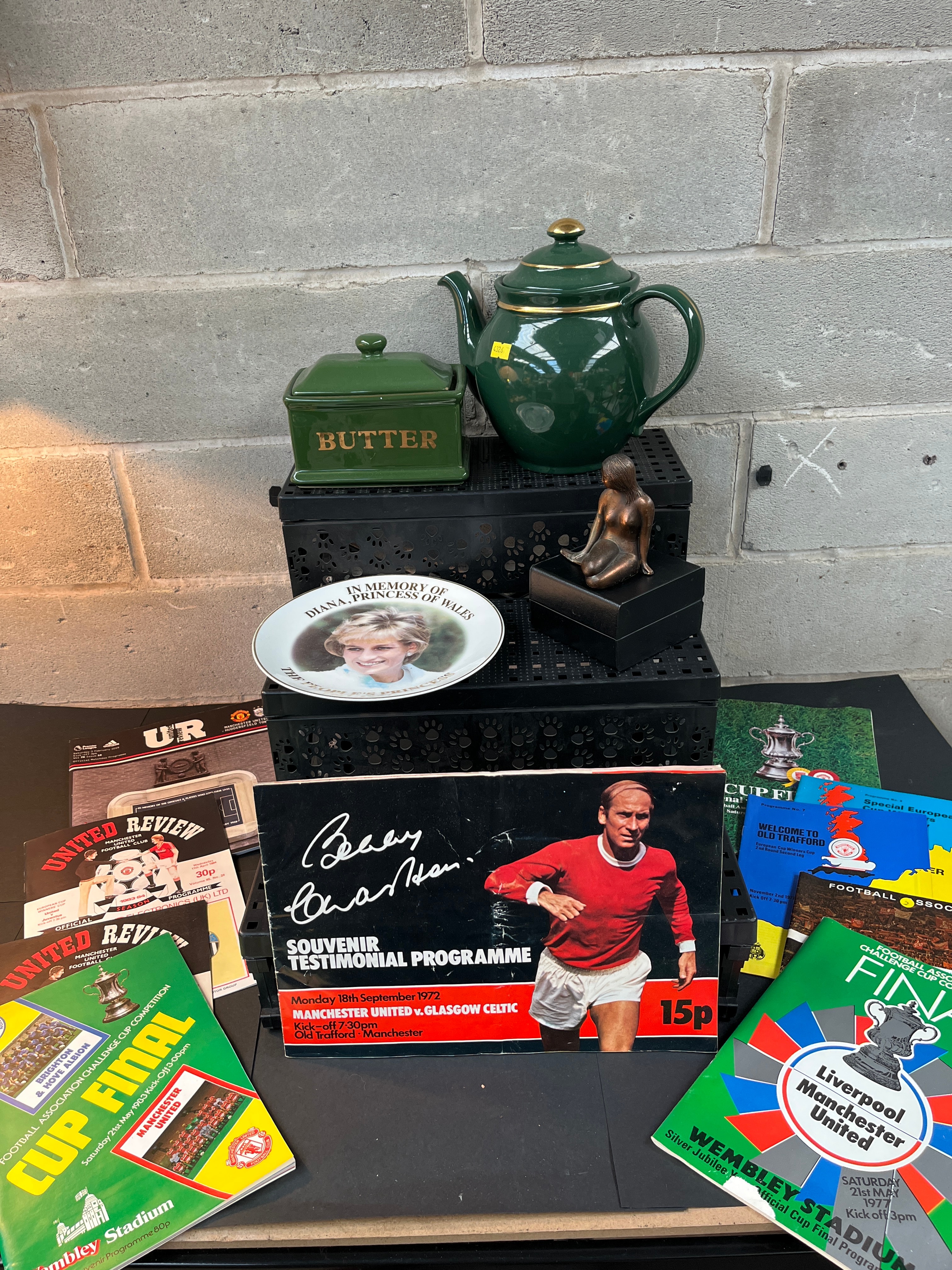 A collection comprising a “SOUVENIR TESTIMONIAL PROGRAMME” for “MANCHESTER UNITED v GLASGOW CELTIC” dated “Monday 18th September 1972”, signed “Bobby Charlton” and originally priced at “15p”. Also included is a “CUP FINAL” program for “Liverpool v Manchester United” dated “Saturday 27th May 1977” at “Wembley Stadium”, alongside various other paper football match programs and reviews, predominantly from Manchester United.