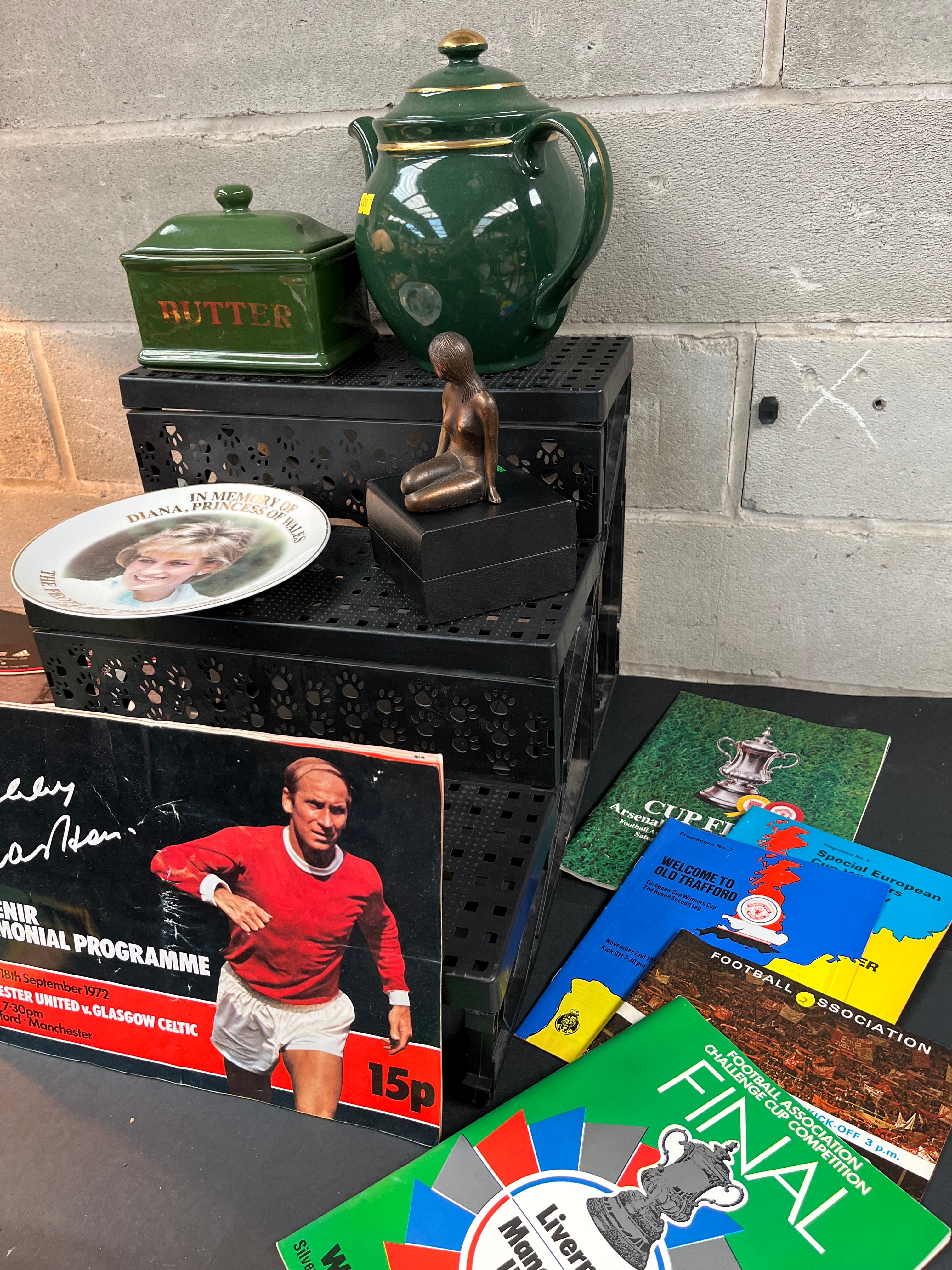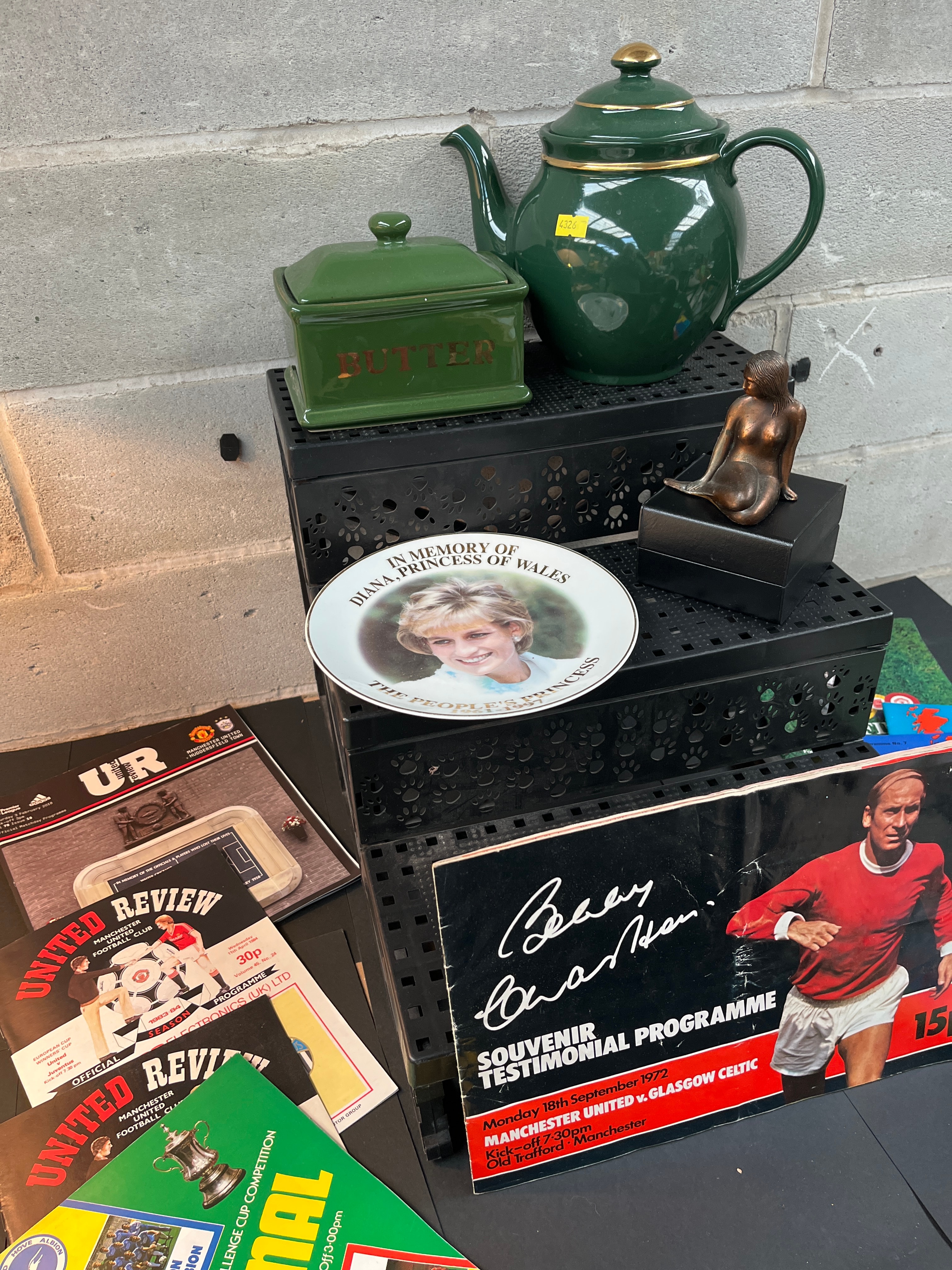 The lot also features a dark green ceramic teapot with a gold finial and trim, and a matching lidded butter dish embossed with “BUTTER” in gold-colored text. Further decorative items include a small bronze-toned figurine of a seated female on a black rectangular base, and a white ceramic commemorative plate featuring Princess Diana with the text “IN MEMORY DIANA PRINCESS OF WALES THE PEOPLE’S PRINCESS”.