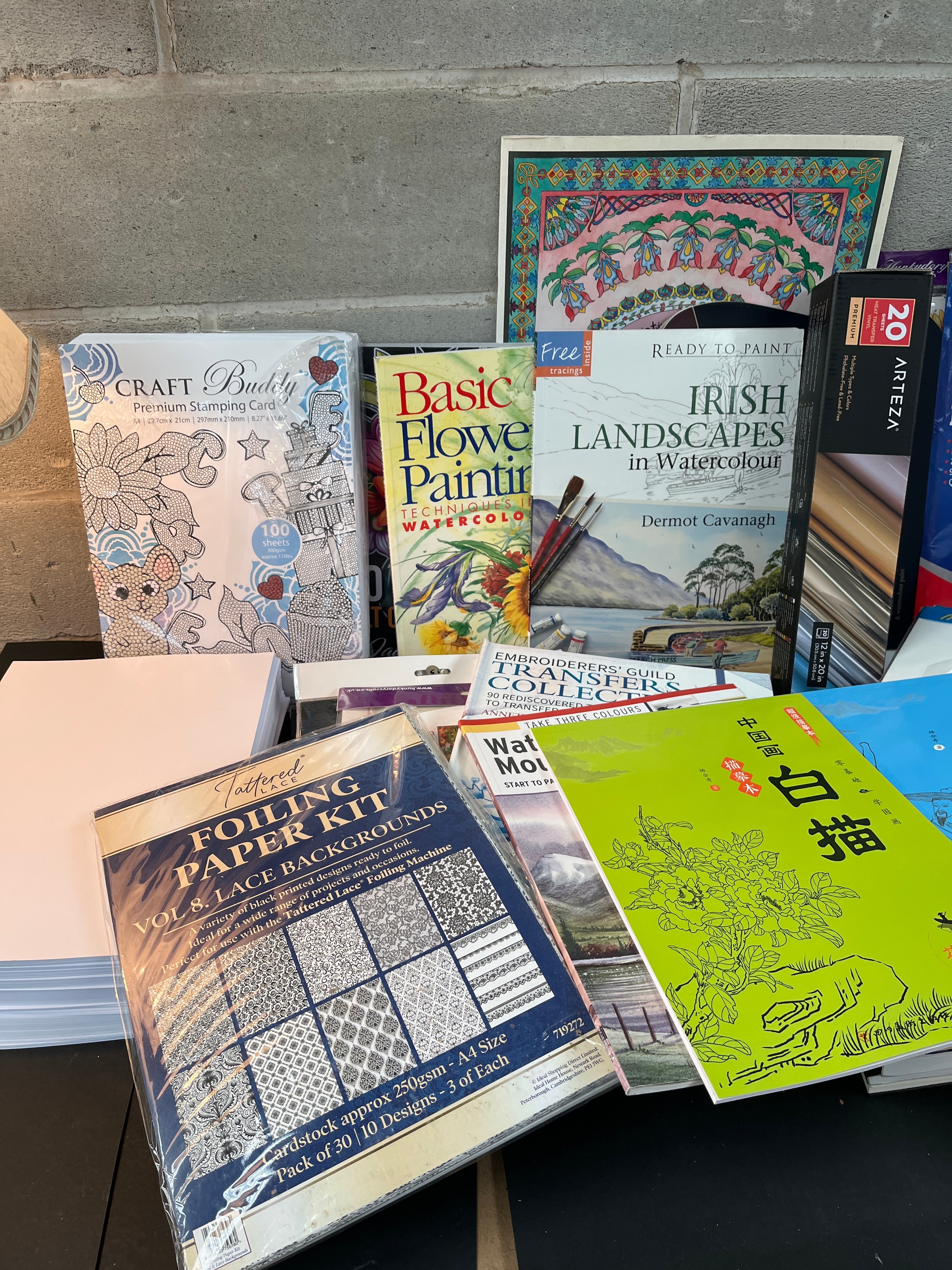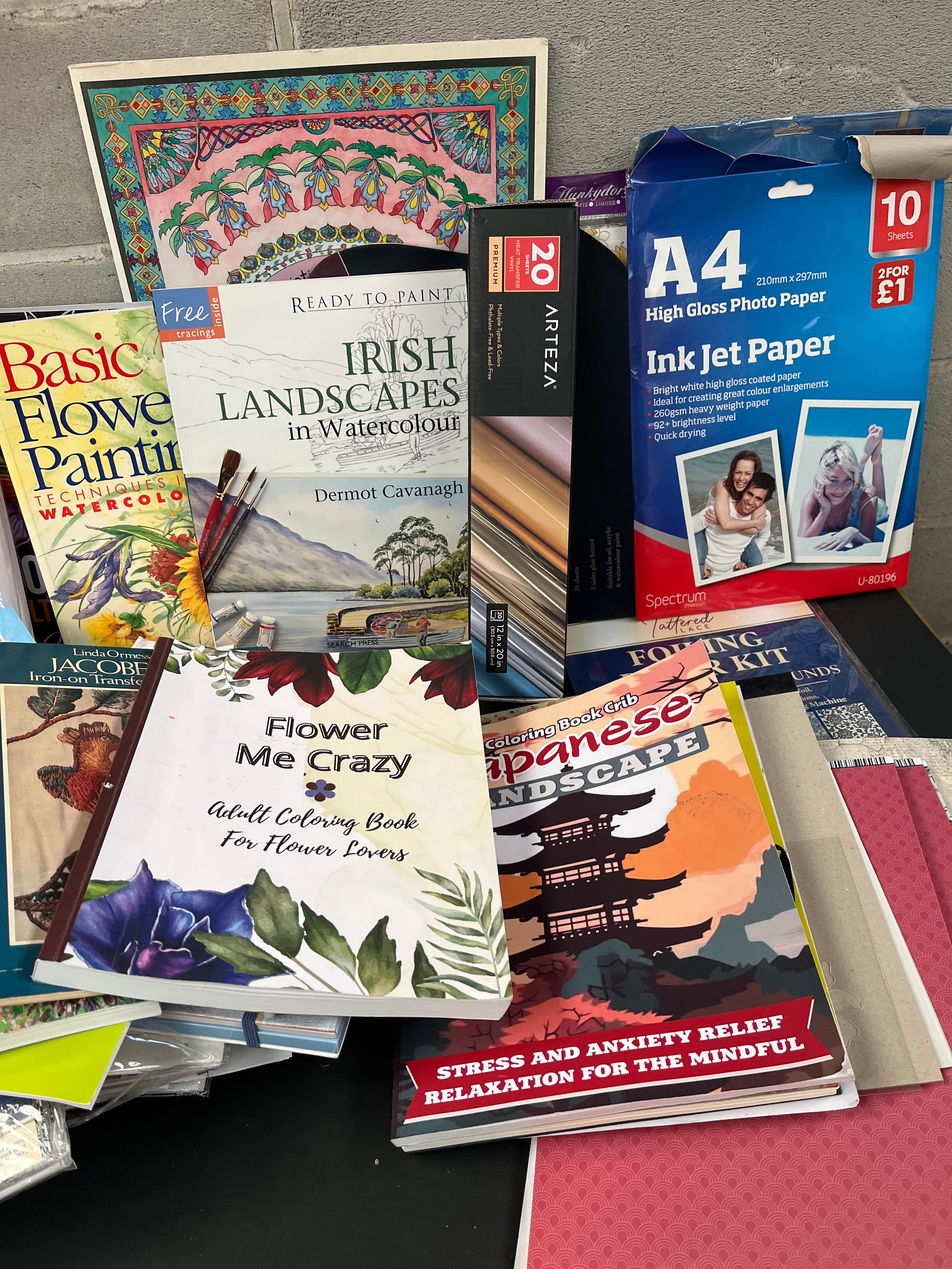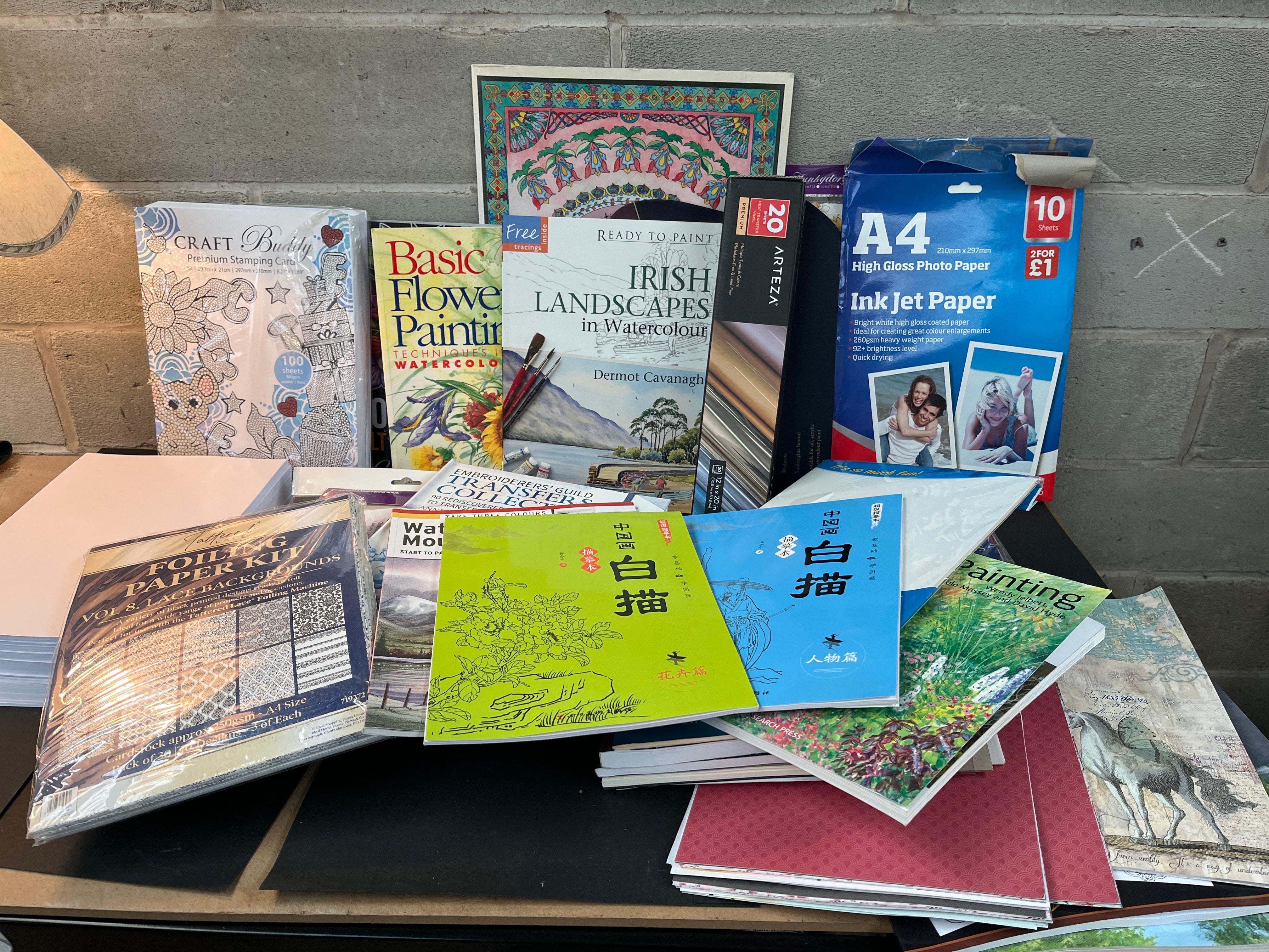 A collection primarily featuring Arrtx watercolor paper products, alongside a varied assortment of contemporary art and craft supplies. The lot includes numerous instructional books on painting, drawing, coloring, and papercrafts, such as “Basic Flower Painting in Watercolour,” “Ready to Paint Irish Landscapes in Watercolour,” “Flower Me Crazy,” and “Japanese Landscapes.” Also present are various paper products including “Craft Buddy Premium Stamping Card,” “A4 Ink Jet Photo Paper,” an “Arteza Premium Watercolour Pad,” a “Foiling Paper Kit Vol & Lace Backgrounds,” and loose stacks of white cardstock. Several books feature Chinese text, specifically “中国画 白描” (Chinese Painting, Line Drawing) and “白描 人物篇” (Line Drawing, Figures Chapter). A small assortment of paintbrushes is also included.