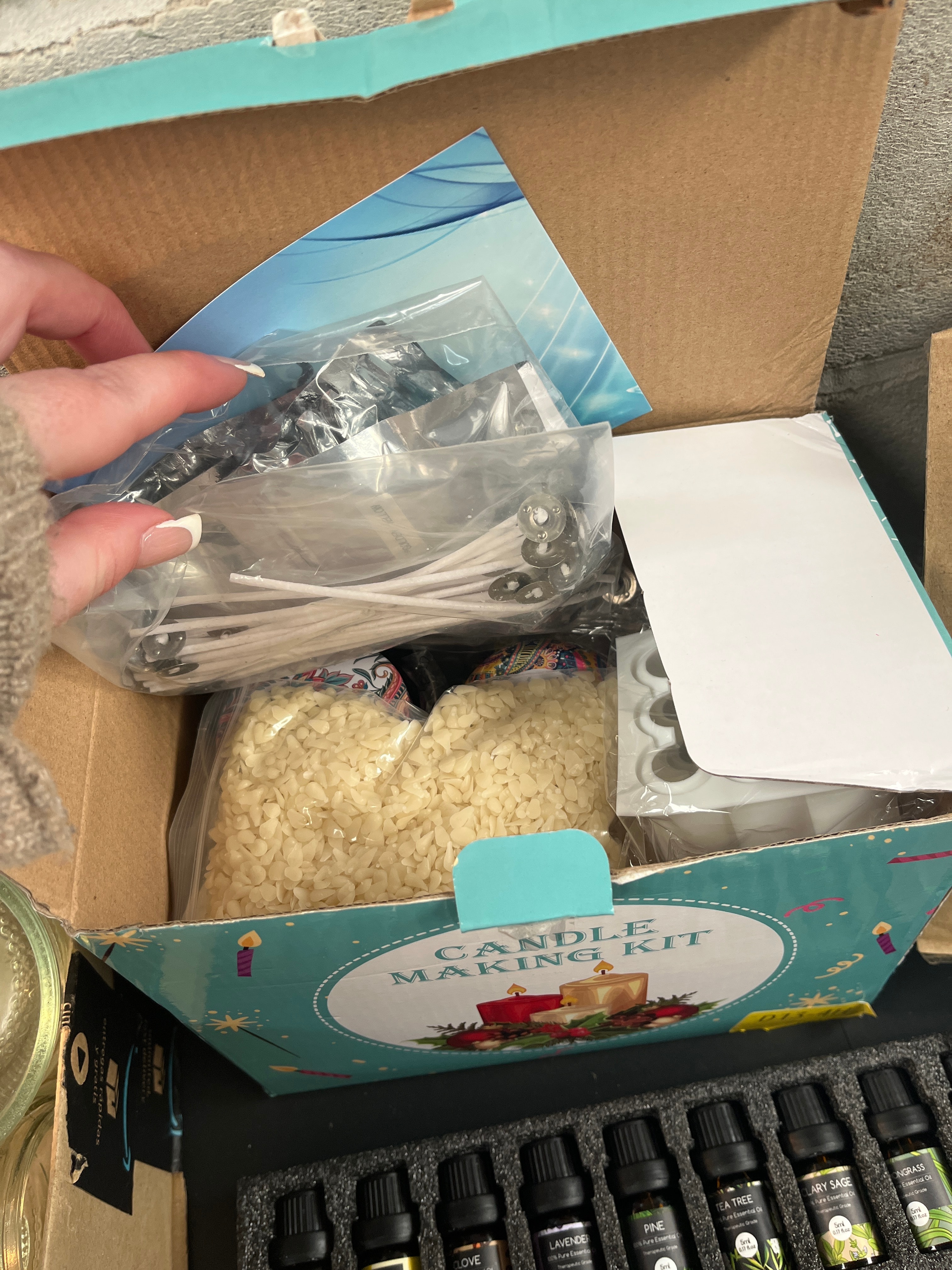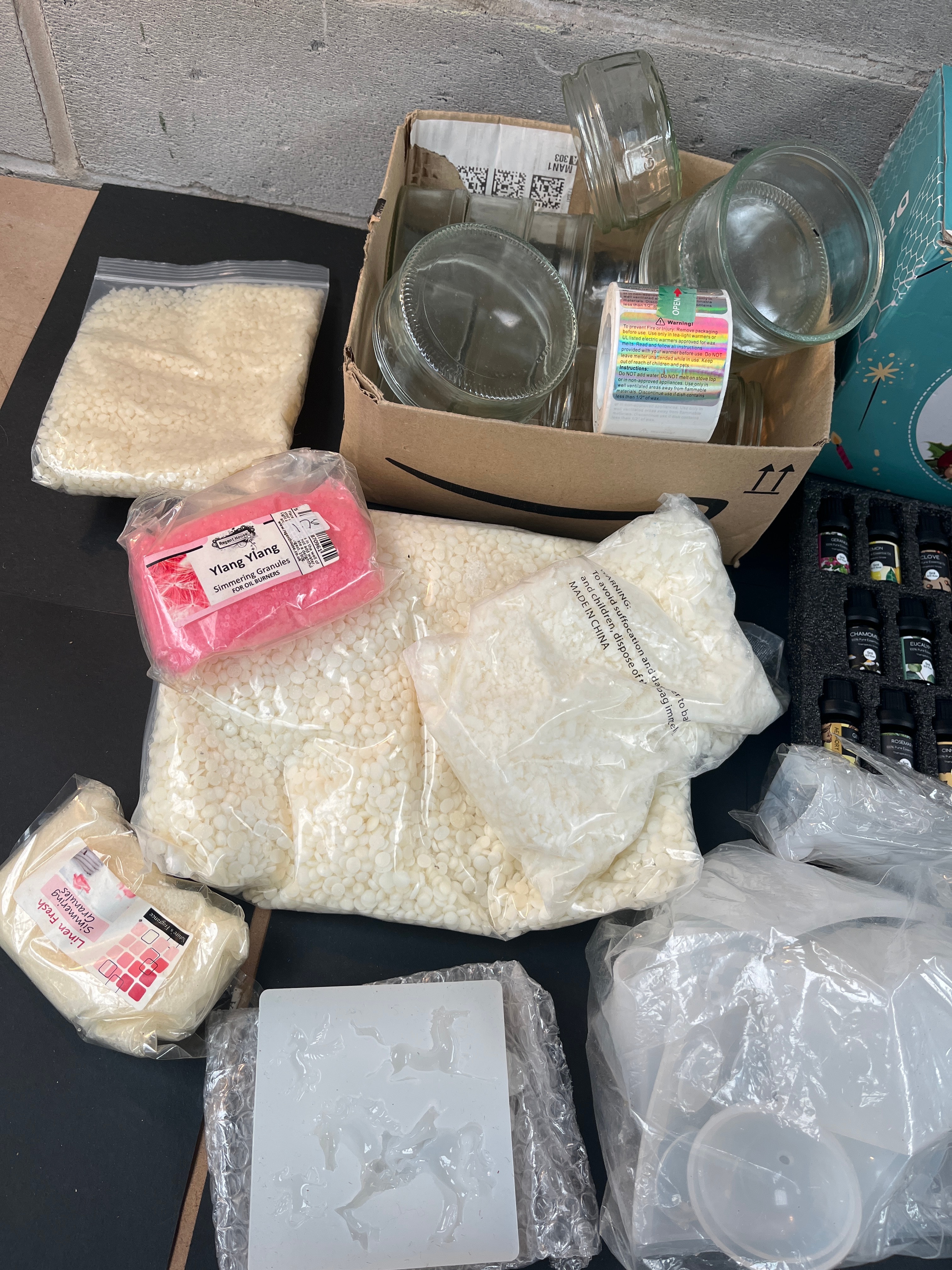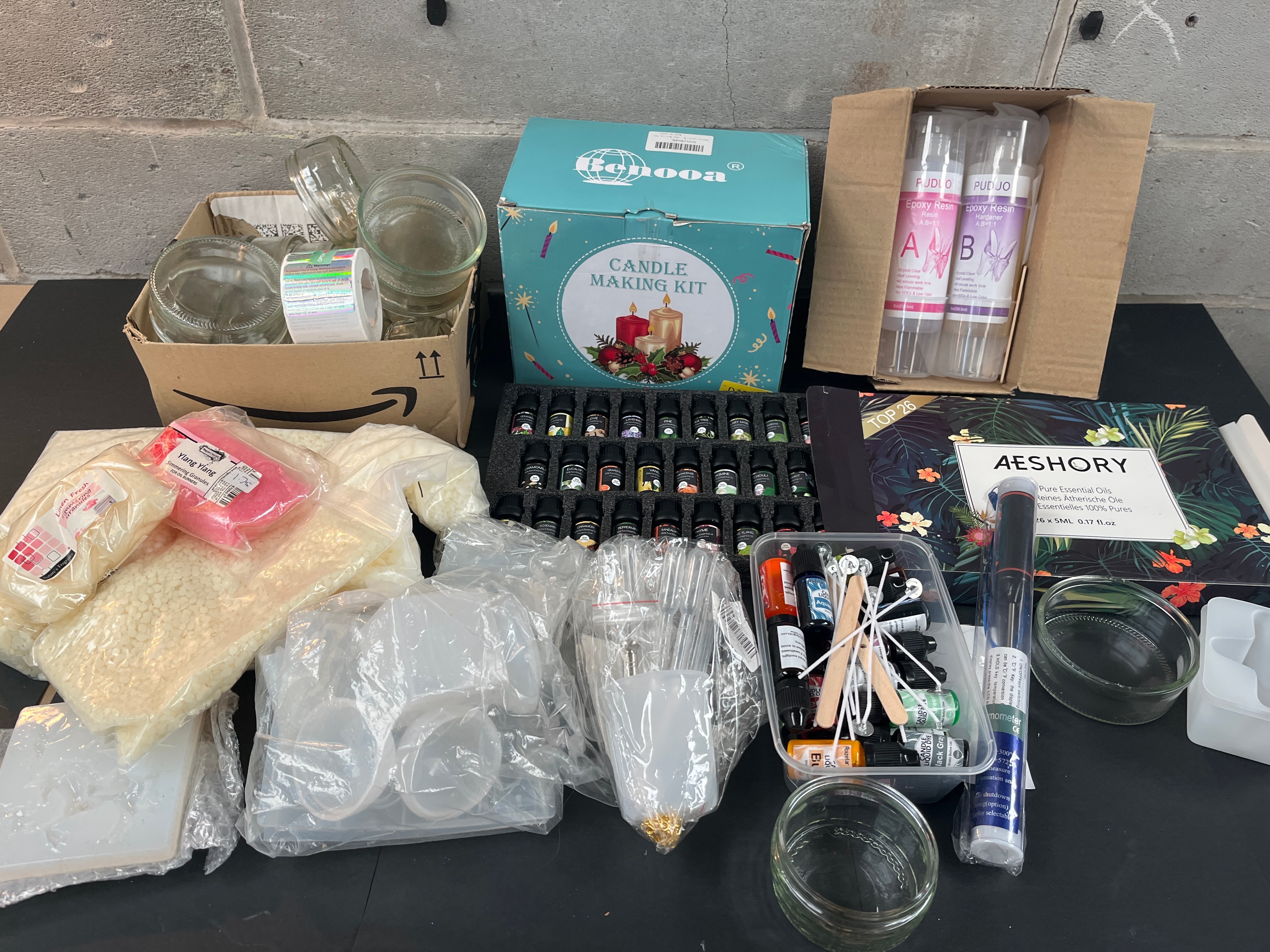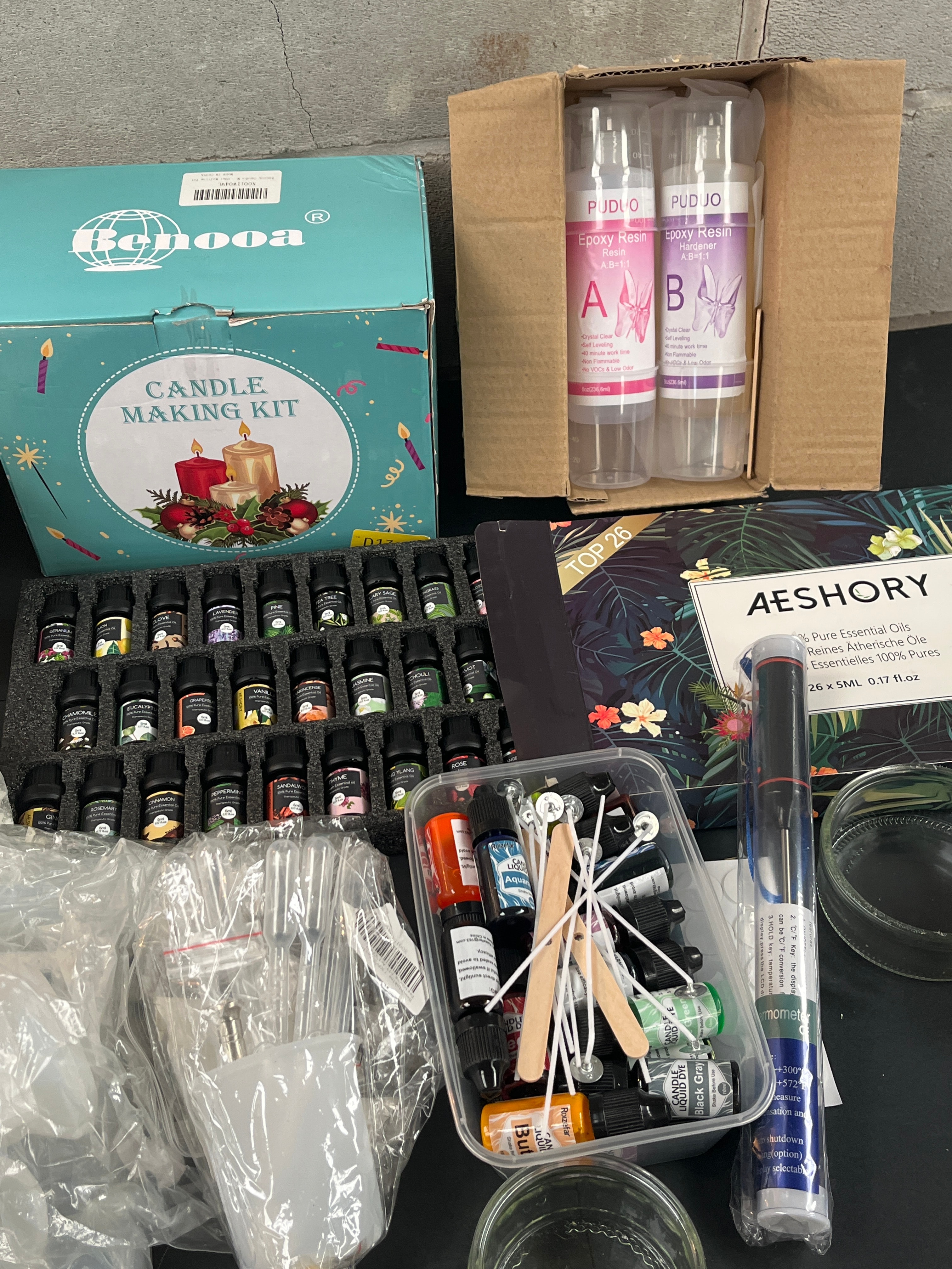 A significant collection of modern and contemporary craft supplies, primarily focused on candle making and resin art. The lot includes a ‘Benooa’ branded ‘CANDLE MAKING KIT’ in its original retail packaging, and a ‘PUDUO’ branded ‘Epoxy Resin’ and ‘Hardener’ set, also boxed. An ‘AESHORY’ ‘TOP 25 Pure Essential Oils’ set is present, prominently displaying German text ‘Reines Ätherische Öle’ (Pure Essential Oils), featuring 25 x 5ML bottles. Also included are large quantities of wax pellets, with one package labeled ‘Ylang Ylang’, and multiple clear glass jars. Additional craft components are observed in various clear containers and bags, including numerous small bottles (some labeled ‘IMEL’, ‘Black Green’, ‘Amber’), candle wicks, wooden stirring sticks, plastic droppers and cups, and silicone molds. A thermometer is also present.